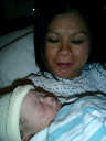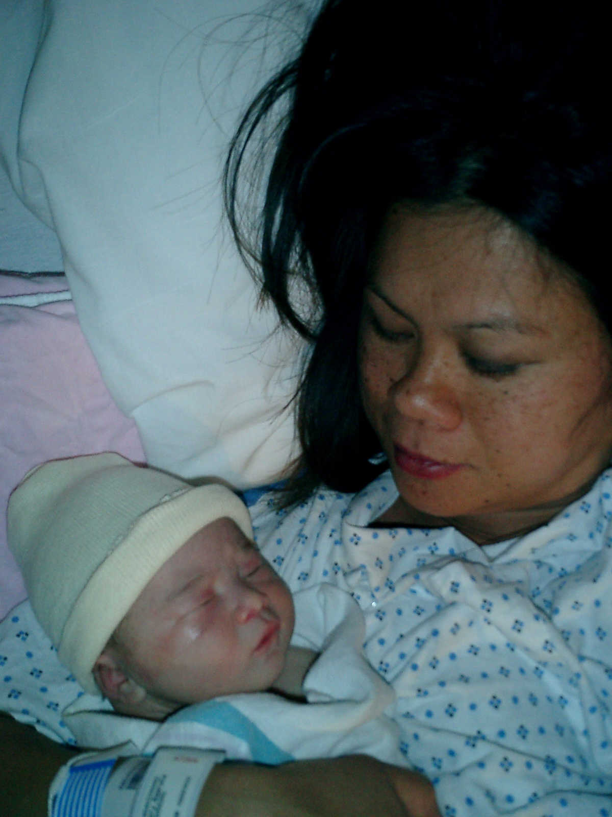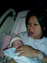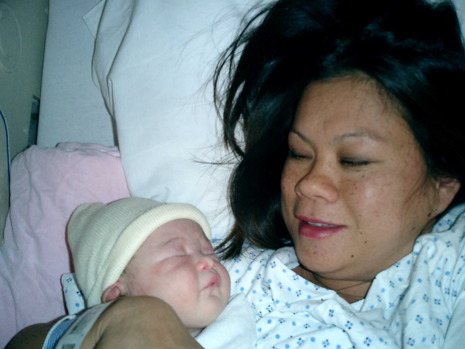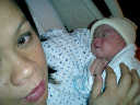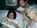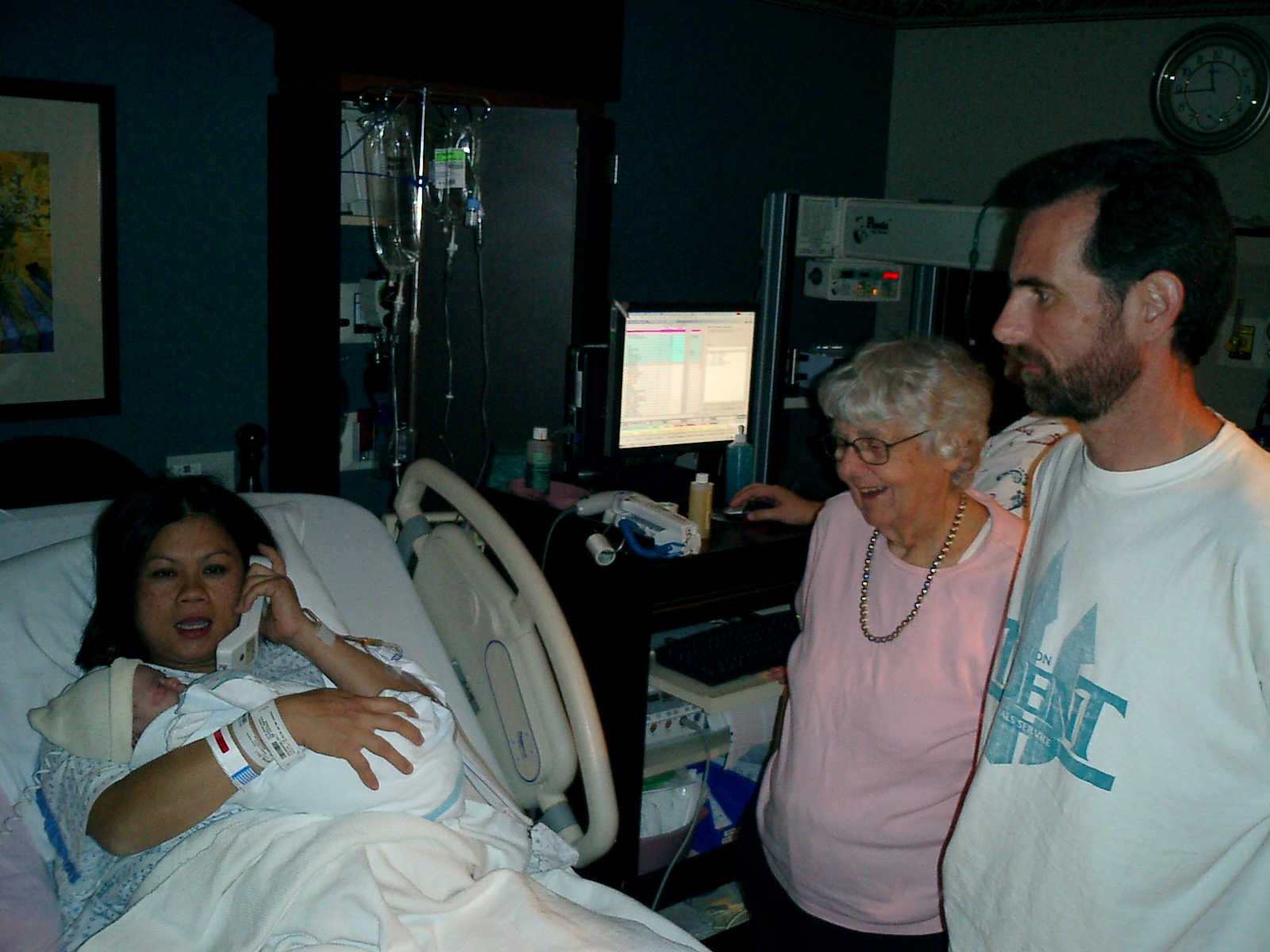 | After checking into the hospital at 1:30pm on Saturday November 25, Sally gave birth to Nadine Keosavang Alexander at 11:16 PM, which made Nadine's birthday fall on the same day as Nolan's, only 7 years apart. (Sally calls them "seven year twins".) Here Sally is recovering from delivery with Nadine in her arms. That is Uncle Dave and Grandma Charlotte Alexander looking at Nadine, who is less than one hour old. Feeling full of energy, Sally got on the phone to let everyone know the good news! |