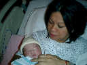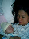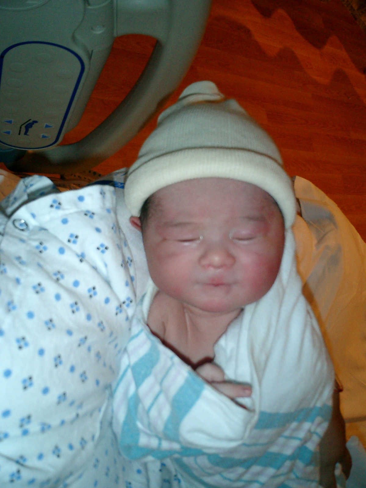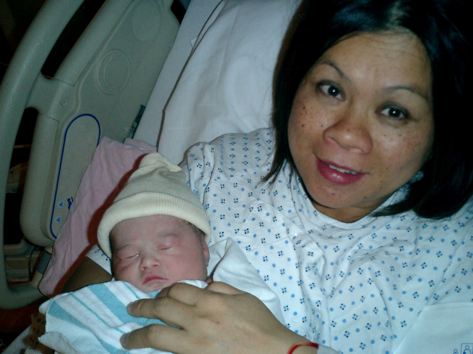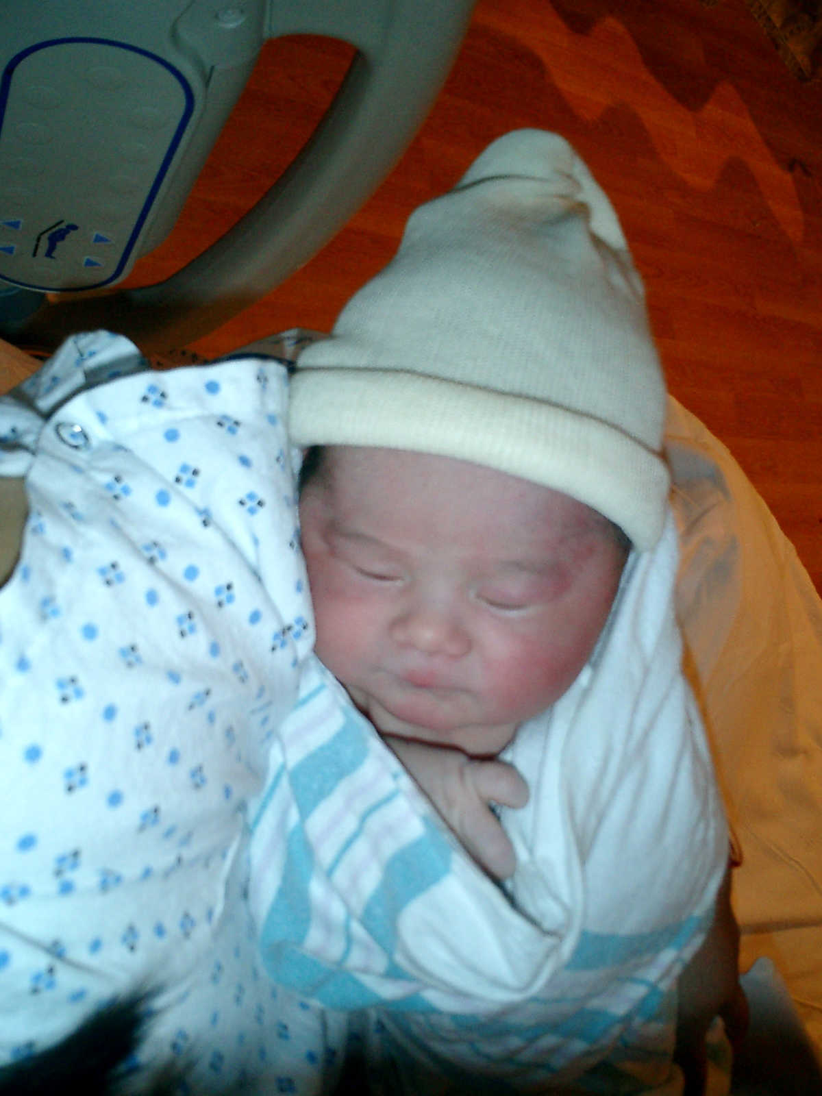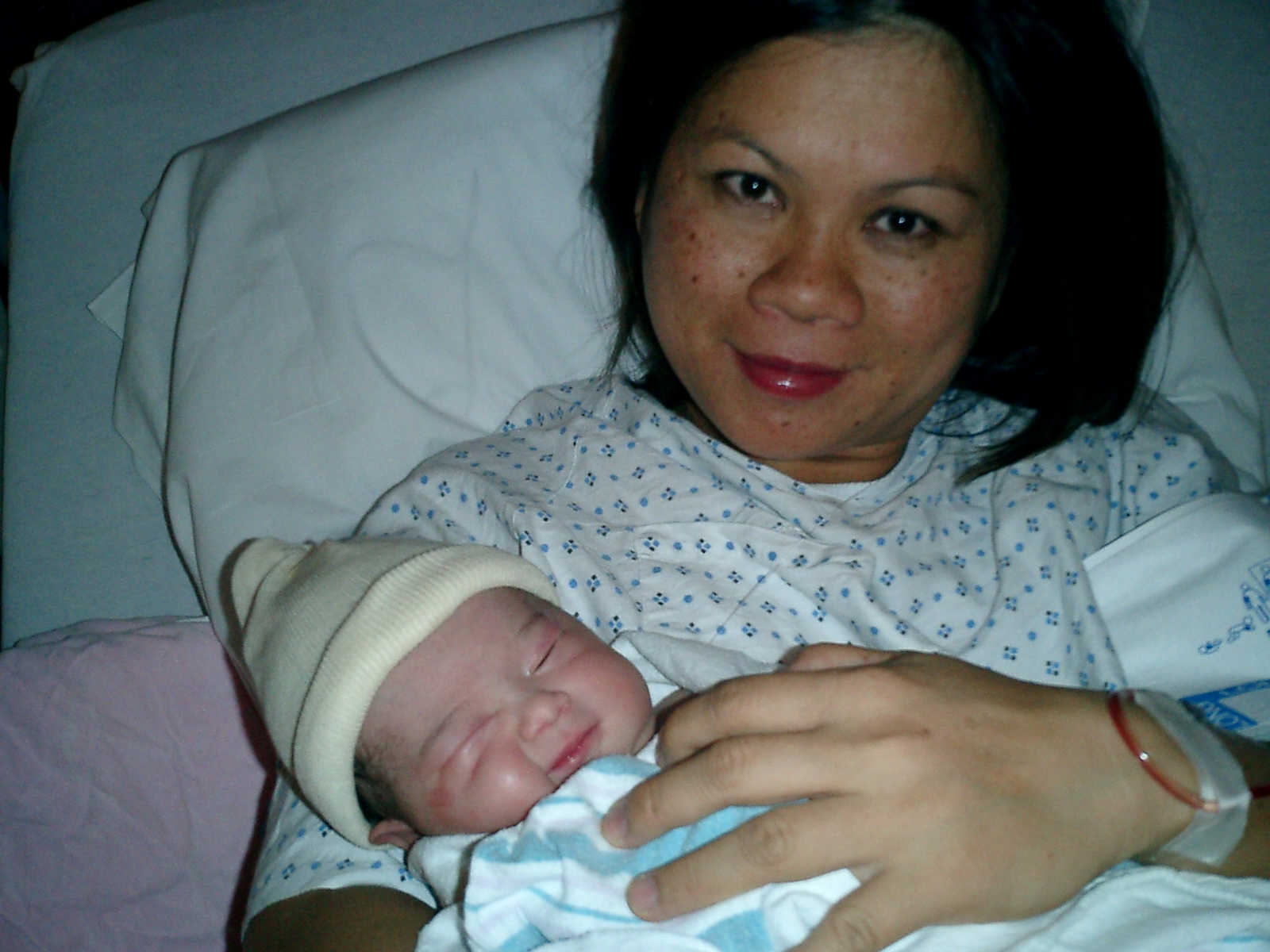 | After checking into the hospital at 1:30pm on Saturday November 25, Sally gave birth to Nadine Keosavang Alexander at 11:16 PM, which made Nadine's birthday fall on the same day as Nolan's, only 7 years apart. (Sally calls them "seven year twins".) Here Sally is recovering from delivery with Nadine in her arms. That is Uncle Dave and Grandma Charlotte Alexander looking at Nadine, who is less than one hour old. Feeling full of energy, Sally got on the phone to let everyone know the good news! |
