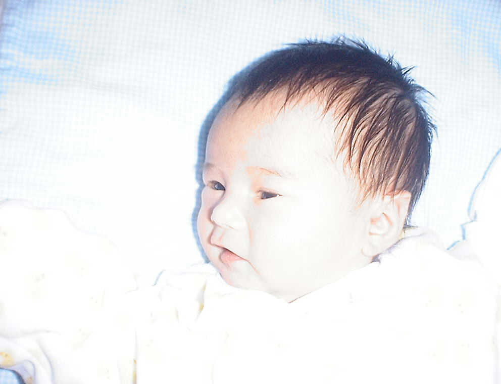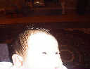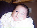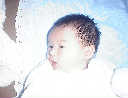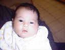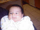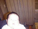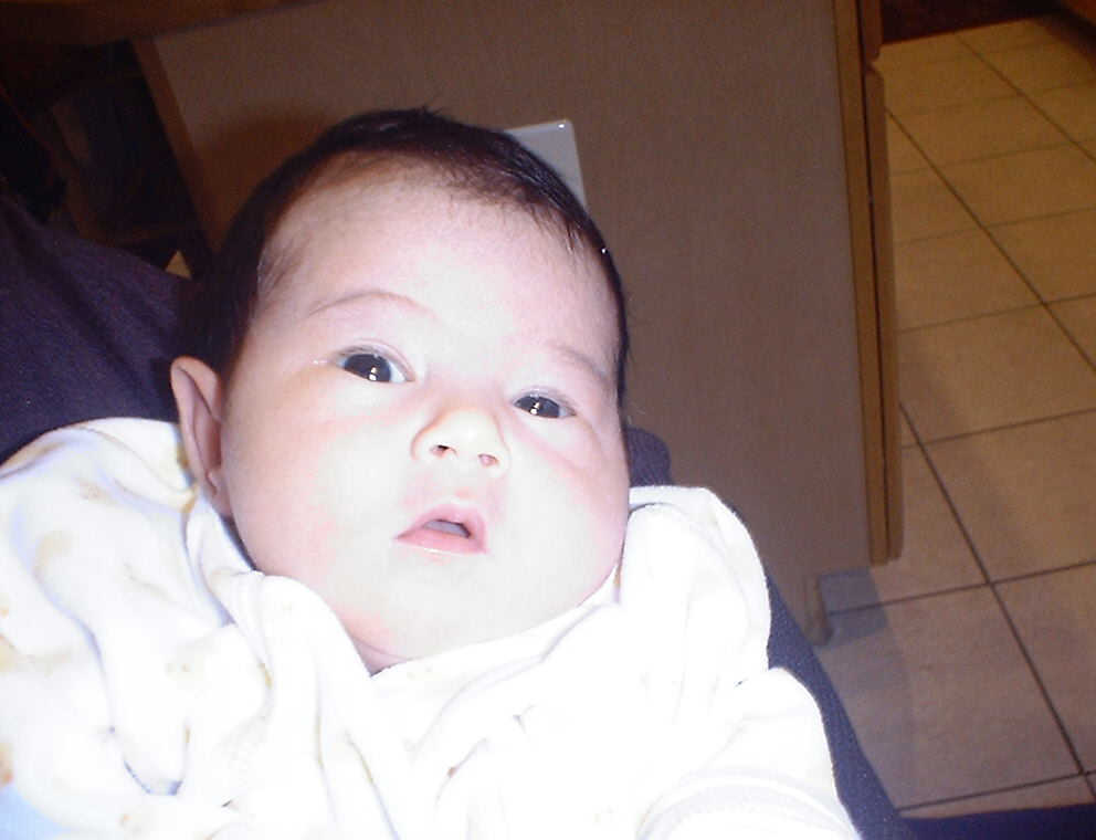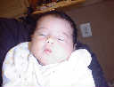 Here Nadine is one week old, relaxing after a nice meal, walking around the house with Daddy. What a head of hair!