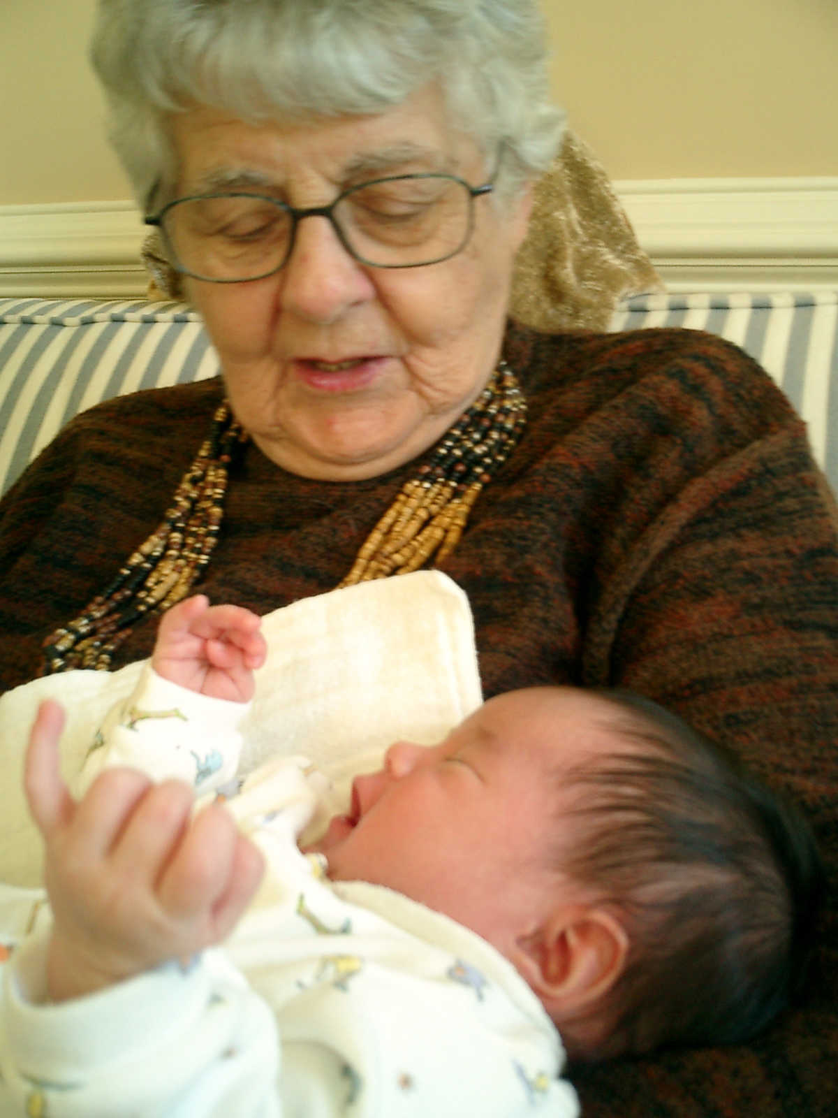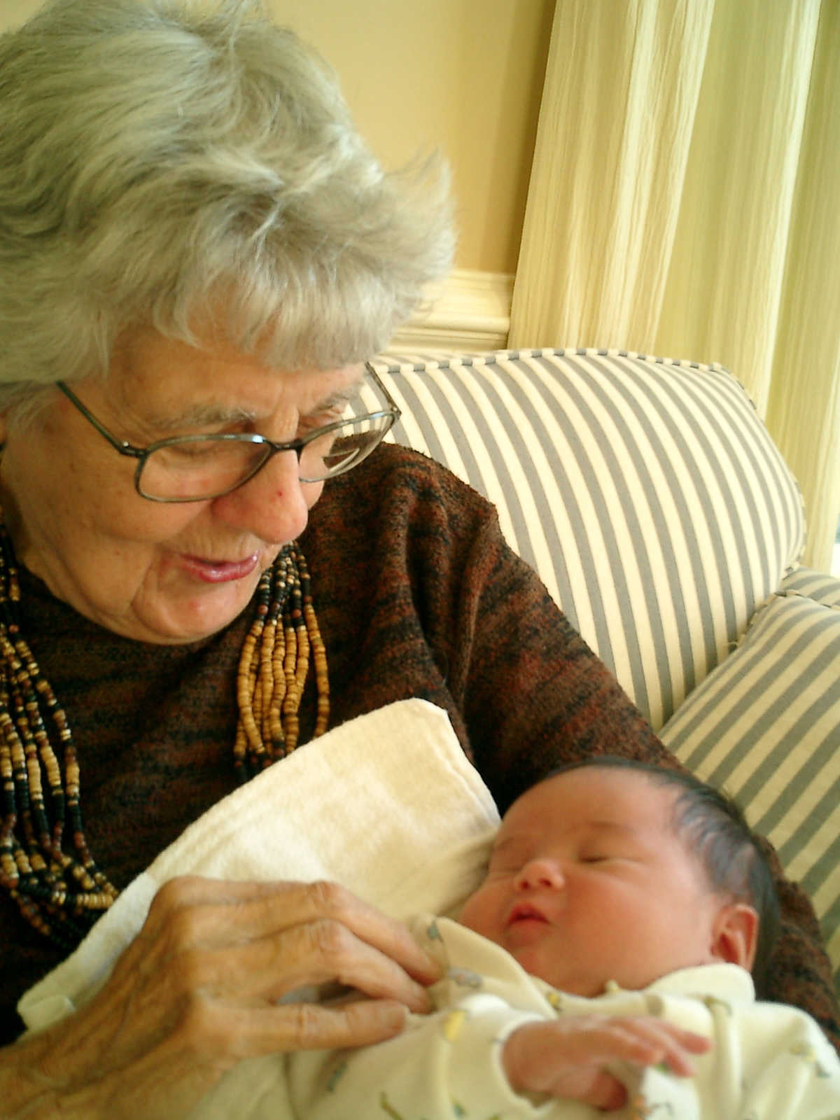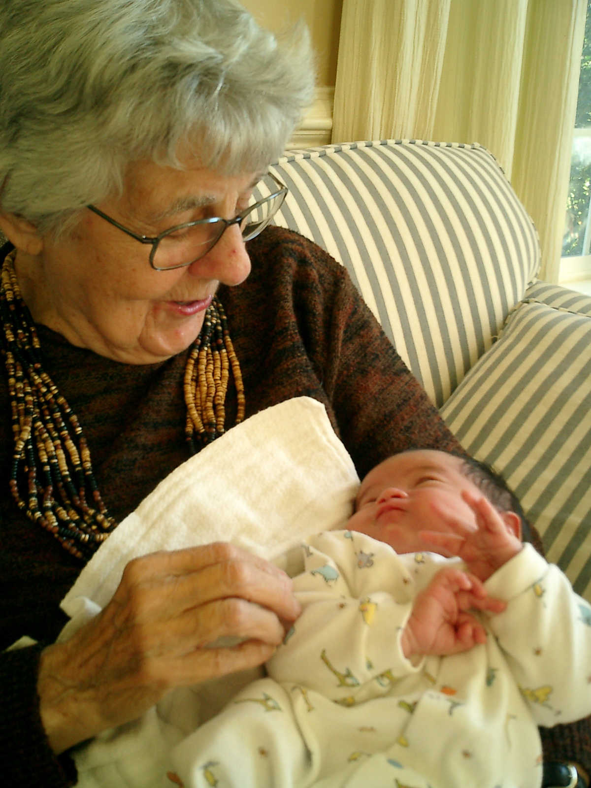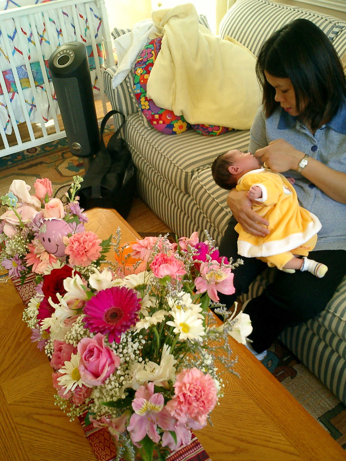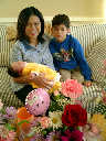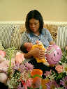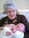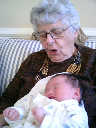Here Nadine is a little over 2 weeks old, enjoying some sunshine and the beautiful flowers sent by friends. (Remember fellows, girls love flowers...) Later that afternoon, Grandmother Alexander stopped by to say hello to Nadine.