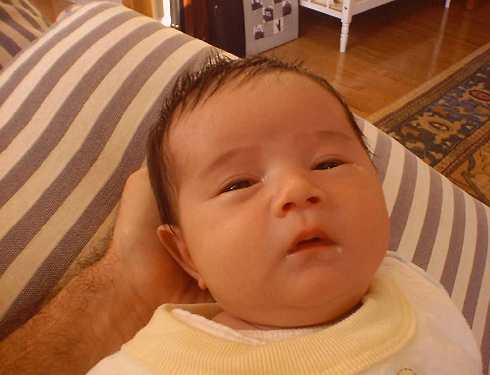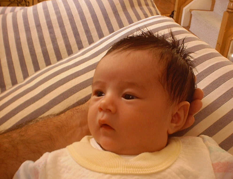 Nadine at two and a half weeks, finishing off a bottle of milk, wide awake. (And soon to be looking for another bottle!) Look at that hair, it's getting longer every day!