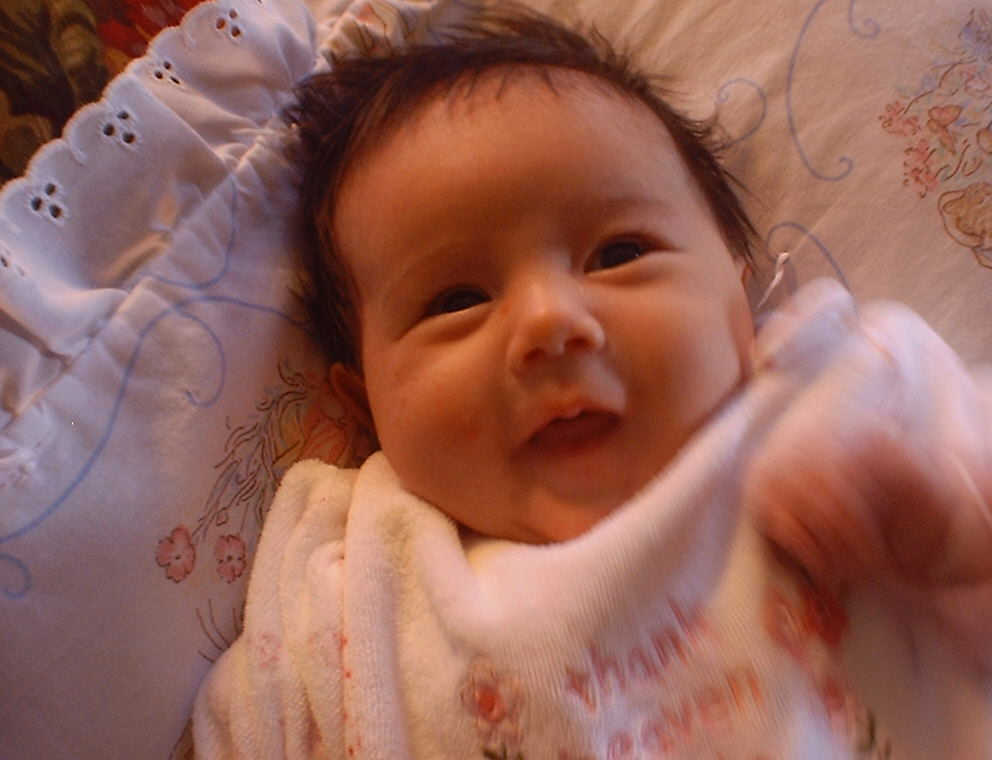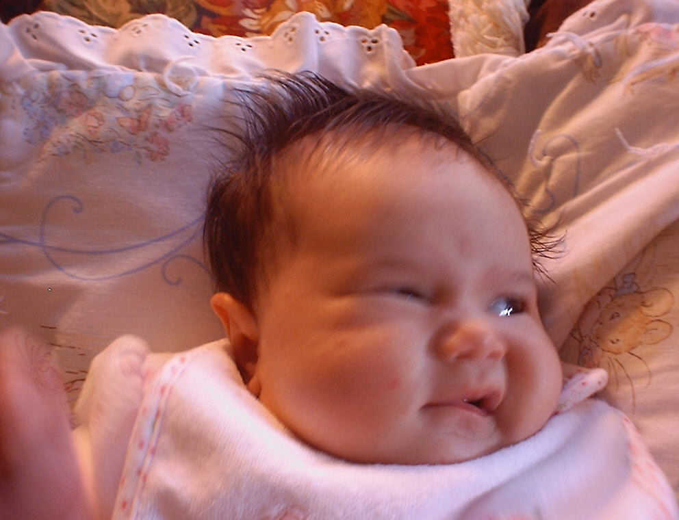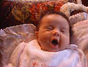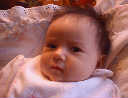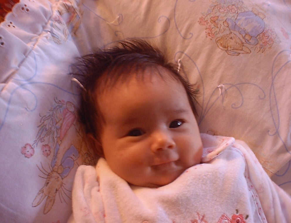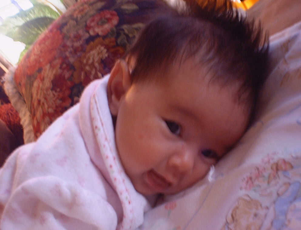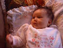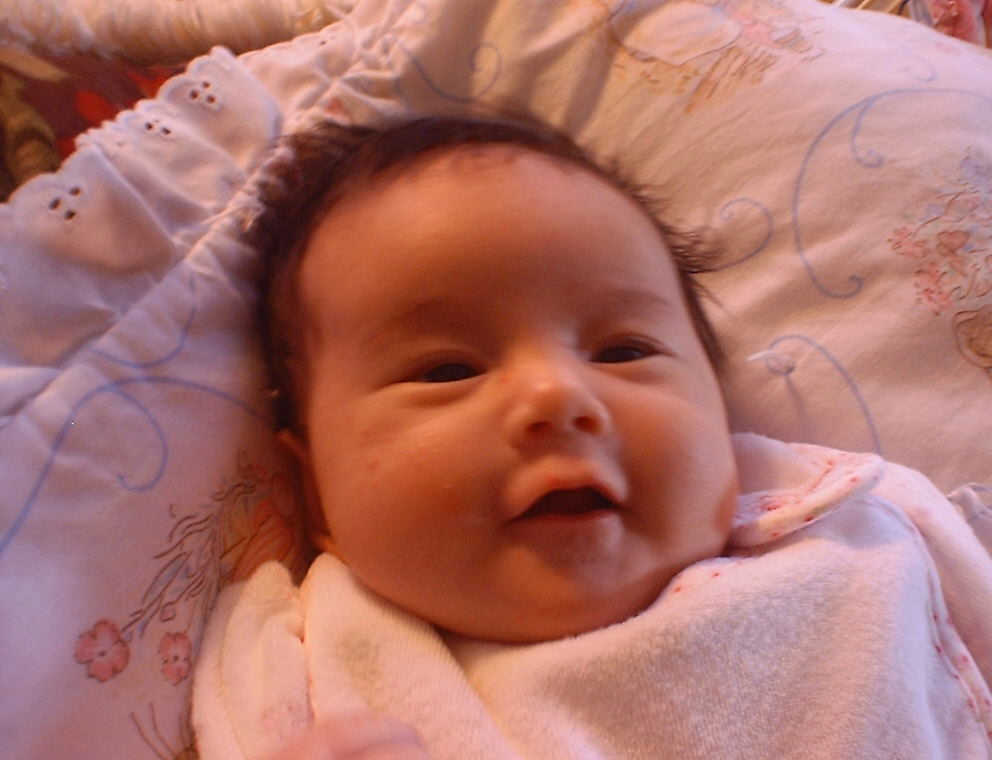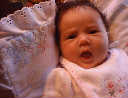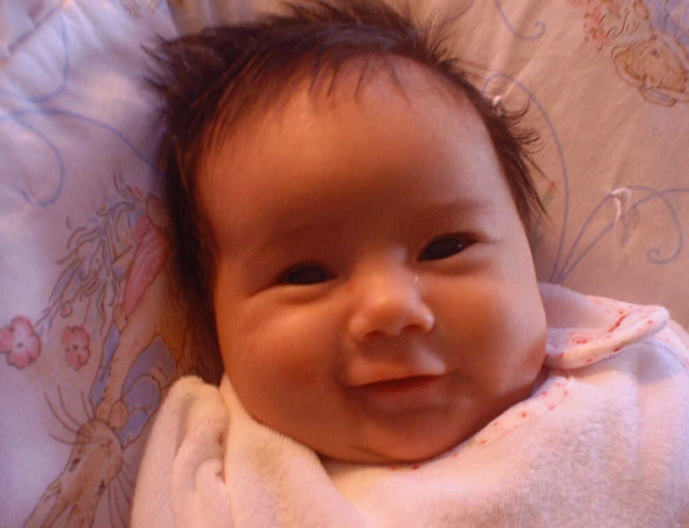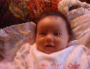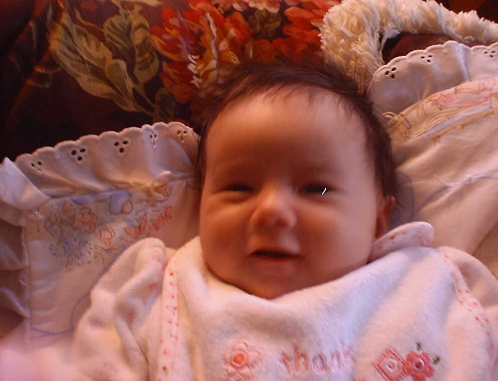 | Nadine at six weeks, getting a little exercise from "tummy time" -- look, she can lift her head already! After the "workout", it's time for some giggles, yawns, and of course a nap. Nadine, you are growing every day -- you're eyes are so bright, and just look at that smile! |