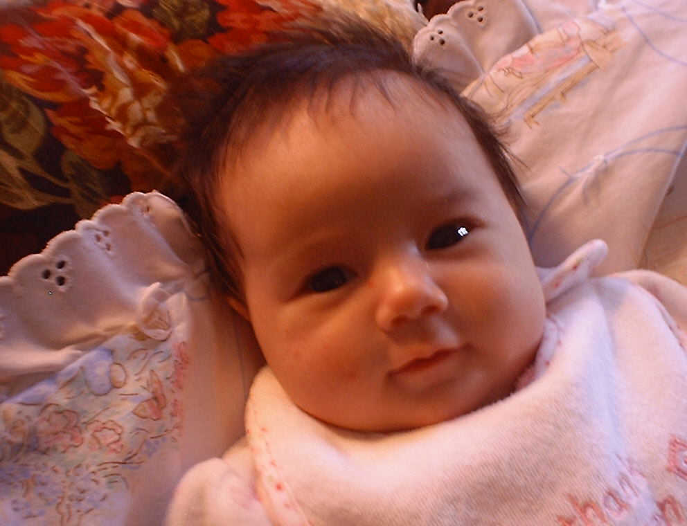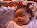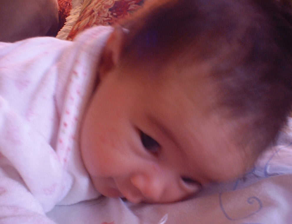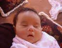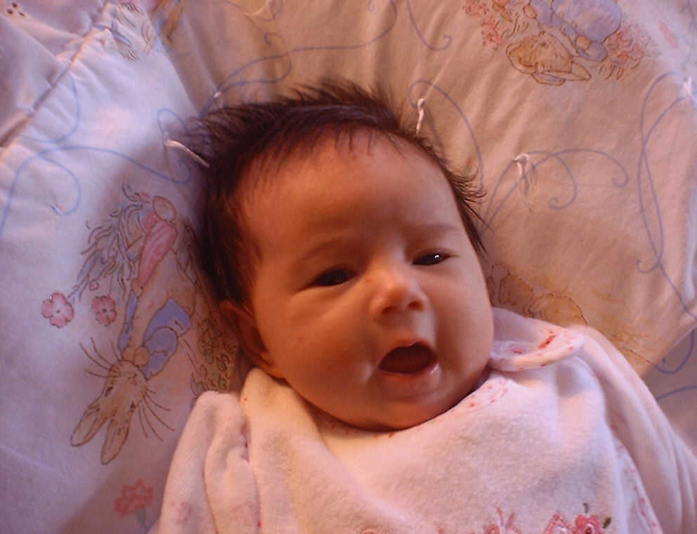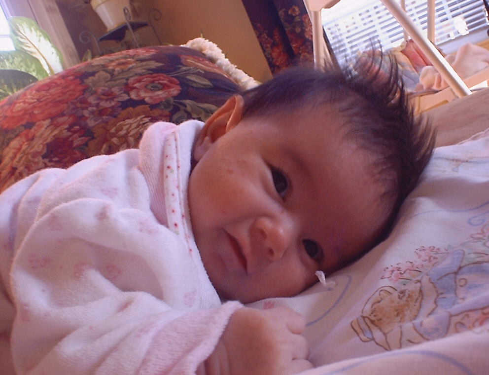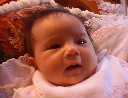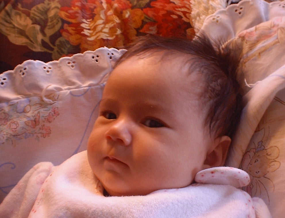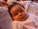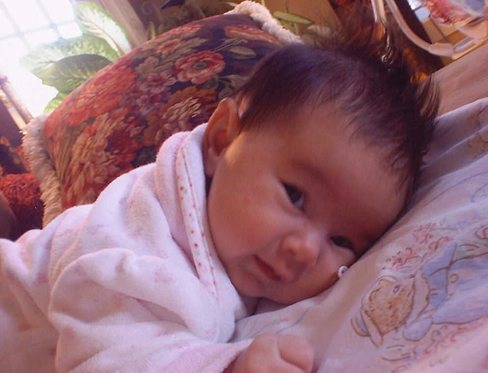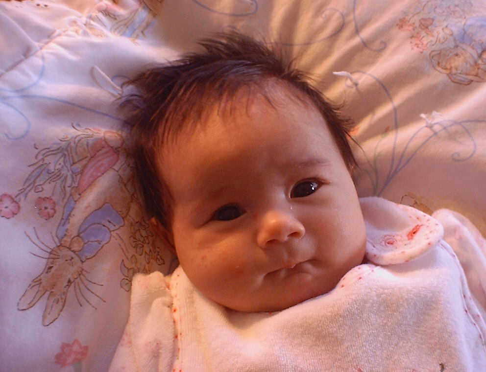 | Nadine at six weeks, getting a little exercise from "tummy time" -- look, she can lift her head already! After the "workout", it's time for some giggles, yawns, and of course a nap. Nadine, you are growing every day -- you're eyes are so bright, and just look at that smile! |