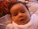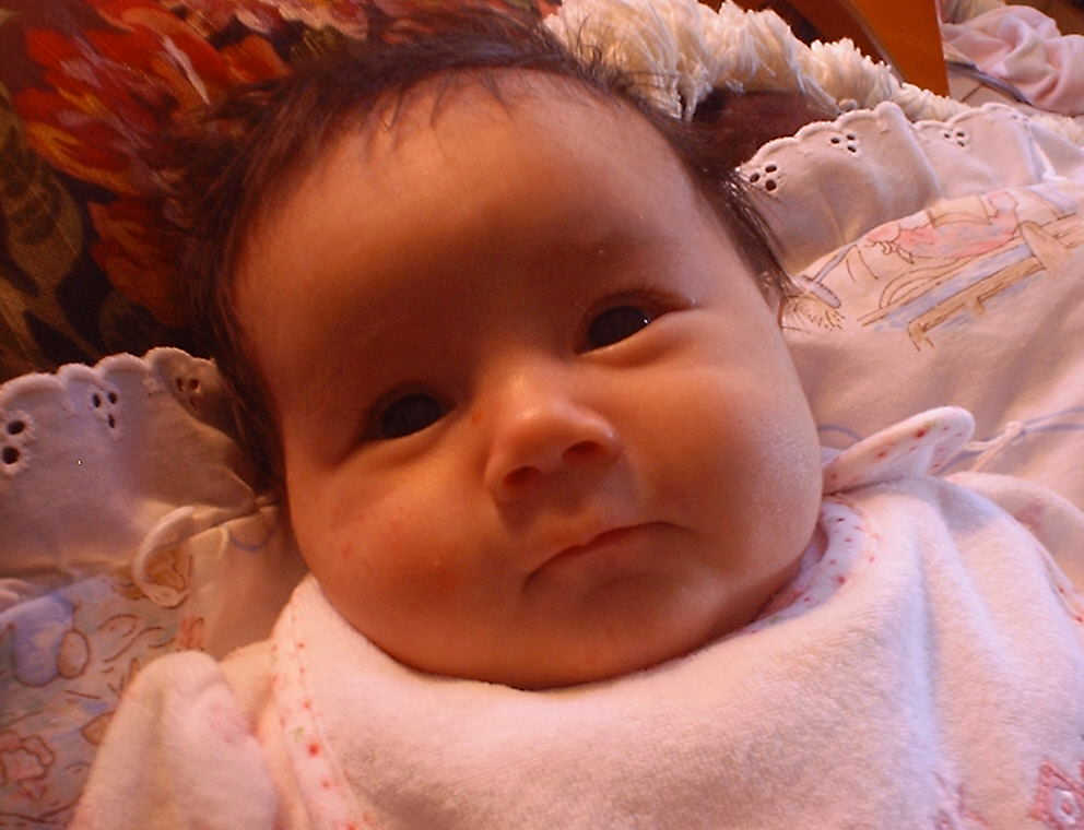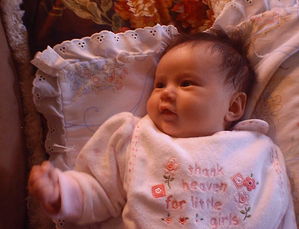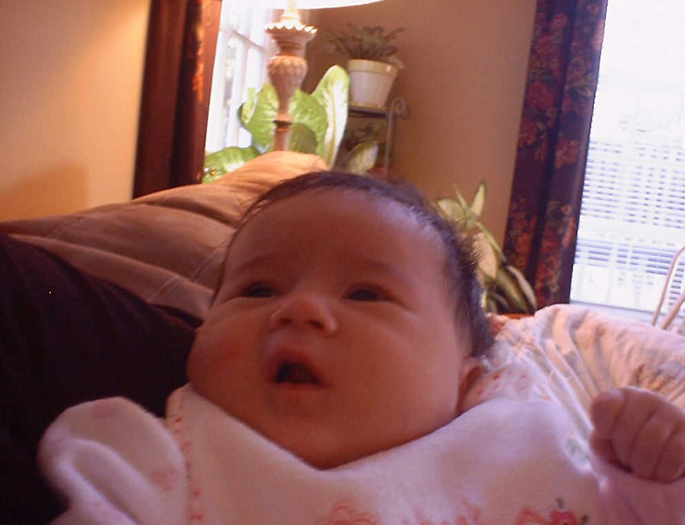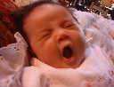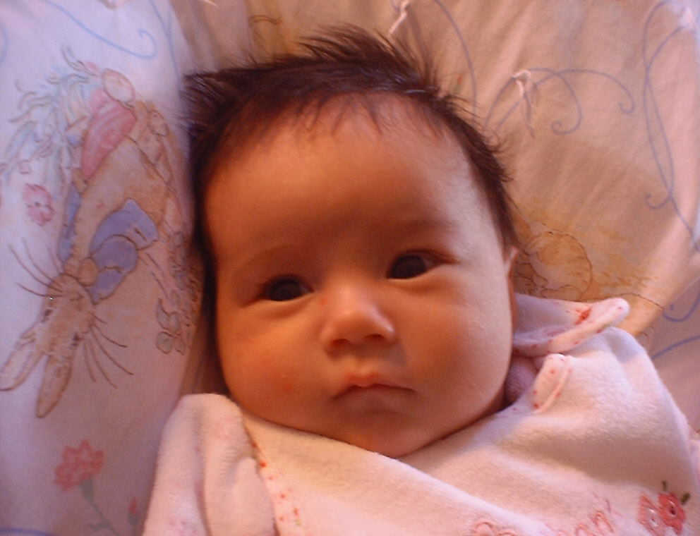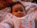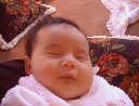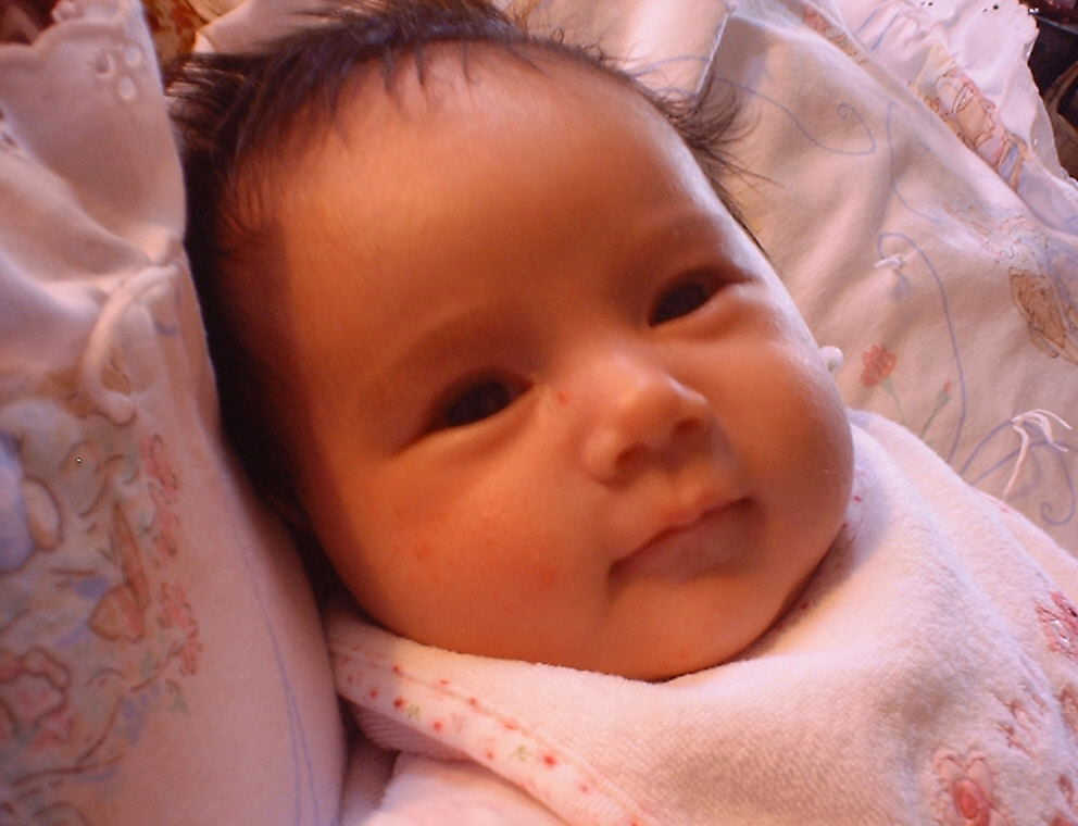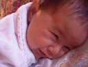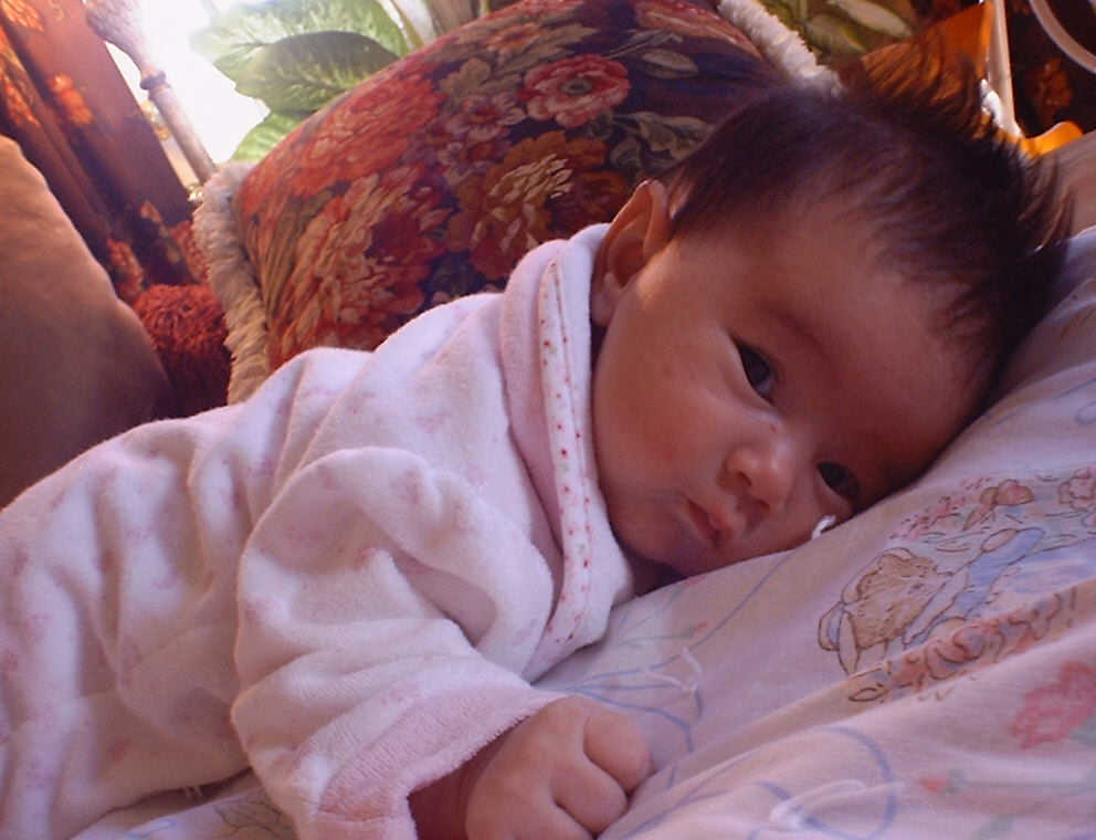 | Nadine at six weeks, getting a little exercise from "tummy time" -- look, she can lift her head already! After the "workout", it's time for some giggles, yawns, and of course a nap. Nadine, you are growing every day -- you're eyes are so bright, and just look at that smile! |