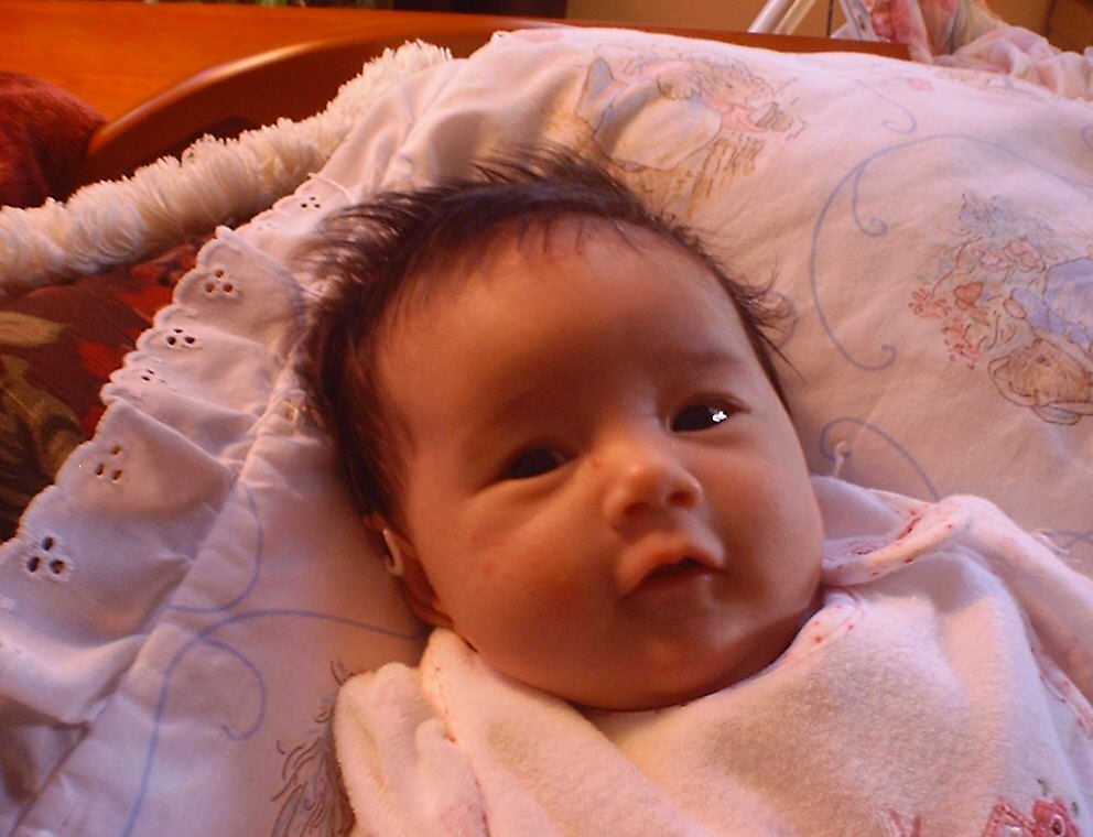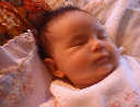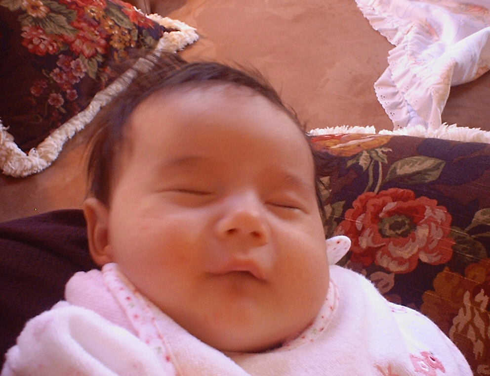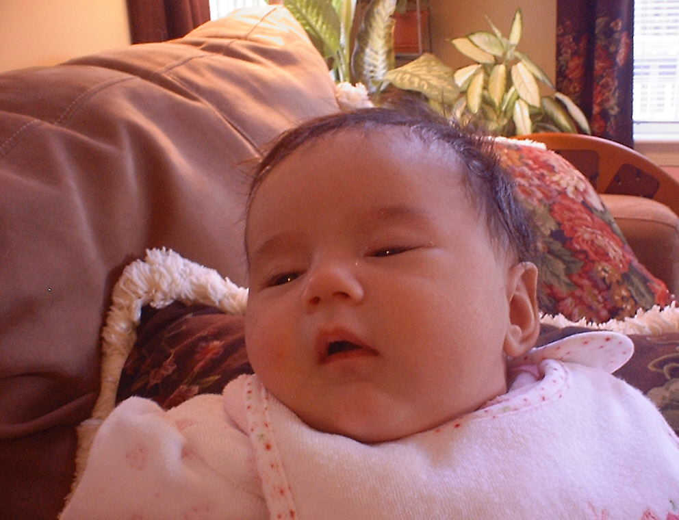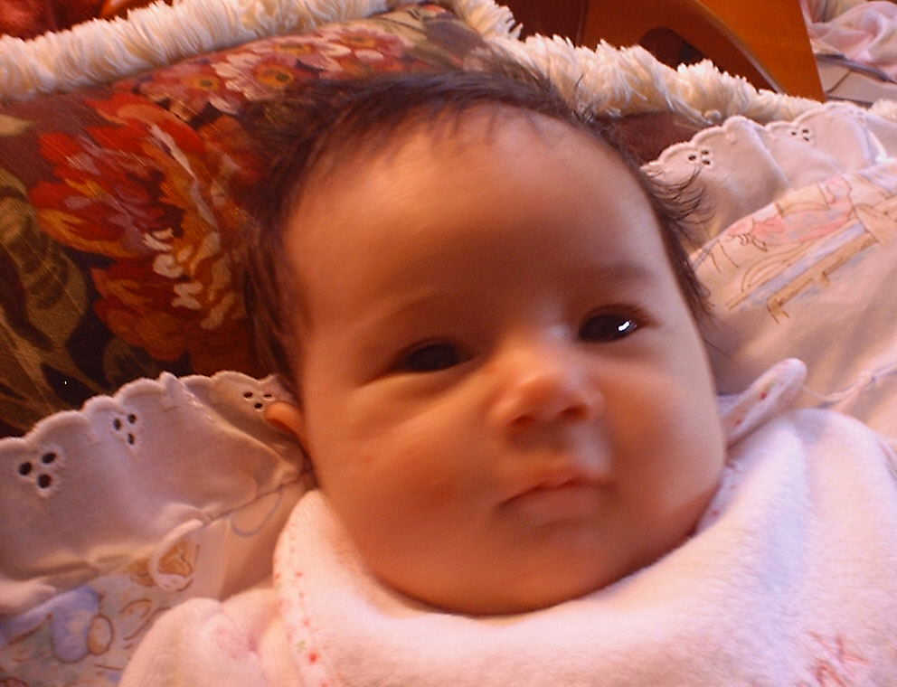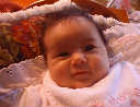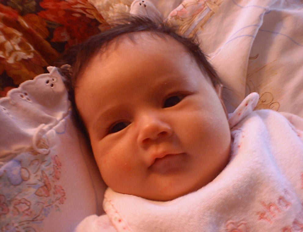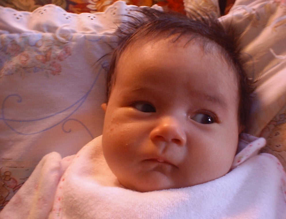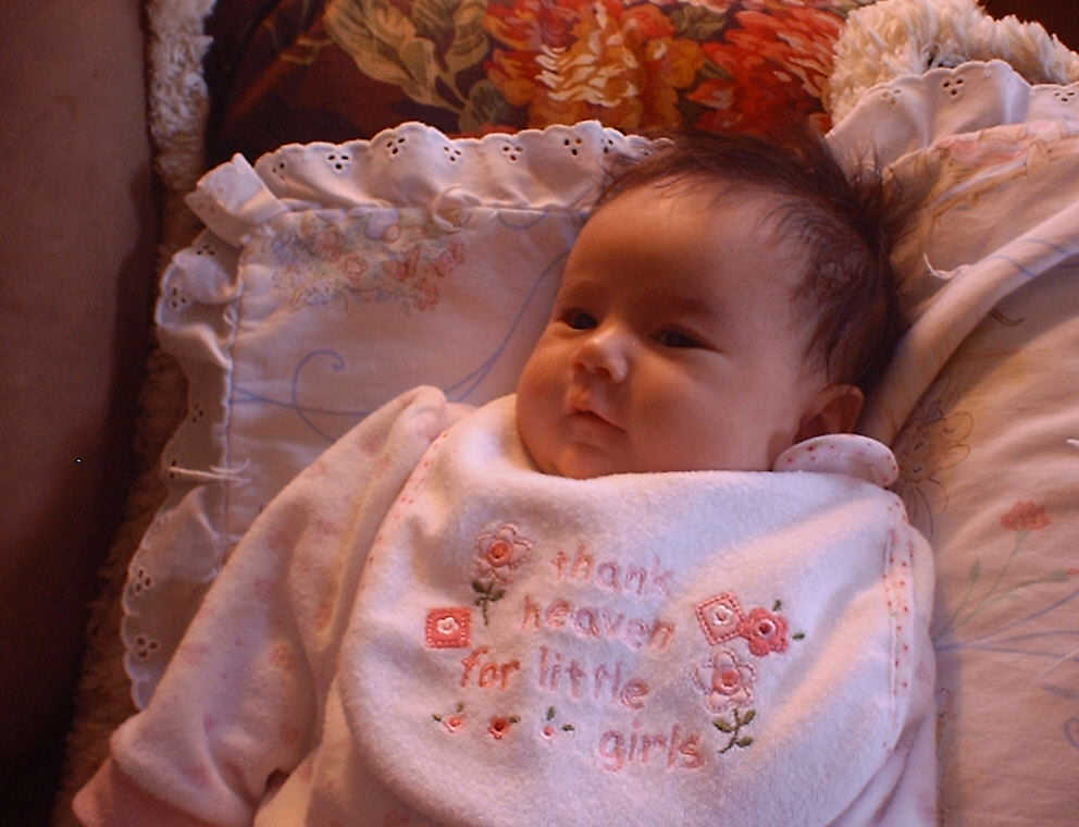 | Nadine at six weeks, getting a little exercise from "tummy time" -- look, she can lift her head already! After the "workout", it's time for some giggles, yawns, and of course a nap. Nadine, you are growing every day -- you're eyes are so bright, and just look at that smile! |
