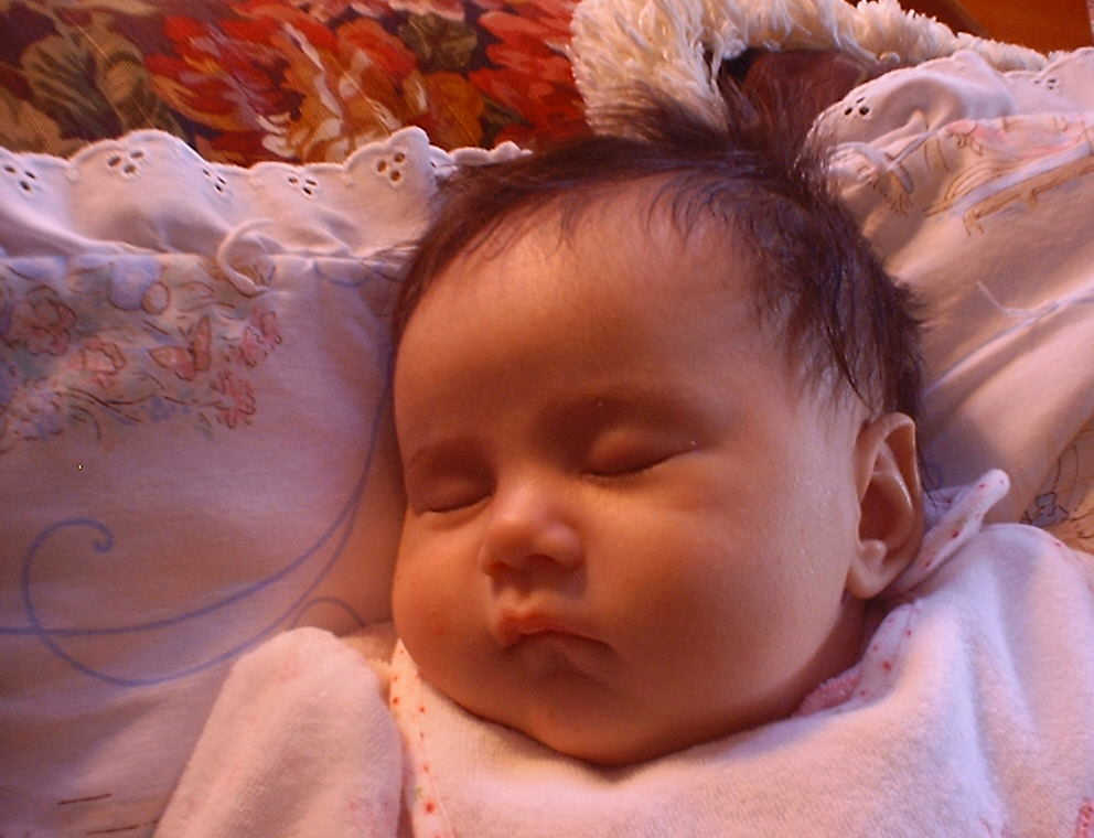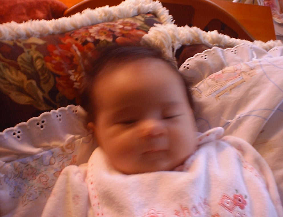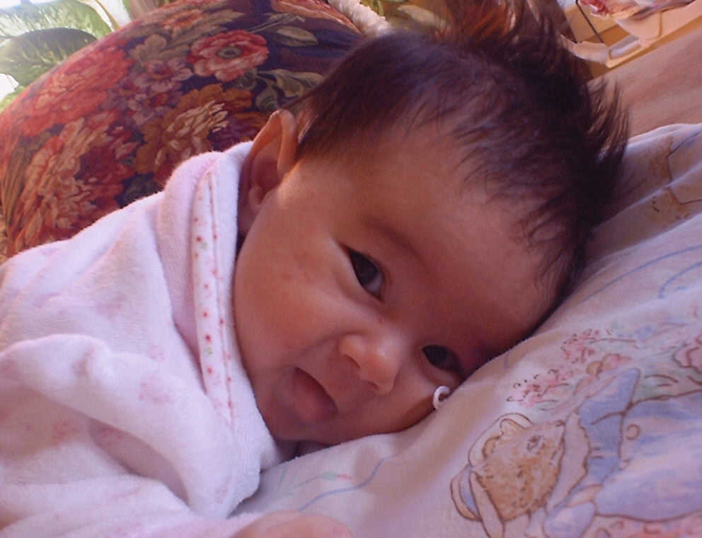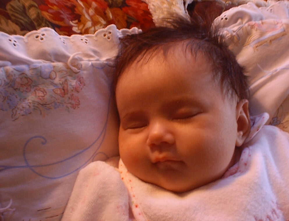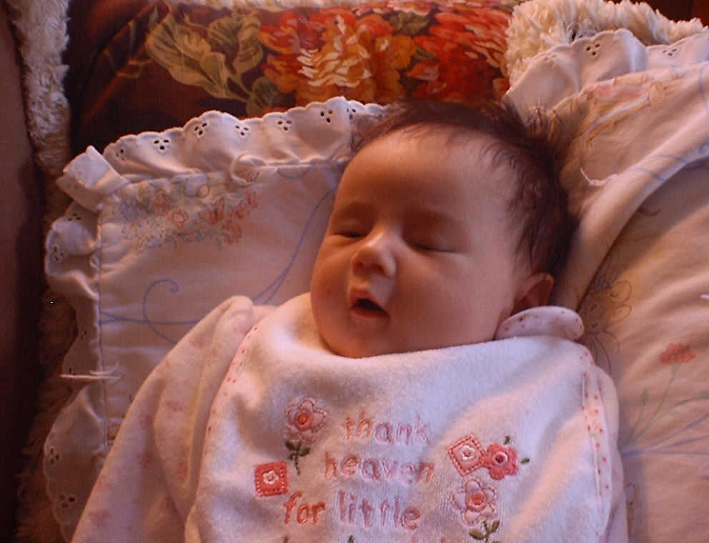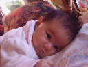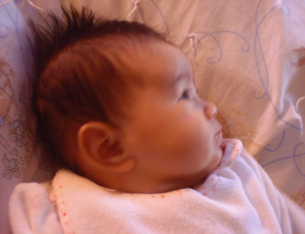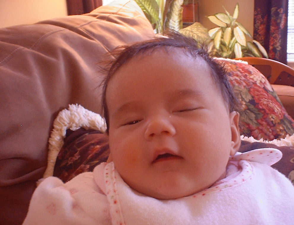 | Nadine at six weeks, getting a little exercise from "tummy time" -- look, she can lift her head already! After the "workout", it's time for some giggles, yawns, and of course a nap. Nadine, you are growing every day -- you're eyes are so bright, and just look at that smile! |