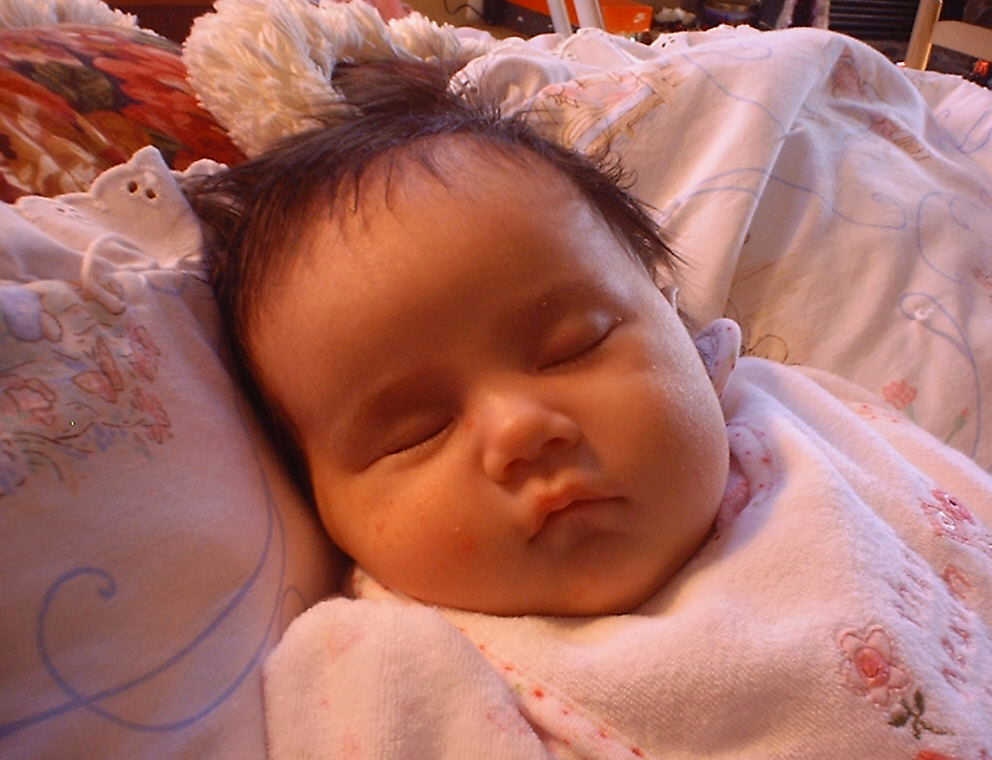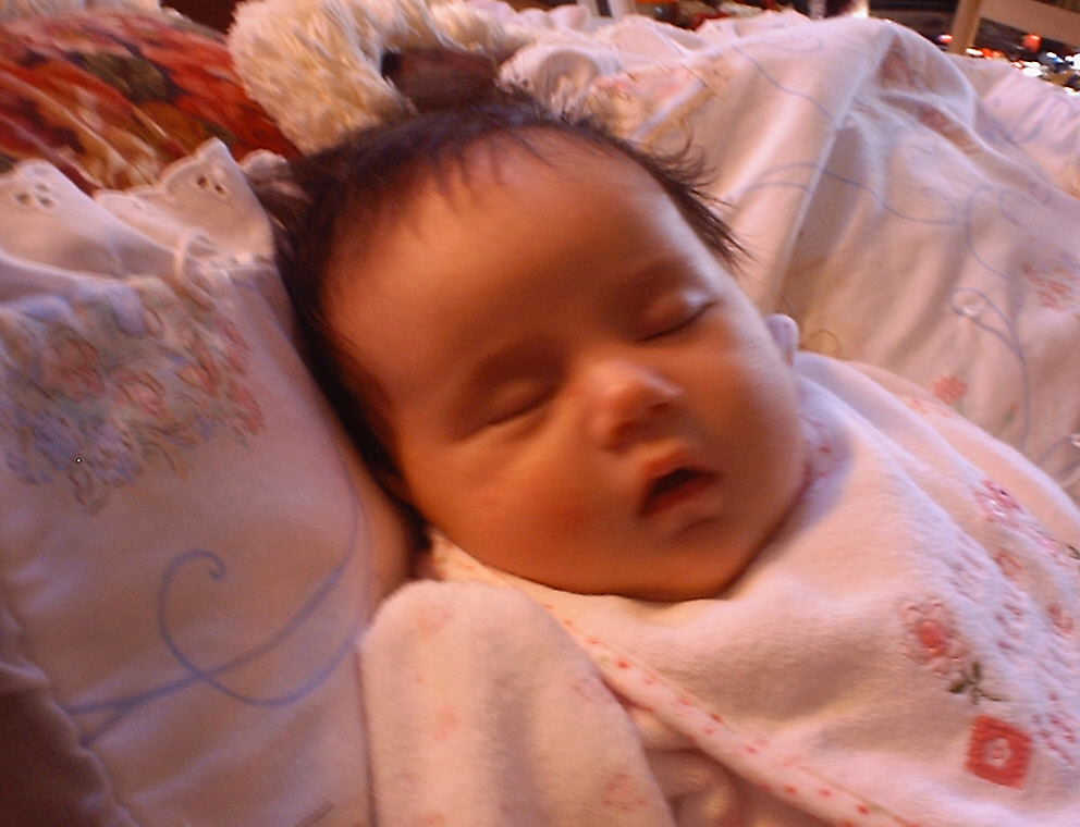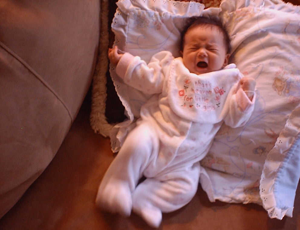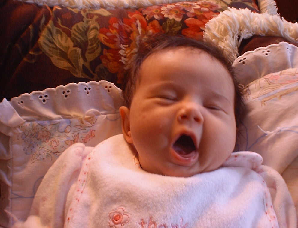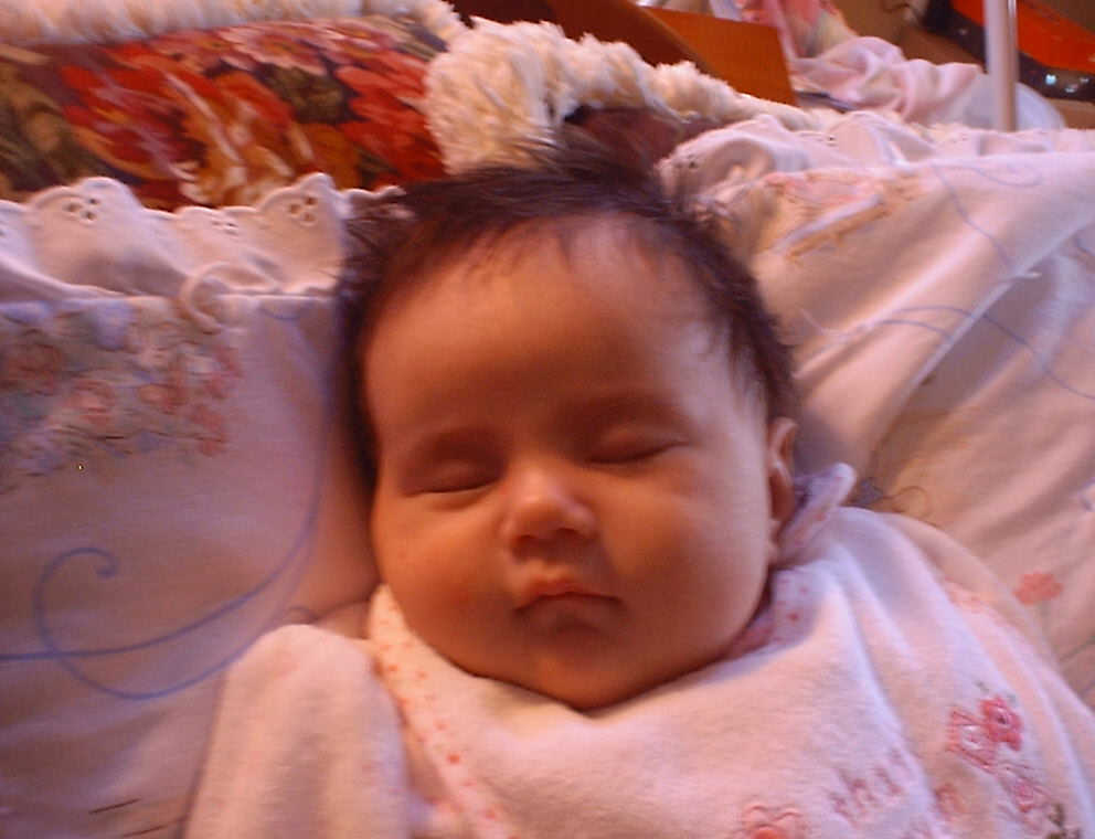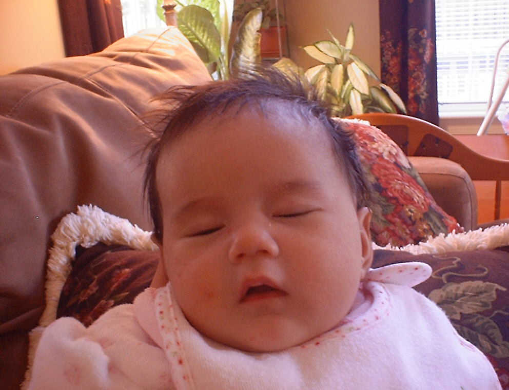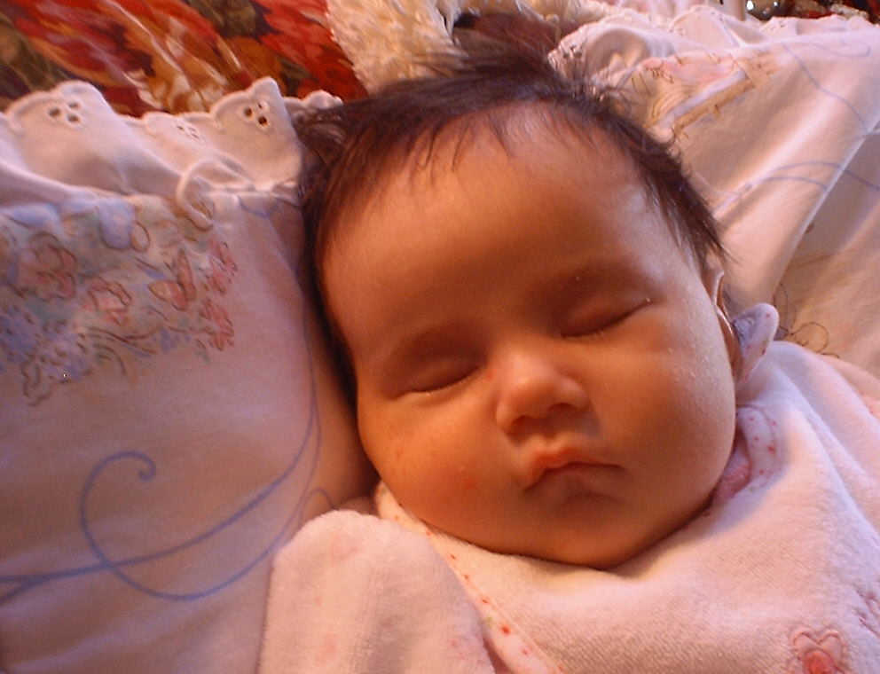 | Nadine at six weeks, getting a little exercise from "tummy time" -- look, she can lift her head already! After the "workout", it's time for some giggles, yawns, and of course a nap. Nadine, you are growing every day -- you're eyes are so bright, and just look at that smile! |