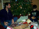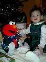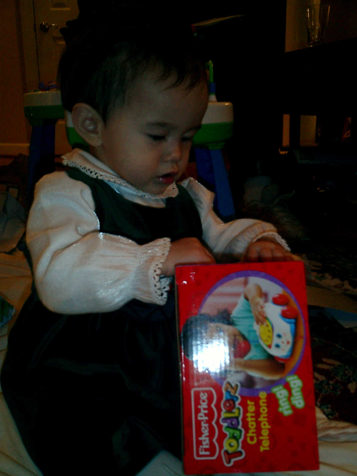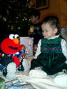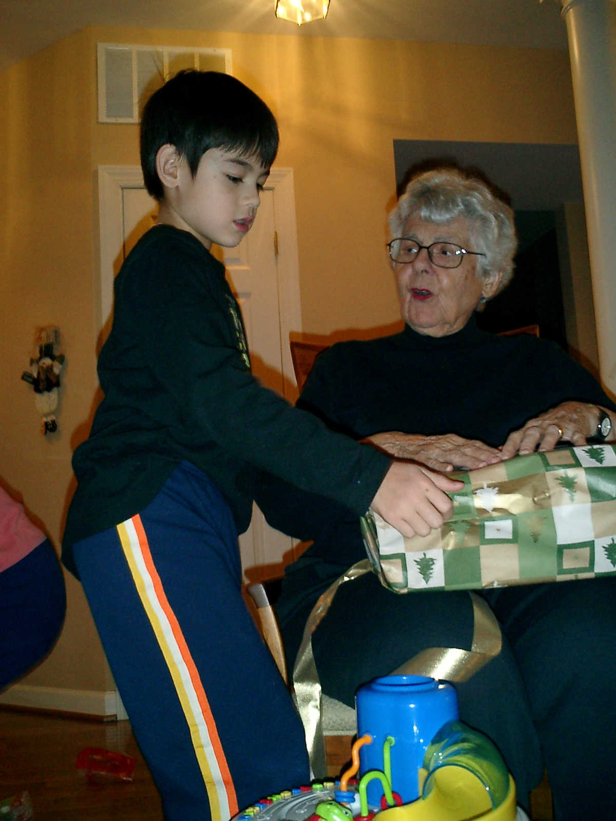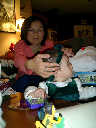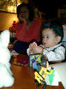Nadine at 13 months (Dec 25, 2007), having more Christmas Day fun, opening presents in the afternoon with Grandma Alexander and Uncle Dave. What a beautiful Christmas dress you have, Nadine!
