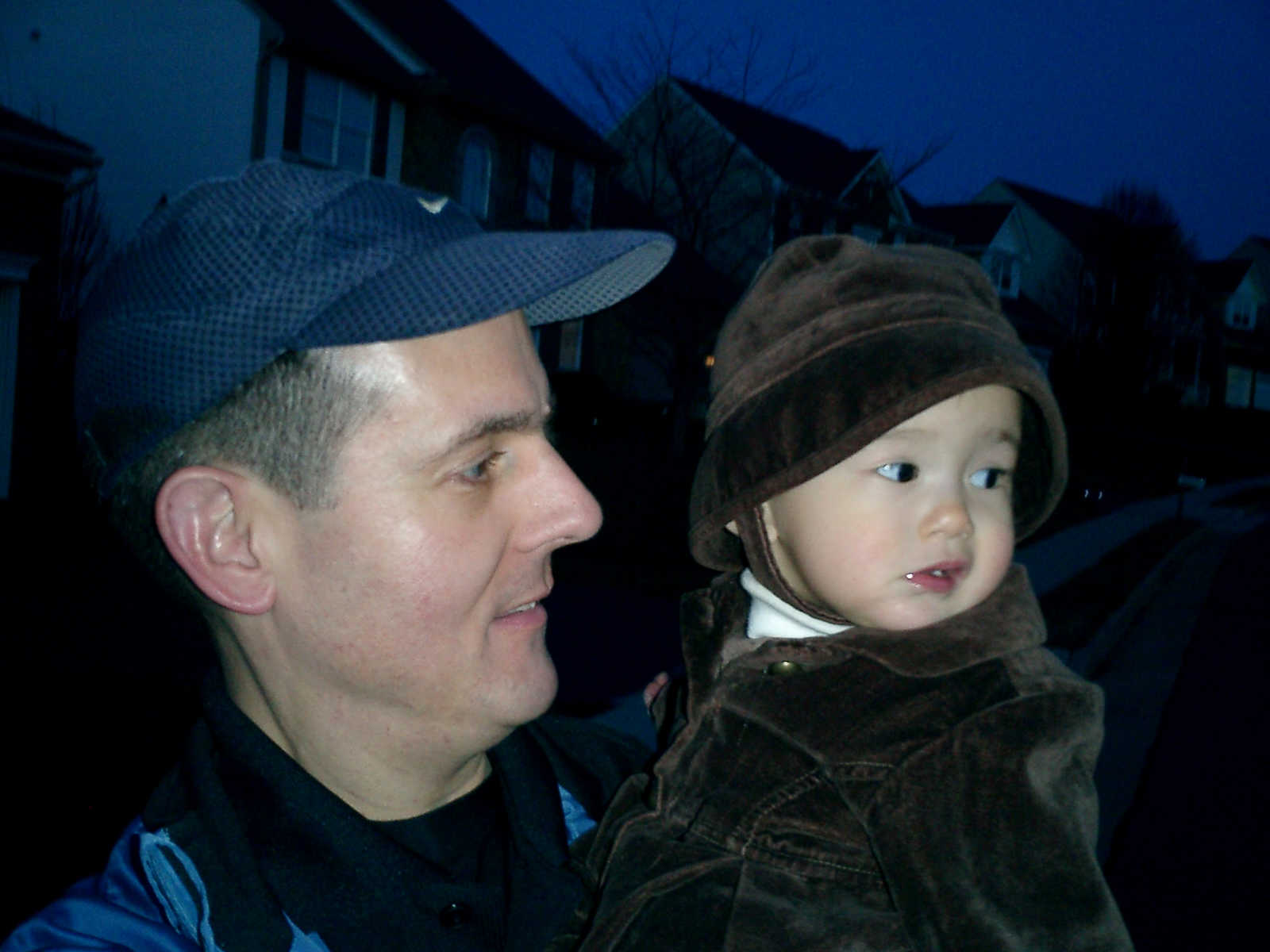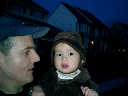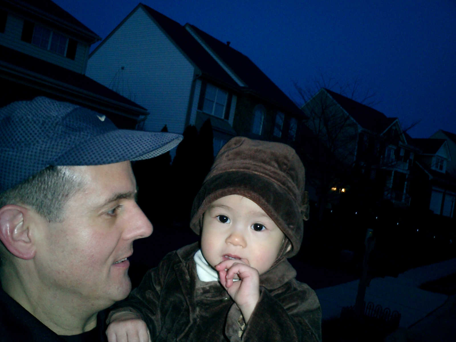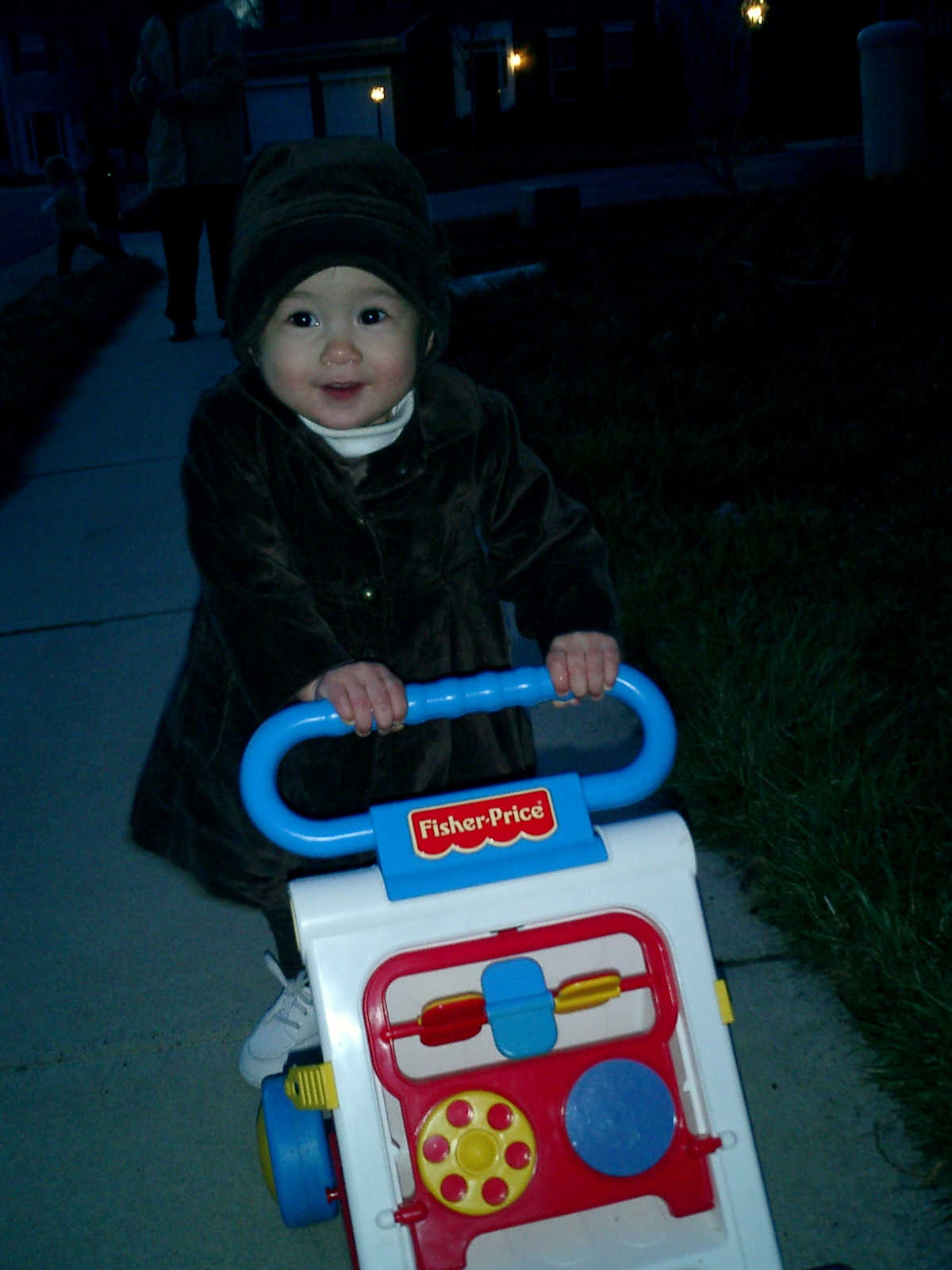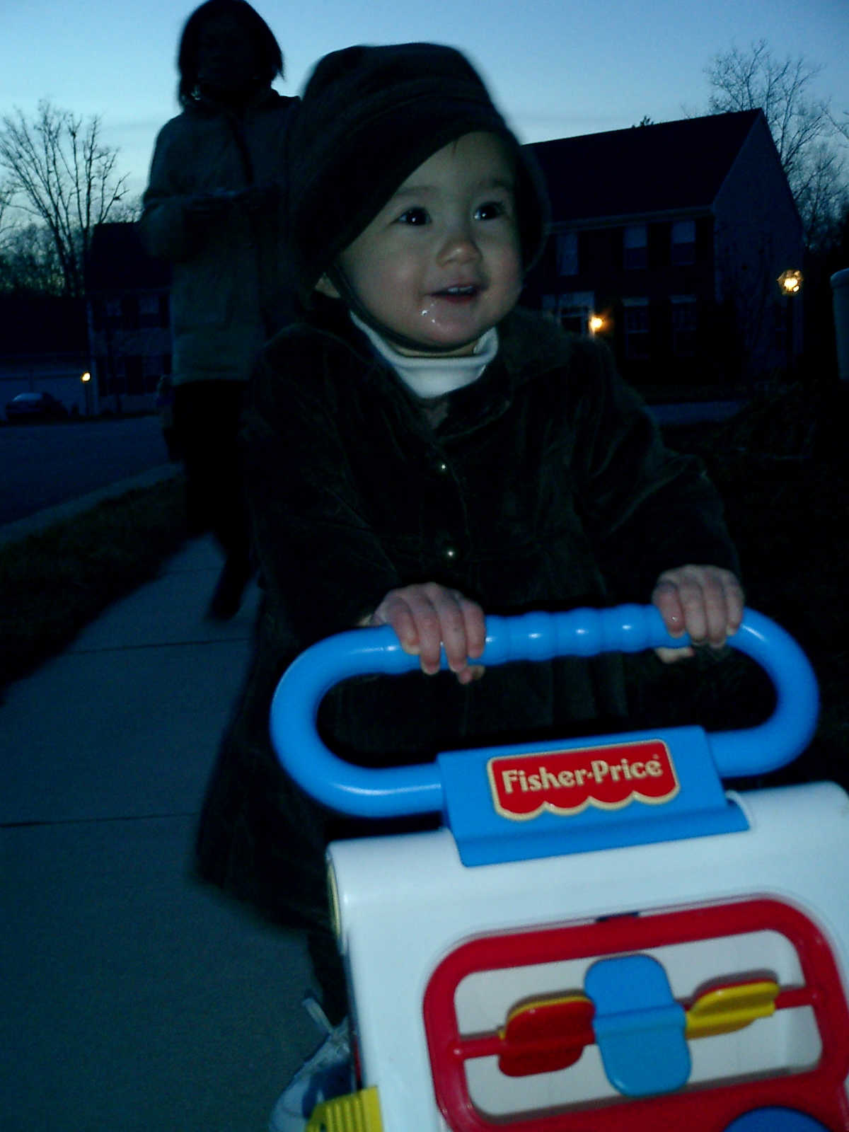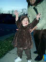 Nadine at 13 months (Jan 6, 2008), taking a short evening stoll in front of the house. Nadine, you look so cute in your brown velvet coat -- and especially that nice warm hat!