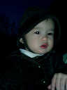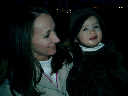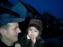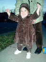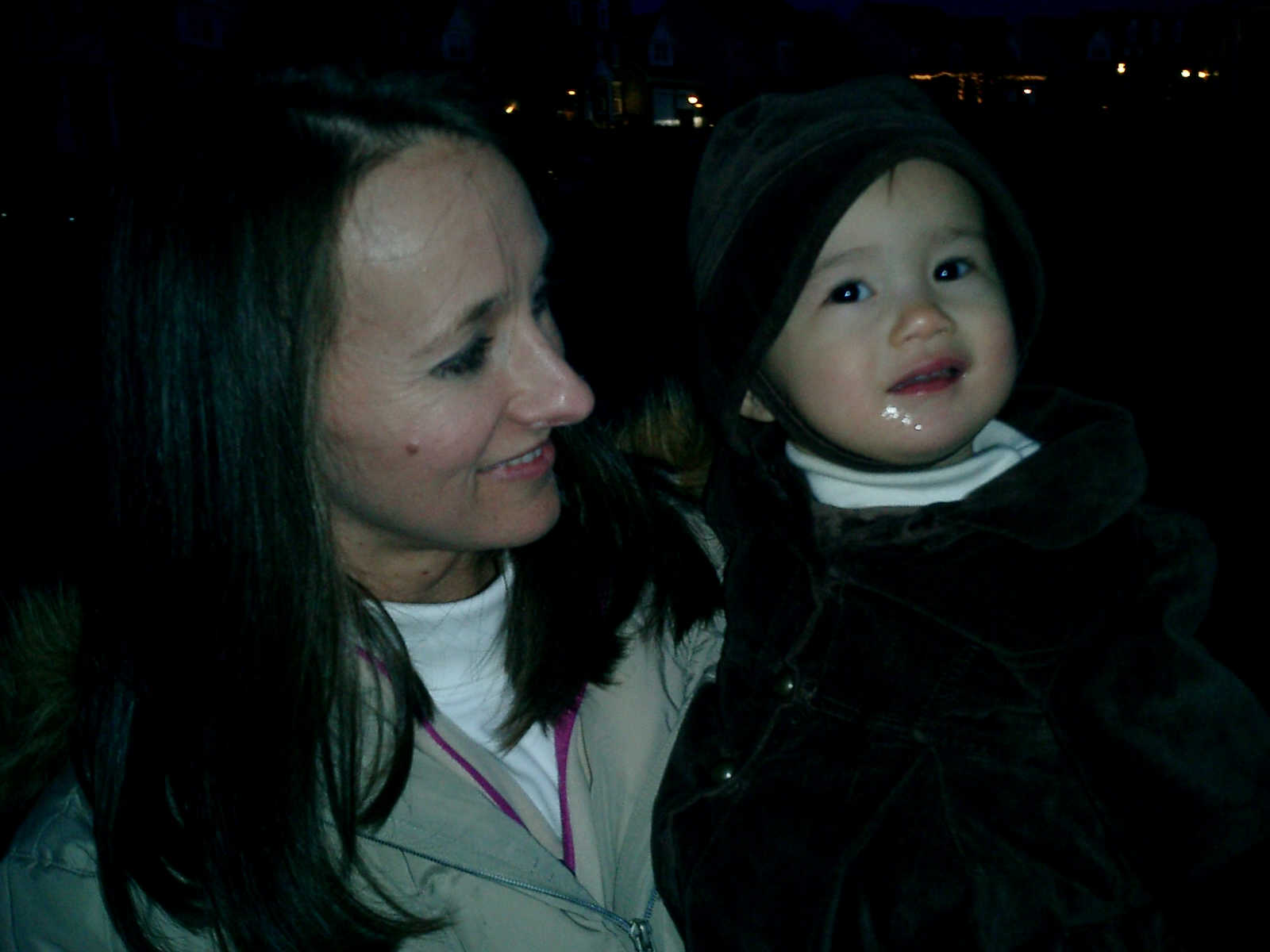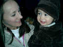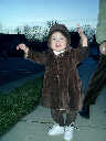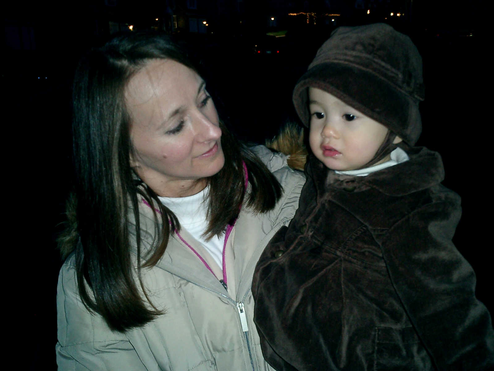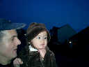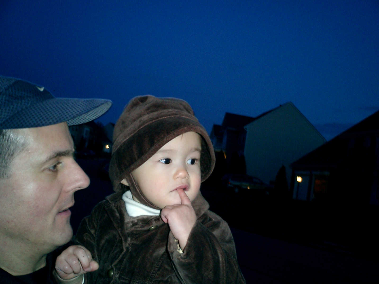 Nadine at 13 months (Jan 6, 2008), taking a short evening stoll in front of the house. Nadine, you look so cute in your brown velvet coat -- and especially that nice warm hat!