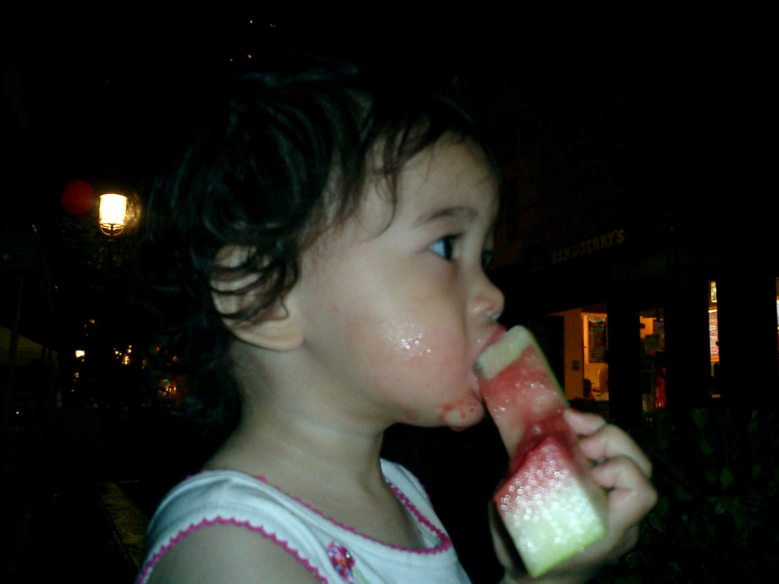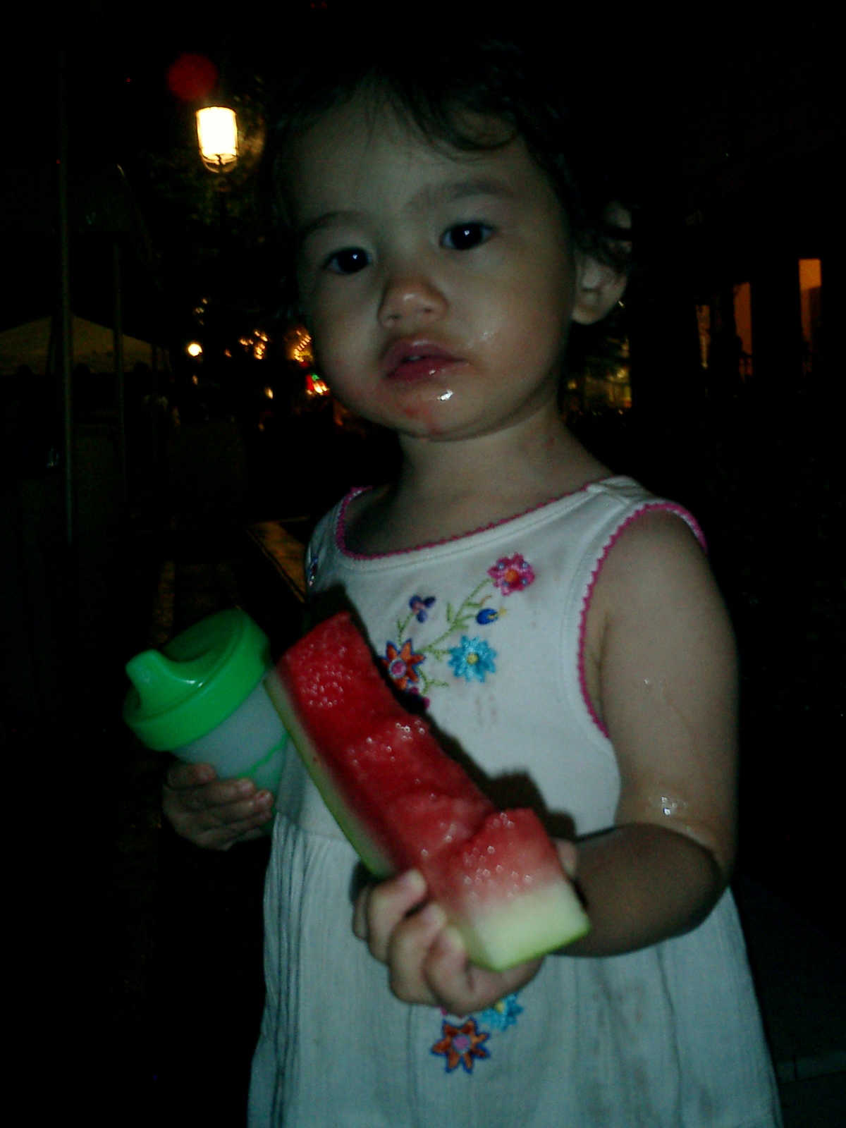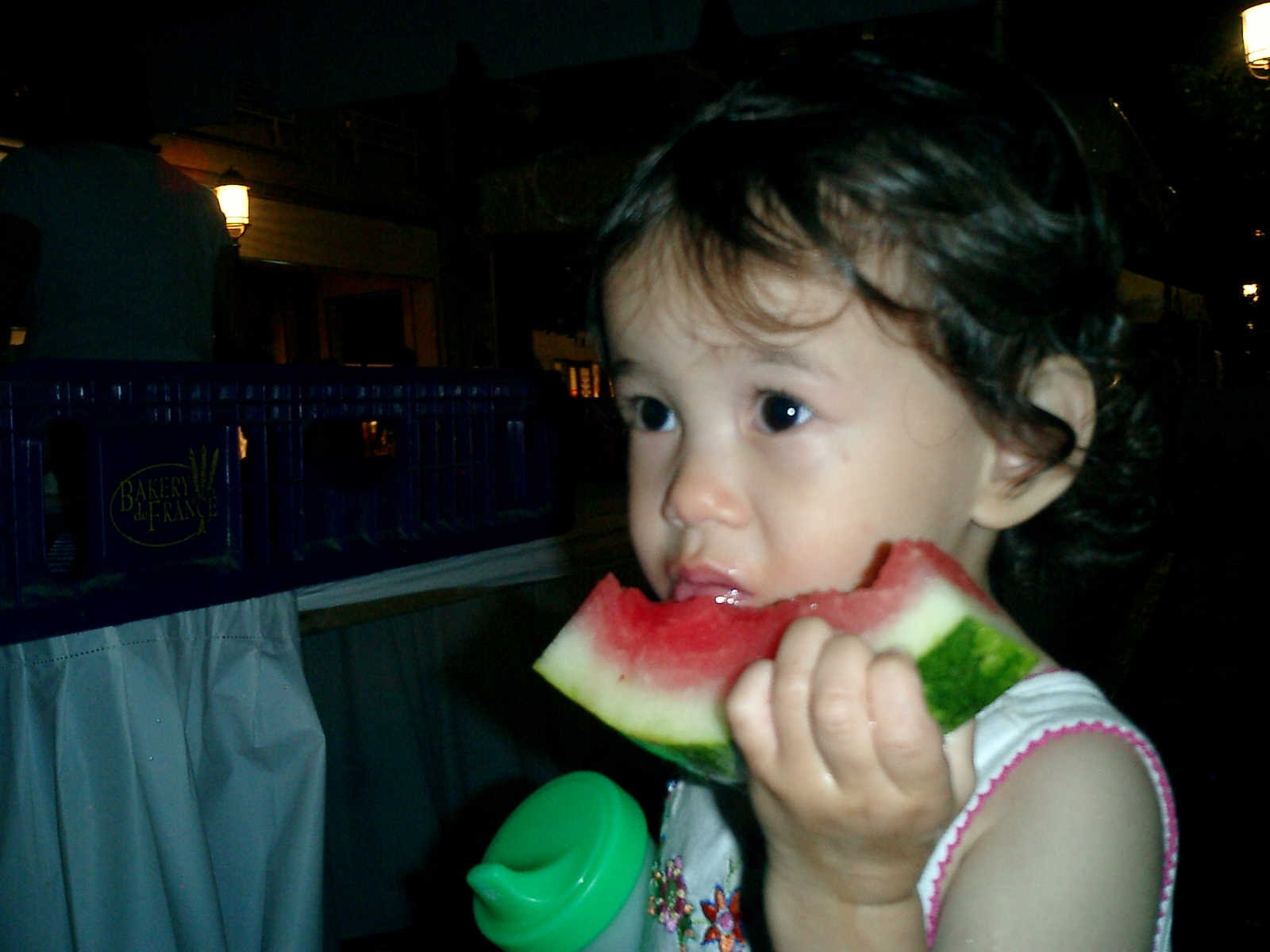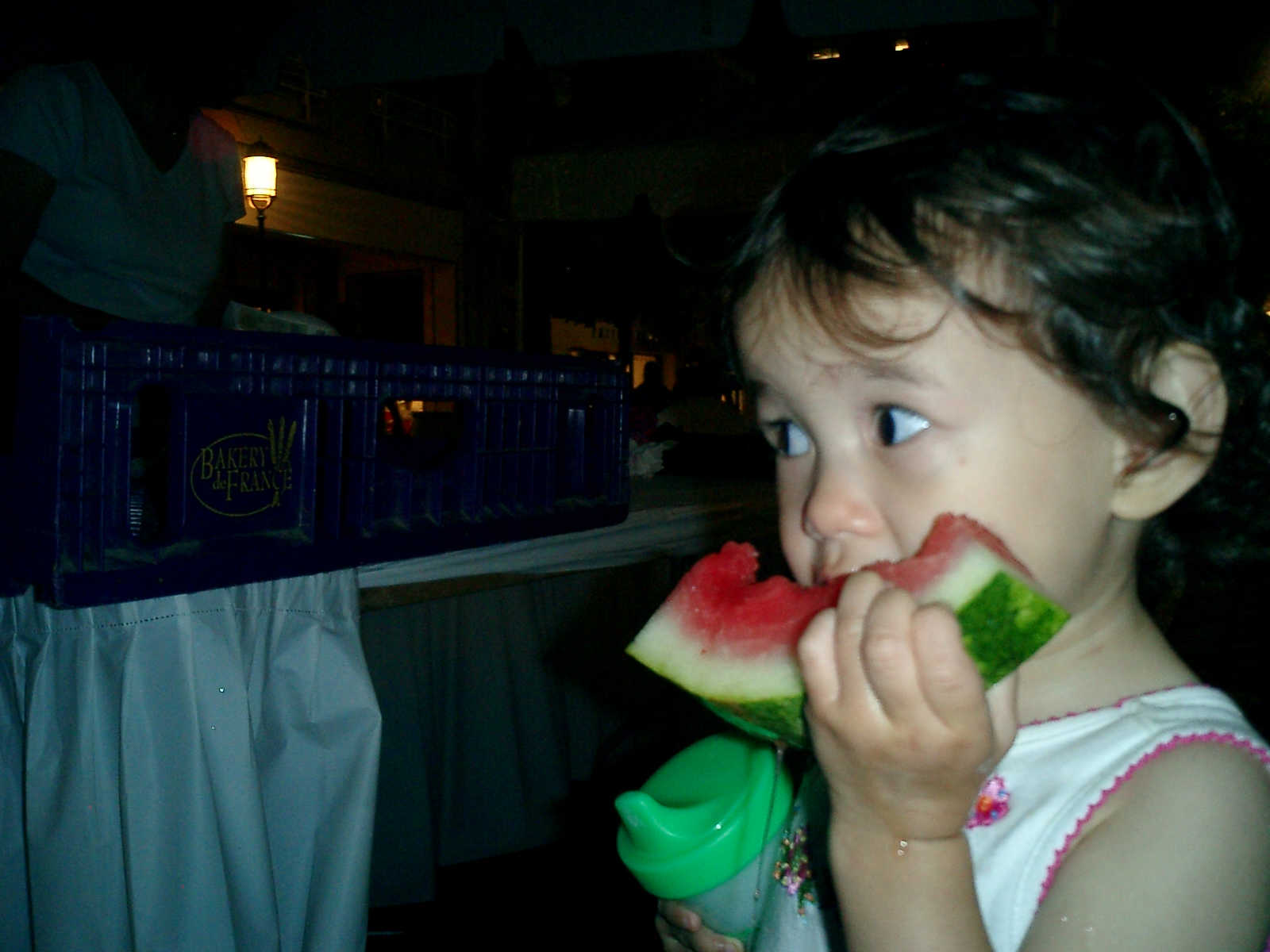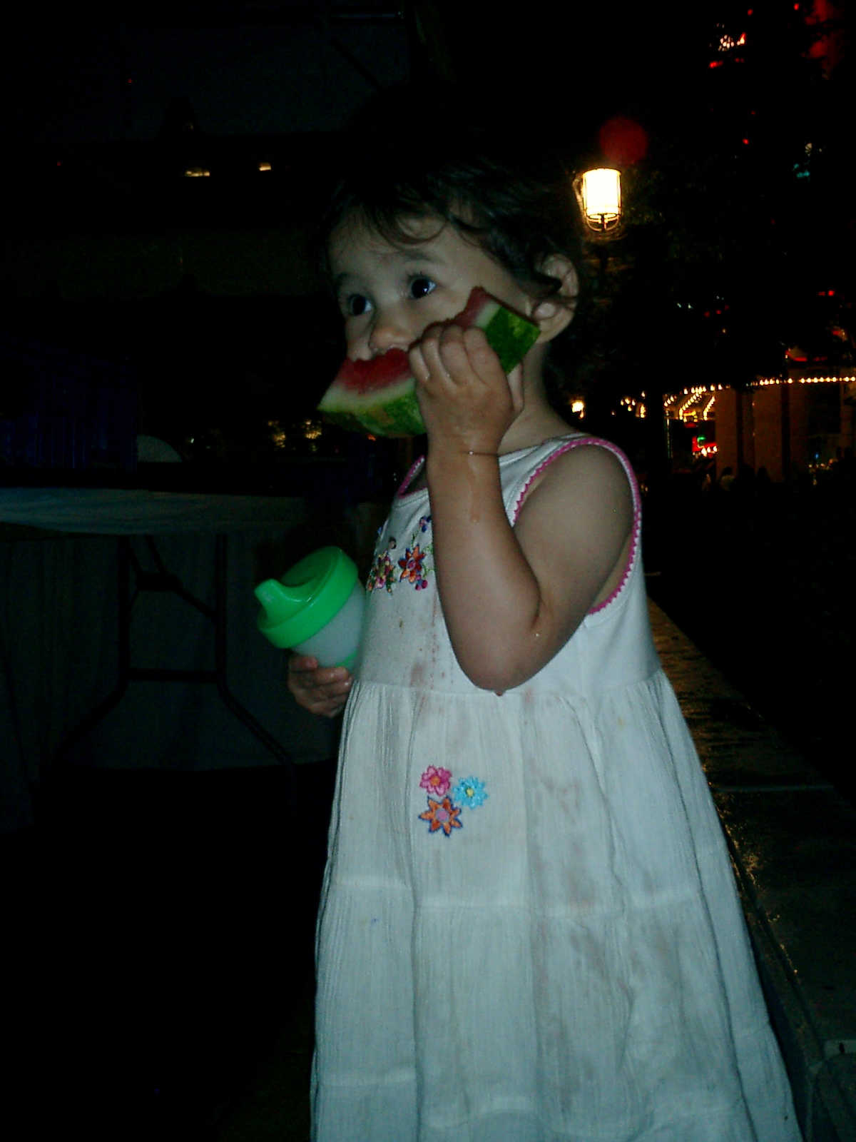 Nadine at 20 and a half months (June 14, 2008), with the whole family at the Taste of Reston outdoor festival. Nadine, is that you modeling your stylish new hat, and eating all that watermelon? (It sure is!)