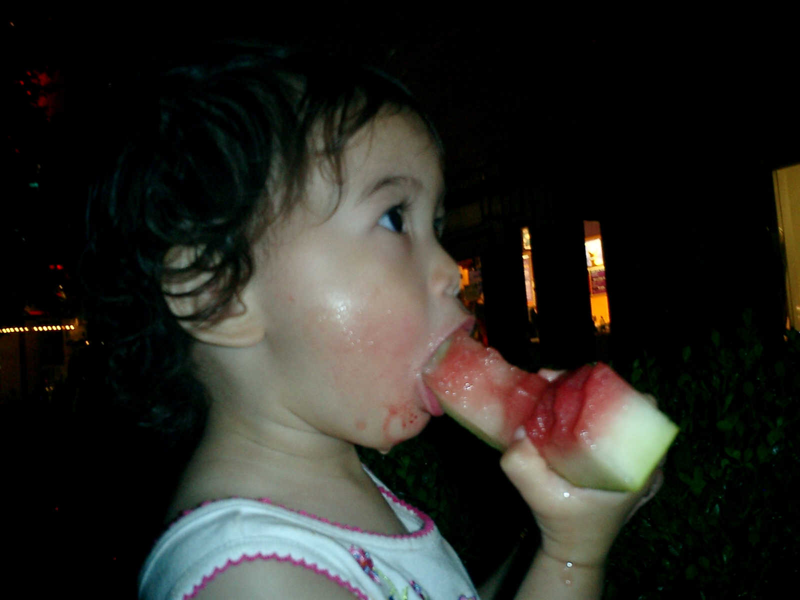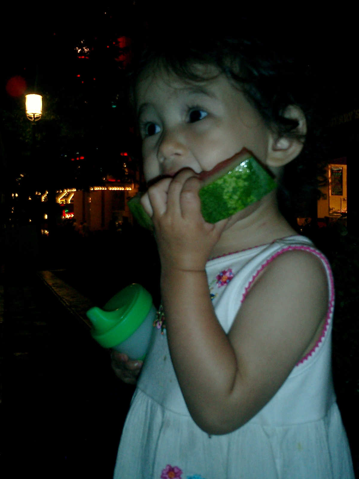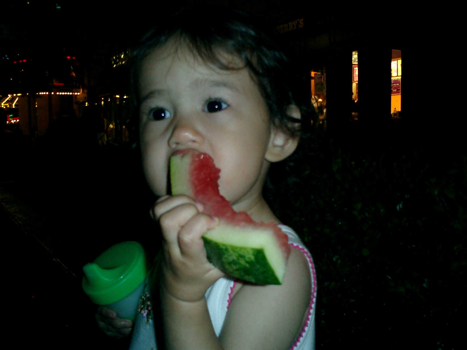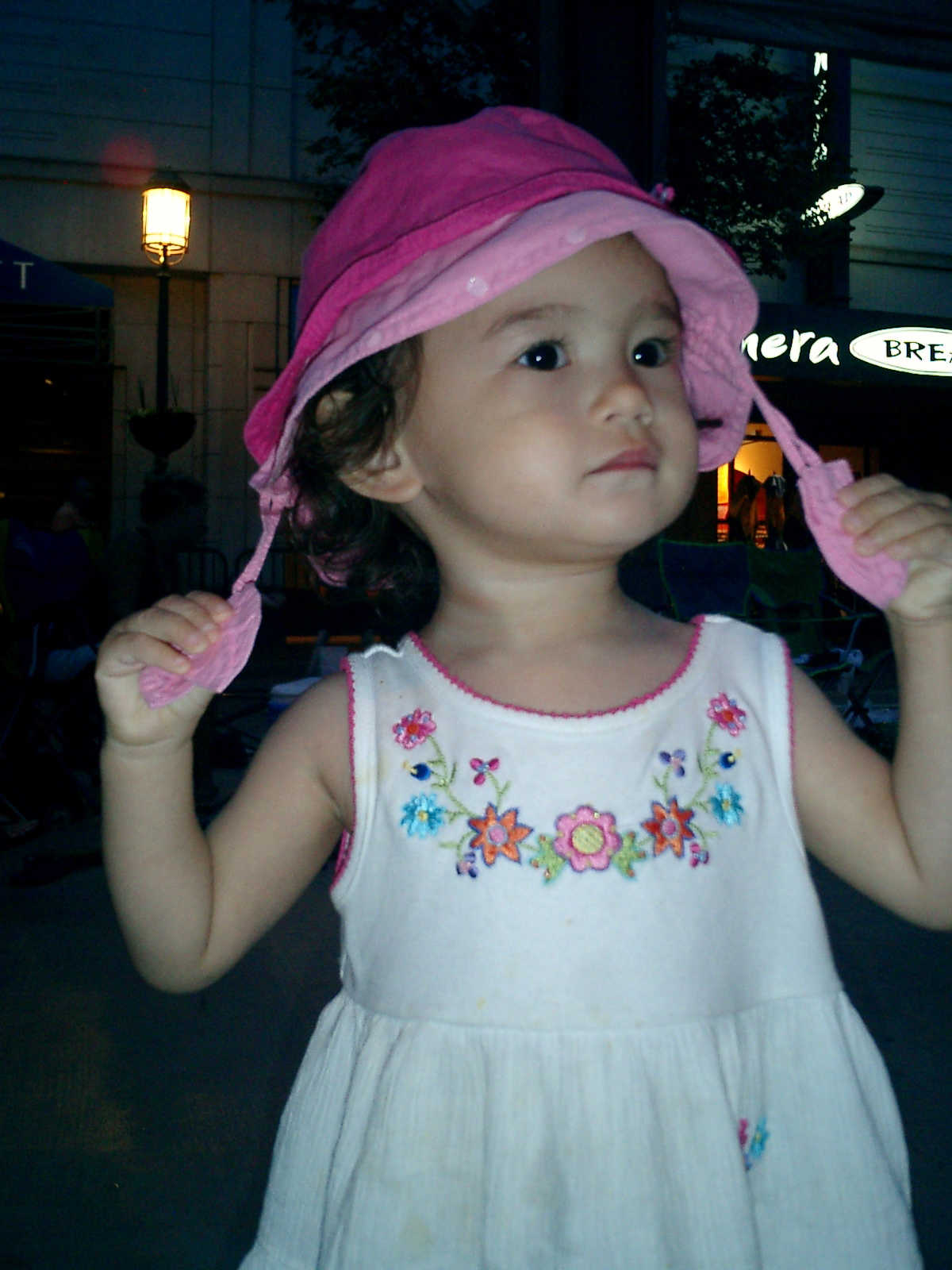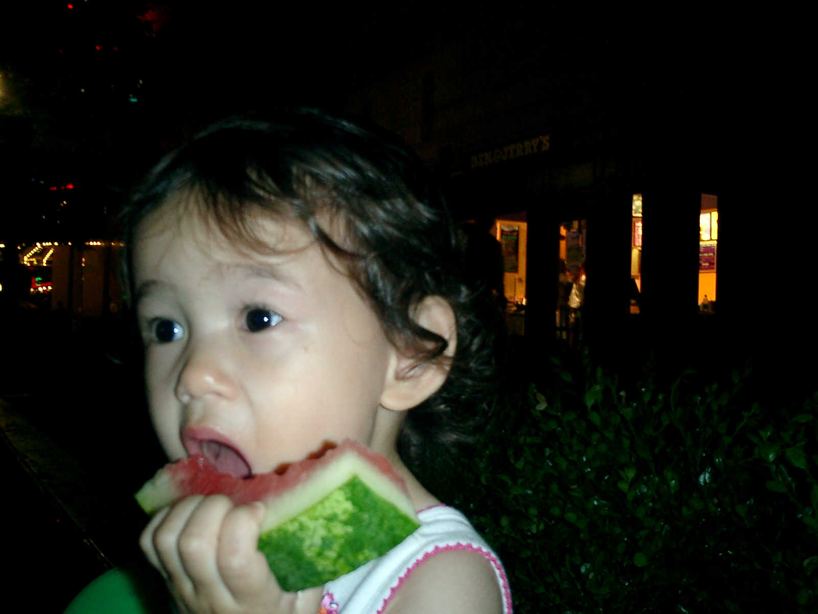 Nadine at 20 and a half months (June 14, 2008), with the whole family at the Taste of Reston outdoor festival. Nadine, is that you modeling your stylish new hat, and eating all that watermelon? (It sure is!)