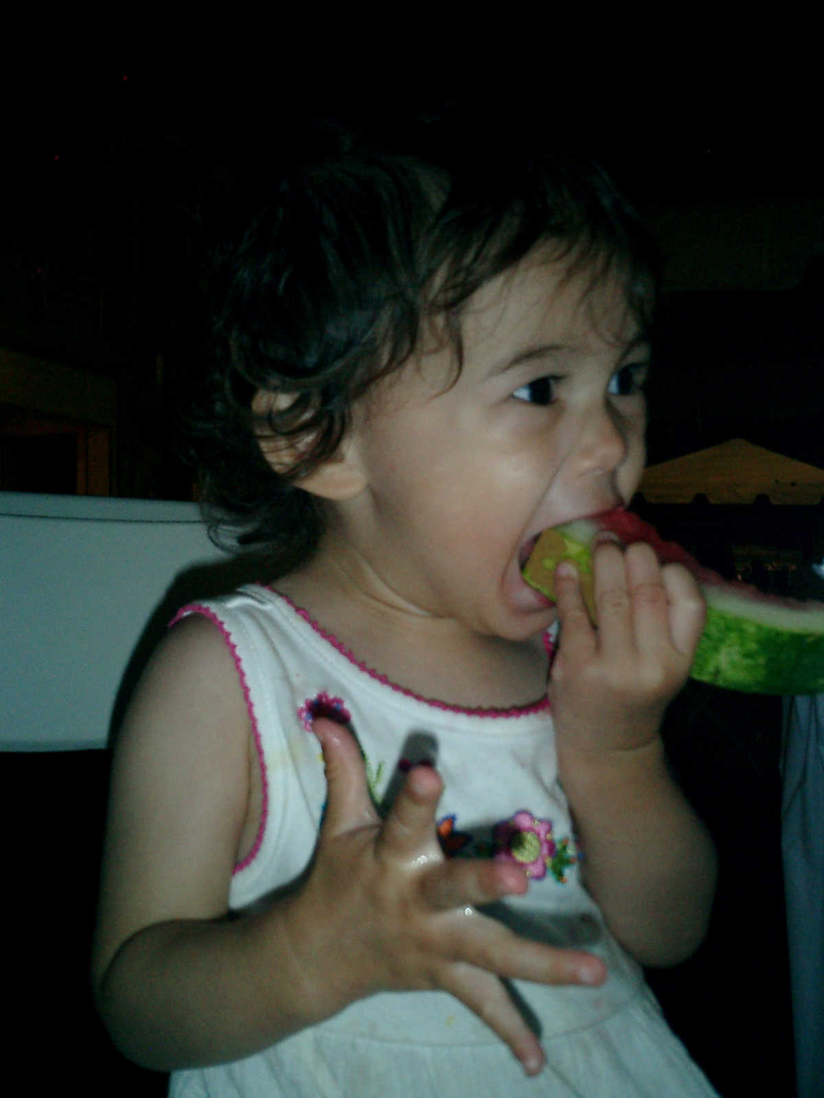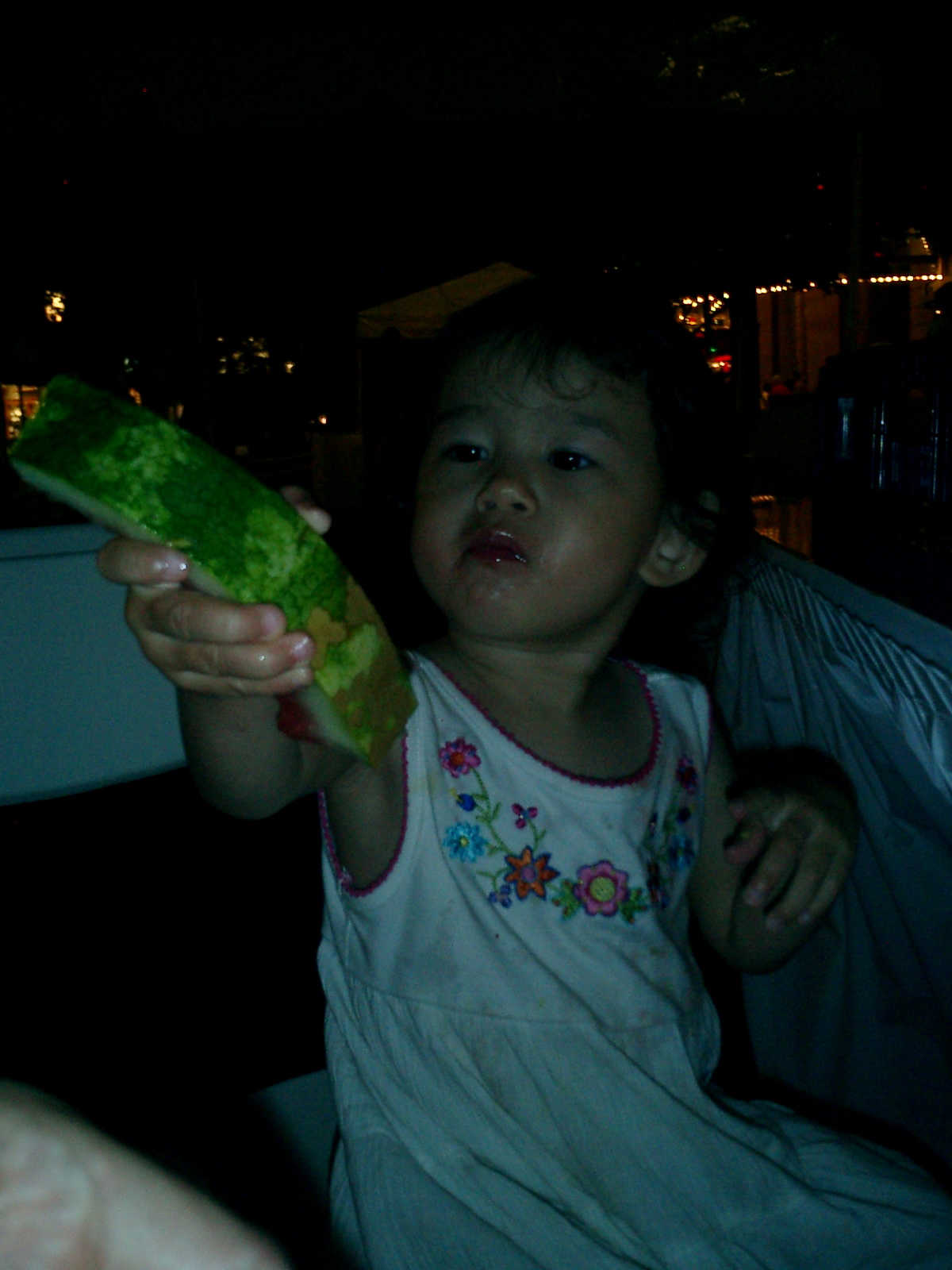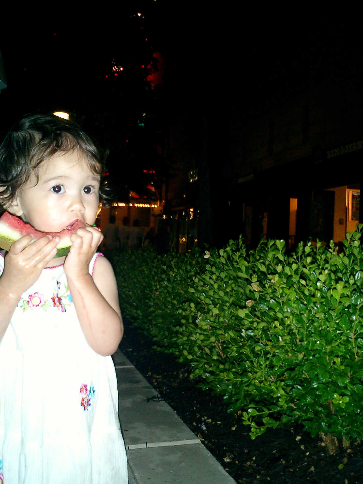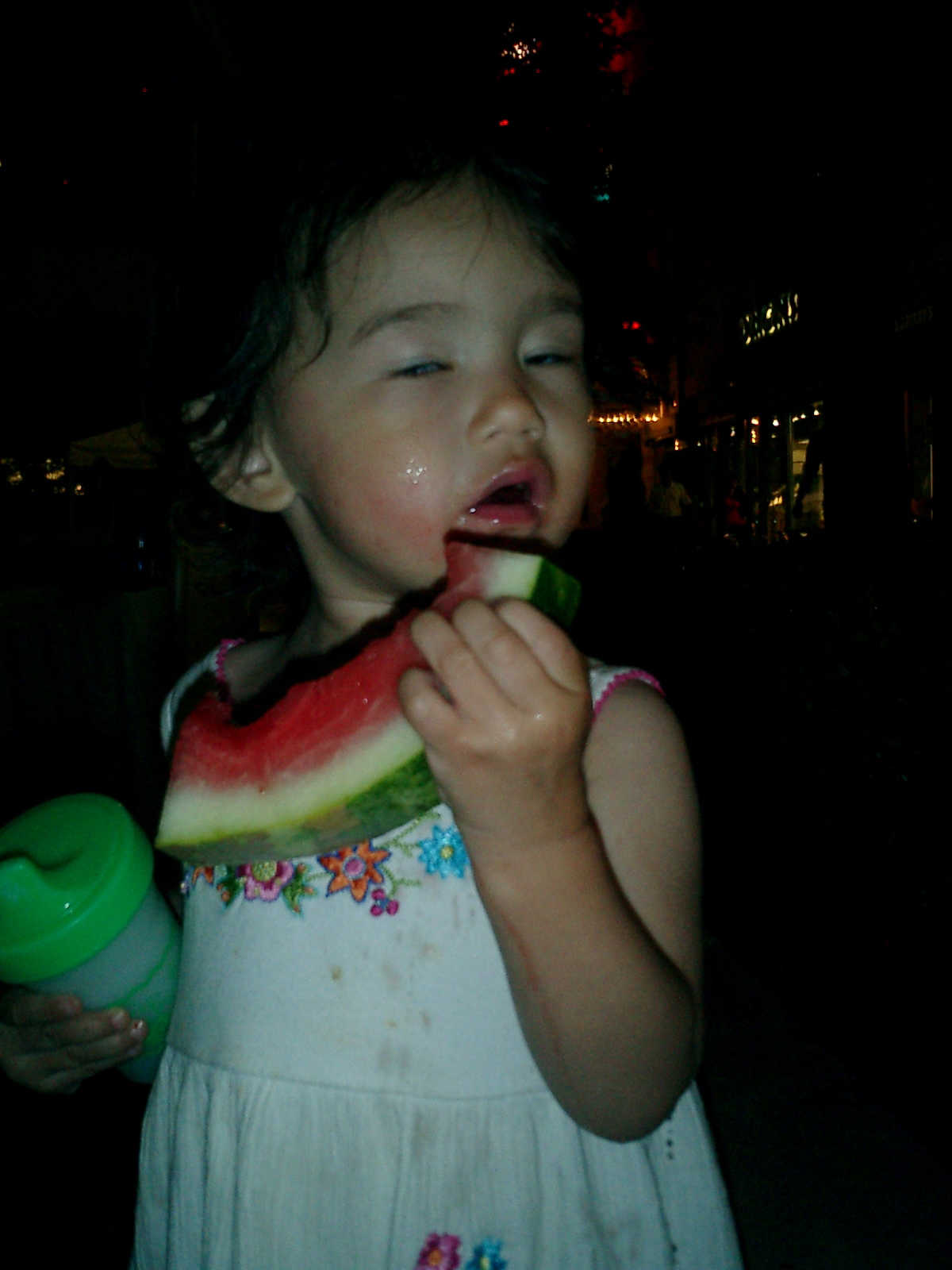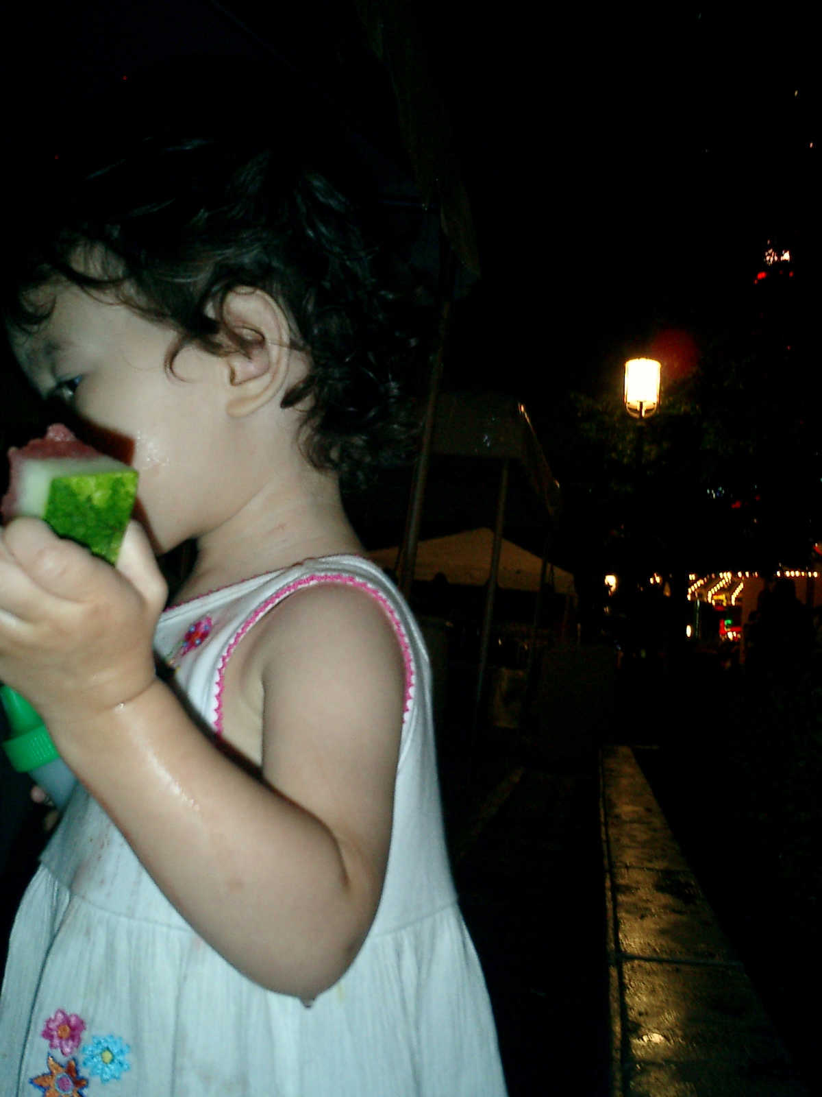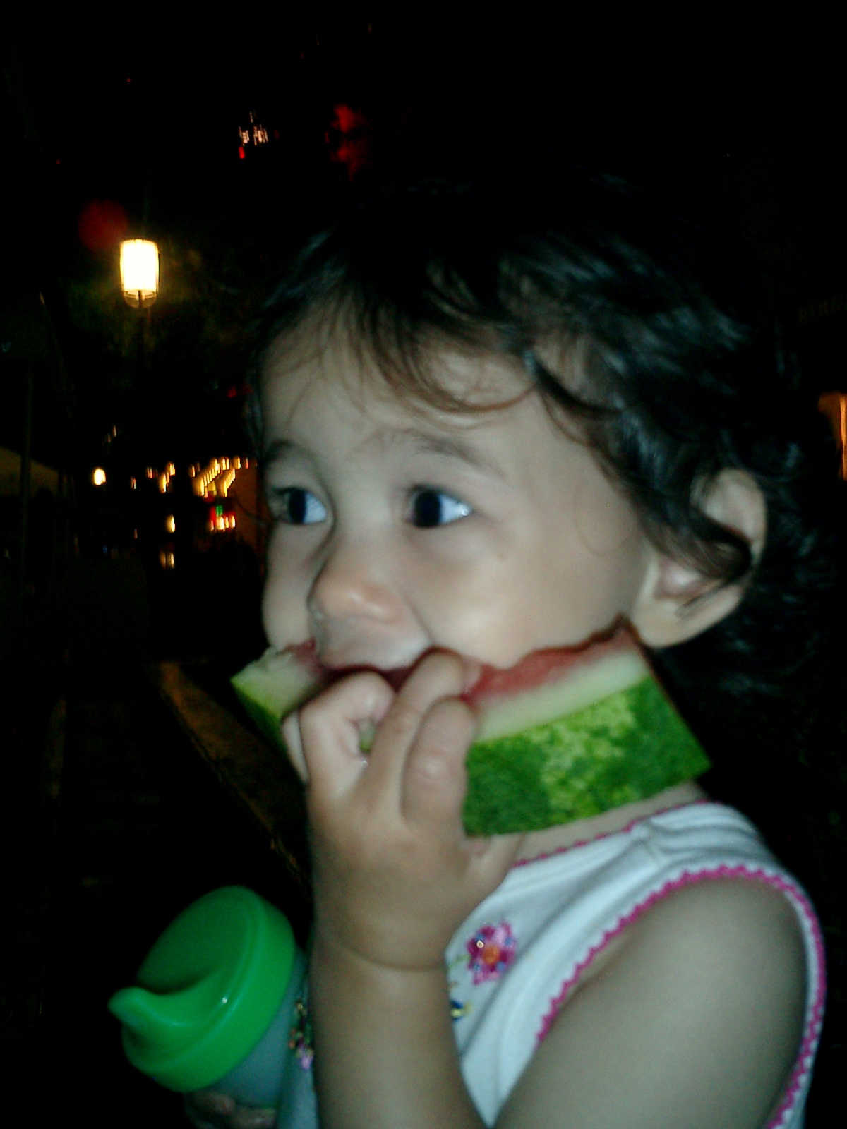 Nadine at 20 and a half months (June 14, 2008), with the whole family at the Taste of Reston outdoor festival. Nadine, is that you modeling your stylish new hat, and eating all that watermelon? (It sure is!)