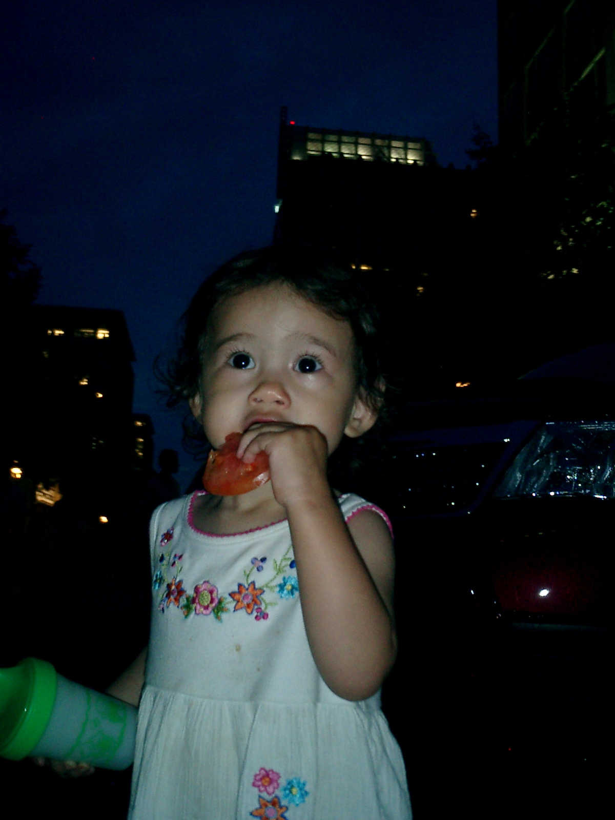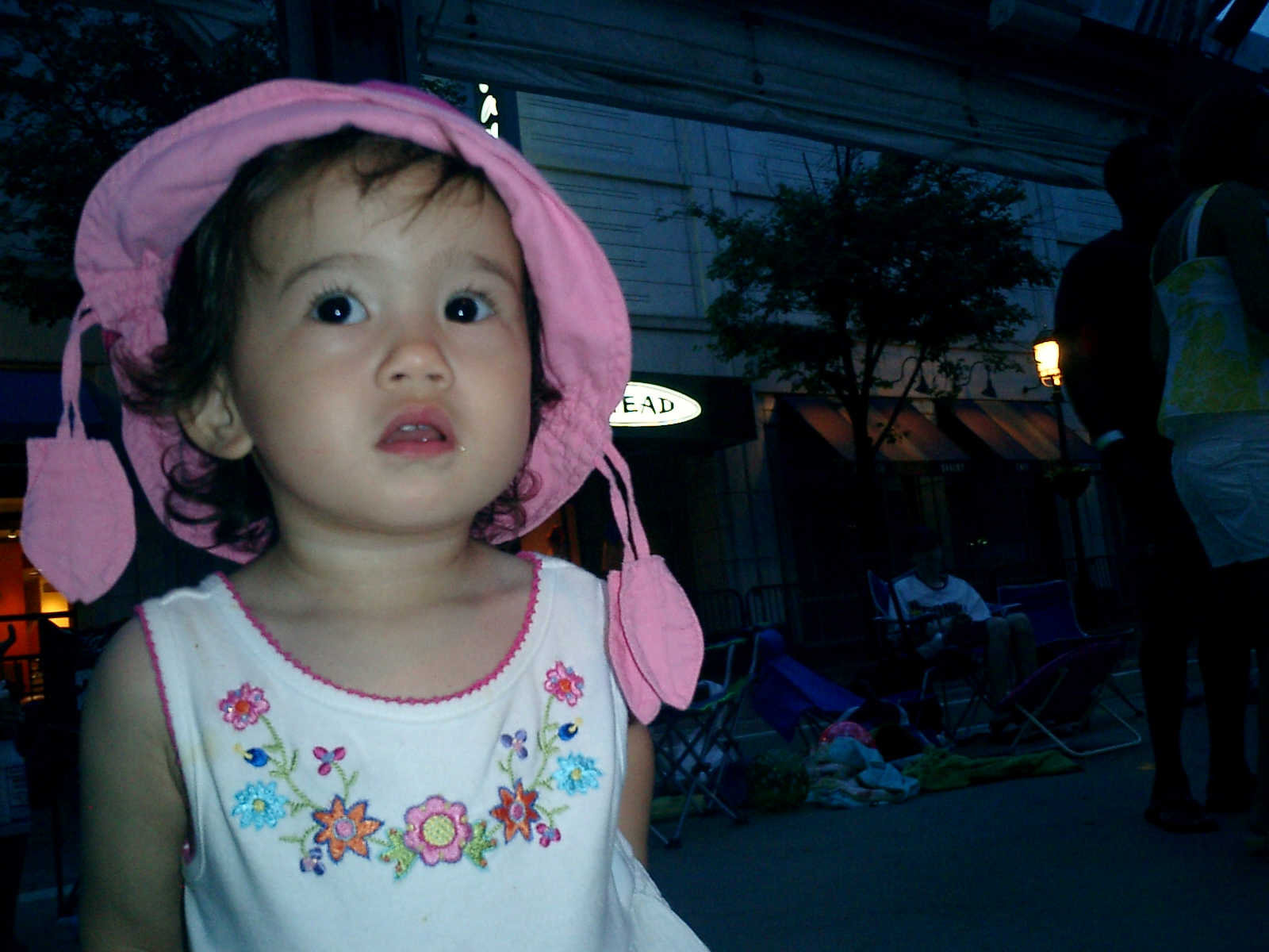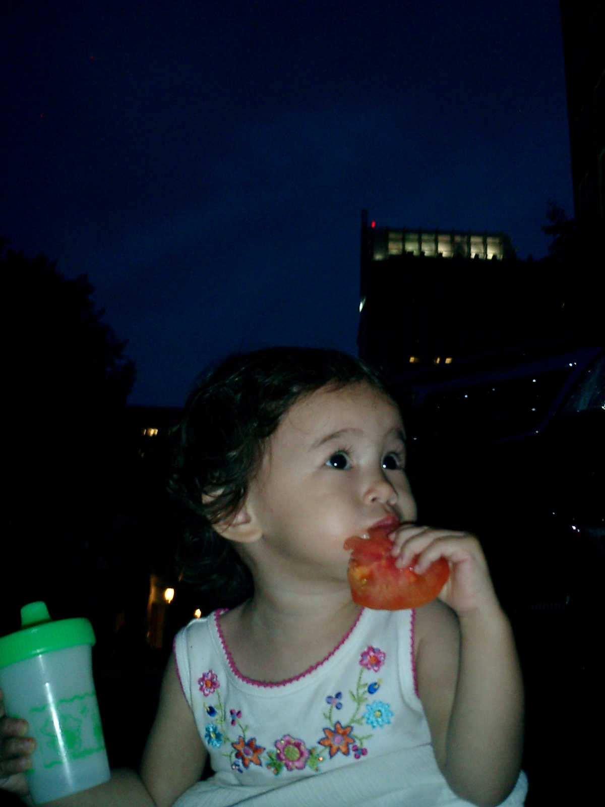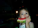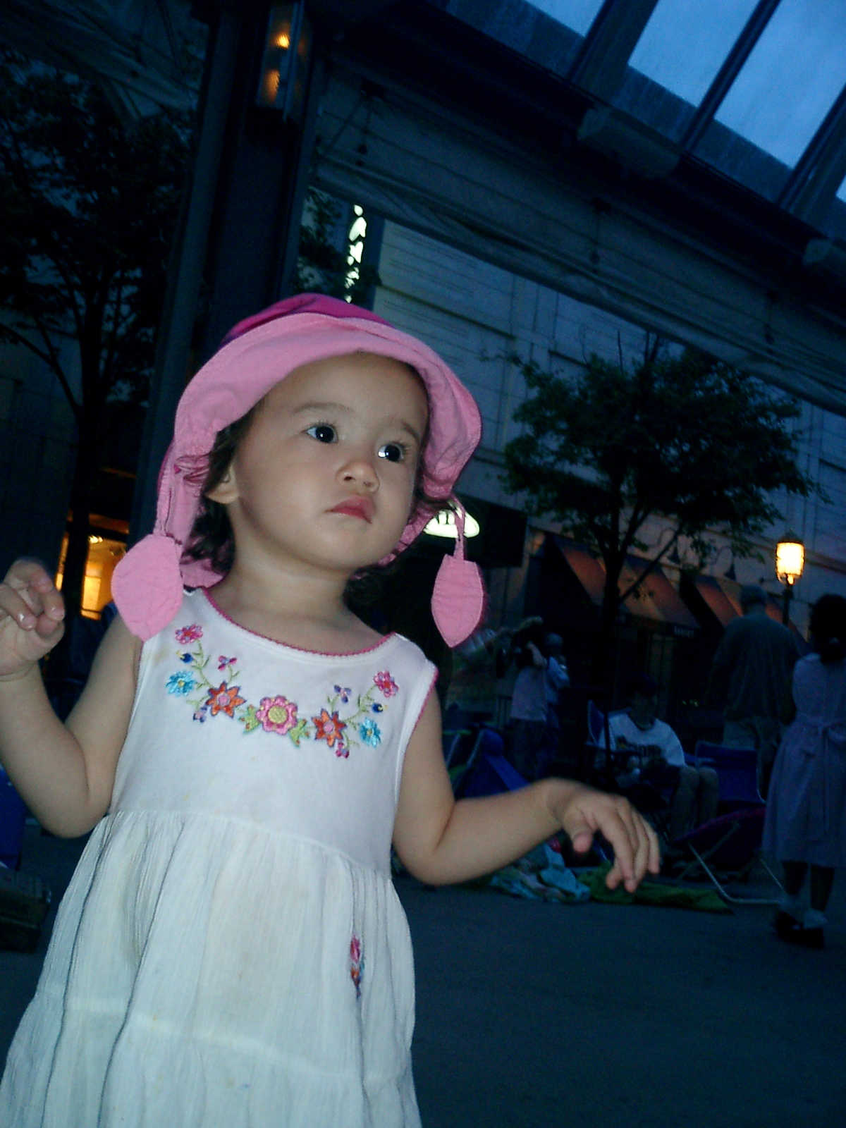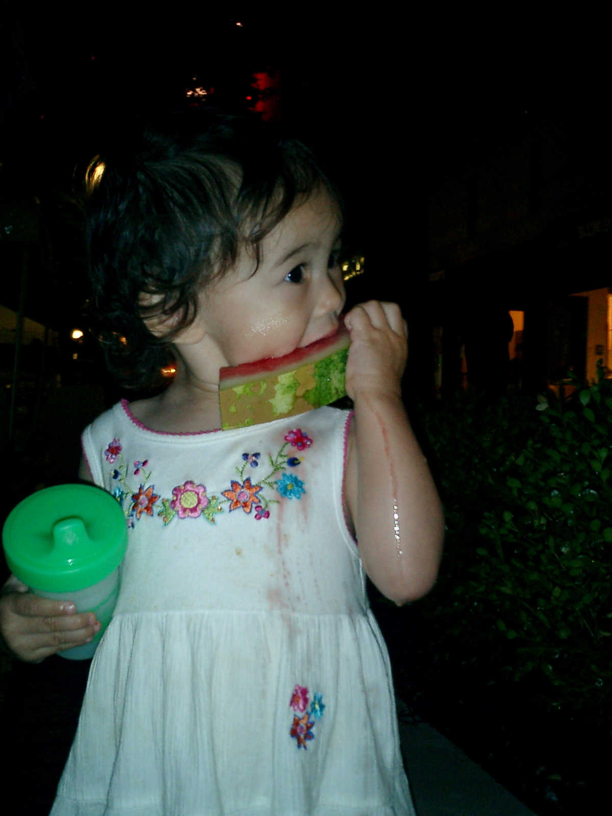 Nadine at 20 and a half months (June 14, 2008), with the whole family at the Taste of Reston outdoor festival. Nadine, is that you modeling your stylish new hat, and eating all that watermelon? (It sure is!)