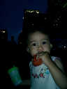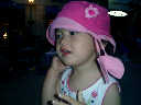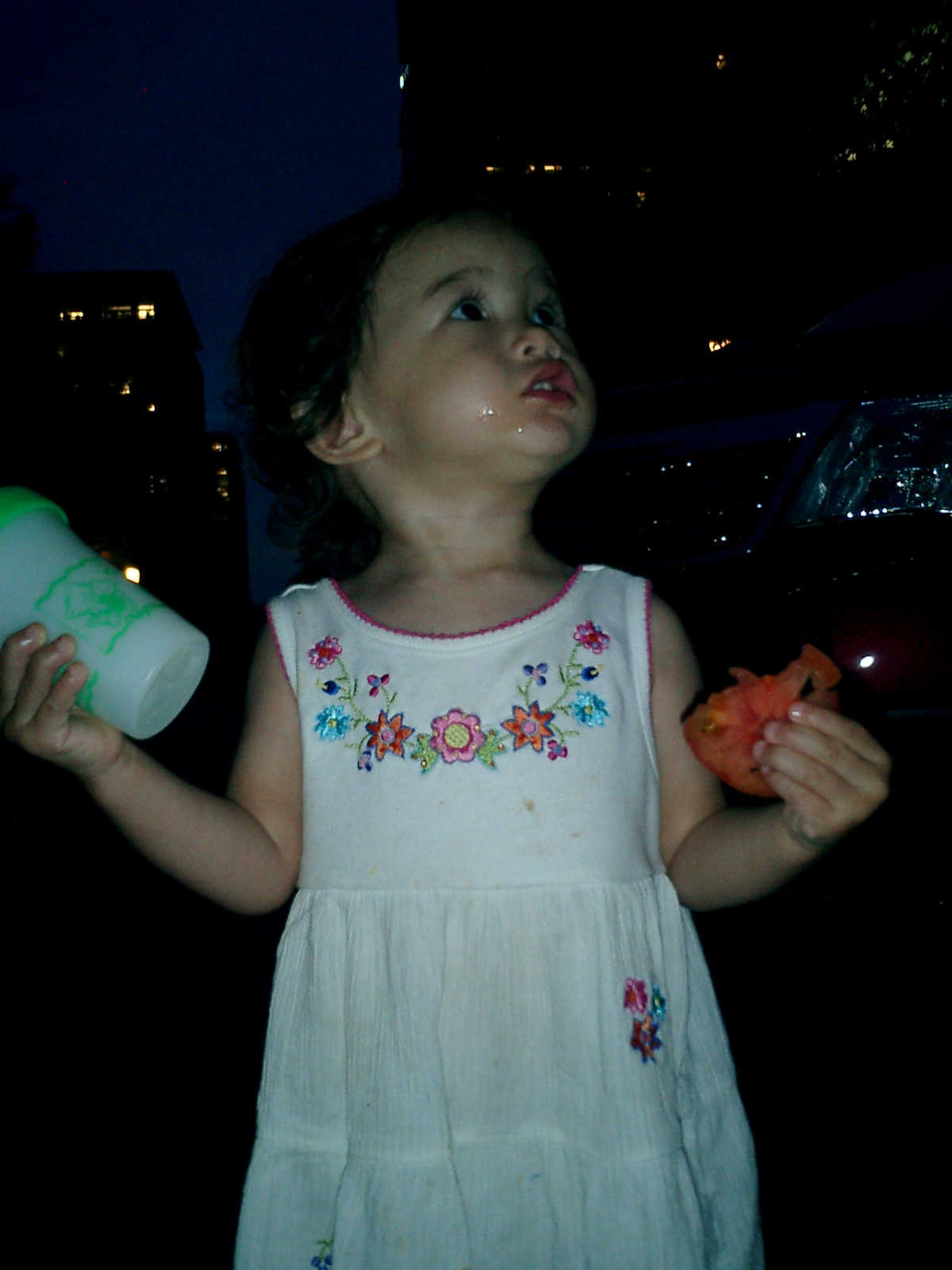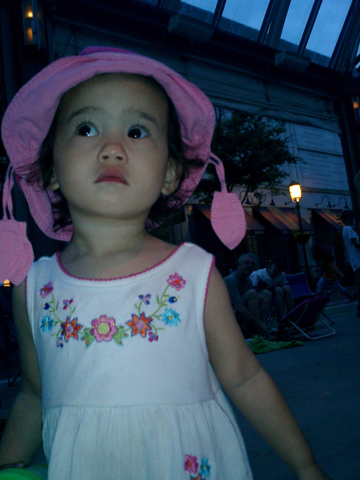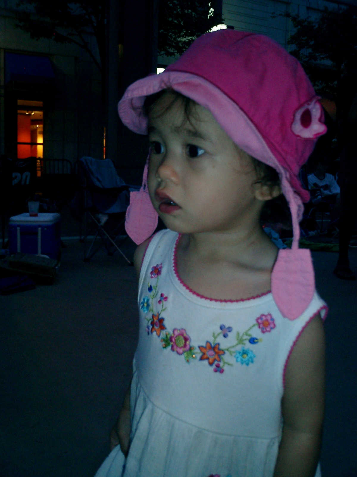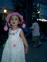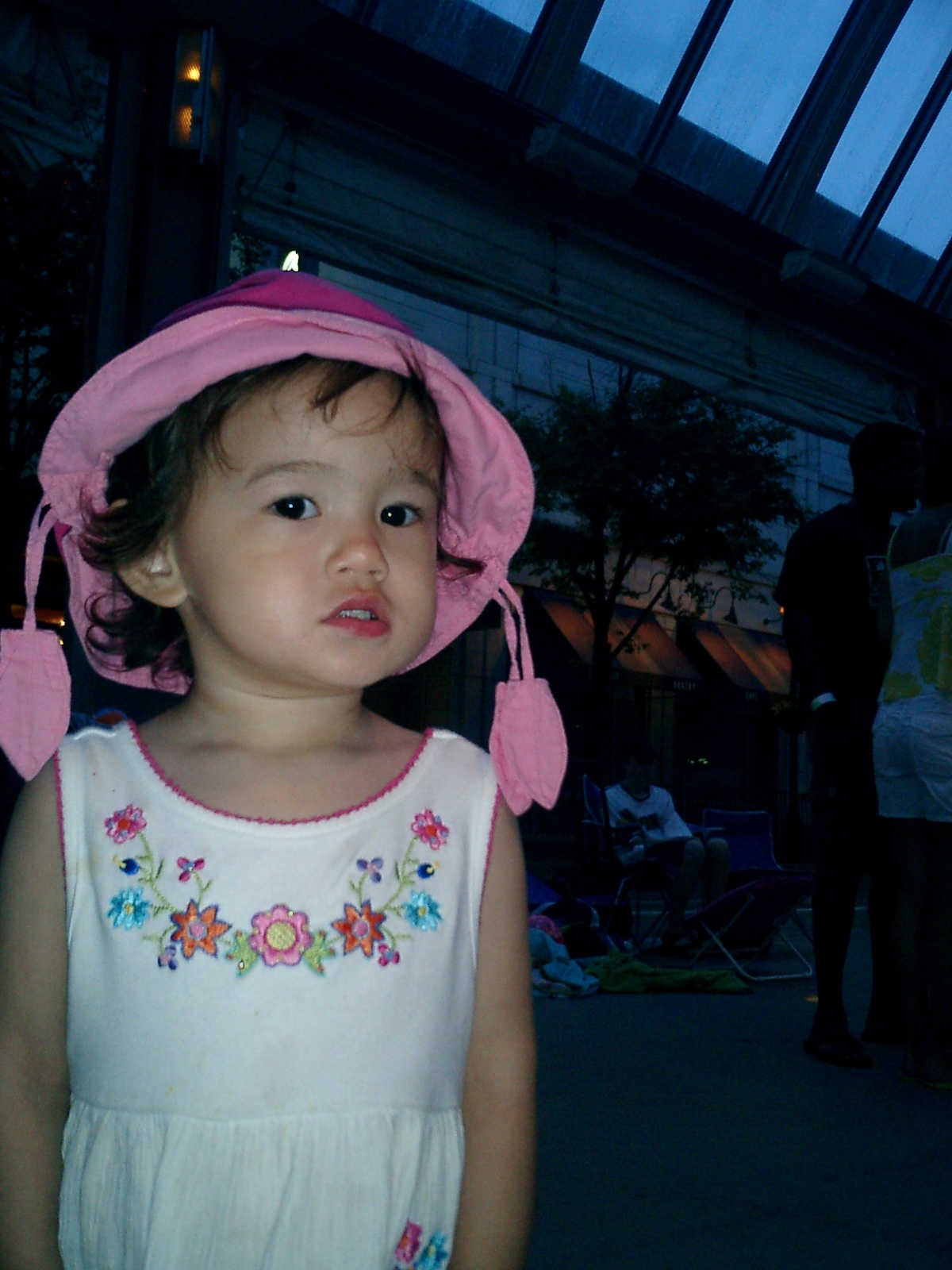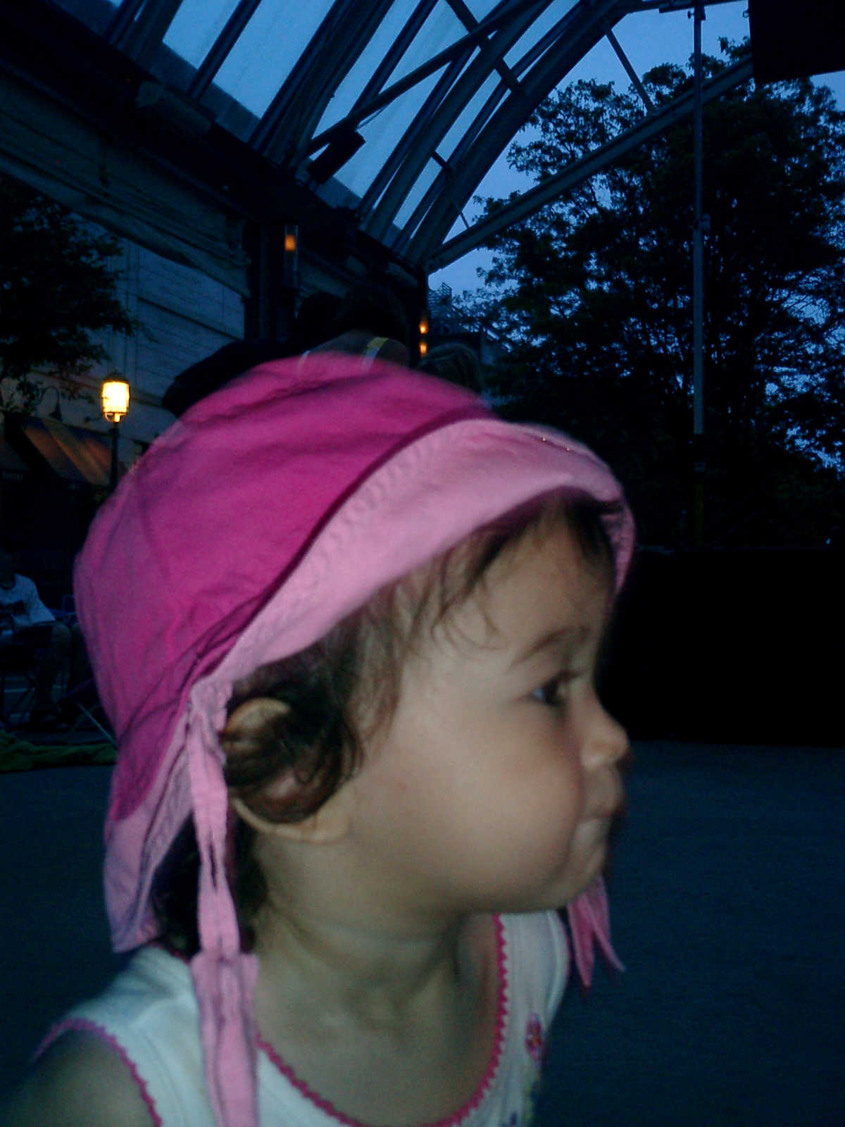 Nadine at 20 and a half months (June 14, 2008), with the whole family at the Taste of Reston outdoor festival. Nadine, is that you modeling your stylish new hat, and eating all that watermelon? (It sure is!)