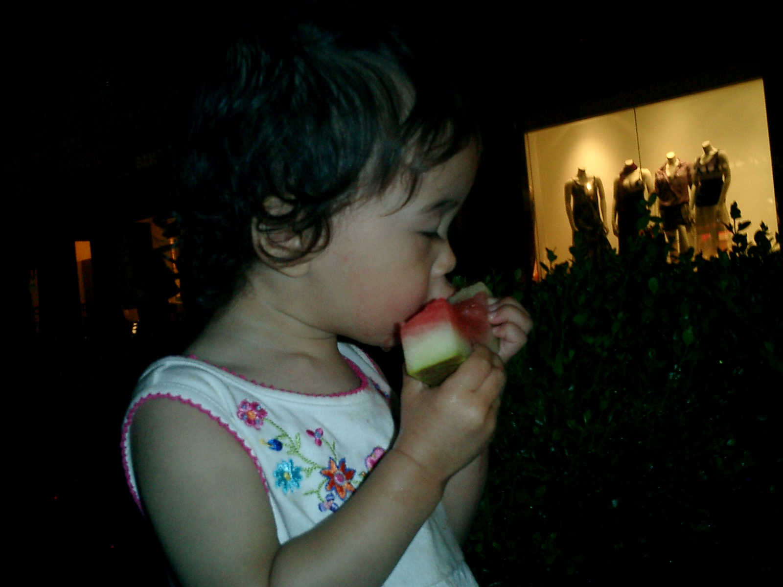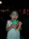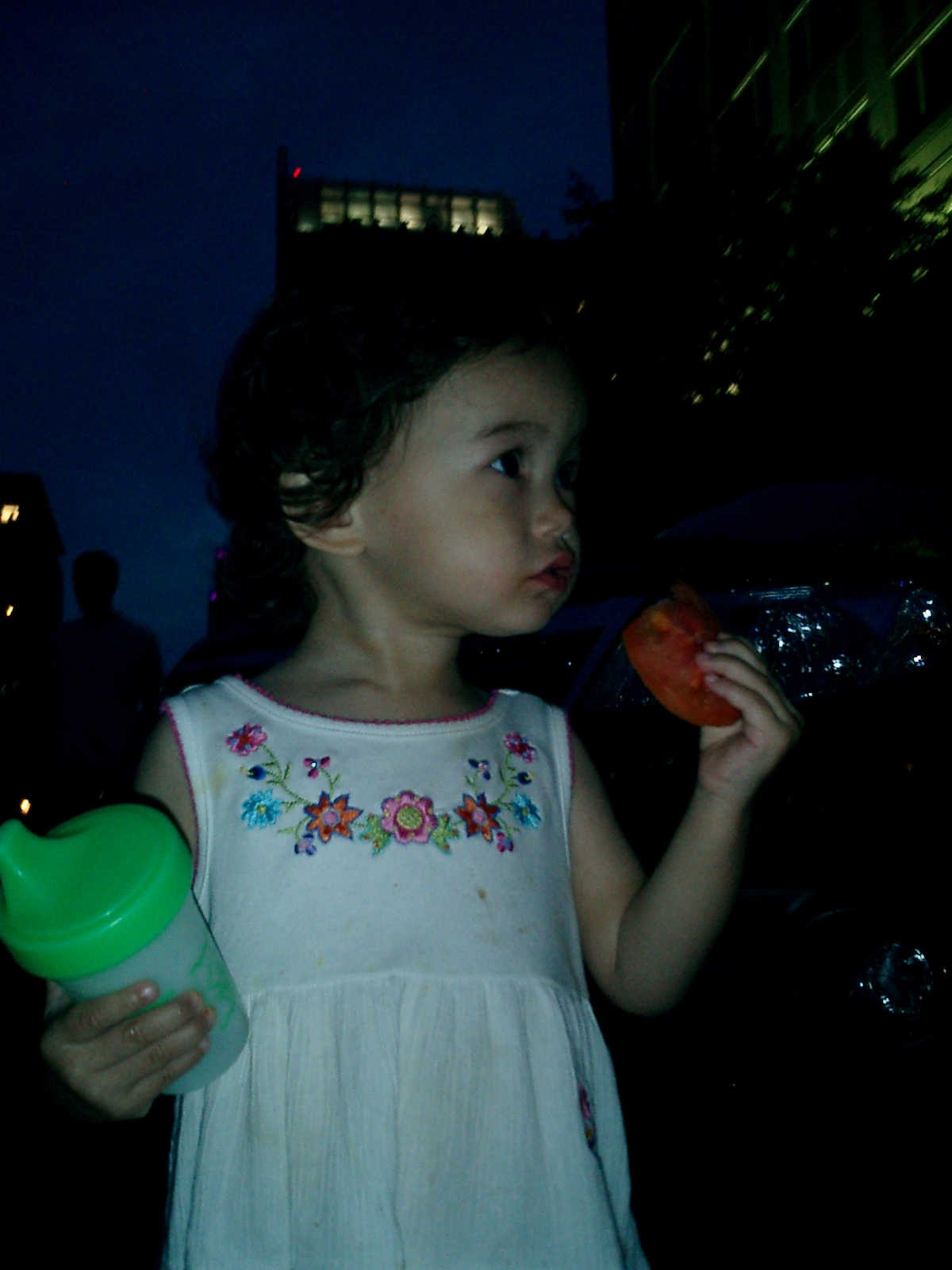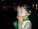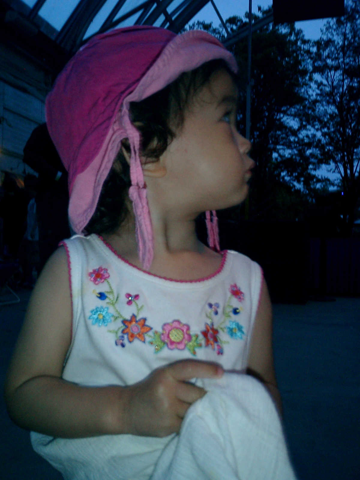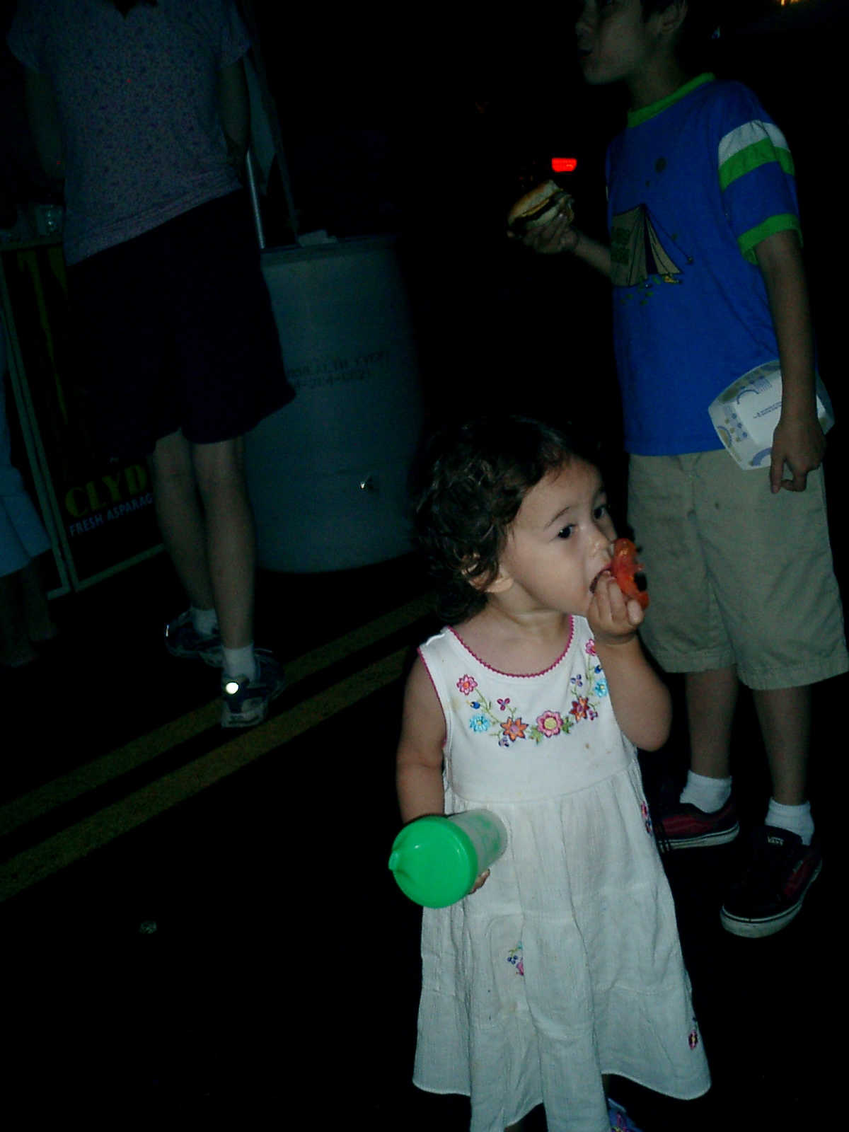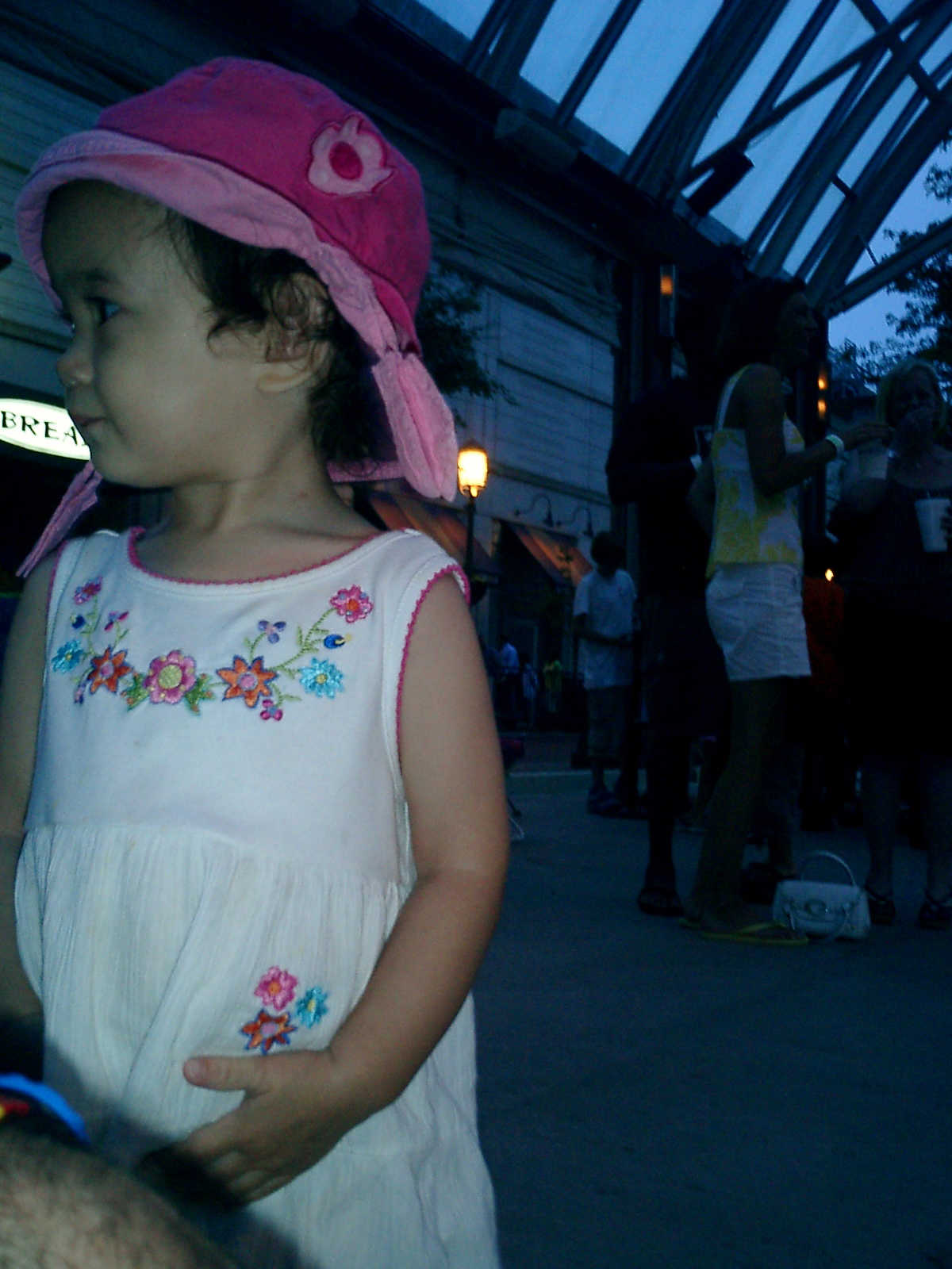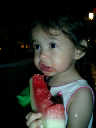Nadine at 20 and a half months (June 14, 2008), with the whole family at the Taste of Reston outdoor festival. Nadine, is that you modeling your stylish new hat, and eating all that watermelon? (It sure is!)
