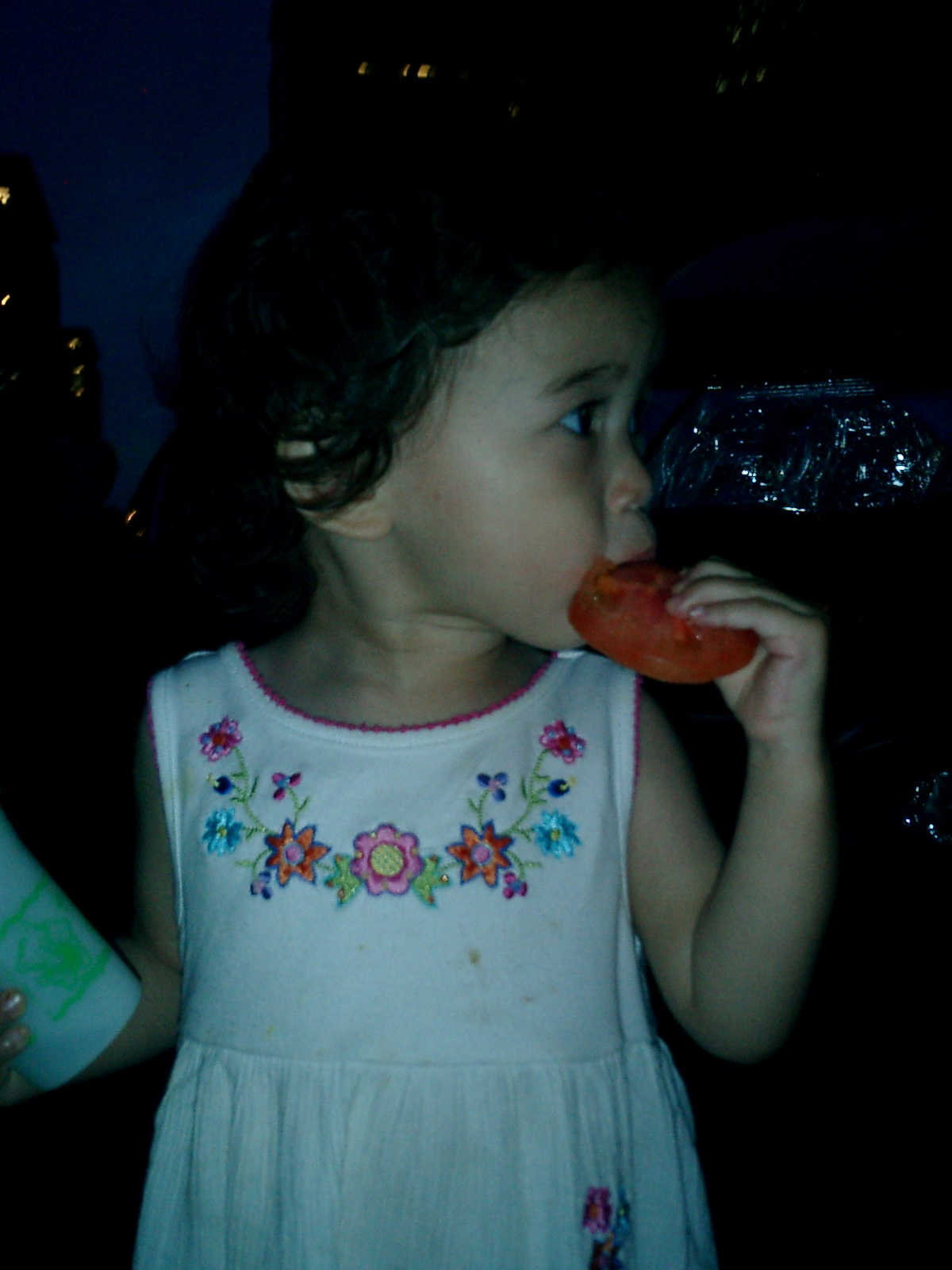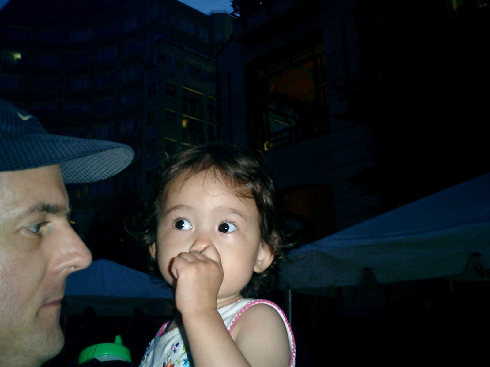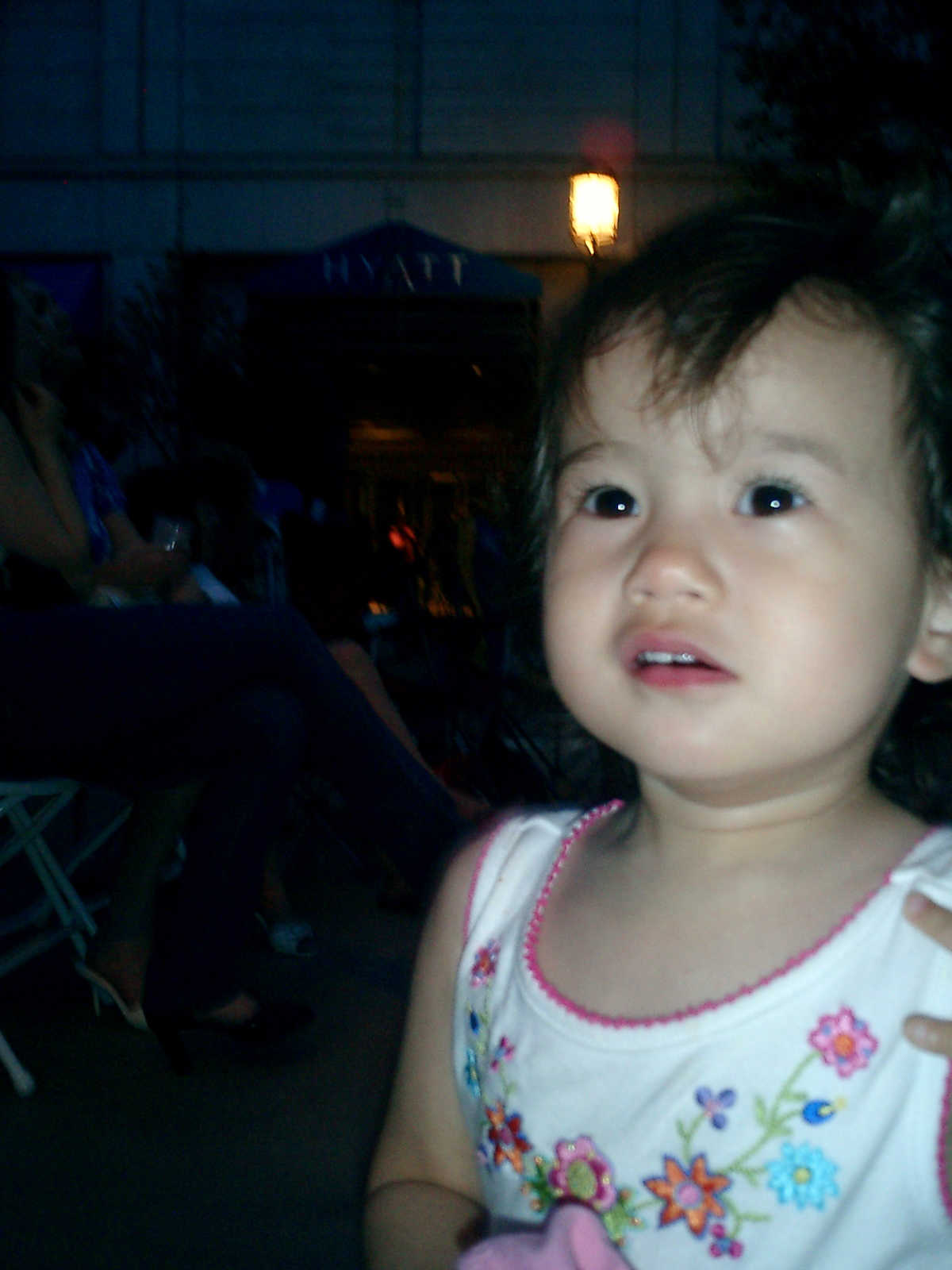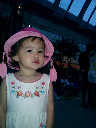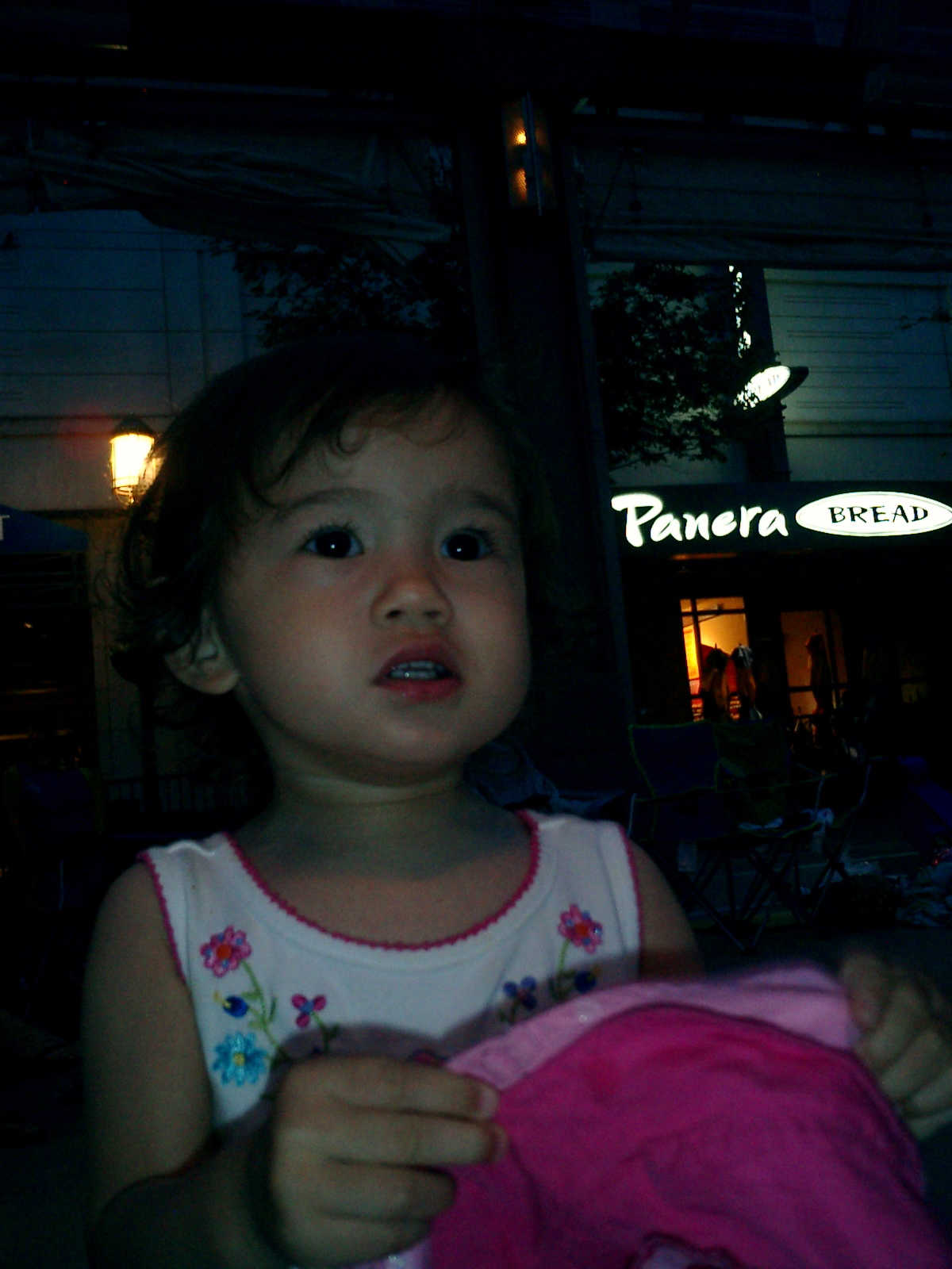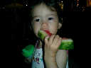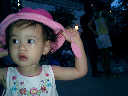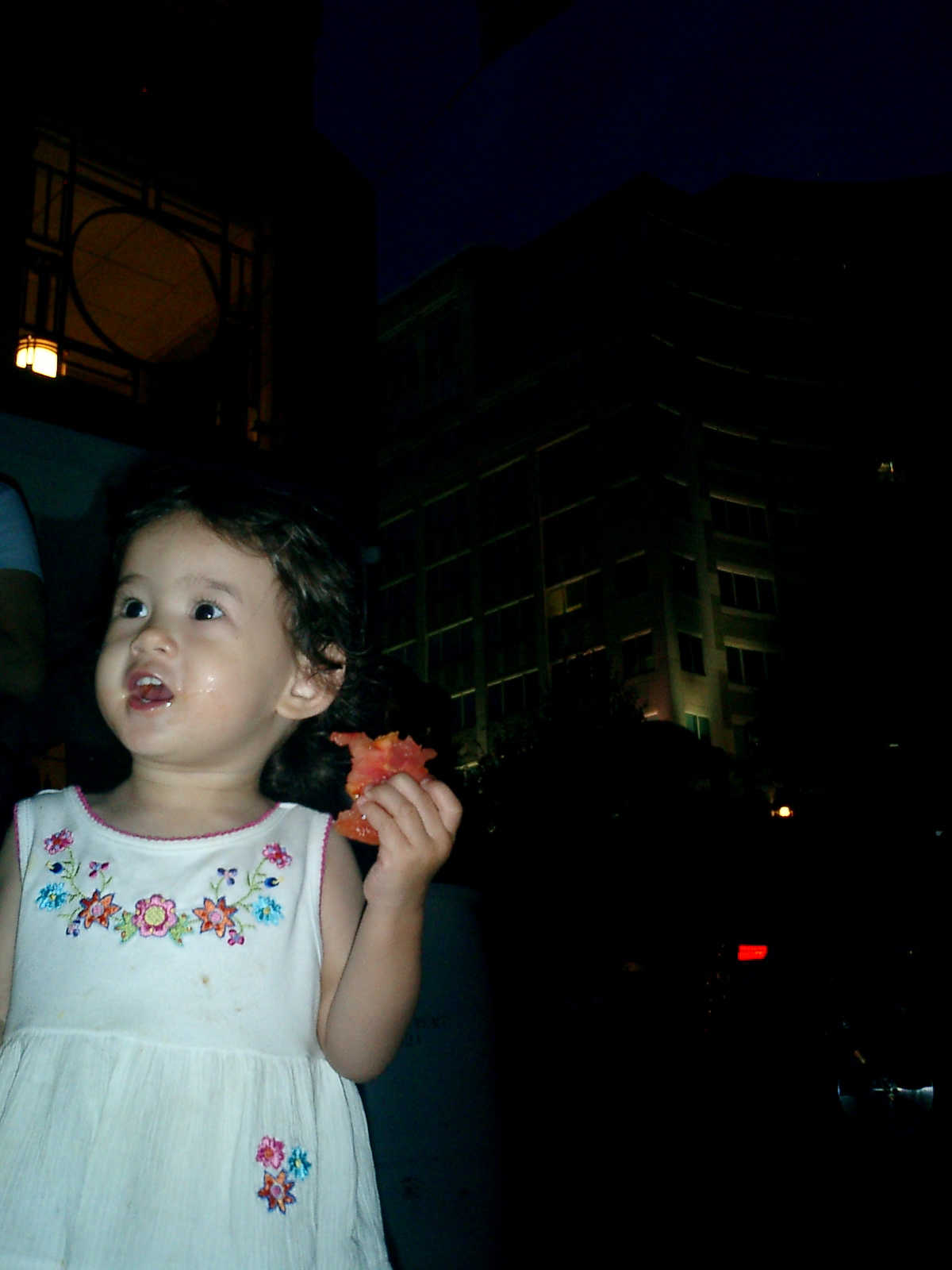 Nadine at 20 and a half months (June 14, 2008), with the whole family at the Taste of Reston outdoor festival. Nadine, is that you modeling your stylish new hat, and eating all that watermelon? (It sure is!)