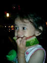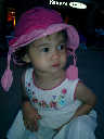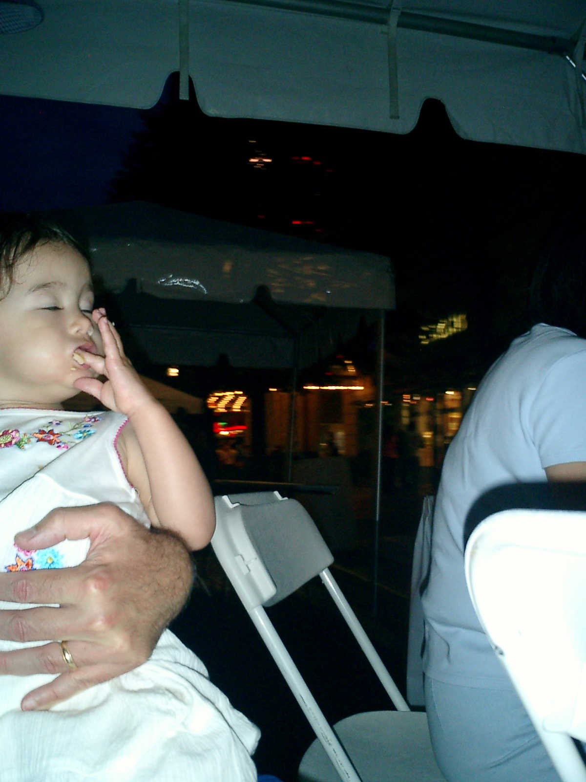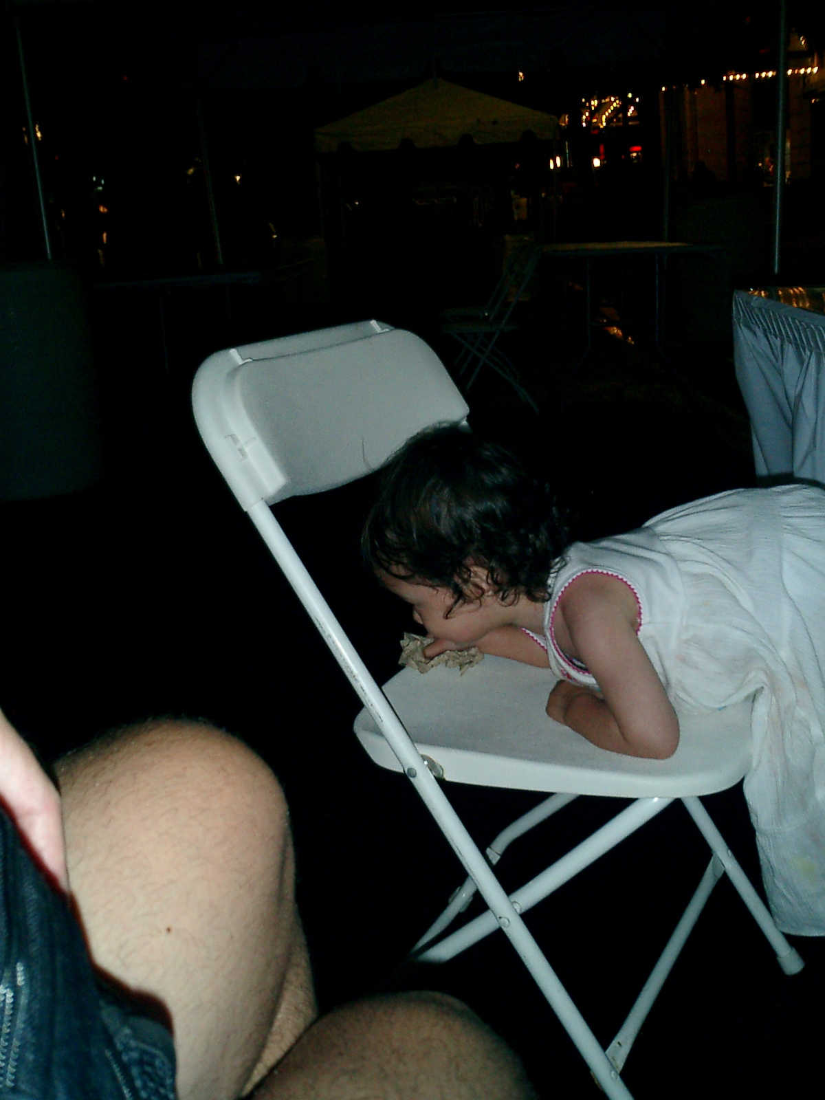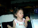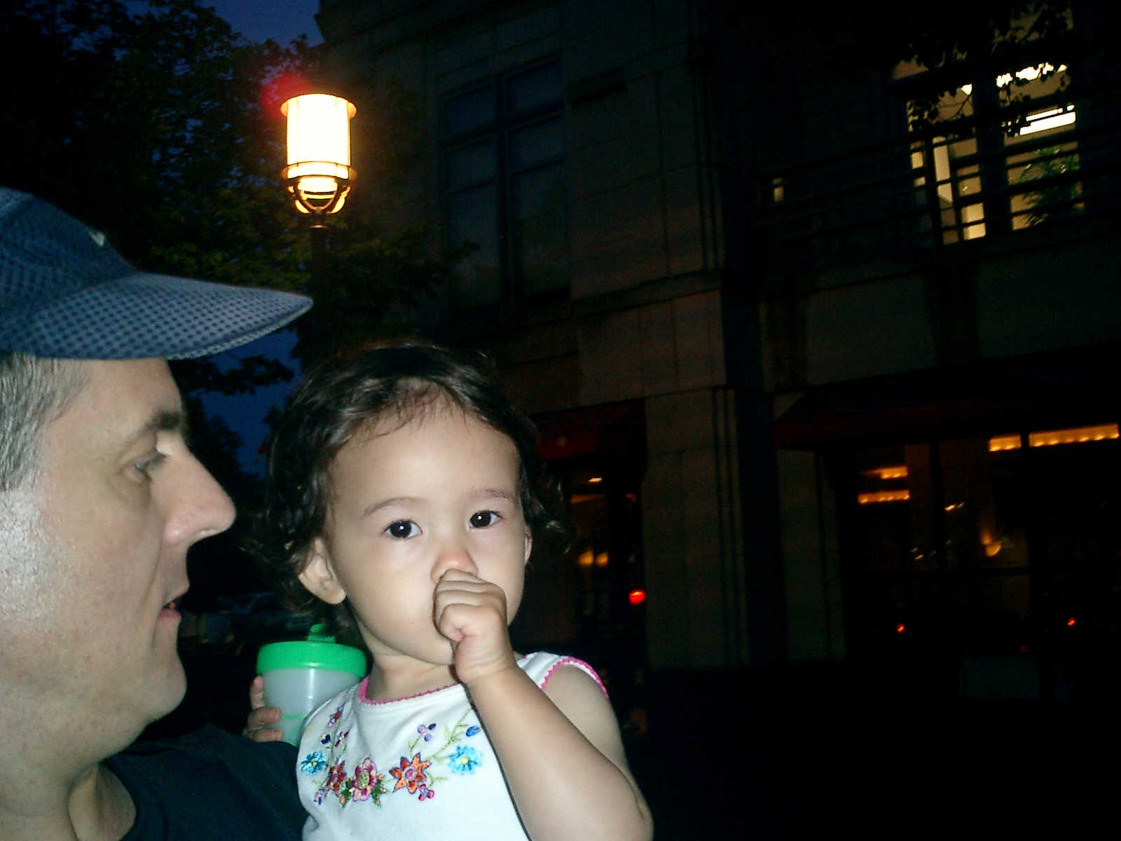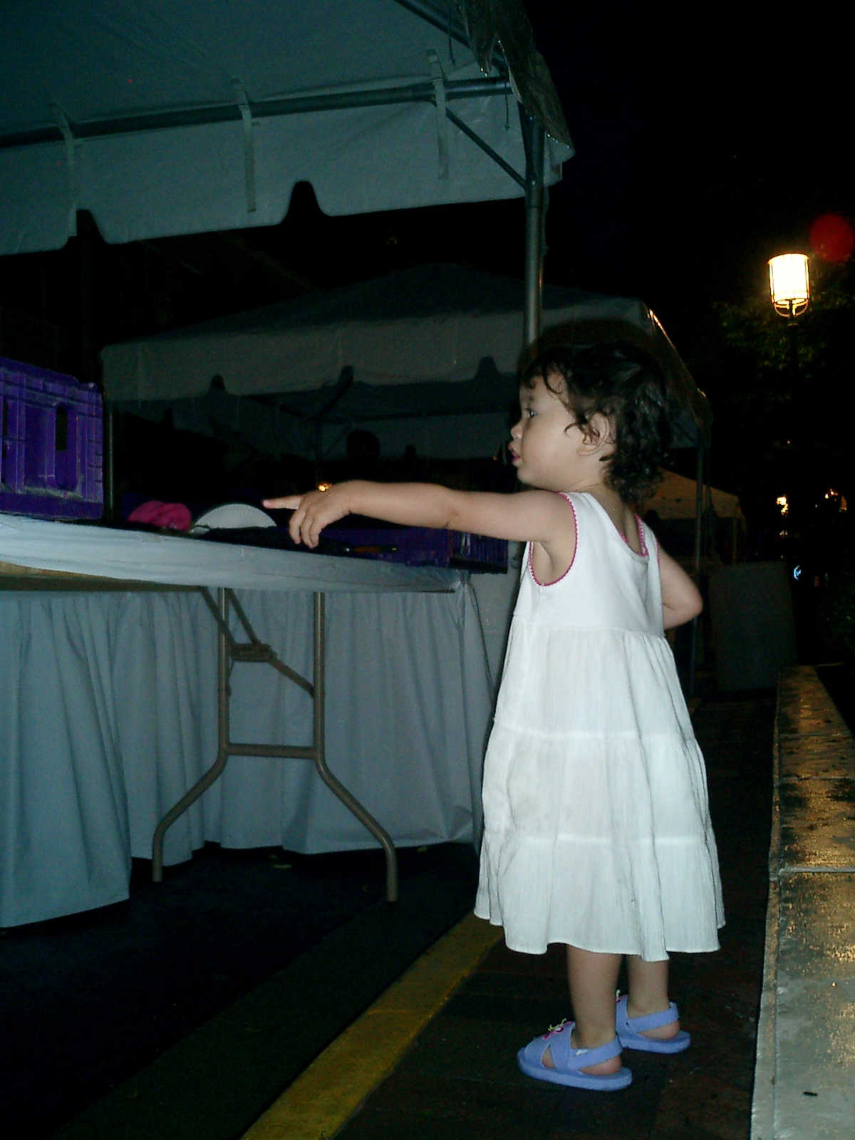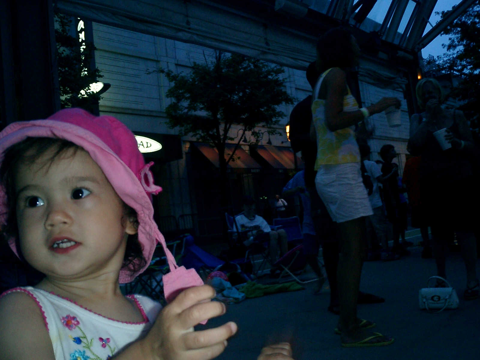 Nadine at 20 and a half months (June 14, 2008), with the whole family at the Taste of Reston outdoor festival. Nadine, is that you modeling your stylish new hat, and eating all that watermelon? (It sure is!)