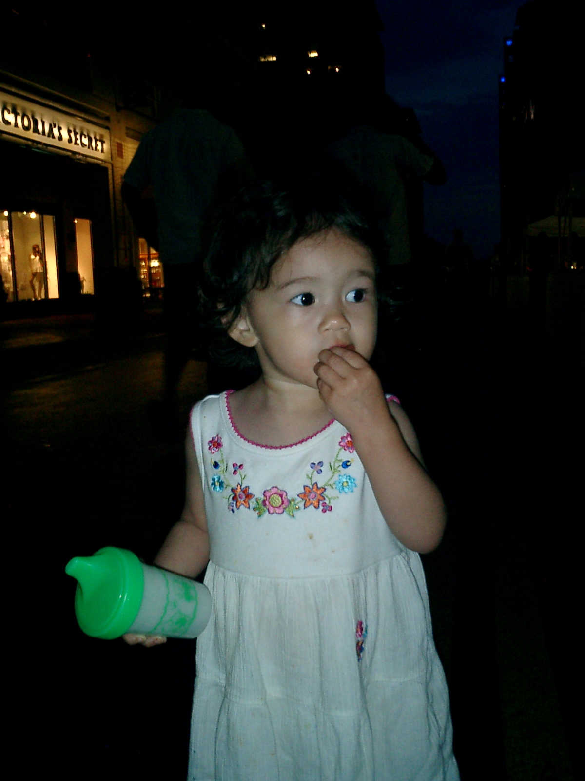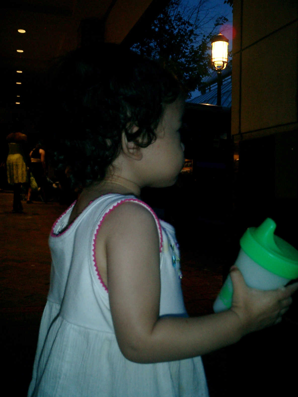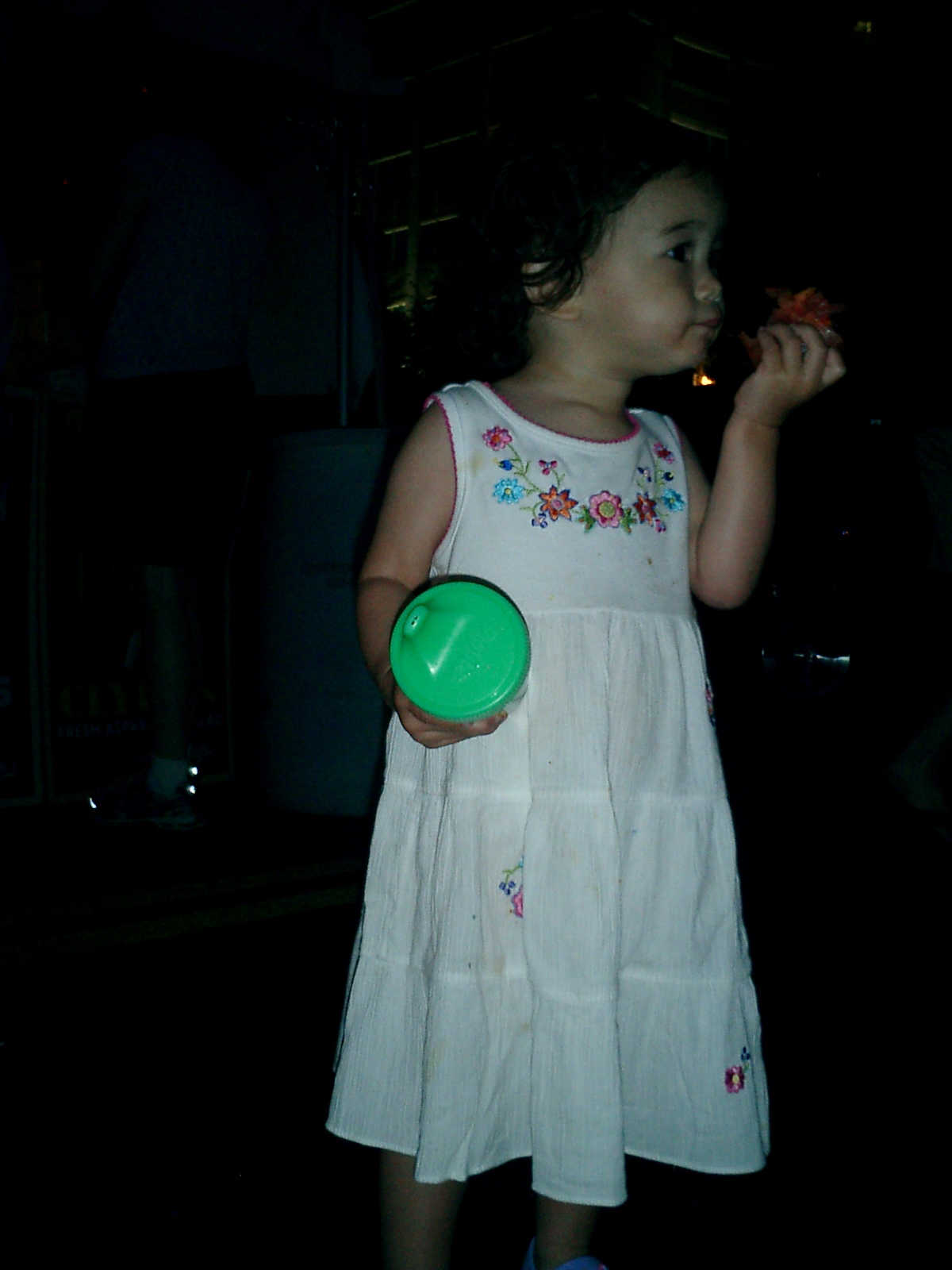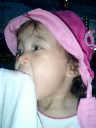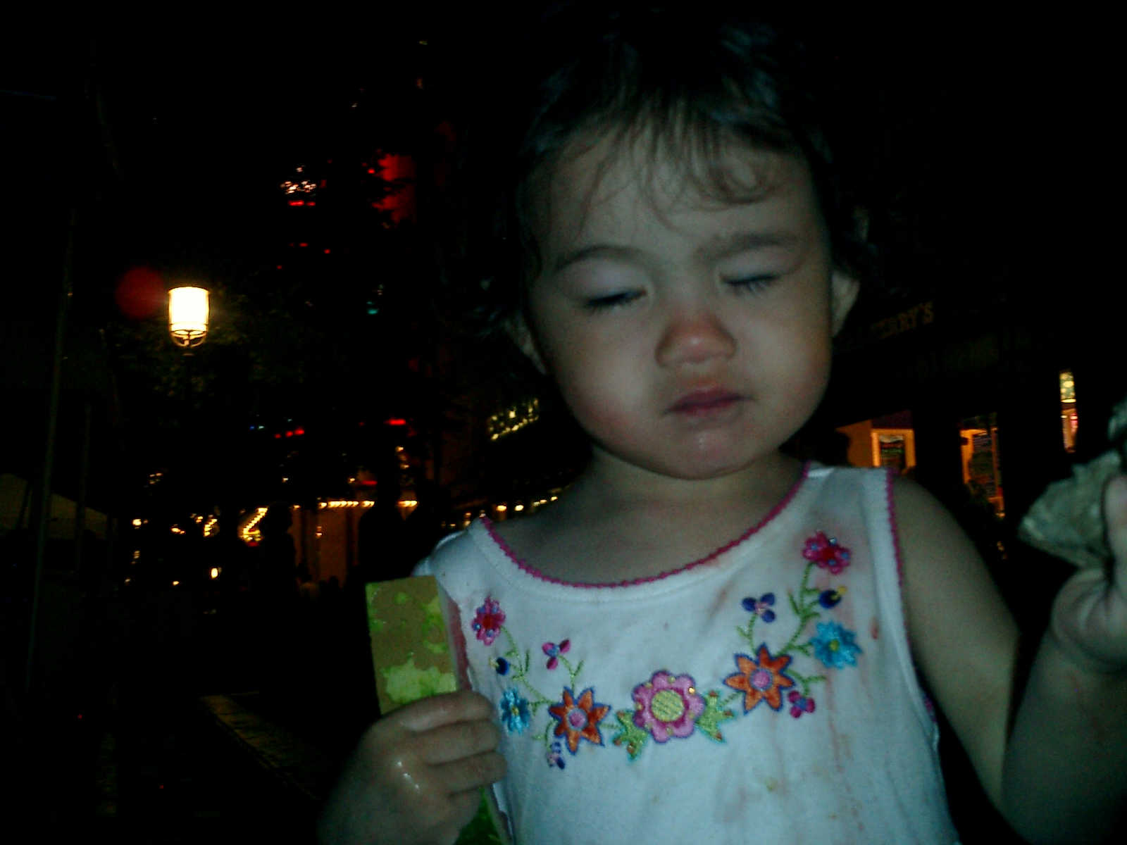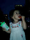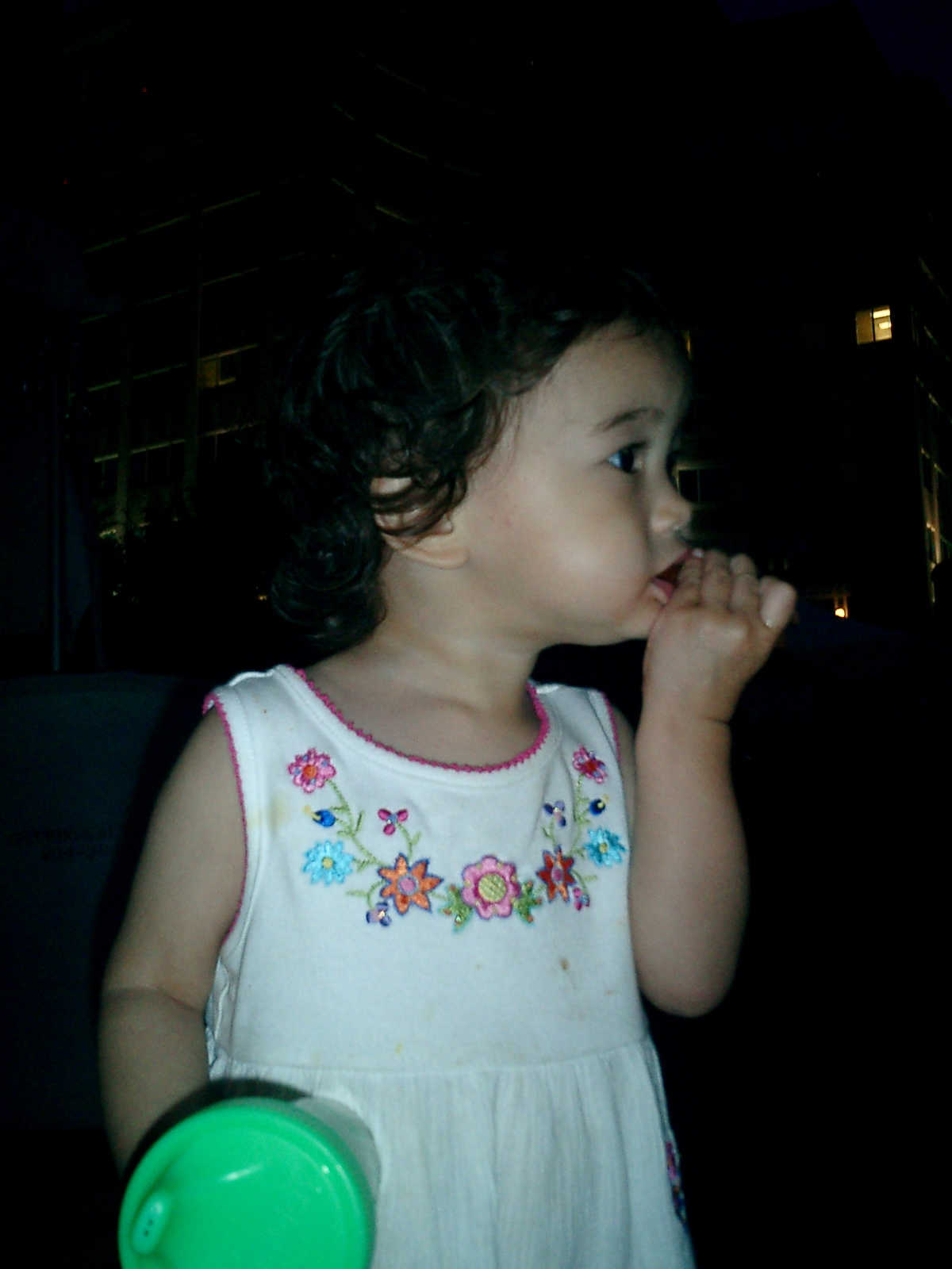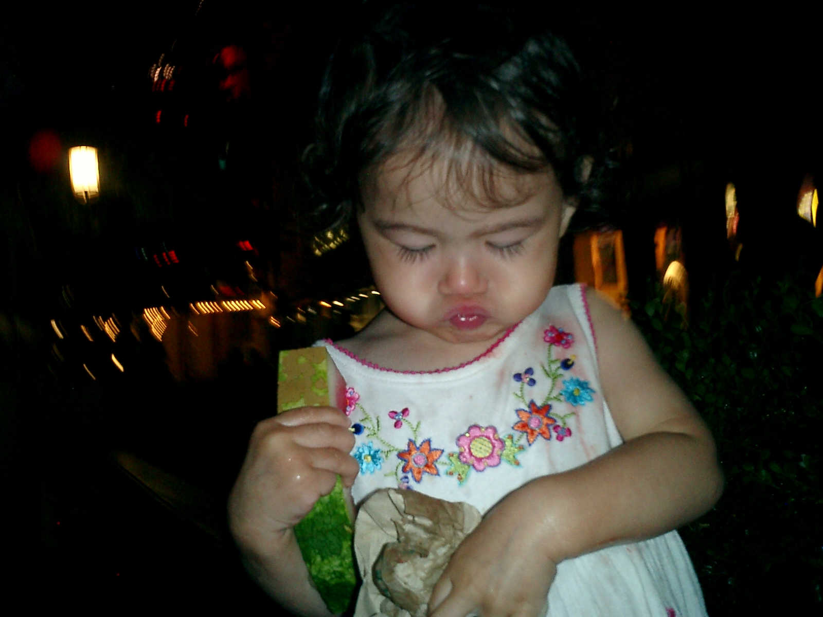 Nadine at 20 and a half months (June 14, 2008), with the whole family at the Taste of Reston outdoor festival. Nadine, is that you modeling your stylish new hat, and eating all that watermelon? (It sure is!)