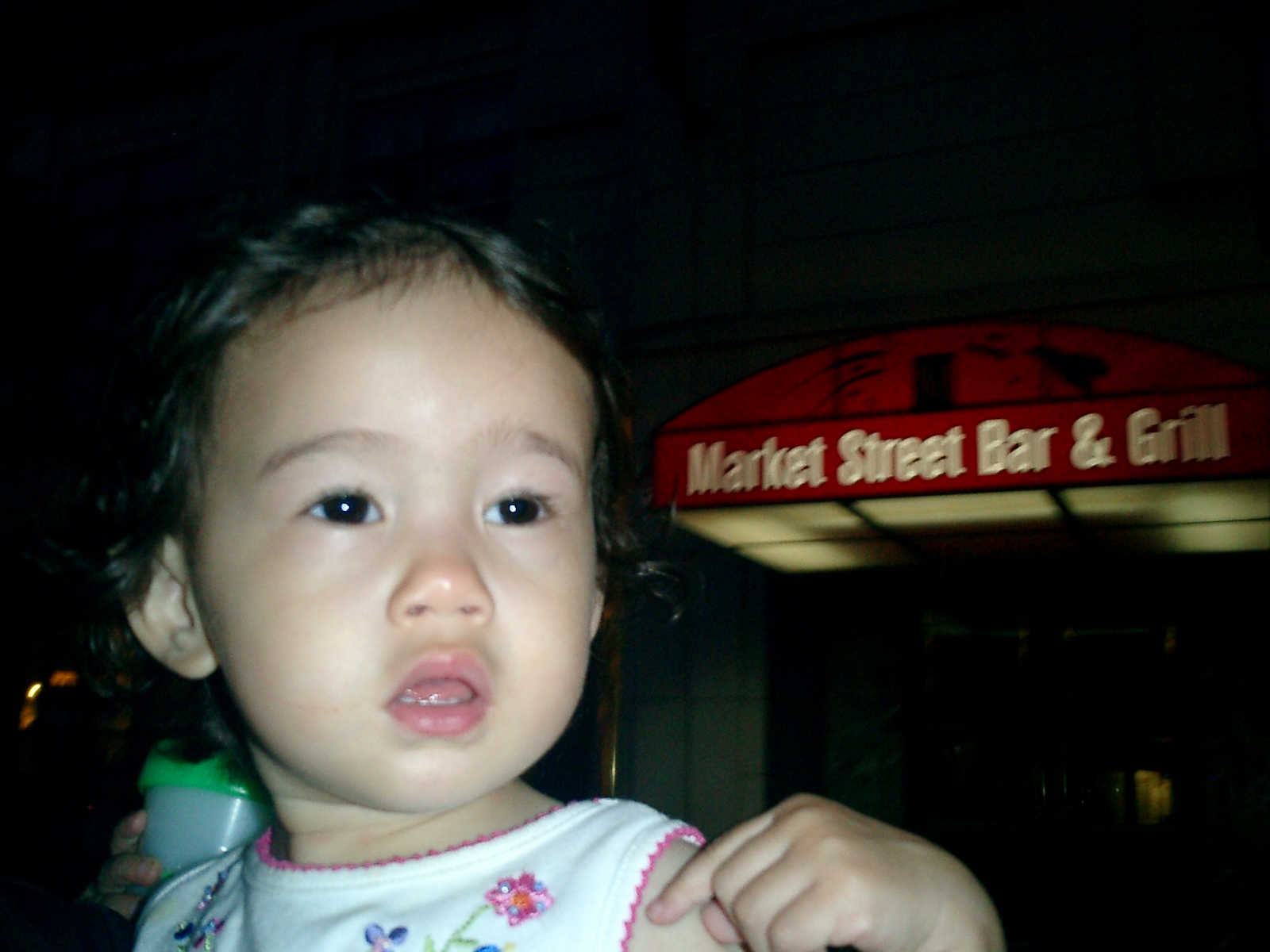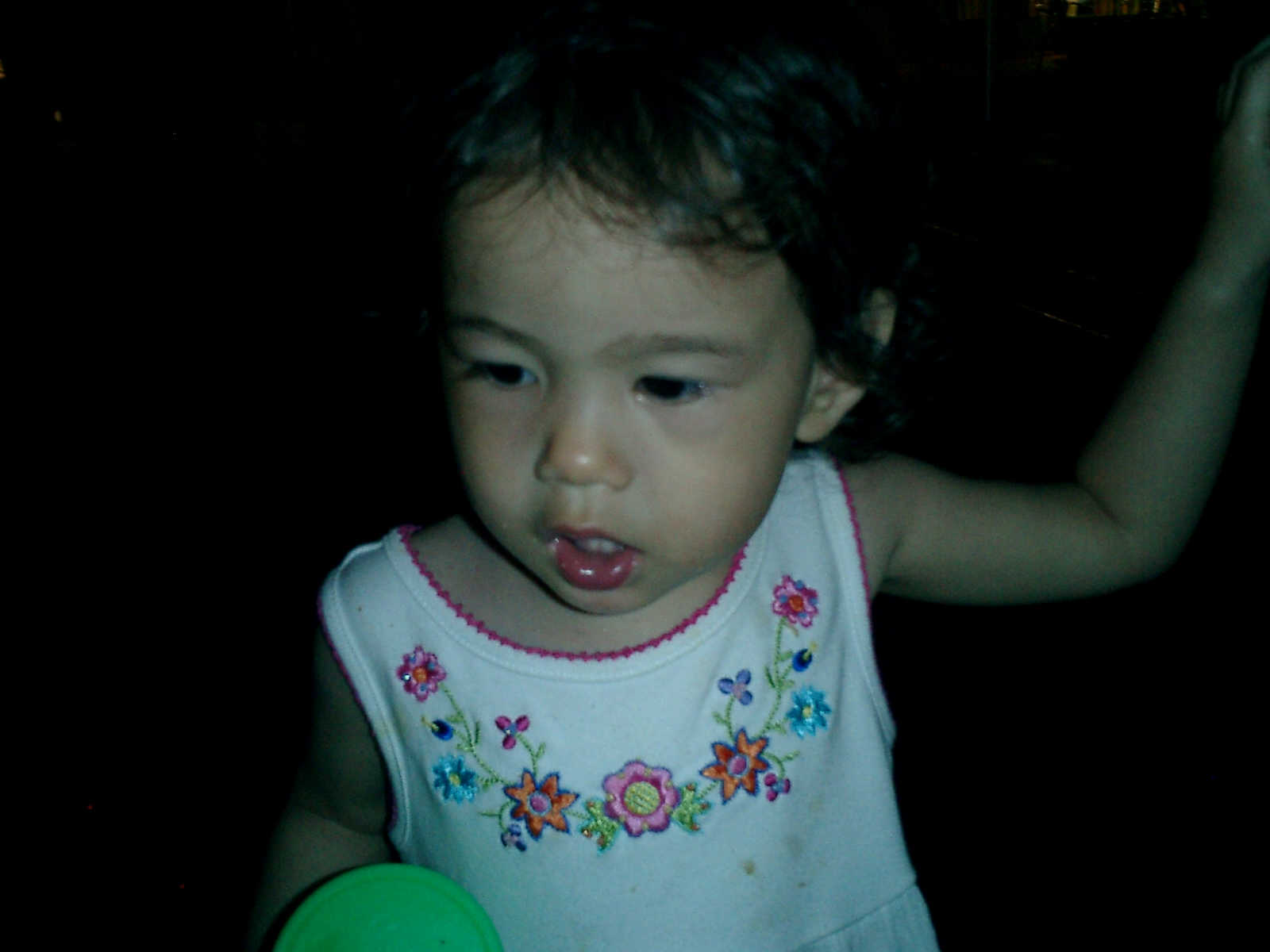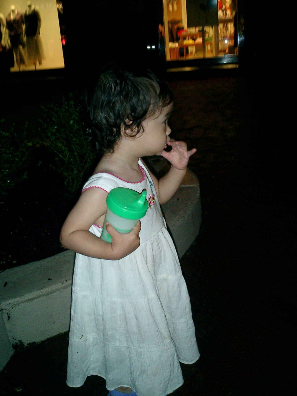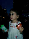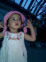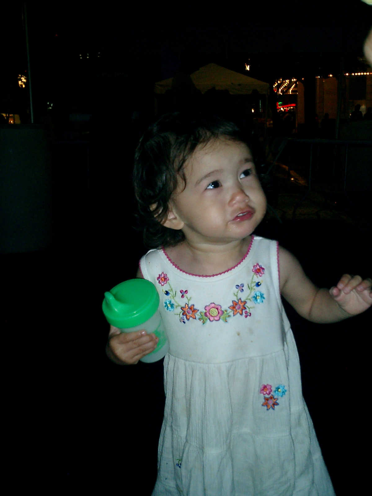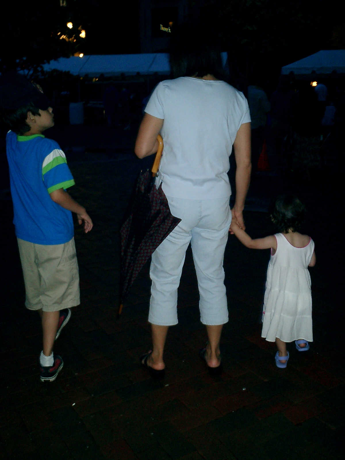 Nadine at 20 and a half months (June 14, 2008), with the whole family at the Taste of Reston outdoor festival. Nadine, is that you modeling your stylish new hat, and eating all that watermelon? (It sure is!)