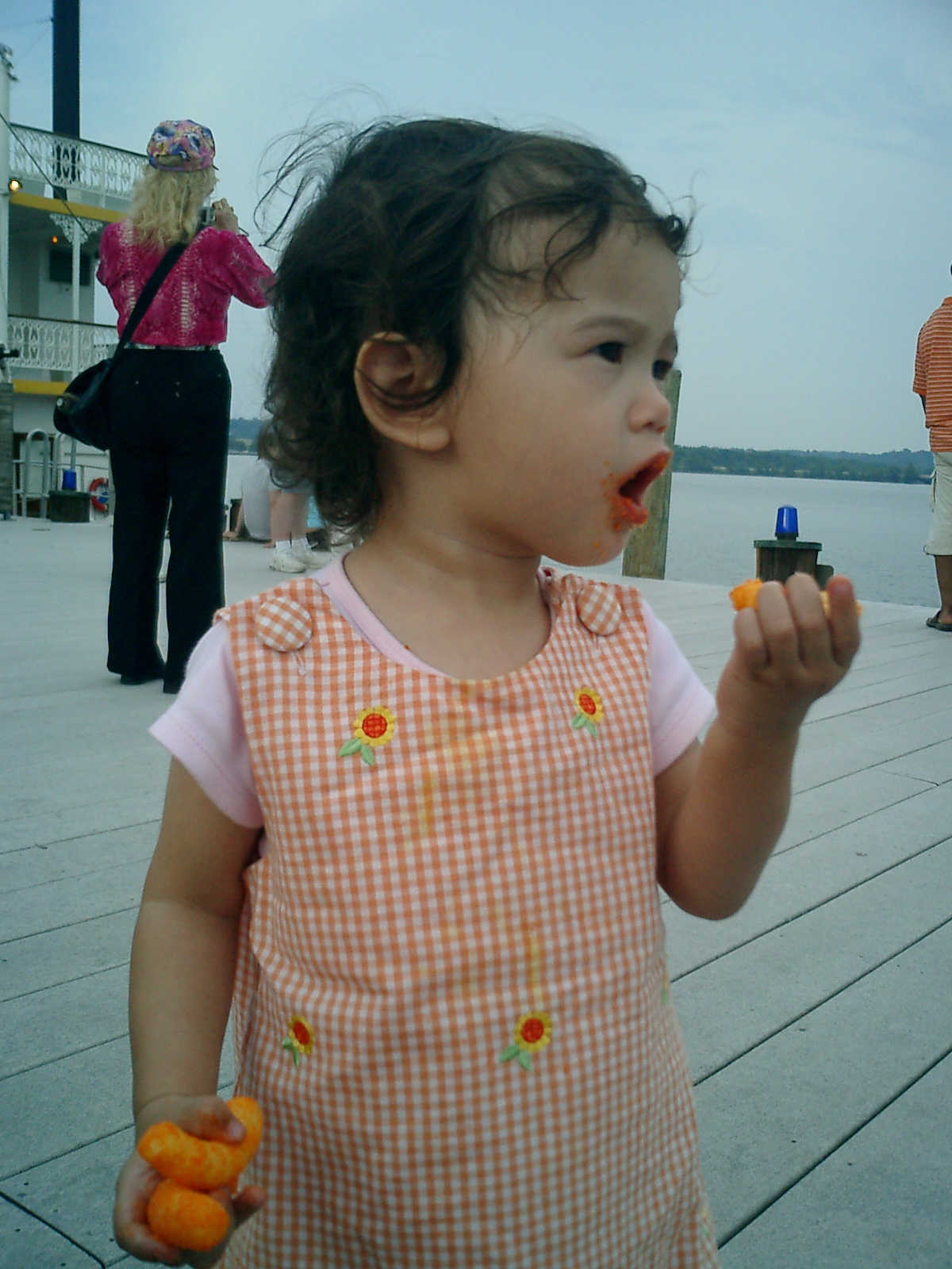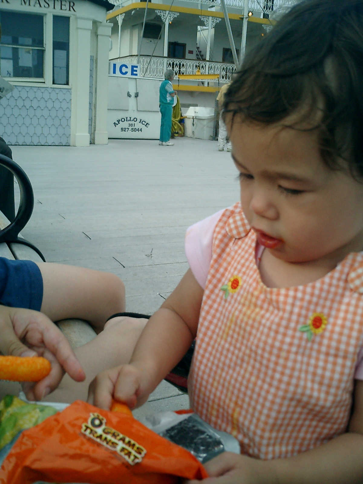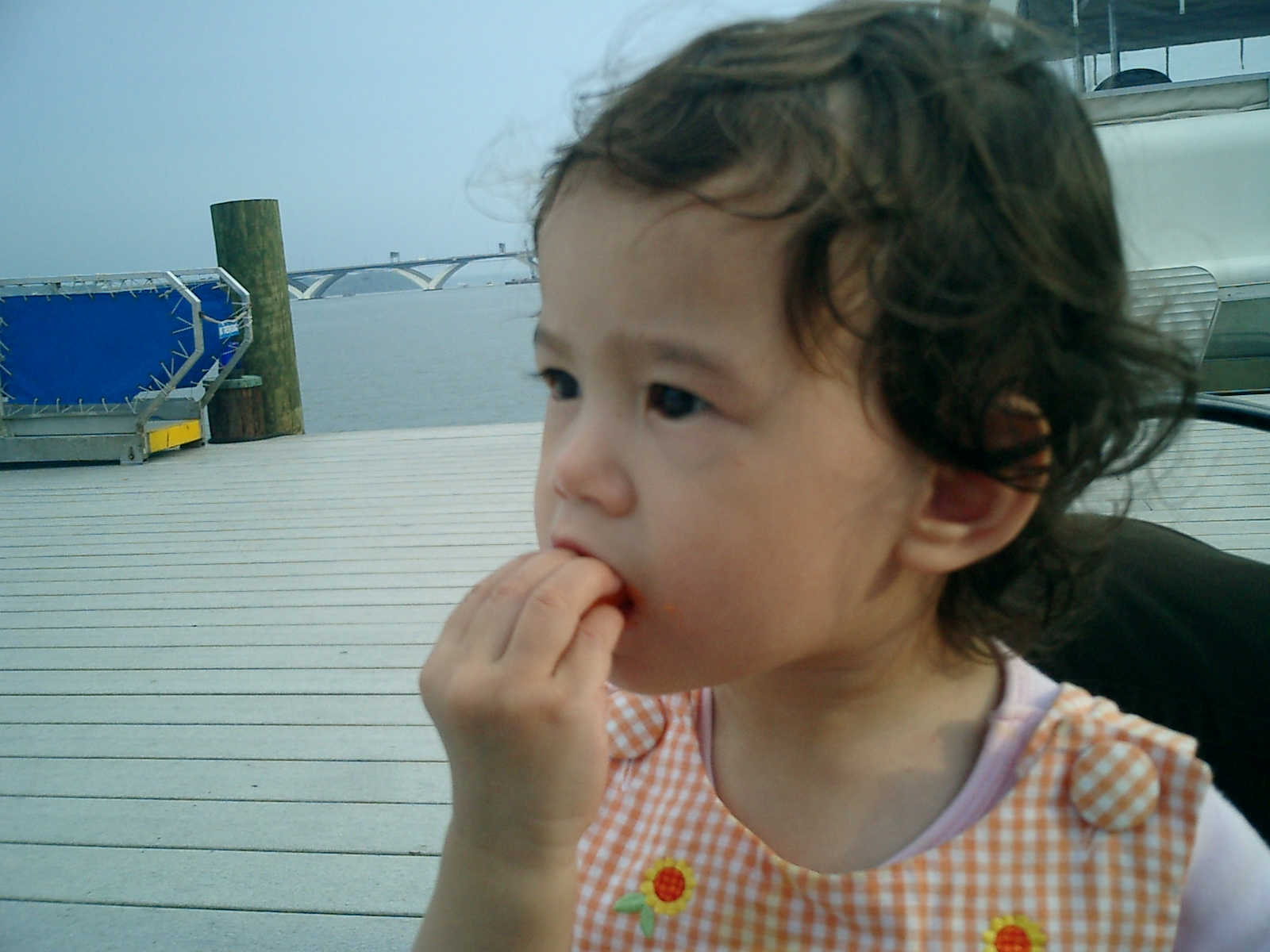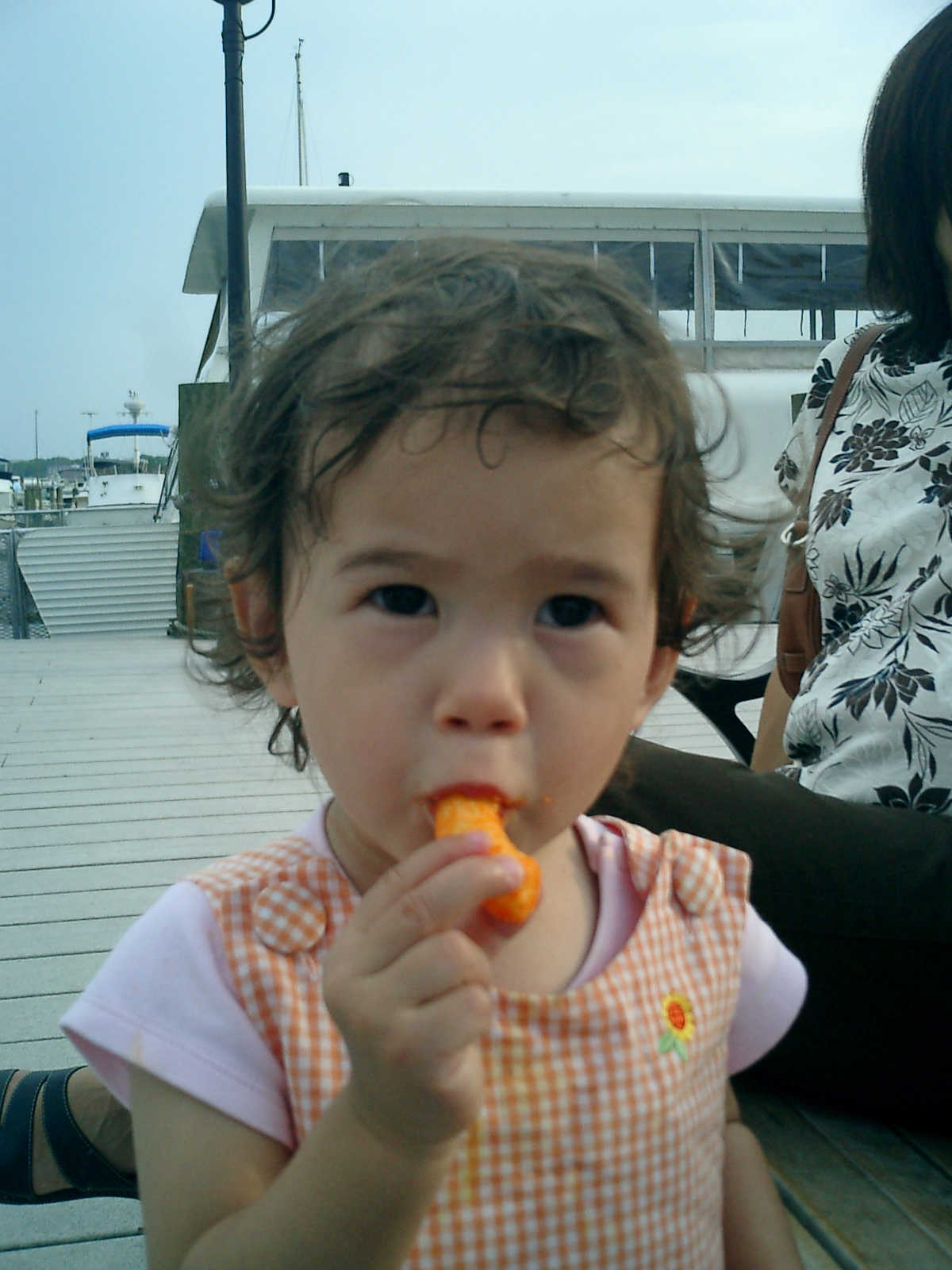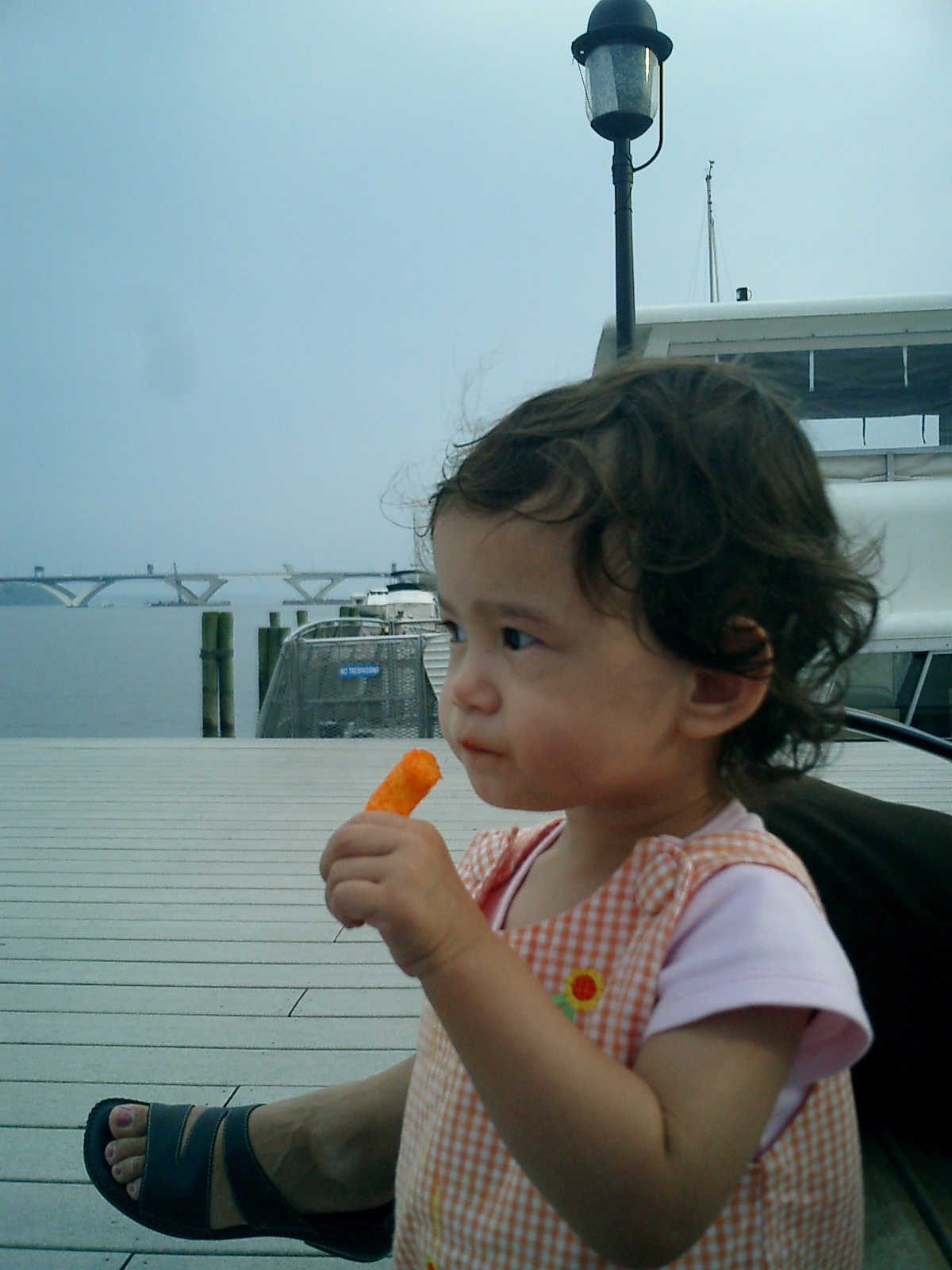 Nadine at 19 months (June 22, 2008), taking a stroll along the Old Town Alexandria Waterfront. Nadine gets hungry and has a quick snack with some cheese doodles. (Good, eh?)