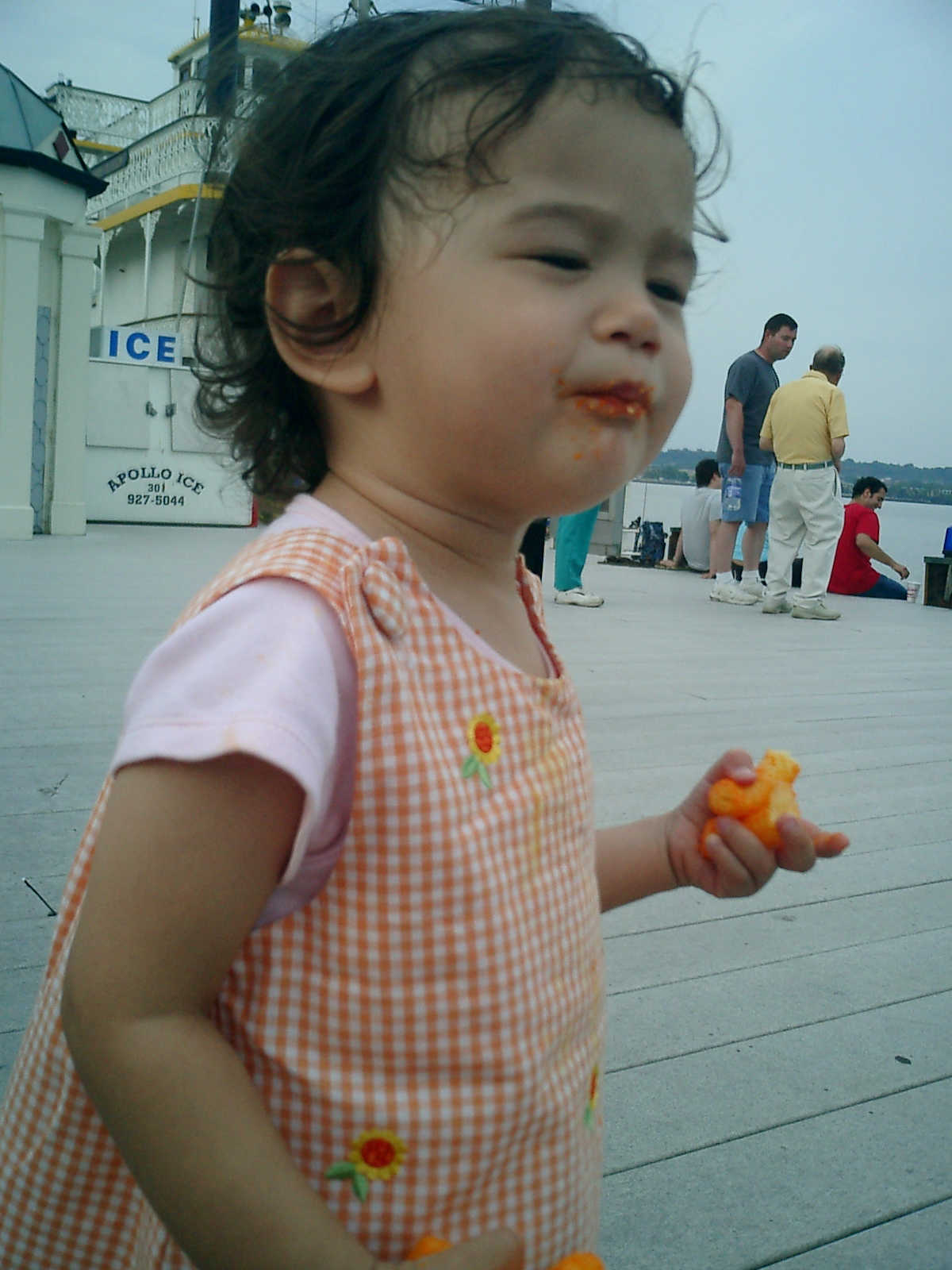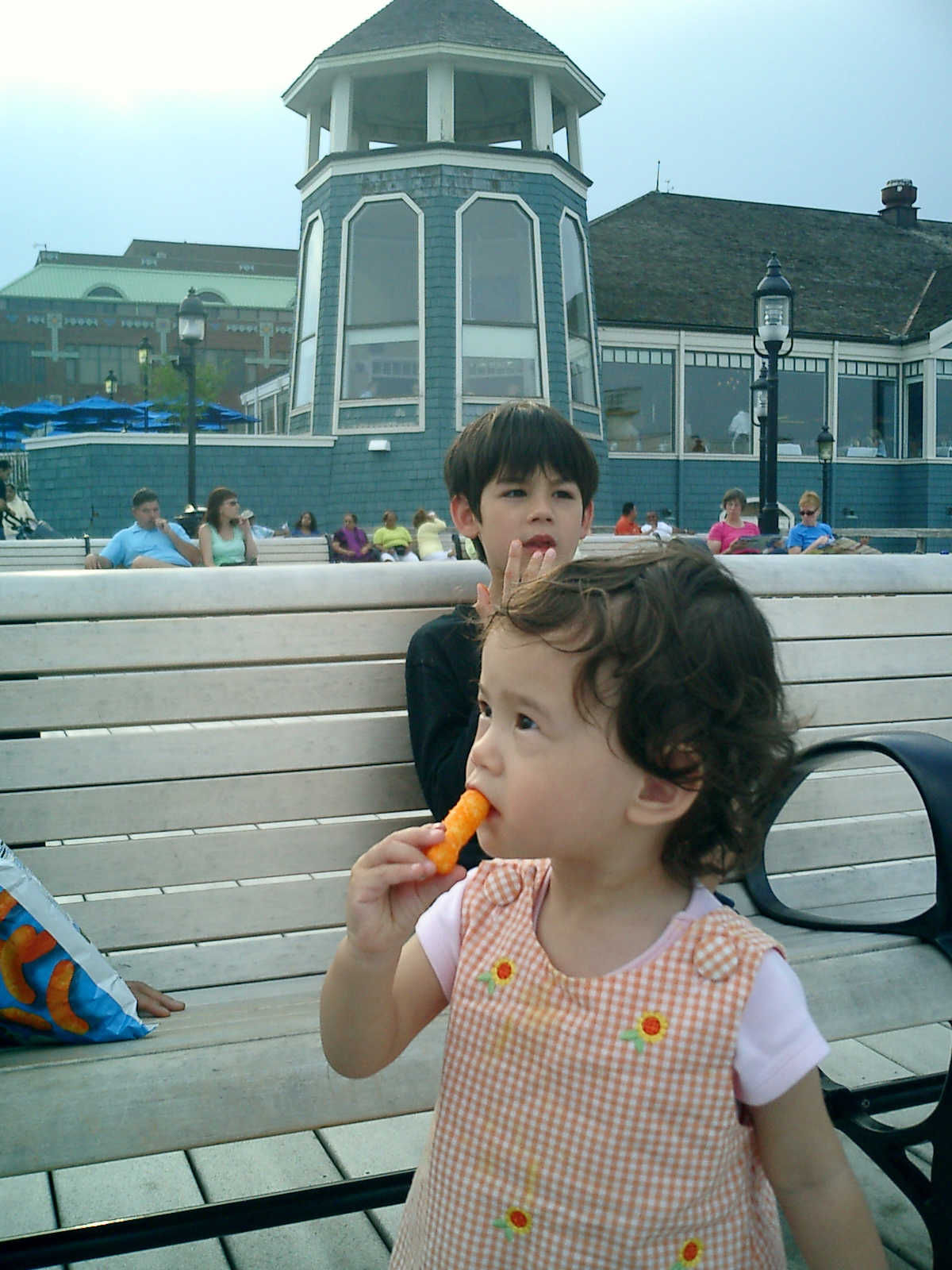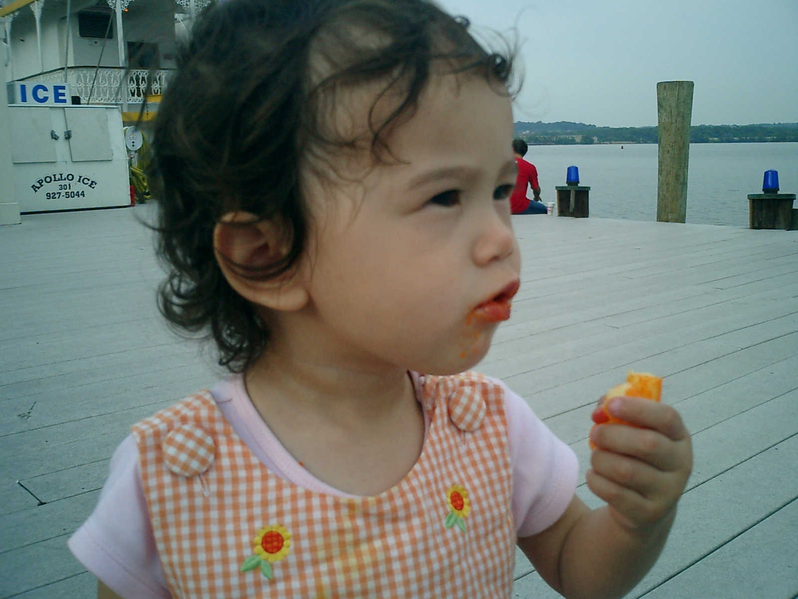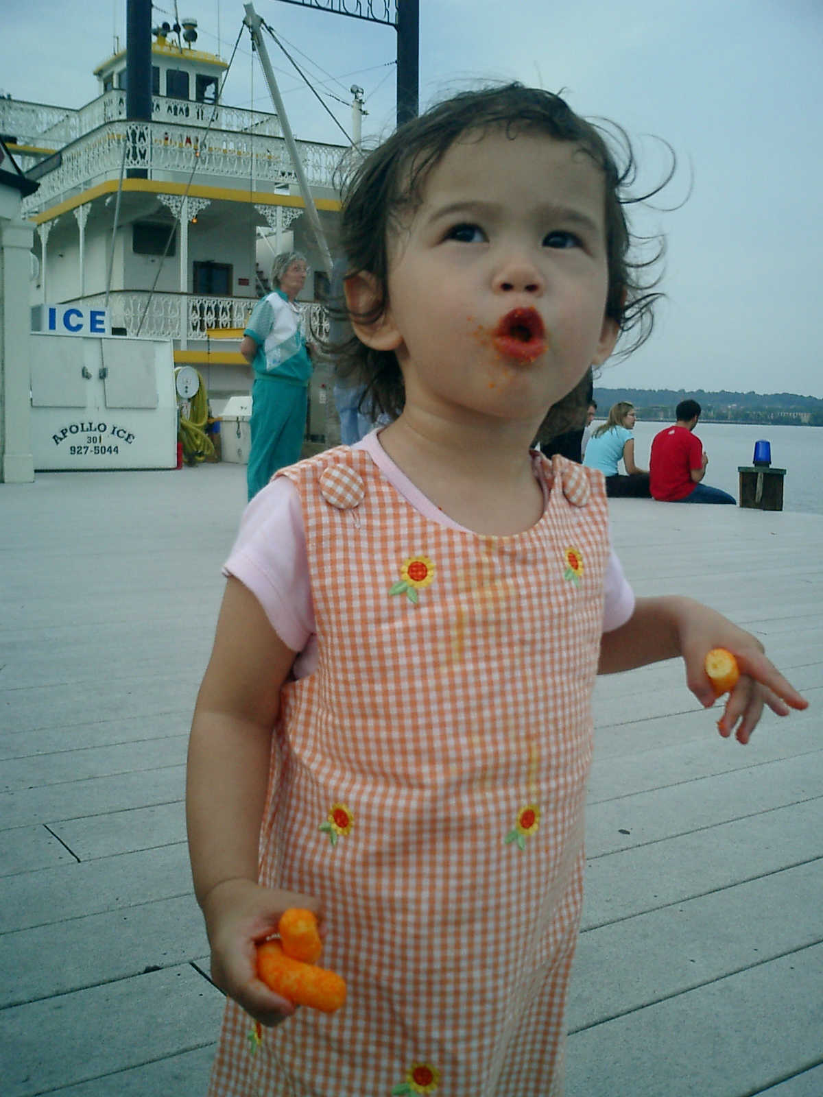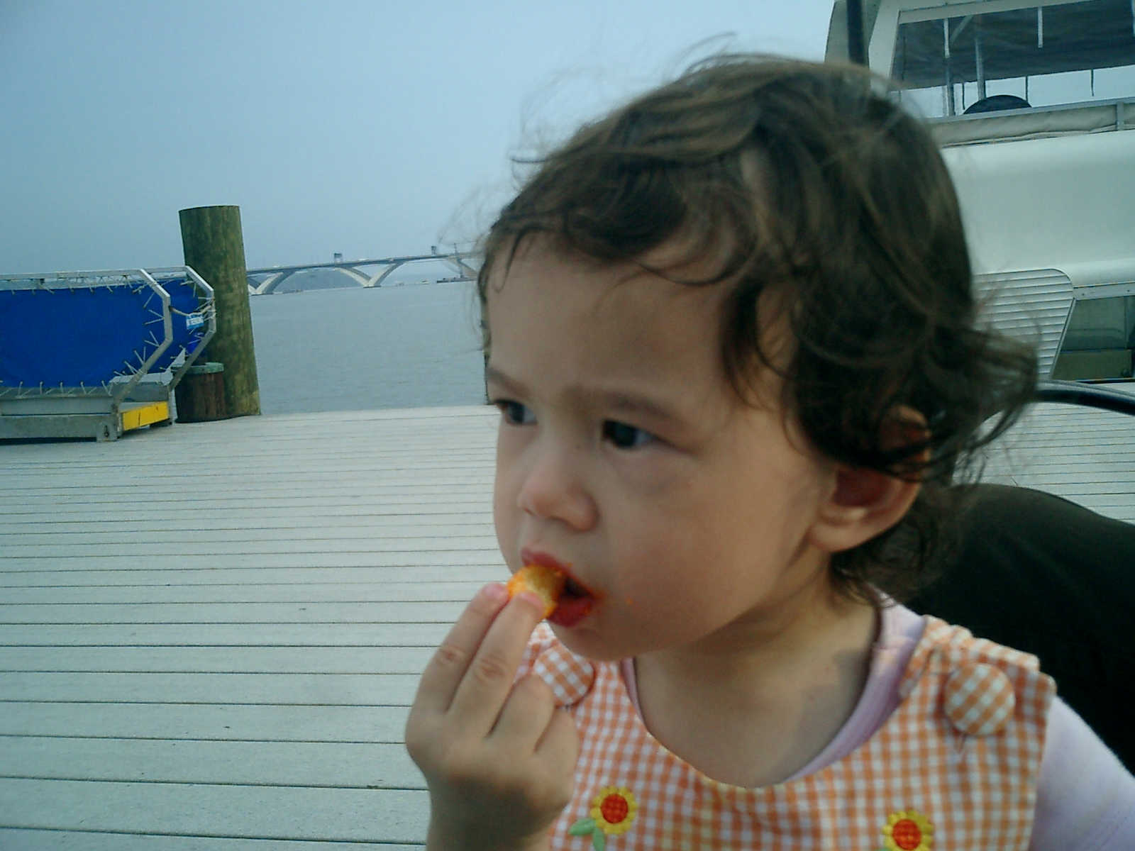 Nadine at 19 months (June 22, 2008), taking a stroll along the Old Town Alexandria Waterfront. Nadine gets hungry and has a quick snack with some cheese doodles. (Good, eh?)