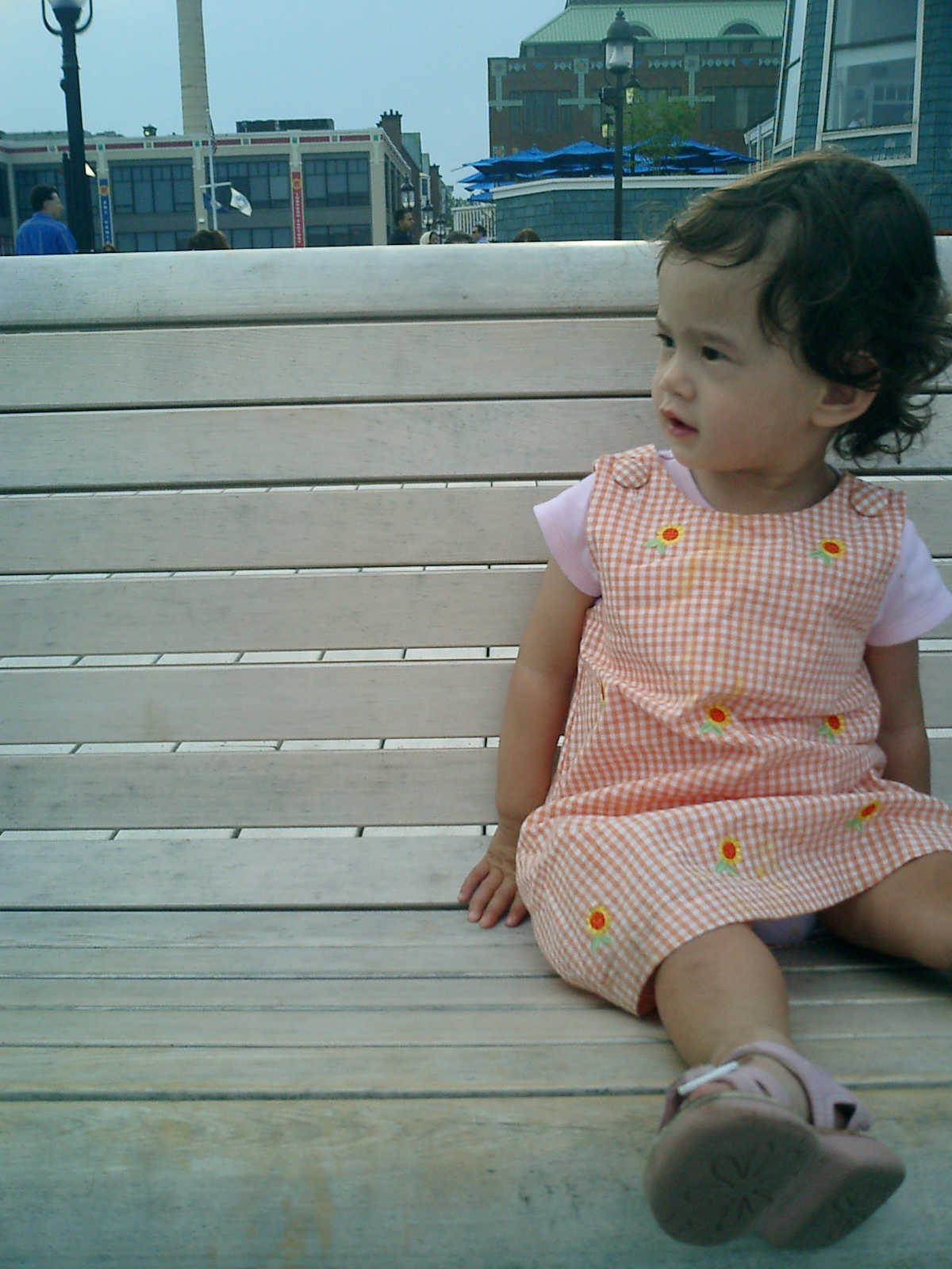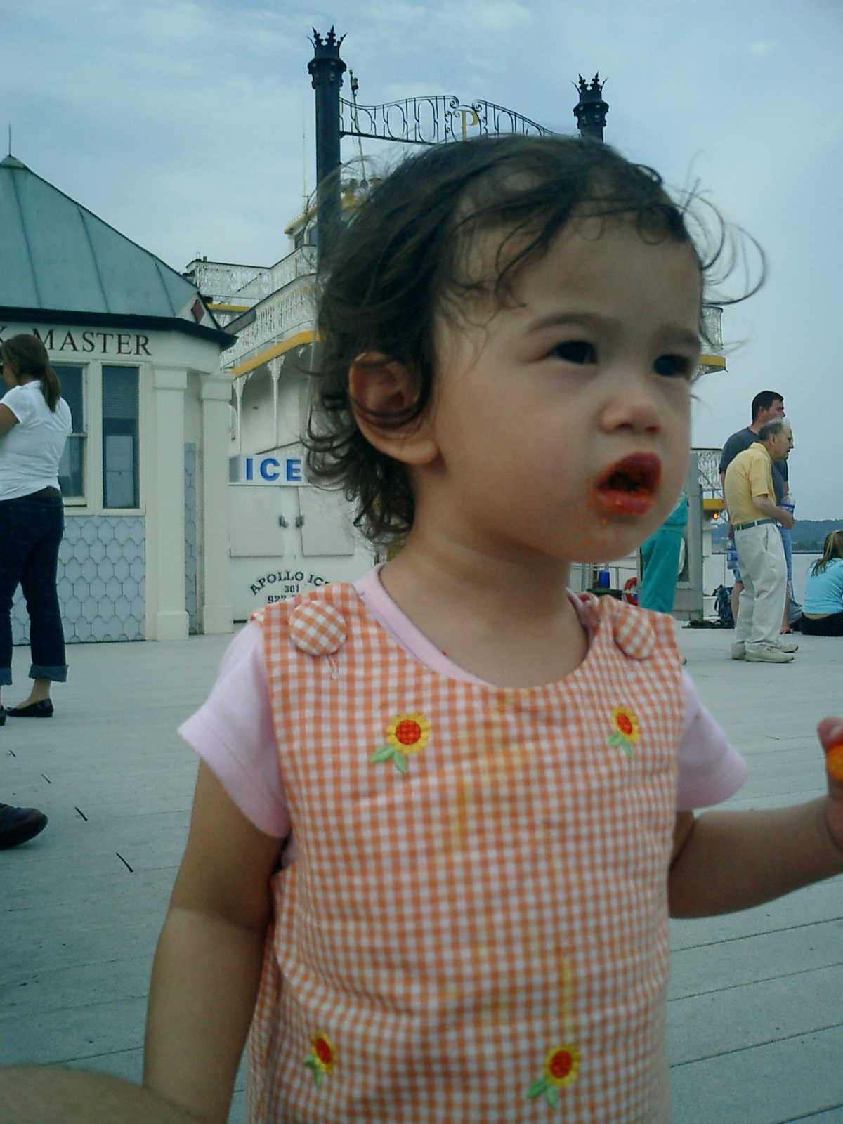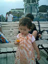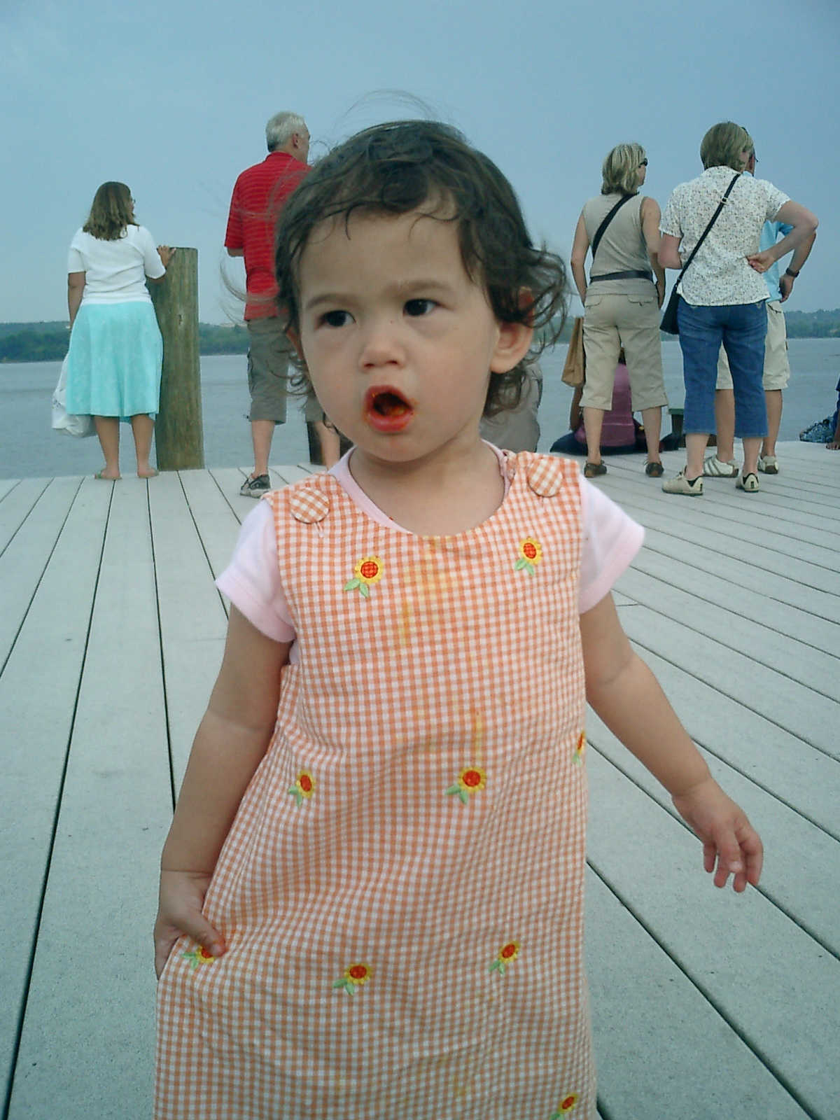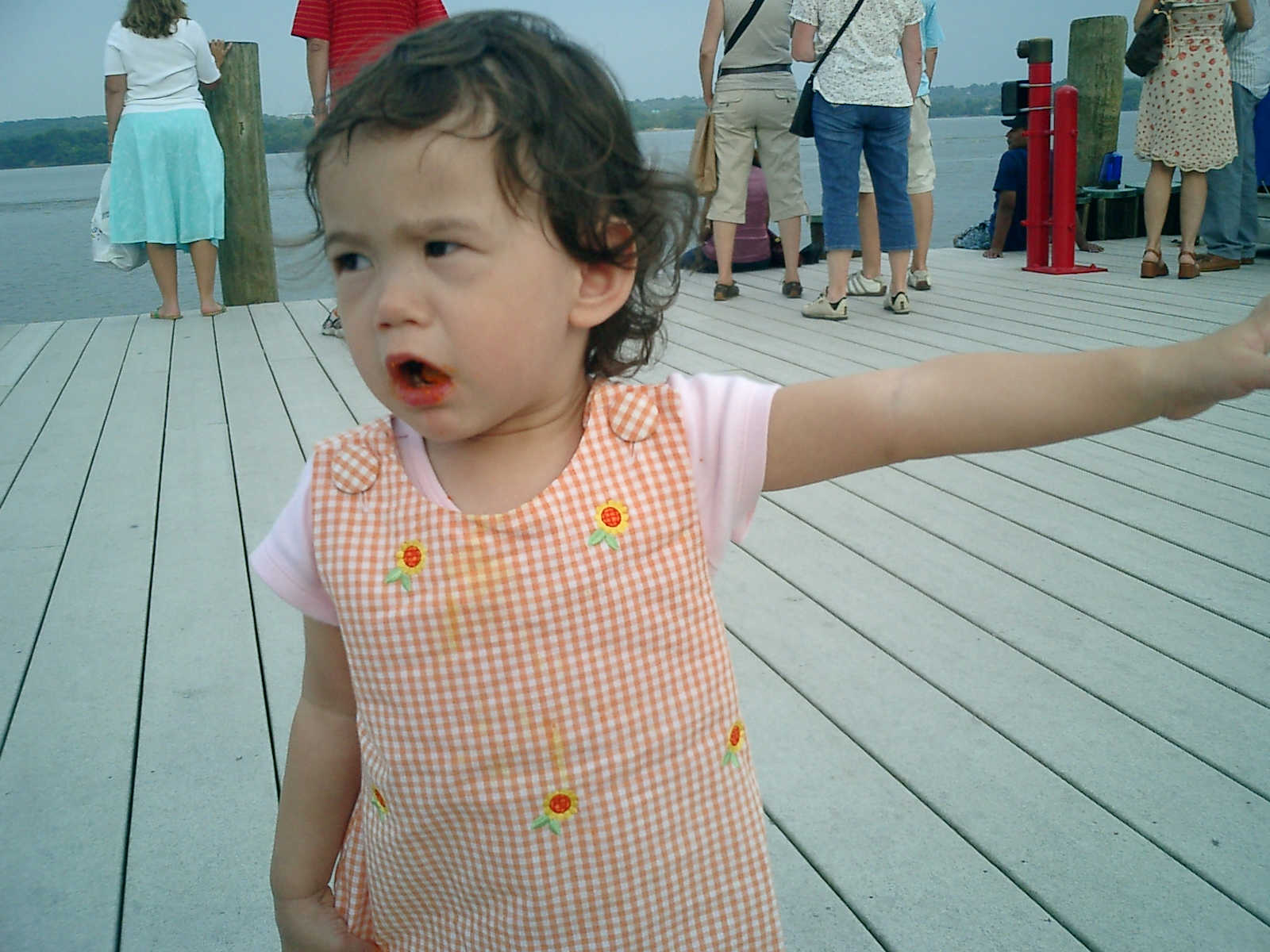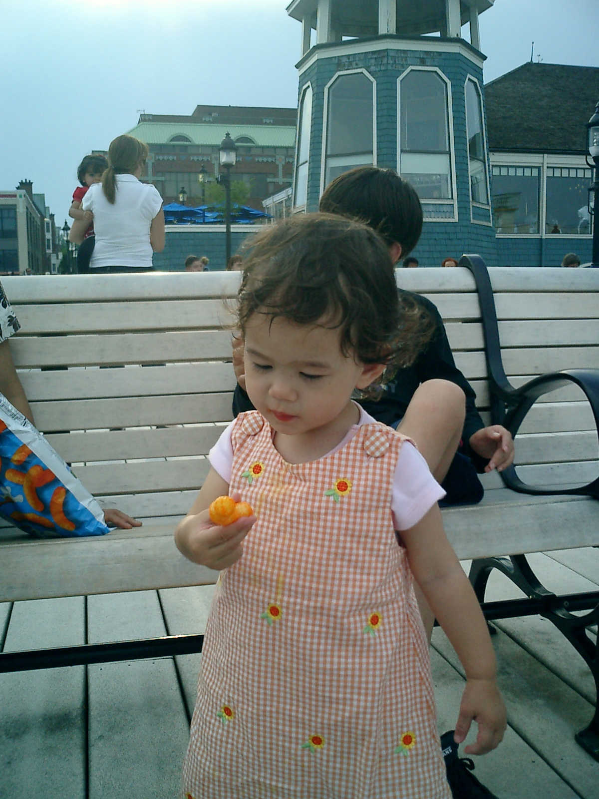 Nadine at 19 months (June 22, 2008), taking a stroll along the Old Town Alexandria Waterfront. Nadine gets hungry and has a quick snack with some cheese doodles. (Good, eh?)