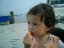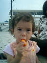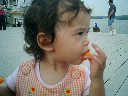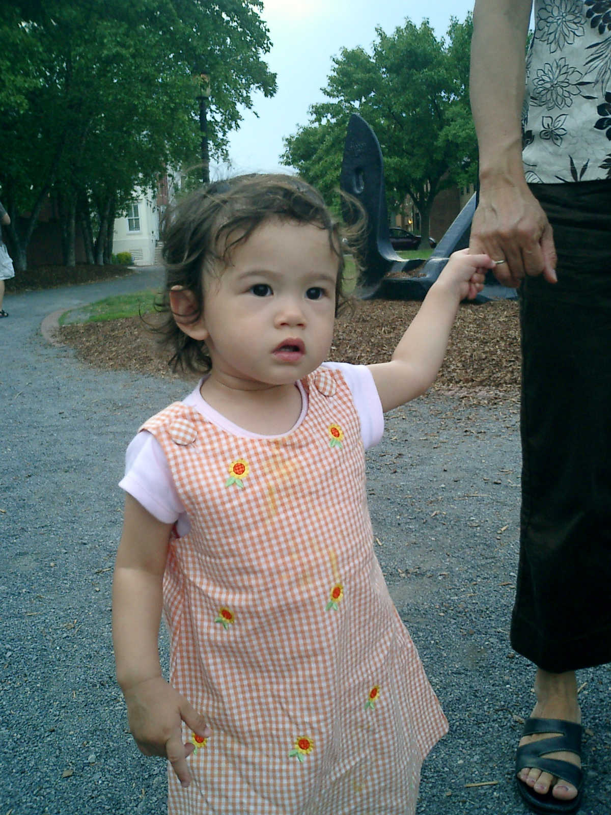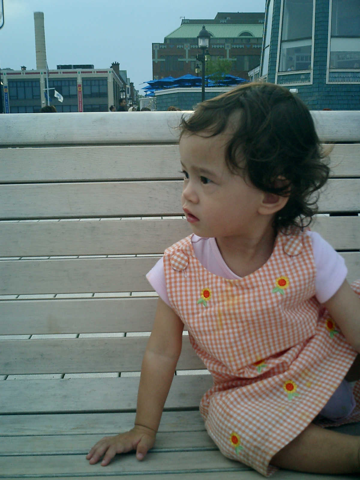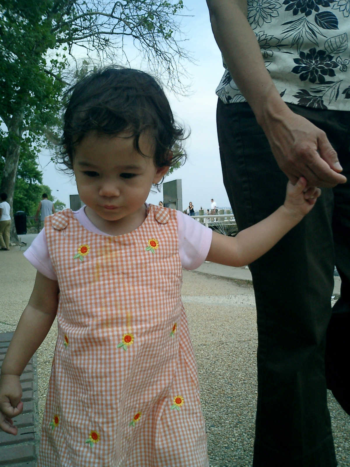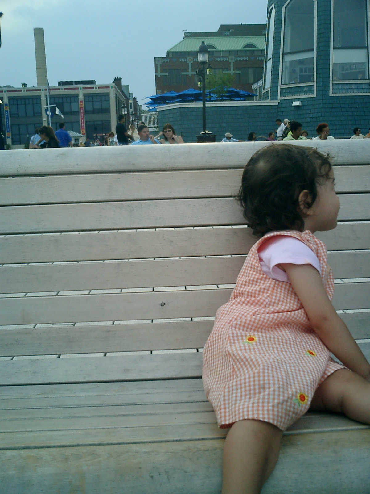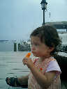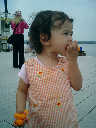 Nadine at 19 months (June 22, 2008), taking a stroll along the Old Town Alexandria Waterfront. Nadine gets hungry and has a quick snack with some cheese doodles. (Good, eh?)