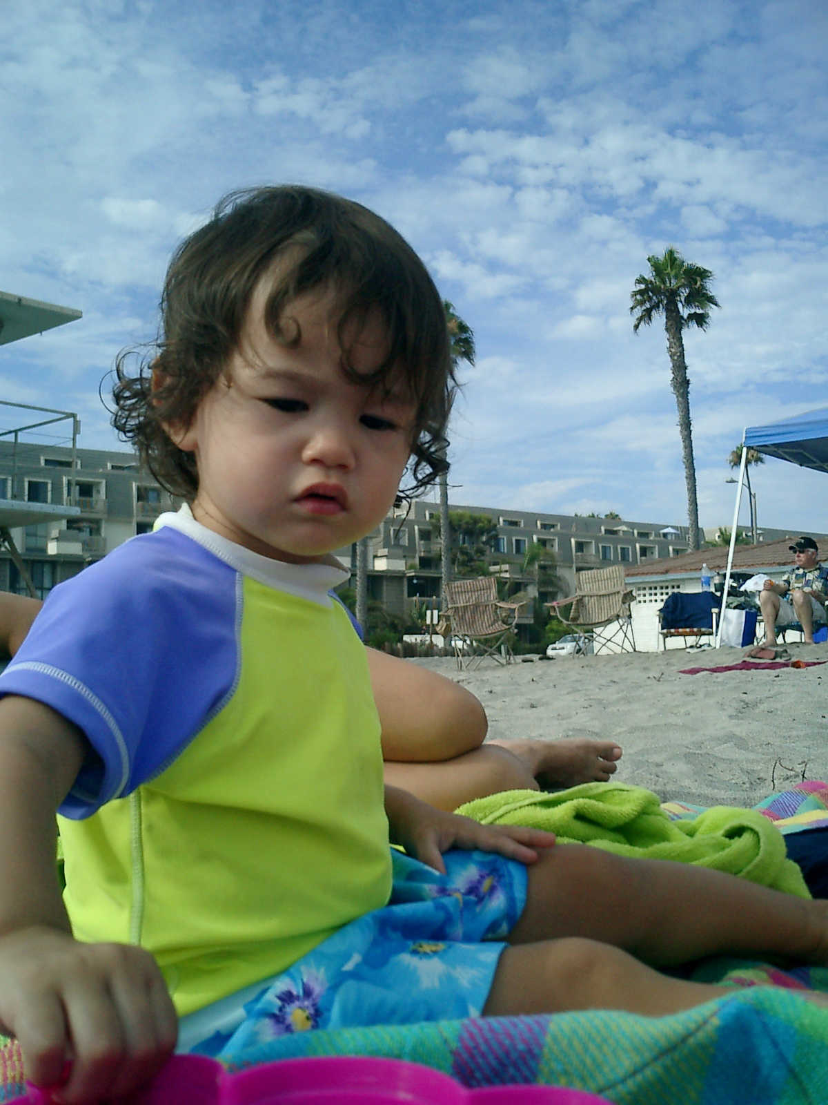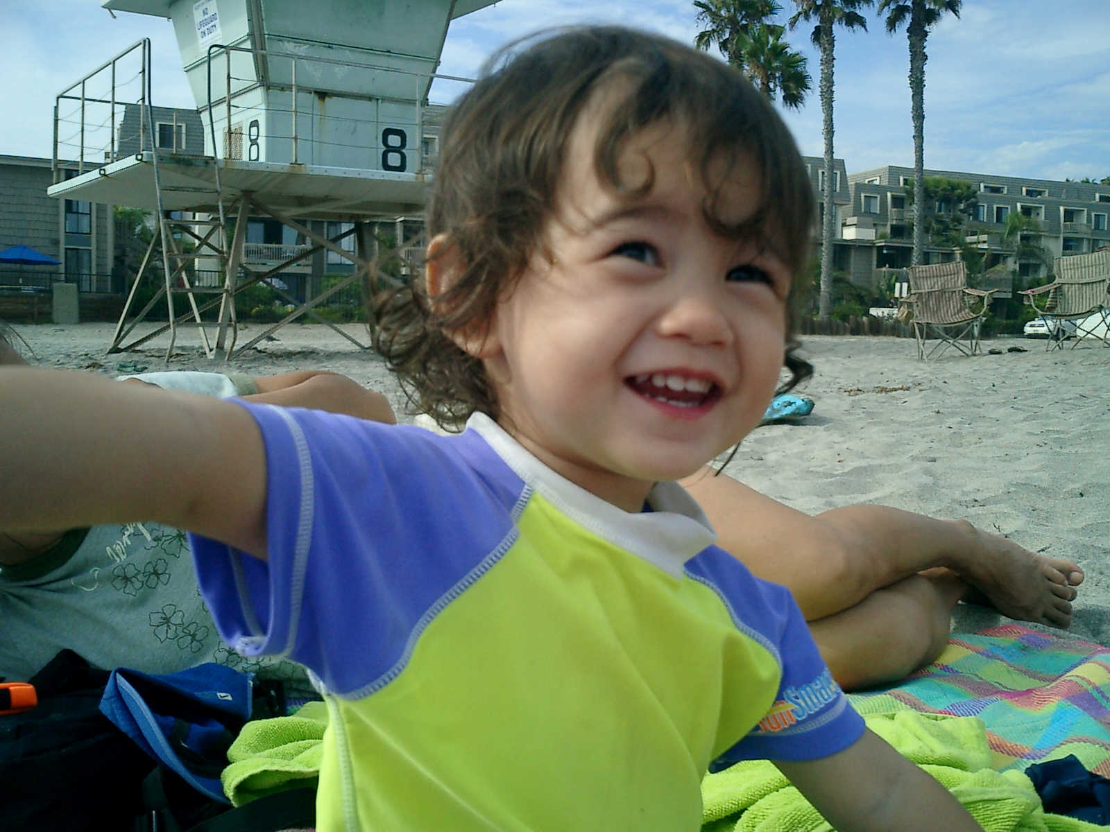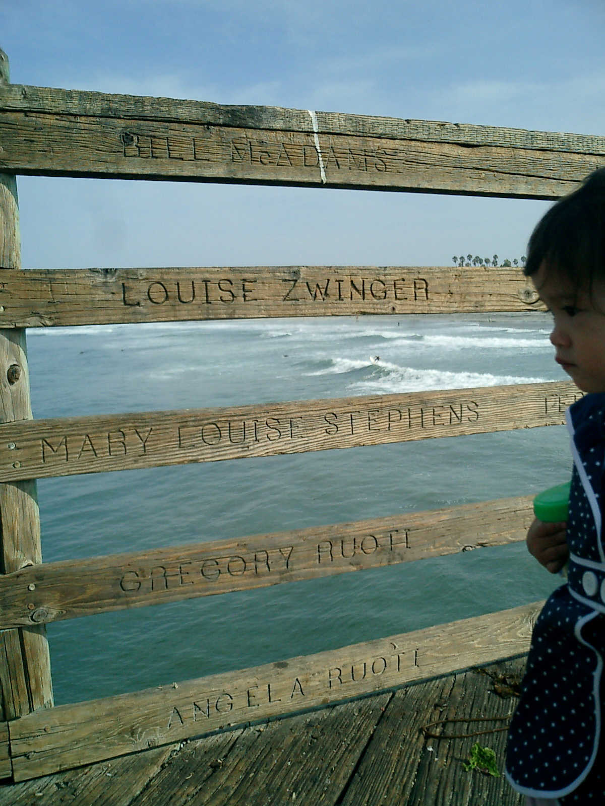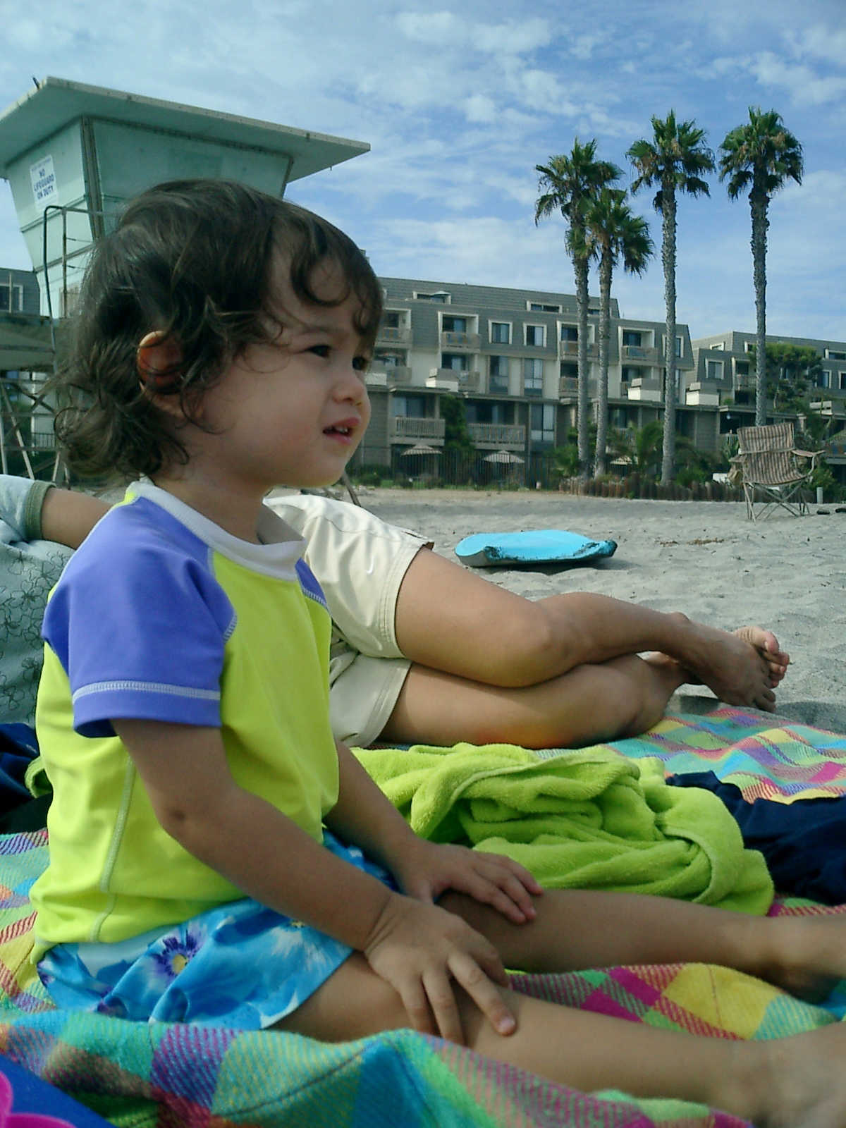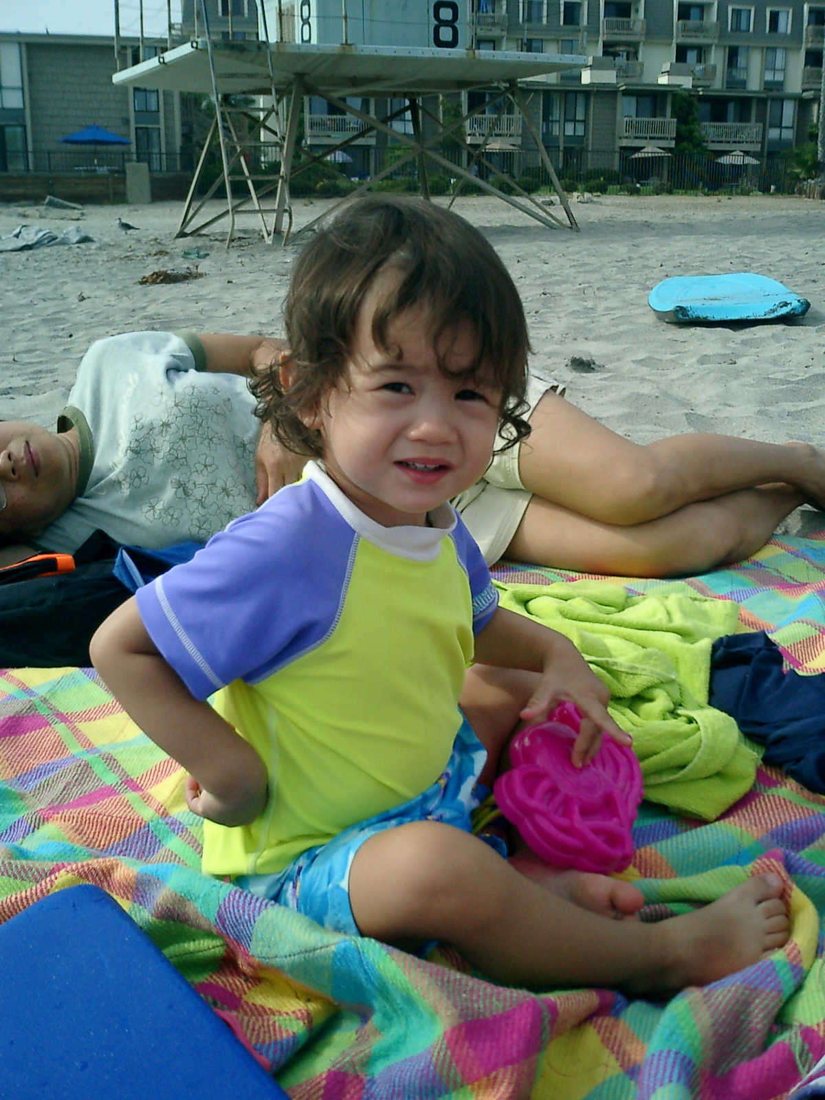 | Nadine at 20 and a half months, (Aug 13, 2008), on day 2 of our San Diego vacation: Morning walk to Oceanside pier for breakfast at the restaurant at the end of the half-mile pier, and the down to the beach with the whole family for boogie-board surfing and making sand castles. |