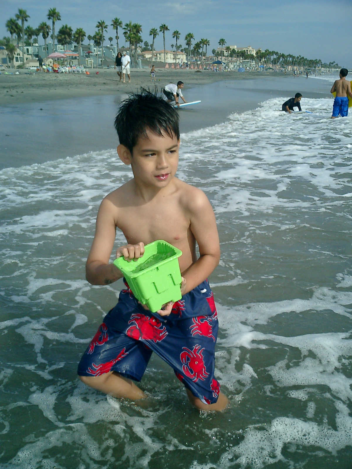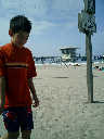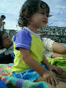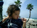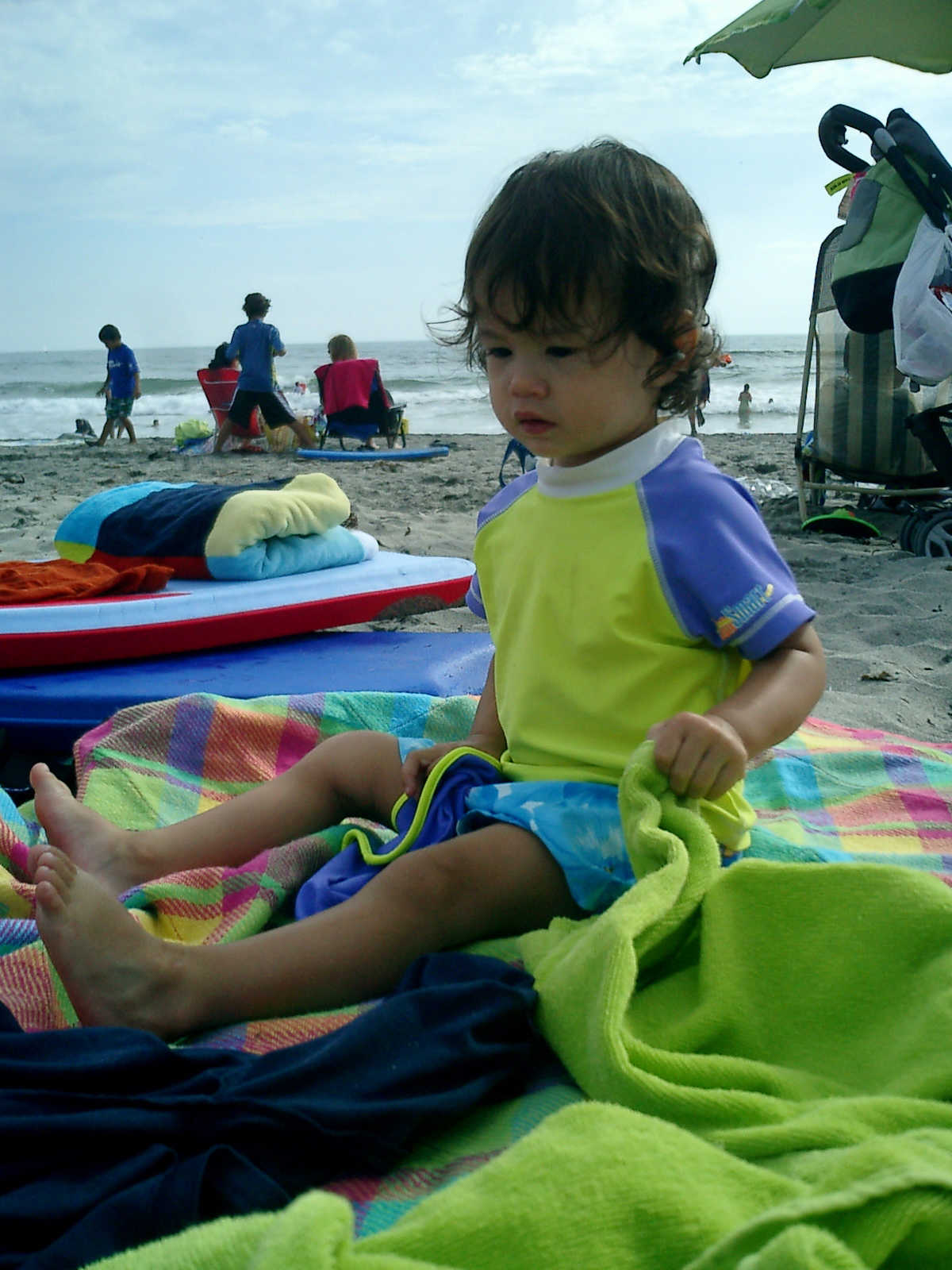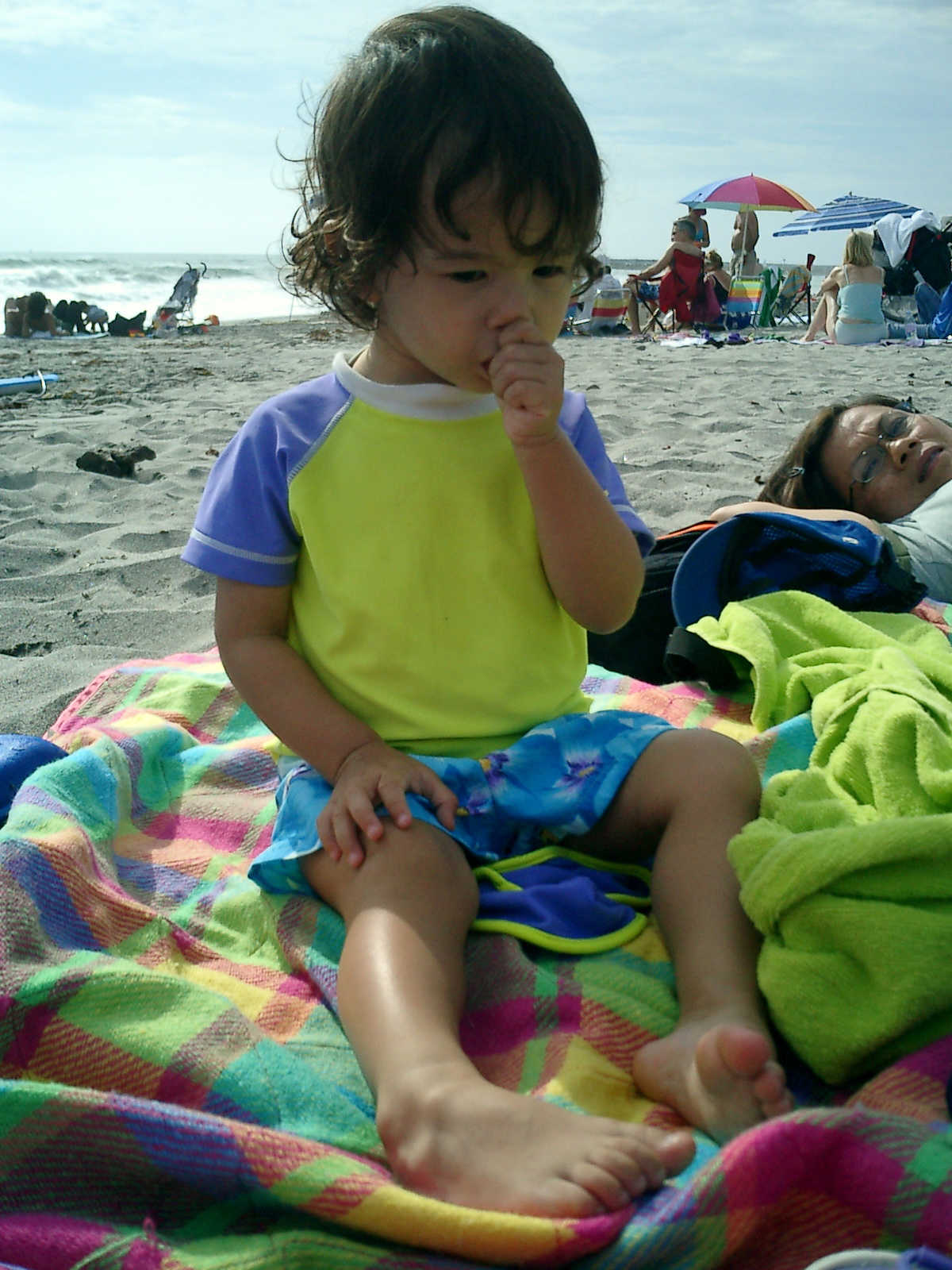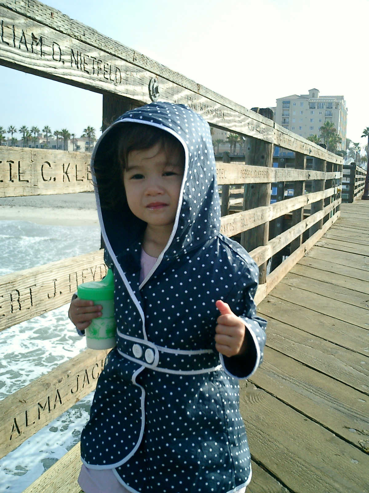 | Nadine at 20 and a half months, (Aug 13, 2008), on day 2 of our San Diego vacation: Morning walk to Oceanside pier for breakfast at the restaurant at the end of the half-mile pier, and the down to the beach with the whole family for boogie-board surfing and making sand castles. |