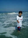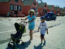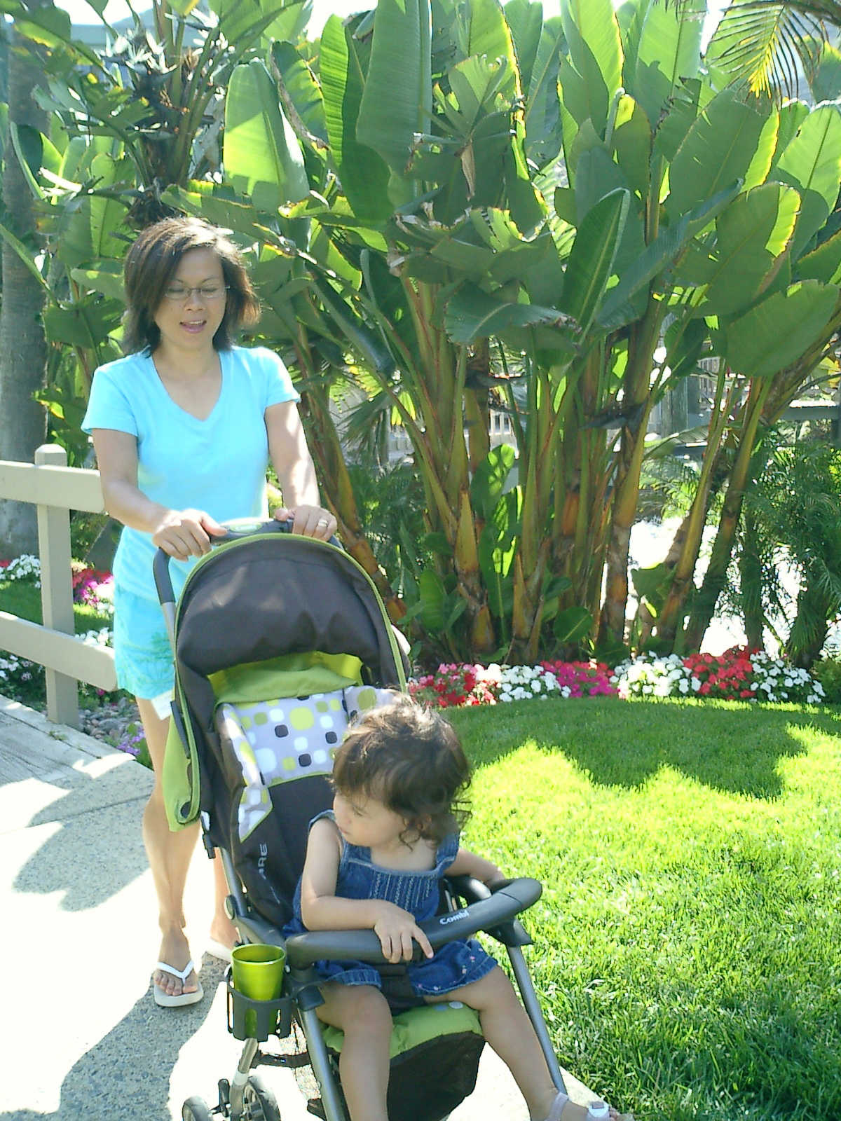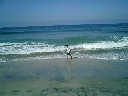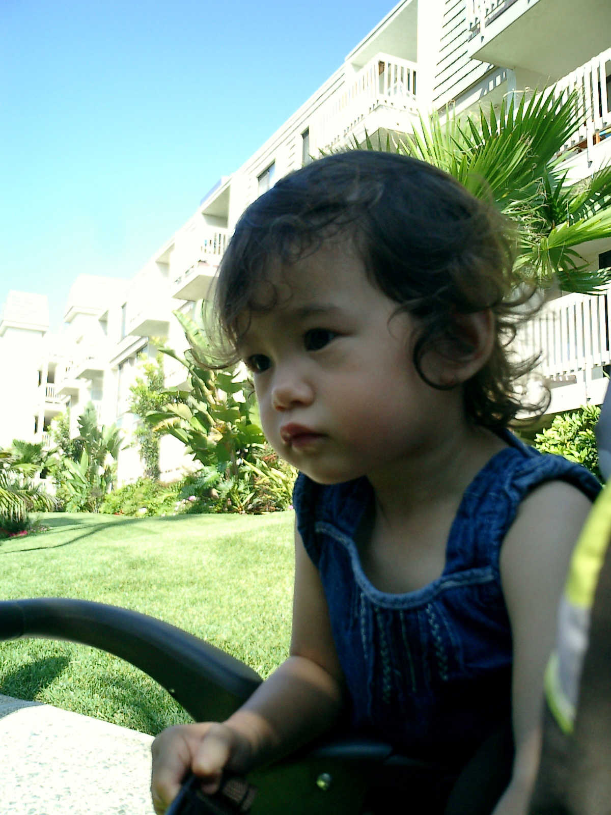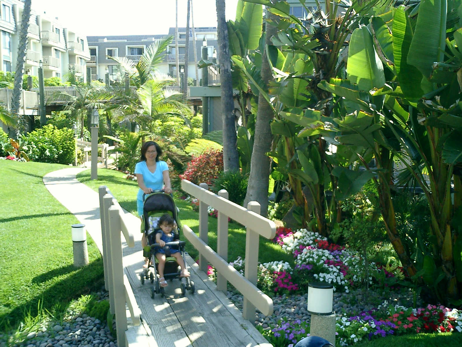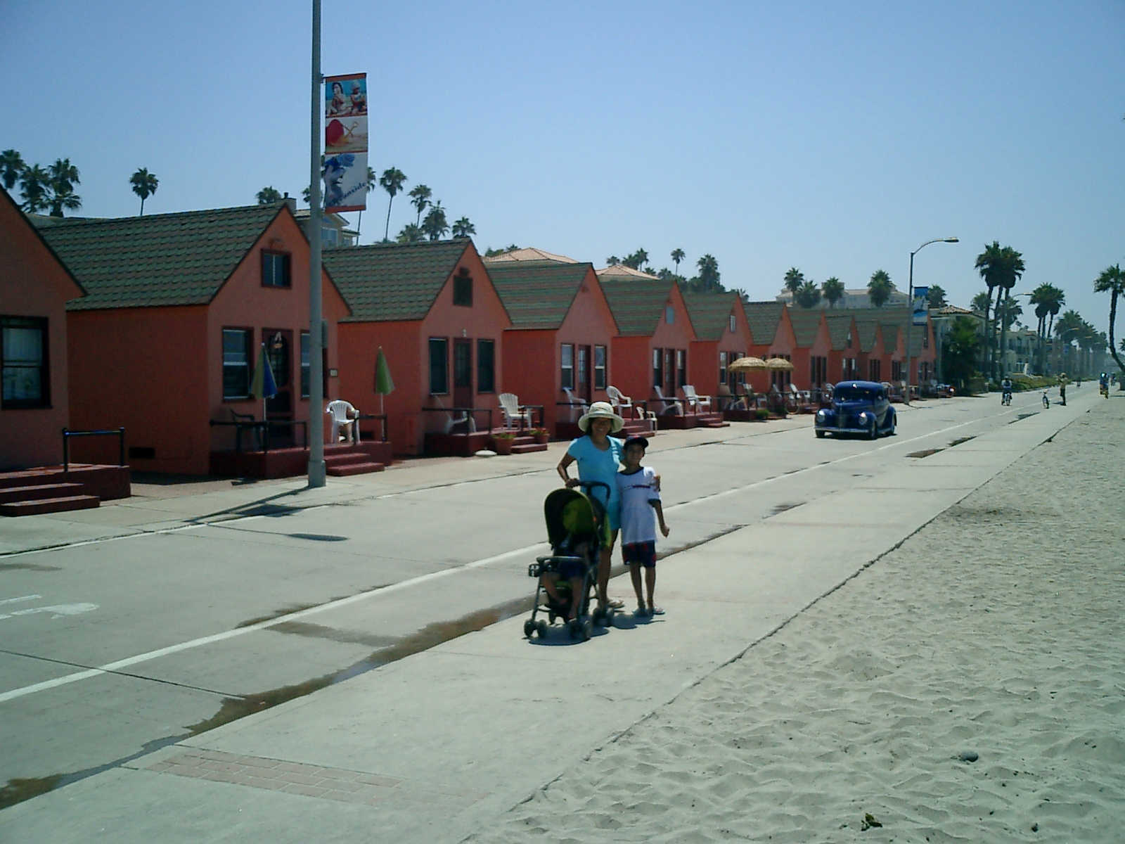| Nadine at 20 and a half months, (Aug 16, 2008), on day 5 of our San Diego vacation: Down through the lush tropical condo grounds, and a nice walk along the beach. Nadine, did you see the little pink beach houses, all in a row? They're famous -- you can see them in picture books too! |