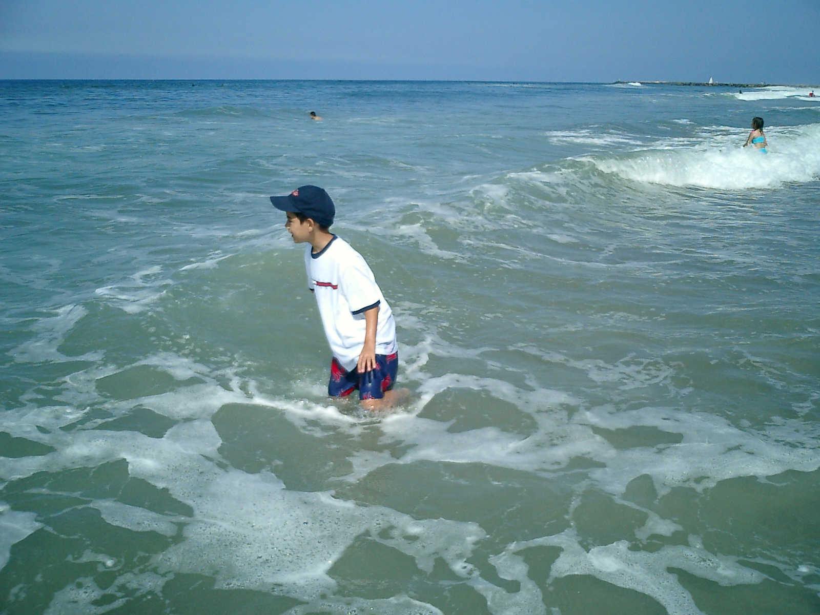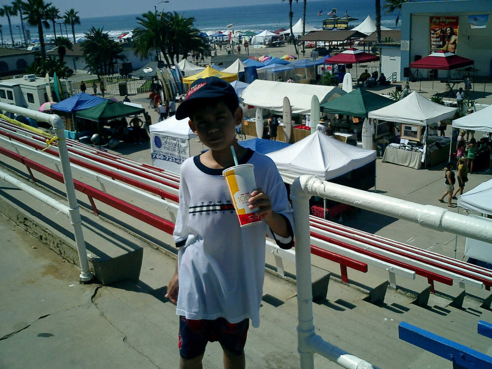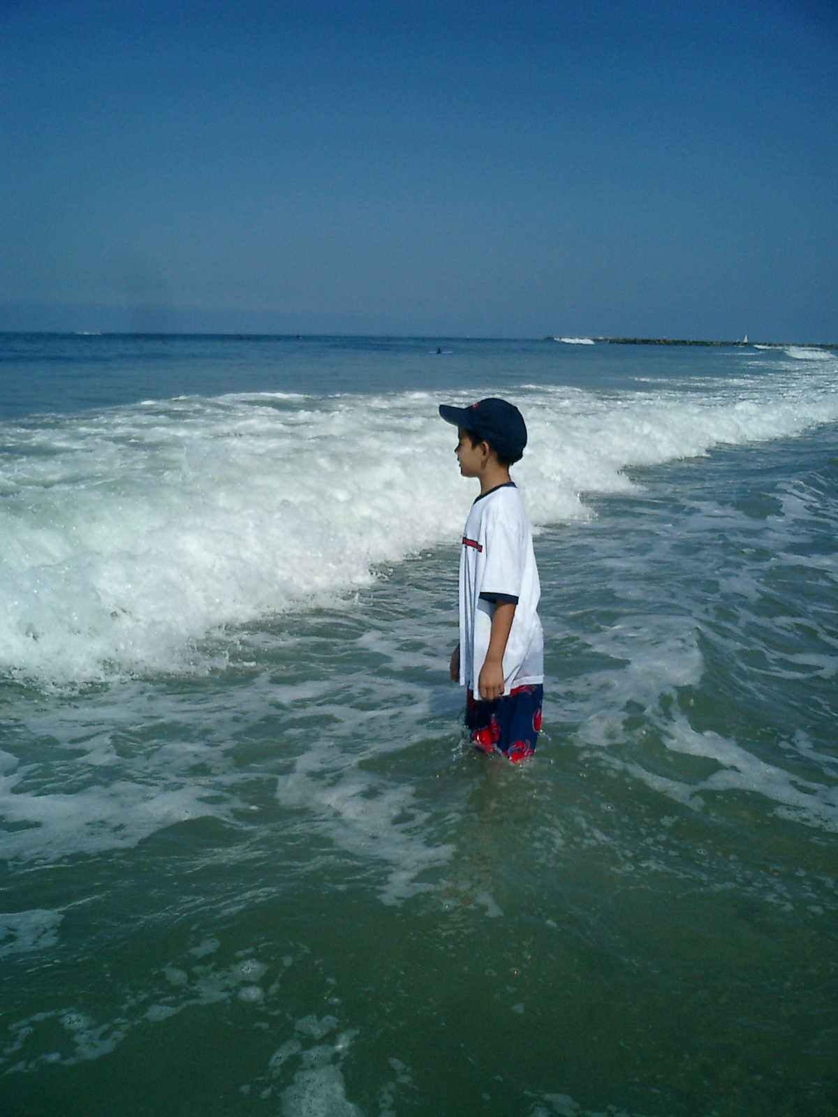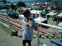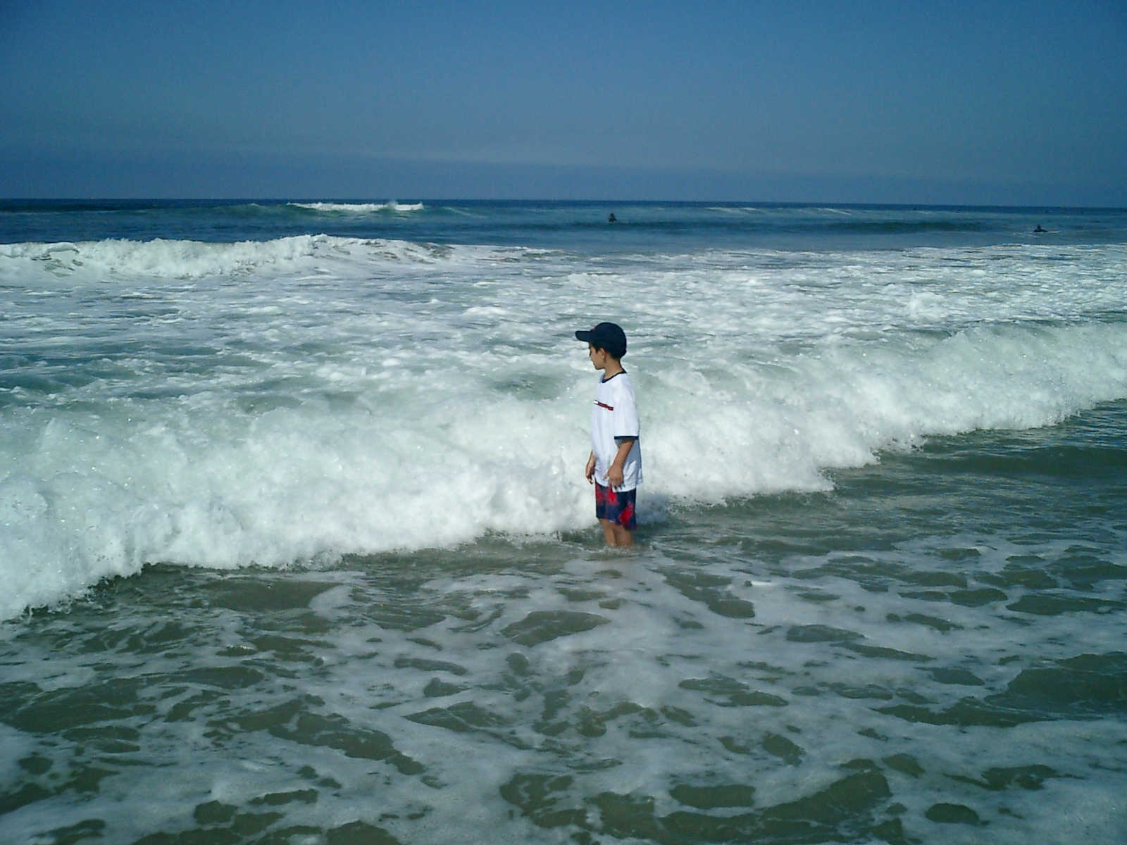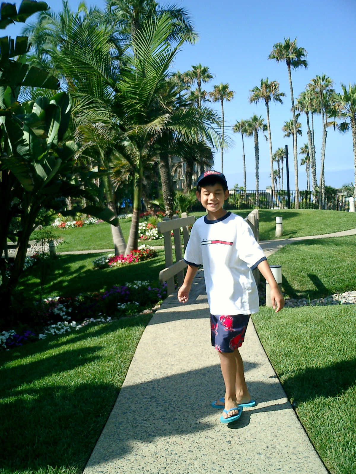 | Nadine at 20 and a half months, (Aug 16, 2008), on day 5 of our San Diego vacation: Down through the lush tropical condo grounds, and a nice walk along the beach. Nadine, did you see the little pink beach houses, all in a row? They're famous -- you can see them in picture books too! |
