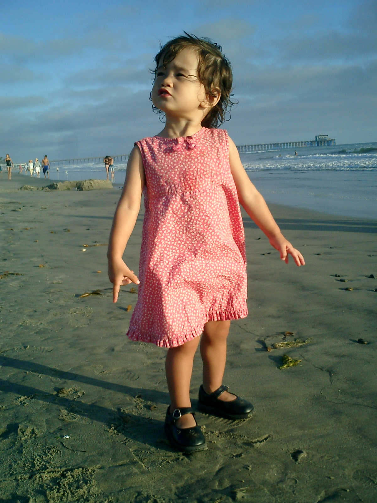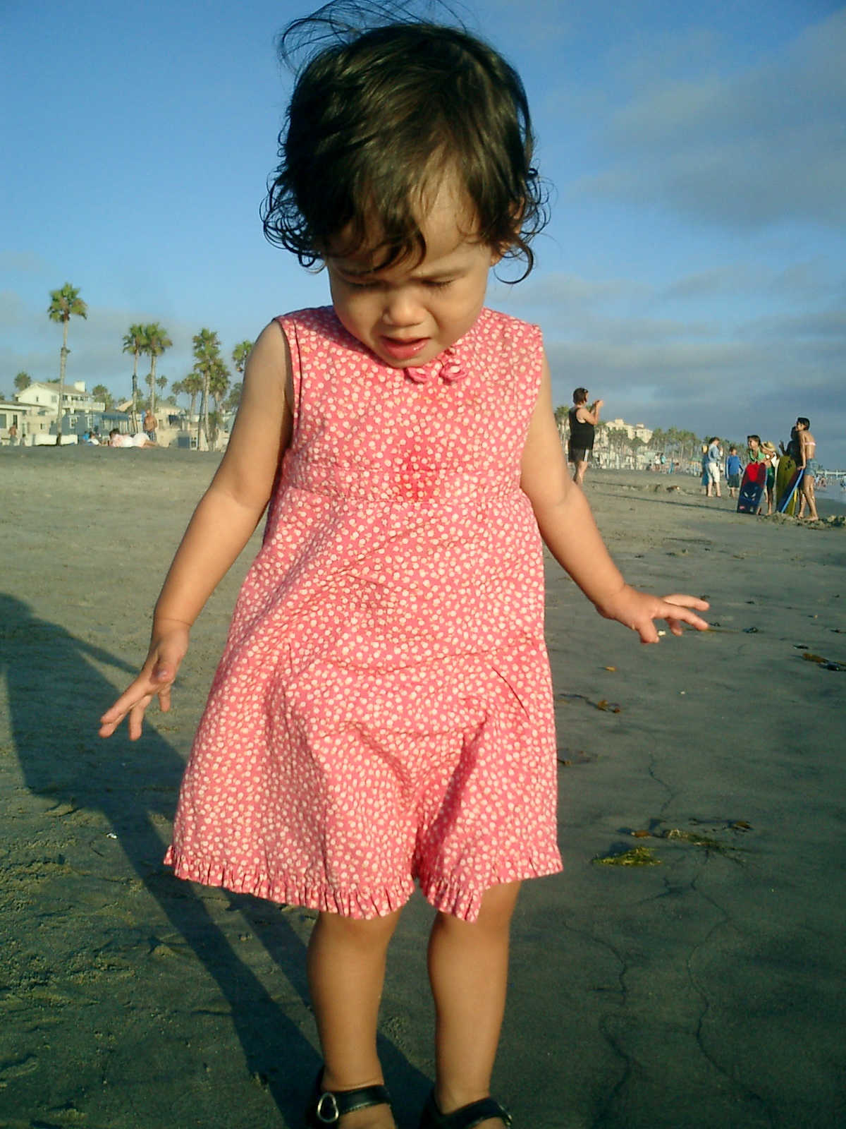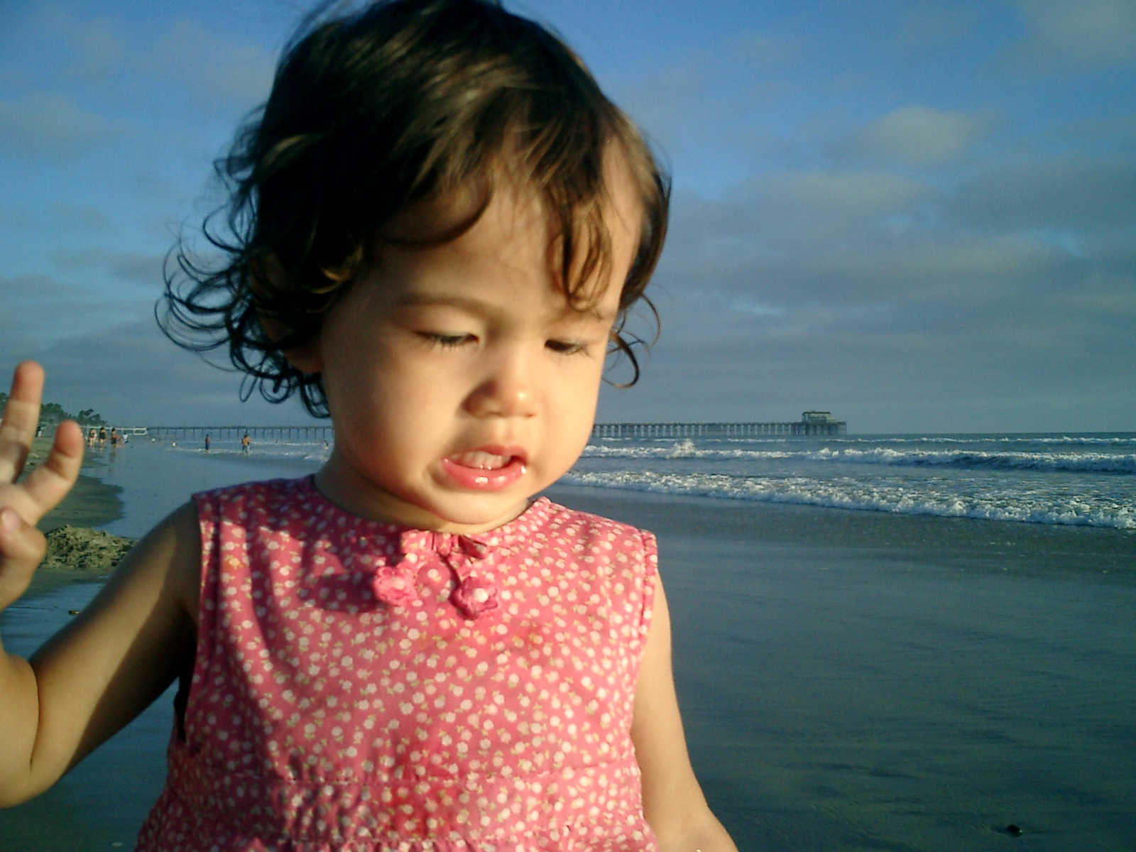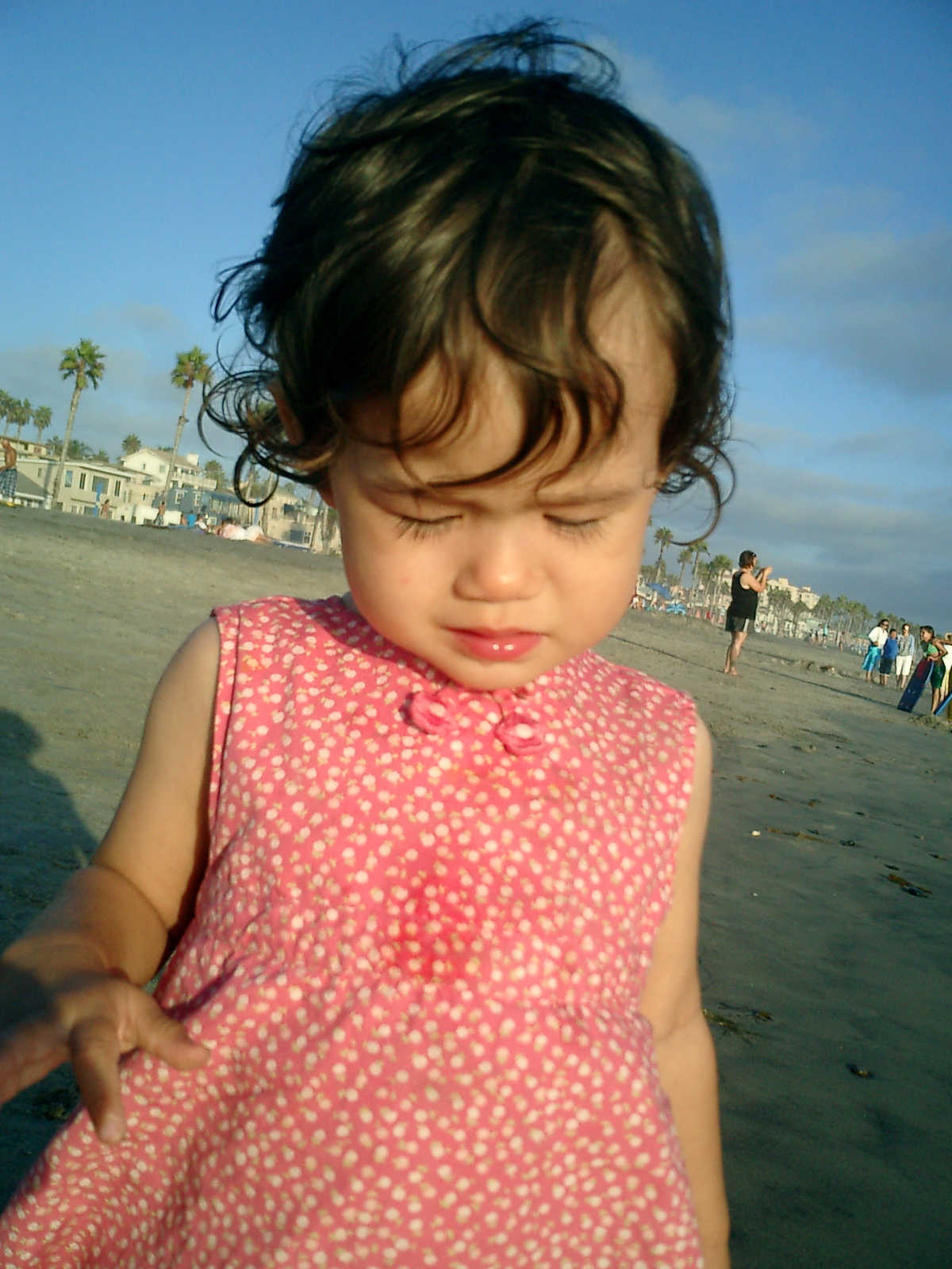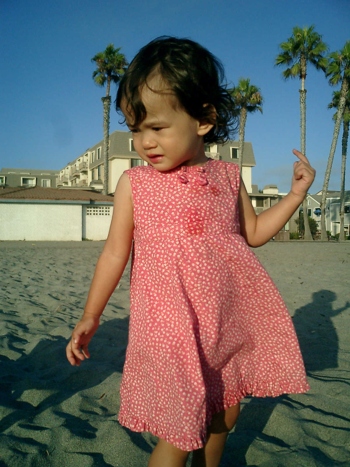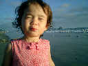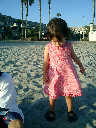 | Nadine at 20 and a half months, (Aug 17, 2008), on day 6 of our San Diego vacation: Visiting Los Angeles, including lunch in Thai Town; driving through the Hollywood Hills and Mulholland Drive ("Home of the stars..."); stopping at San Clemente beach on the way home; then just enought time to go to the Oceanside beach one more time. Nadine, how come you don't like the sand too much? Do you think it is too dirty for a pretty girl like you? (But, you do like to scream "Bubbles!" when you see the waves!) |