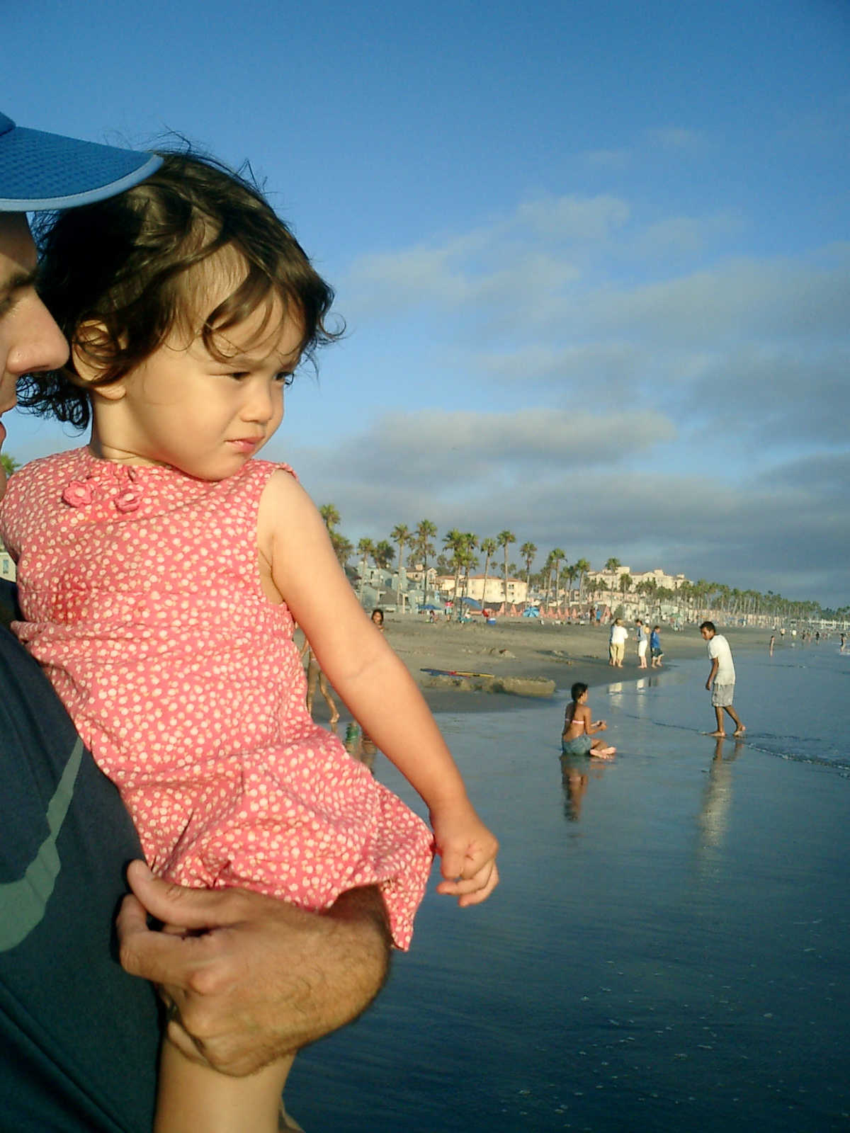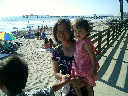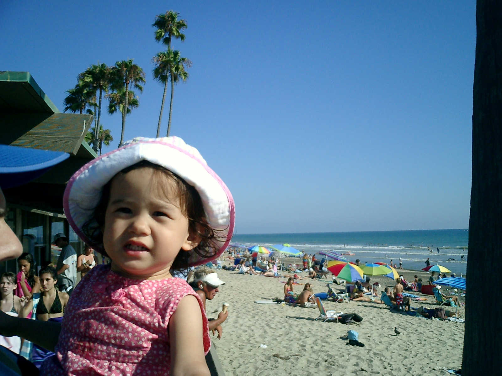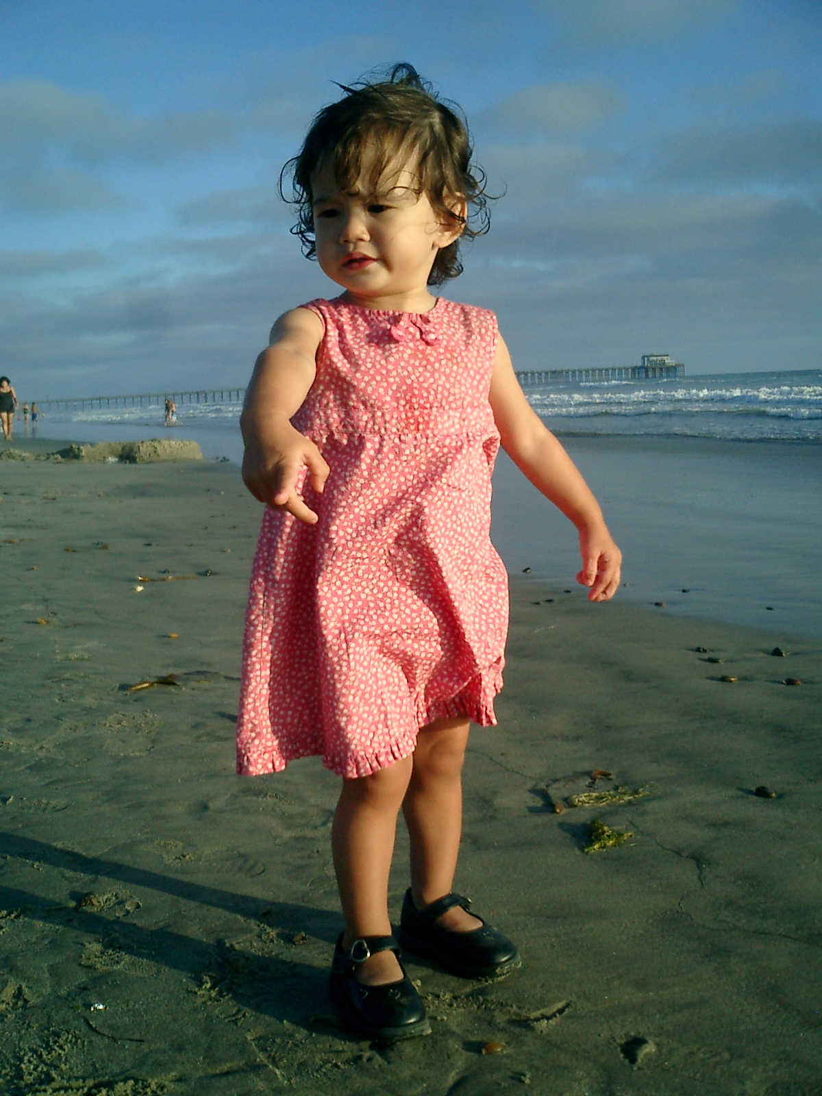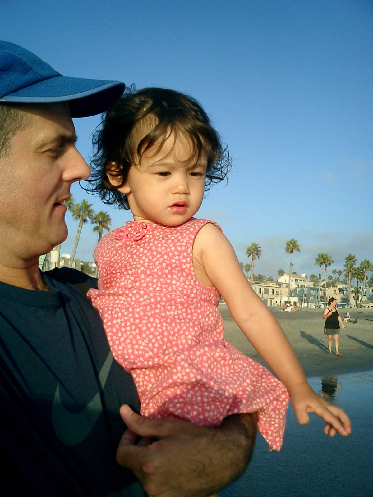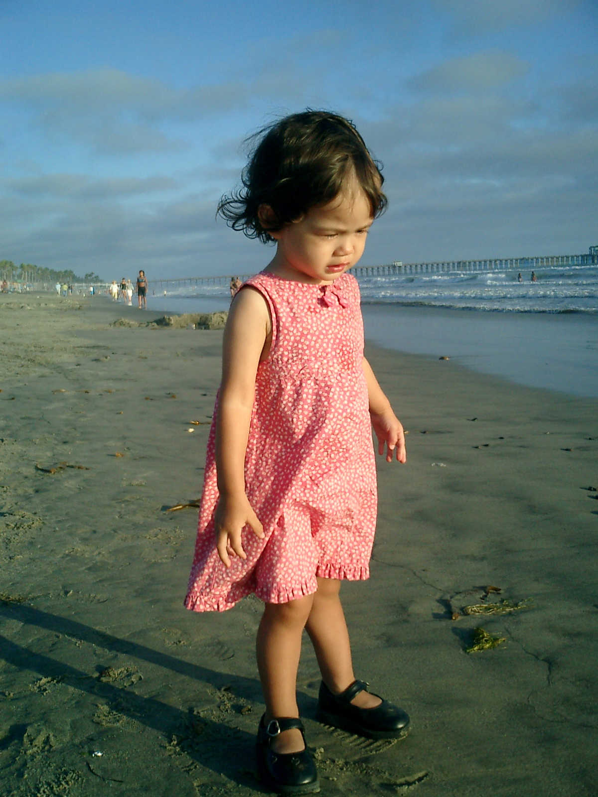 | Nadine at 20 and a half months, (Aug 17, 2008), on day 6 of our San Diego vacation: Visiting Los Angeles, including lunch in Thai Town; driving through the Hollywood Hills and Mulholland Drive ("Home of the stars..."); stopping at San Clemente beach on the way home; then just enought time to go to the Oceanside beach one more time. Nadine, how come you don't like the sand too much? Do you think it is too dirty for a pretty girl like you? (But, you do like to scream "Bubbles!" when you see the waves!) |