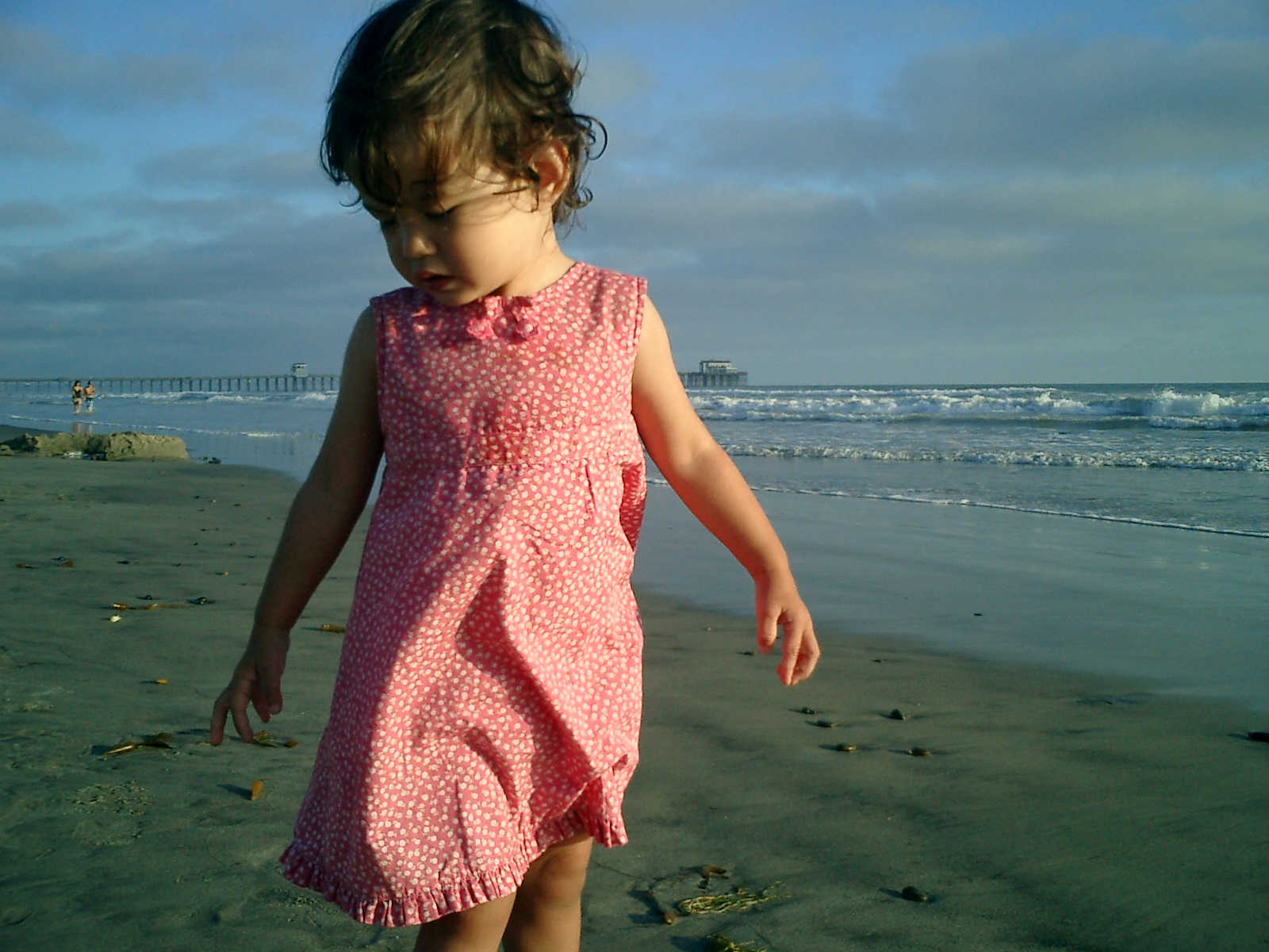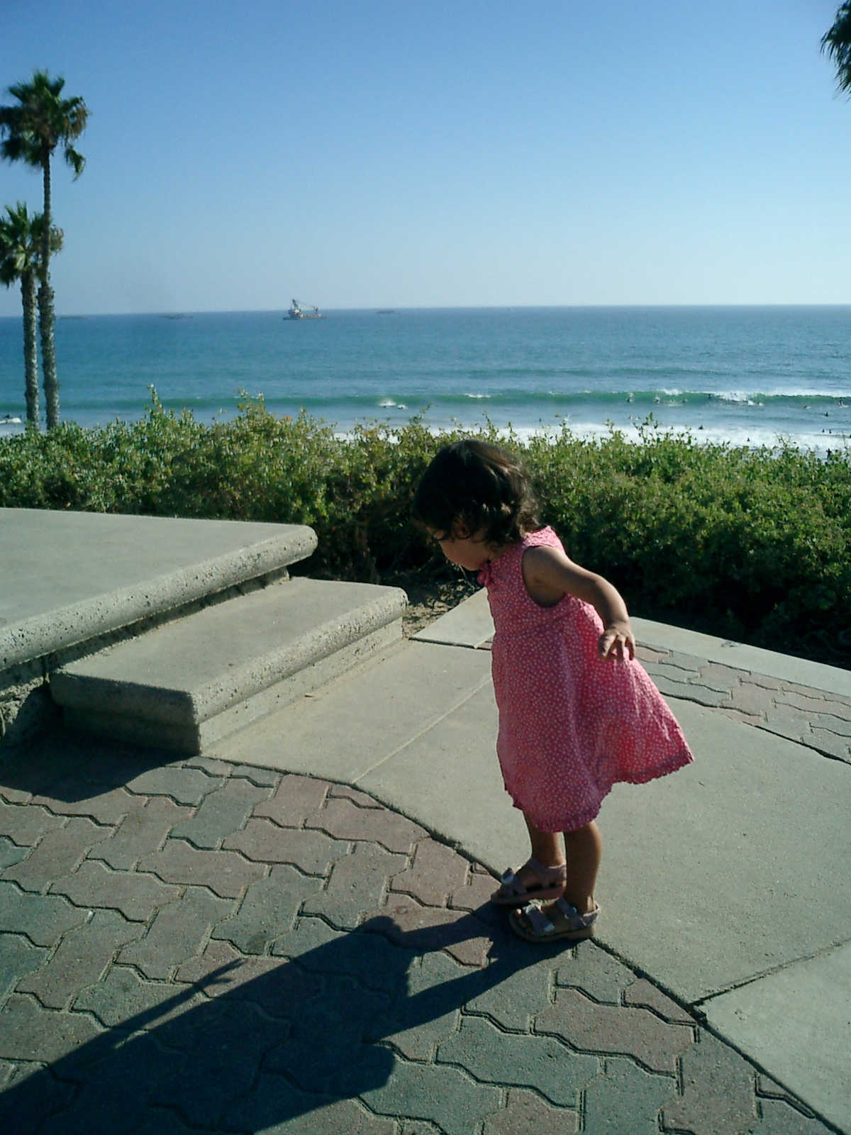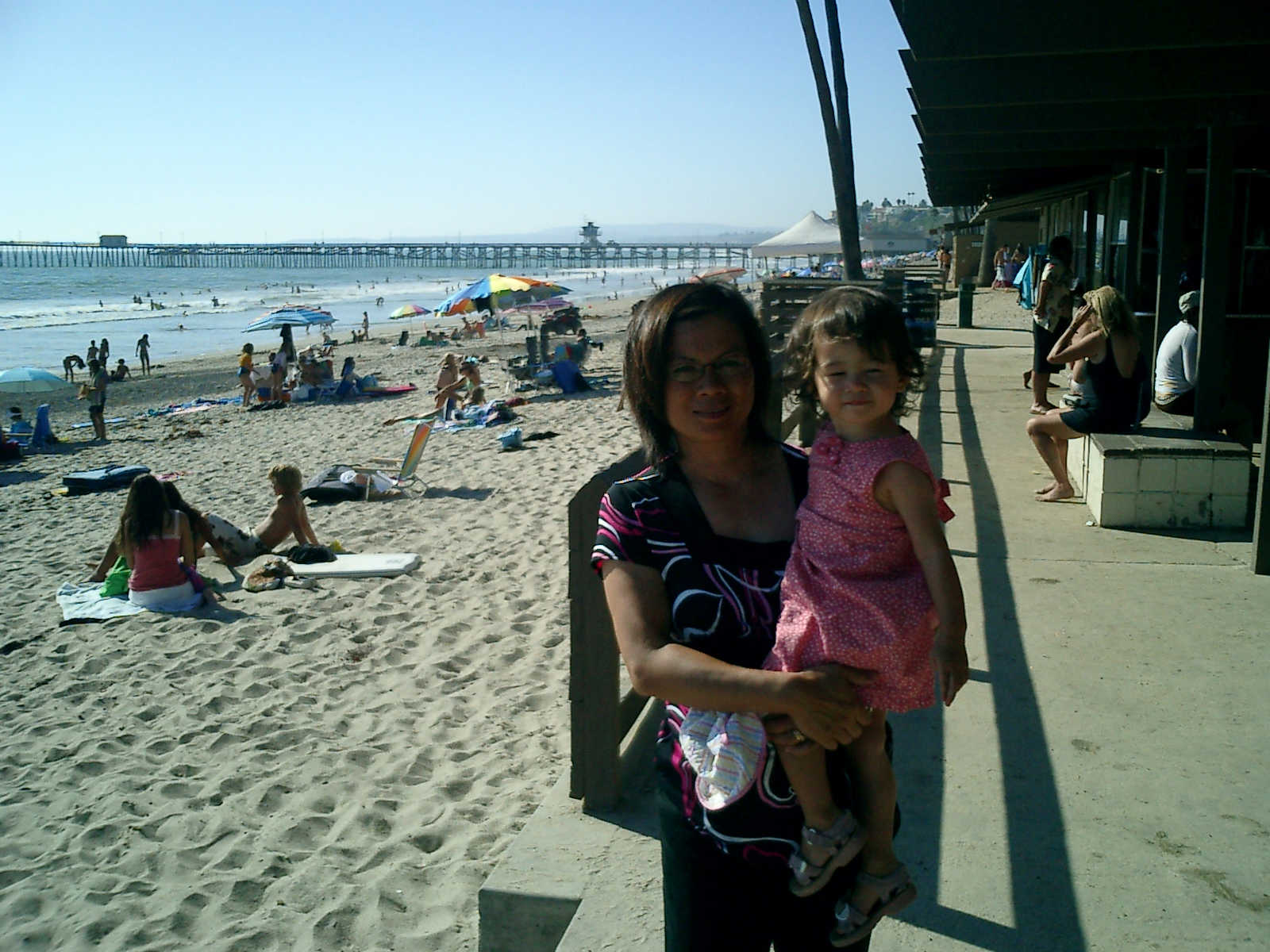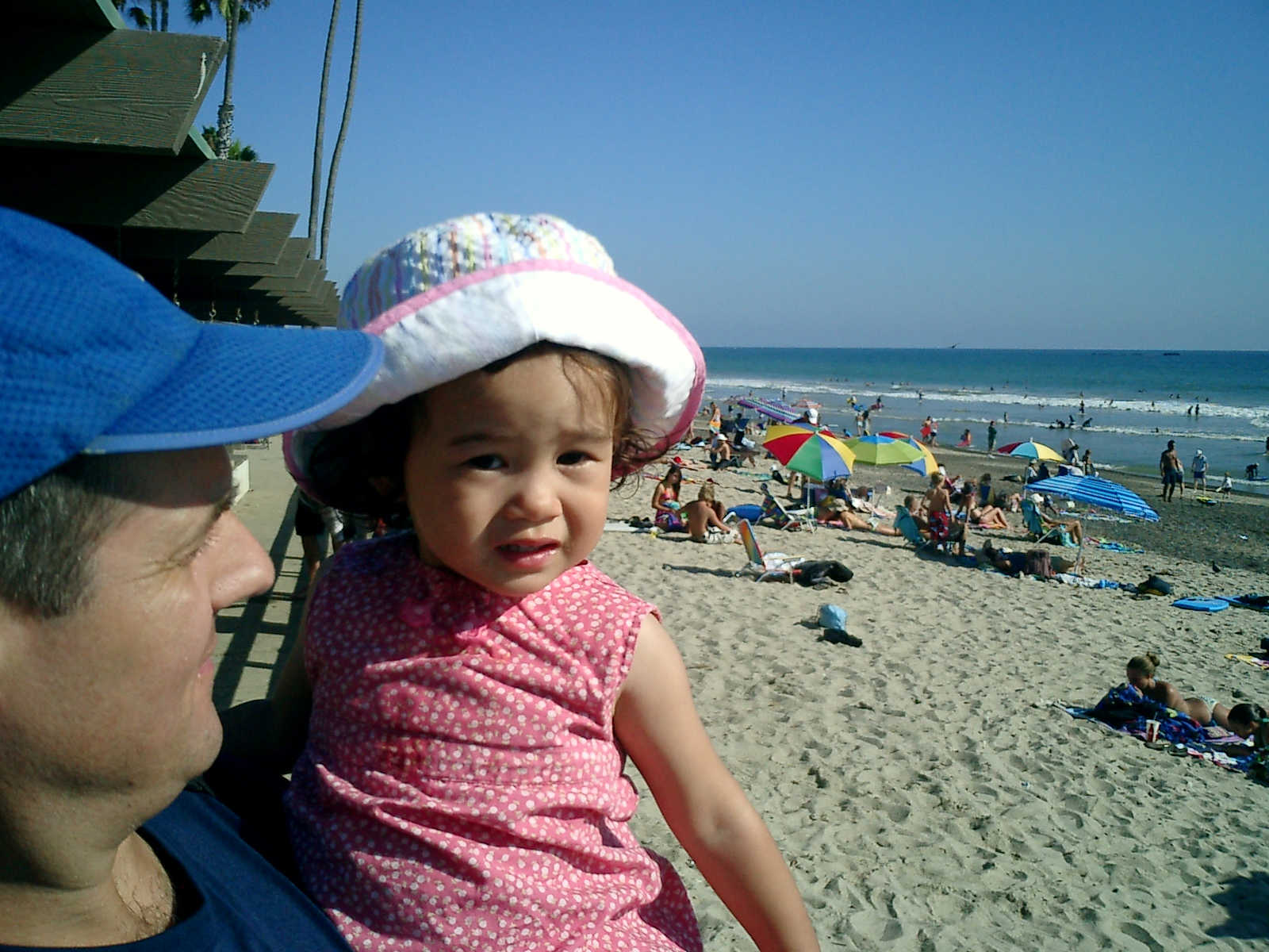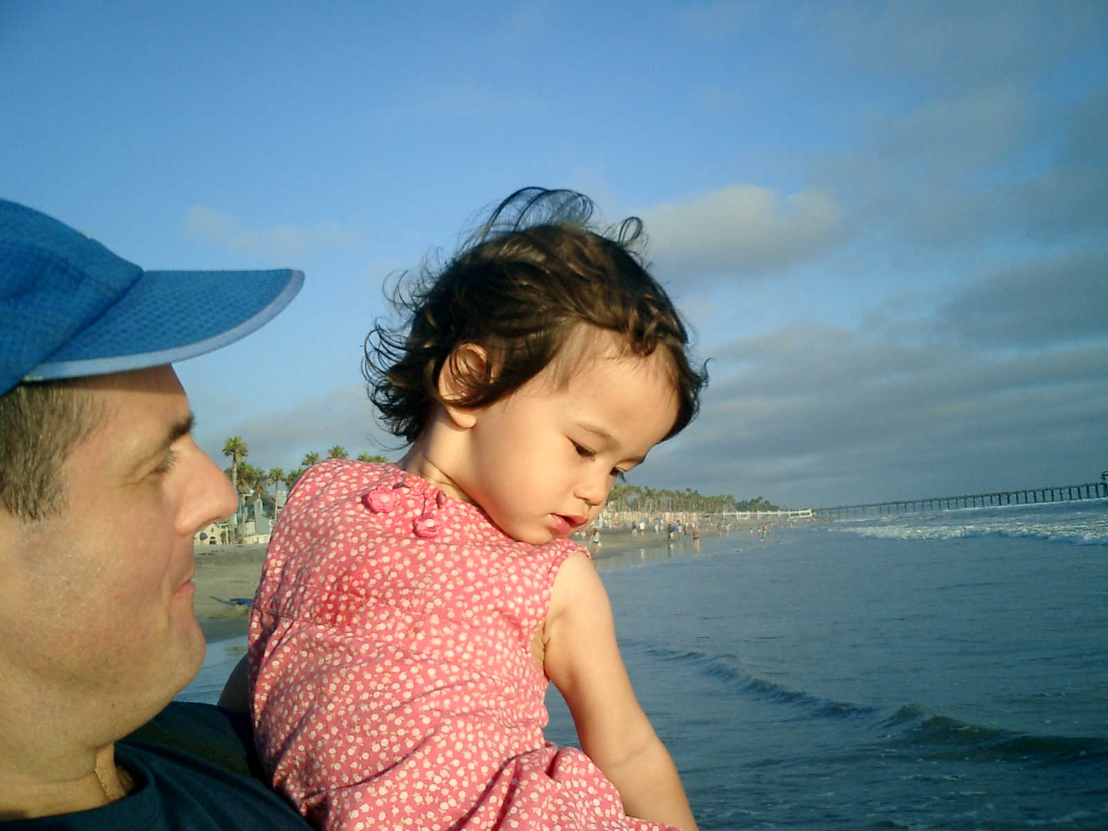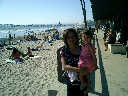 | Nadine at 20 and a half months, (Aug 17, 2008), on day 6 of our San Diego vacation: Visiting Los Angeles, including lunch in Thai Town; driving through the Hollywood Hills and Mulholland Drive ("Home of the stars..."); stopping at San Clemente beach on the way home; then just enought time to go to the Oceanside beach one more time. Nadine, how come you don't like the sand too much? Do you think it is too dirty for a pretty girl like you? (But, you do like to scream "Bubbles!" when you see the waves!) |