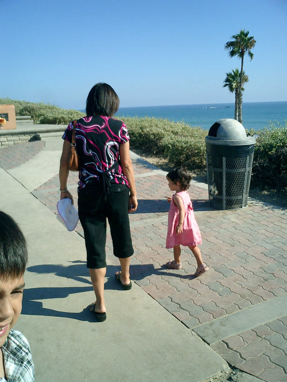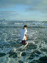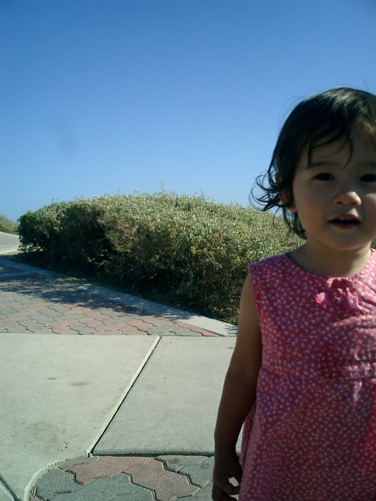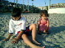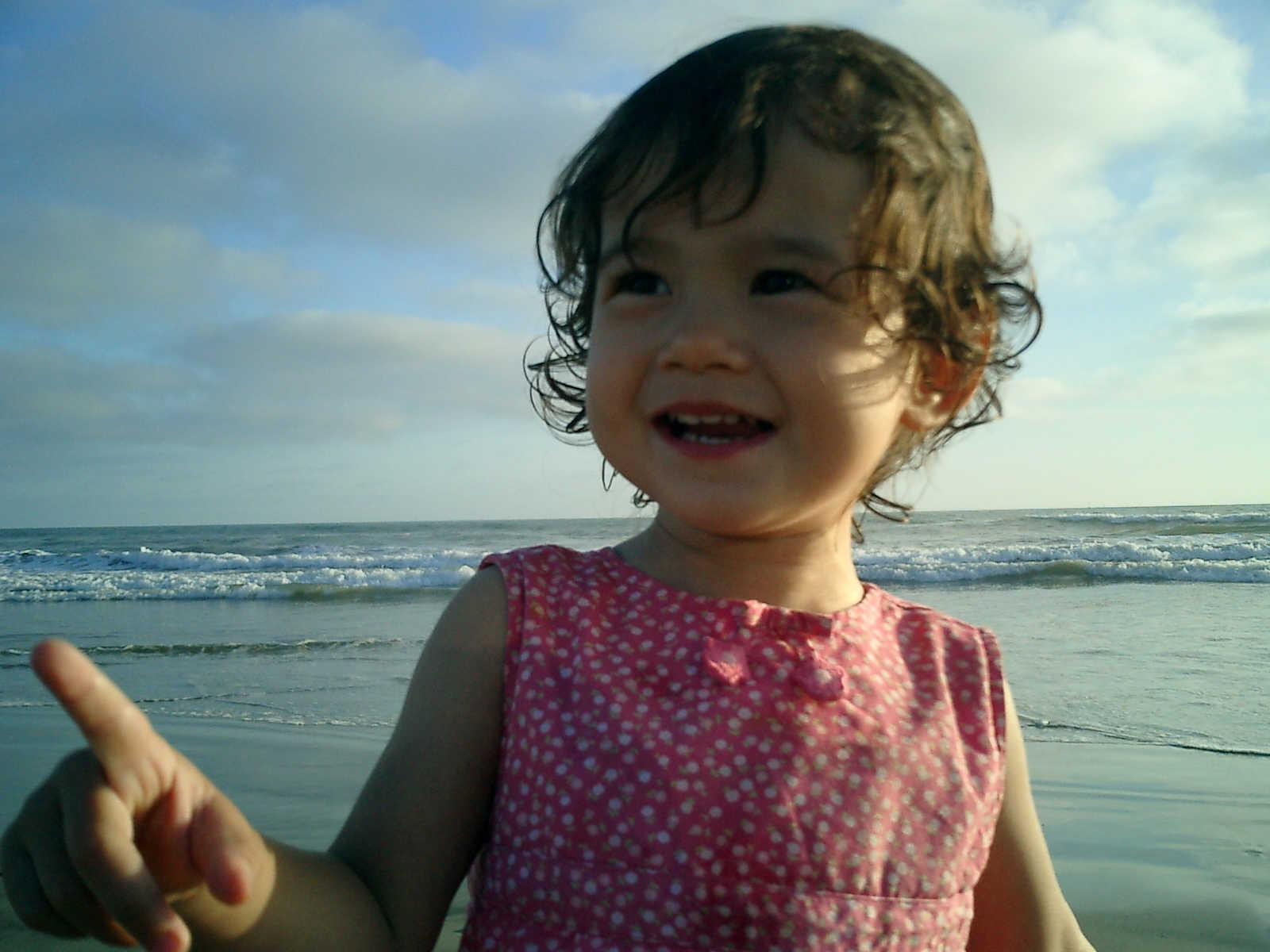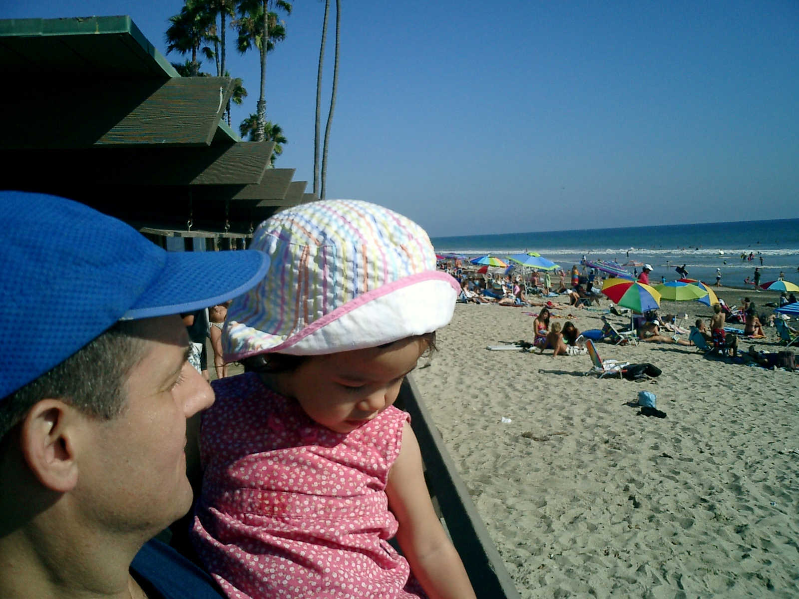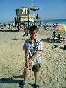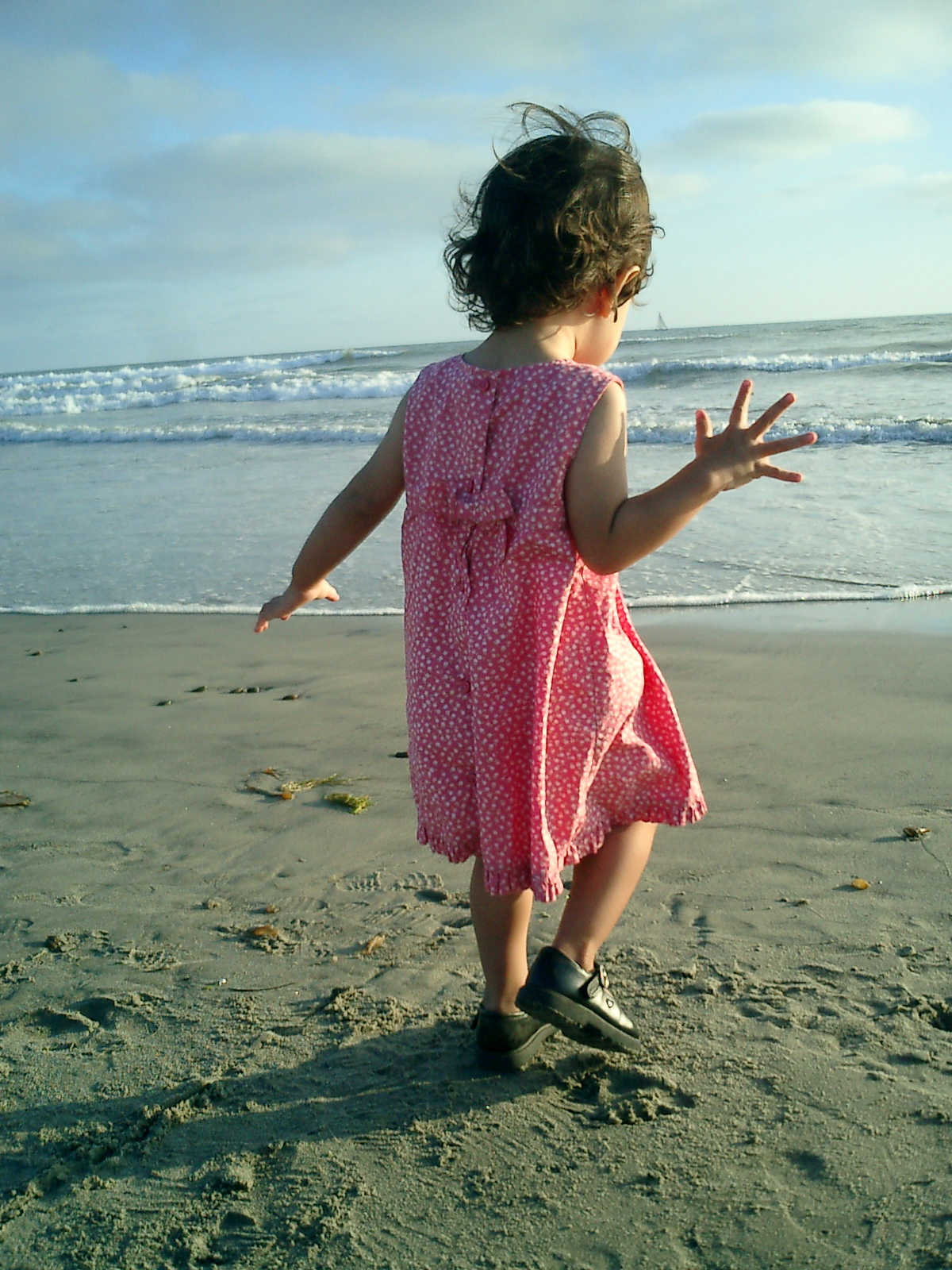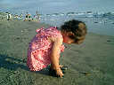 | Nadine at 20 and a half months, (Aug 17, 2008), on day 6 of our San Diego vacation: Visiting Los Angeles, including lunch in Thai Town; driving through the Hollywood Hills and Mulholland Drive ("Home of the stars..."); stopping at San Clemente beach on the way home; then just enought time to go to the Oceanside beach one more time. Nadine, how come you don't like the sand too much? Do you think it is too dirty for a pretty girl like you? (But, you do like to scream "Bubbles!" when you see the waves!) |