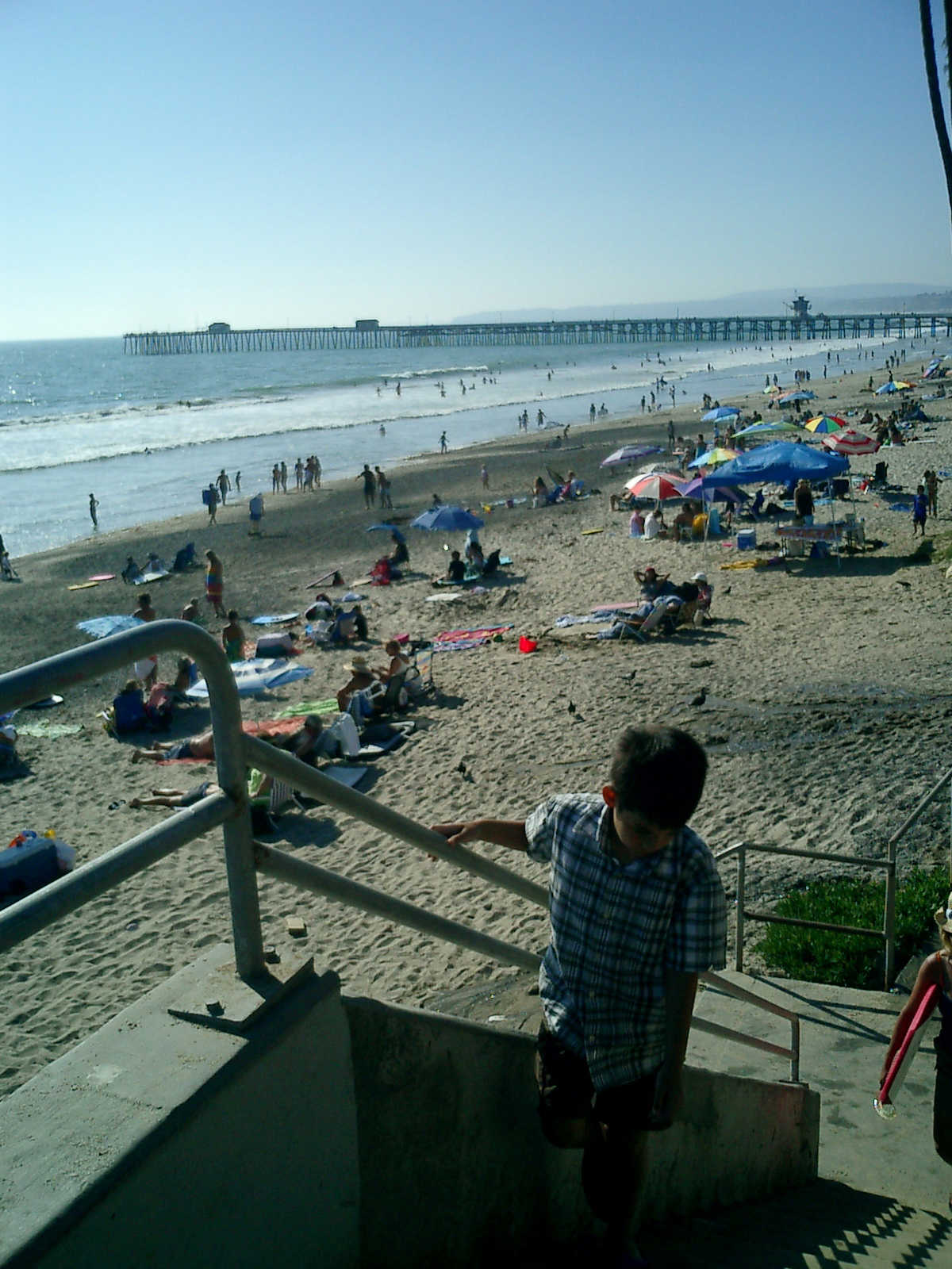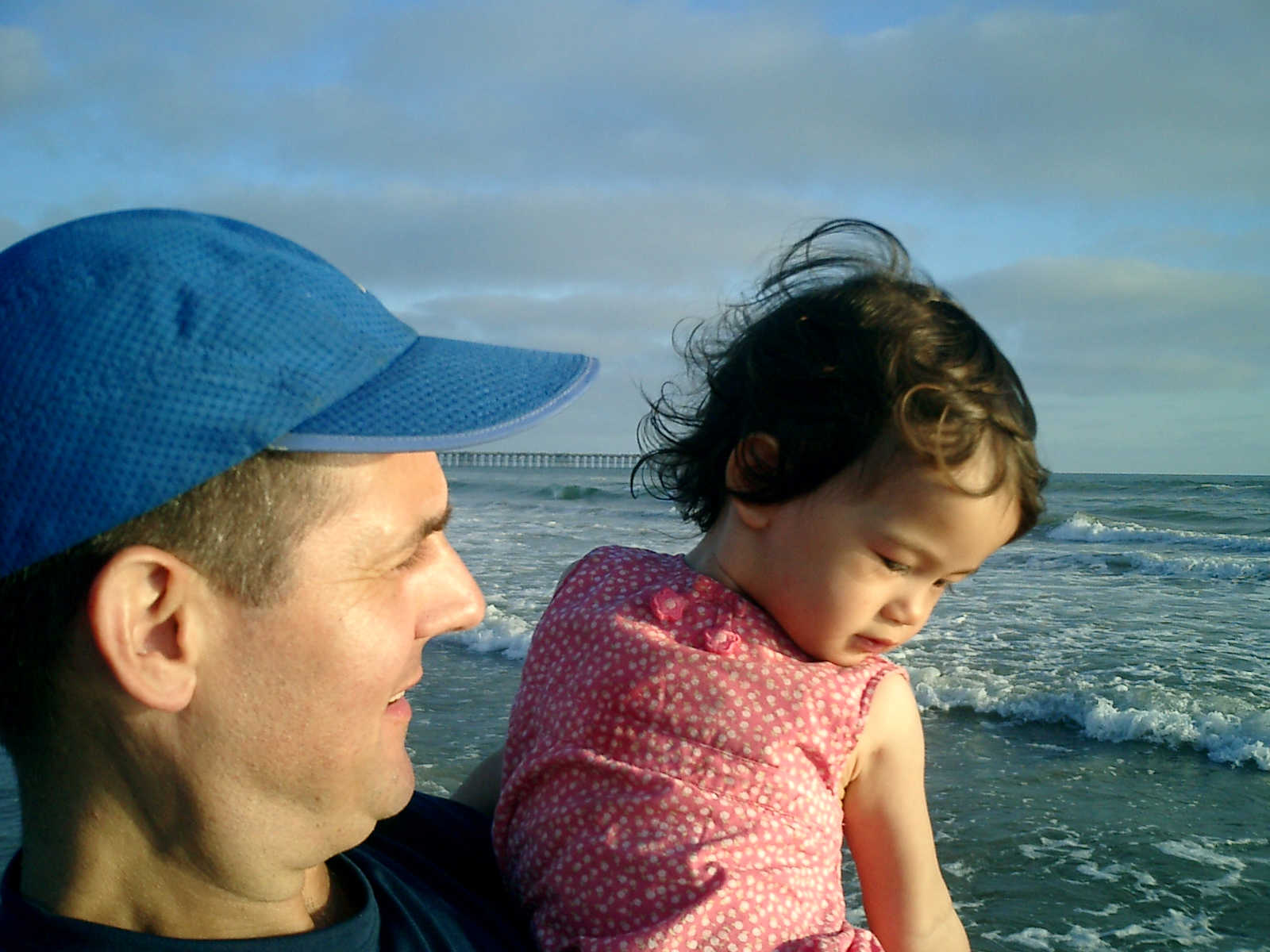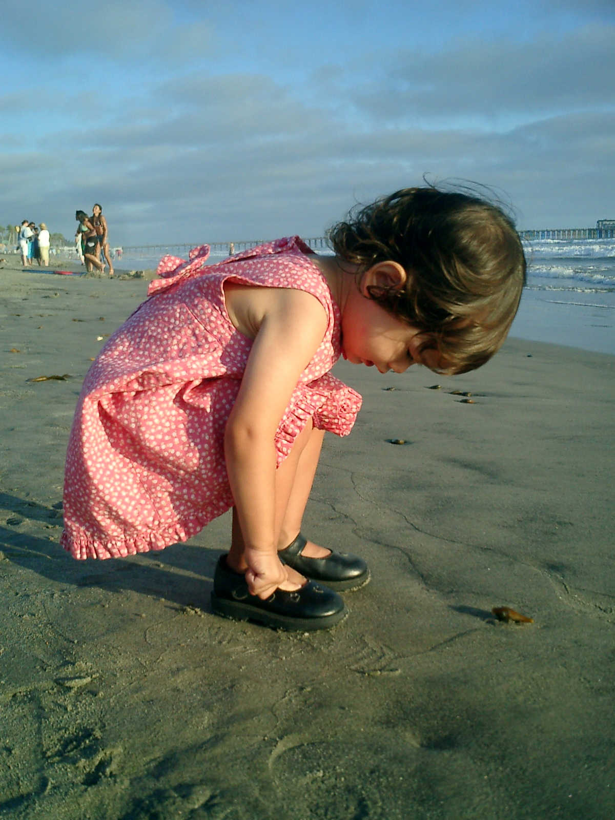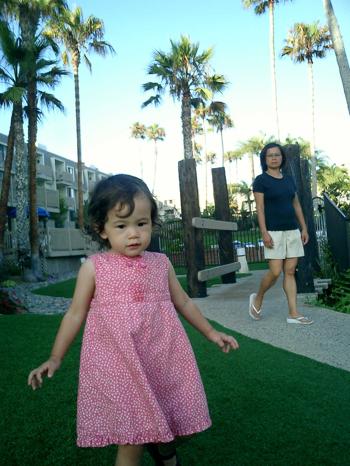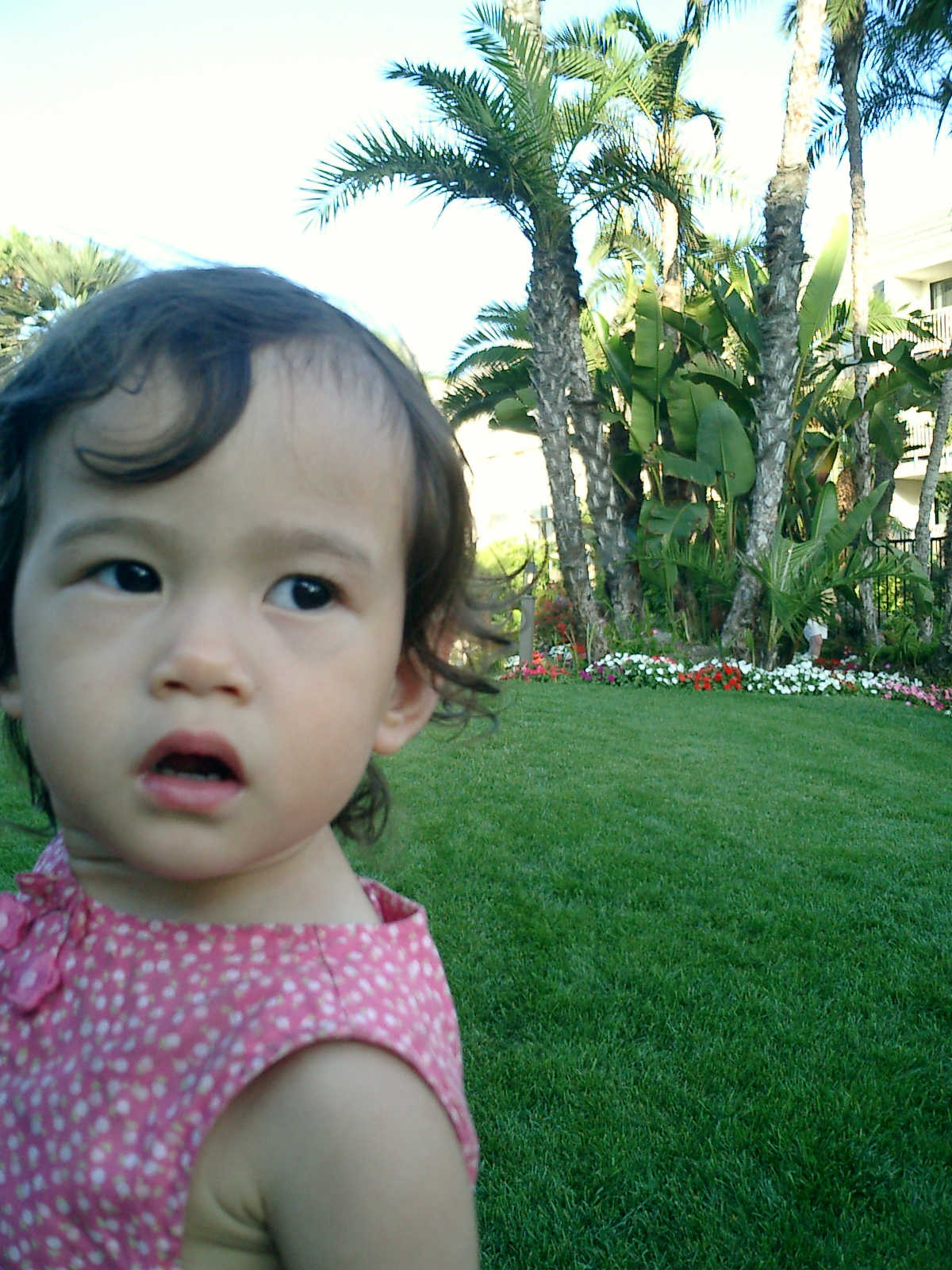 | Nadine at 20 and a half months, (Aug 17, 2008), on day 6 of our San Diego vacation: Visiting Los Angeles, including lunch in Thai Town; driving through the Hollywood Hills and Mulholland Drive ("Home of the stars..."); stopping at San Clemente beach on the way home; then just enought time to go to the Oceanside beach one more time. Nadine, how come you don't like the sand too much? Do you think it is too dirty for a pretty girl like you? (But, you do like to scream "Bubbles!" when you see the waves!) |