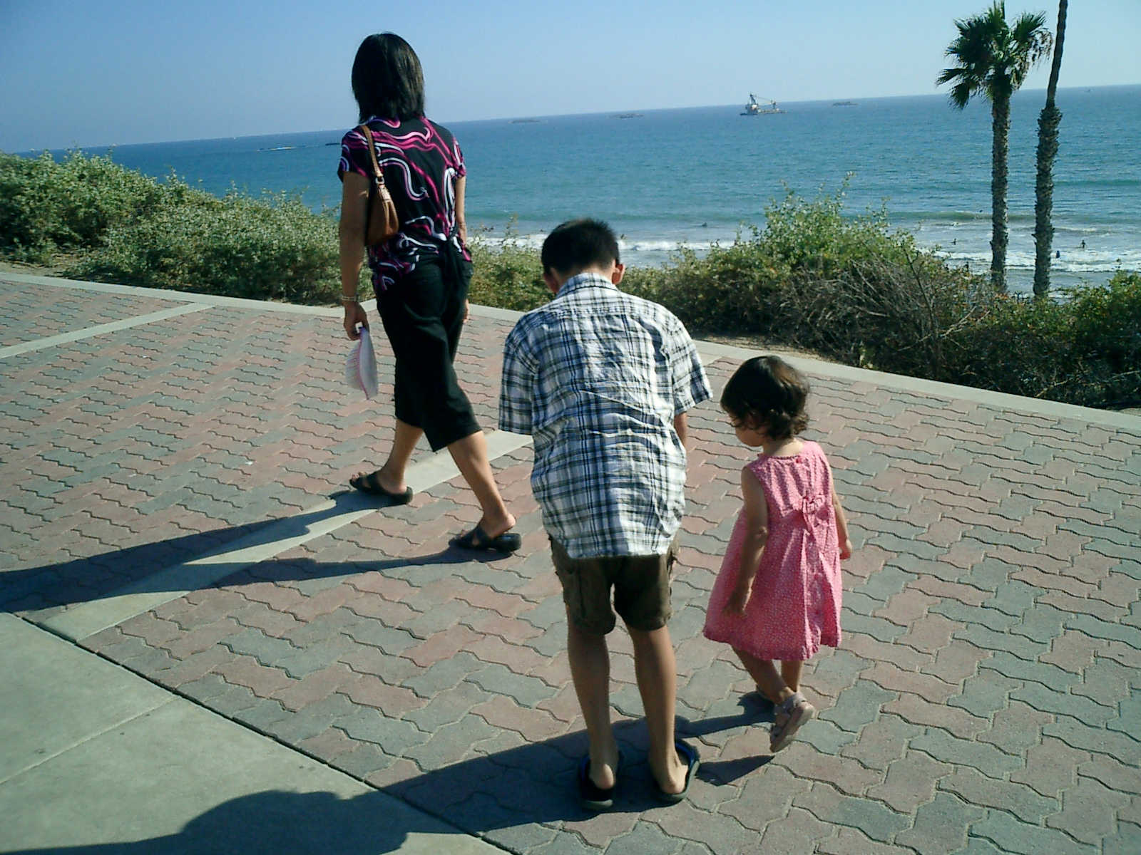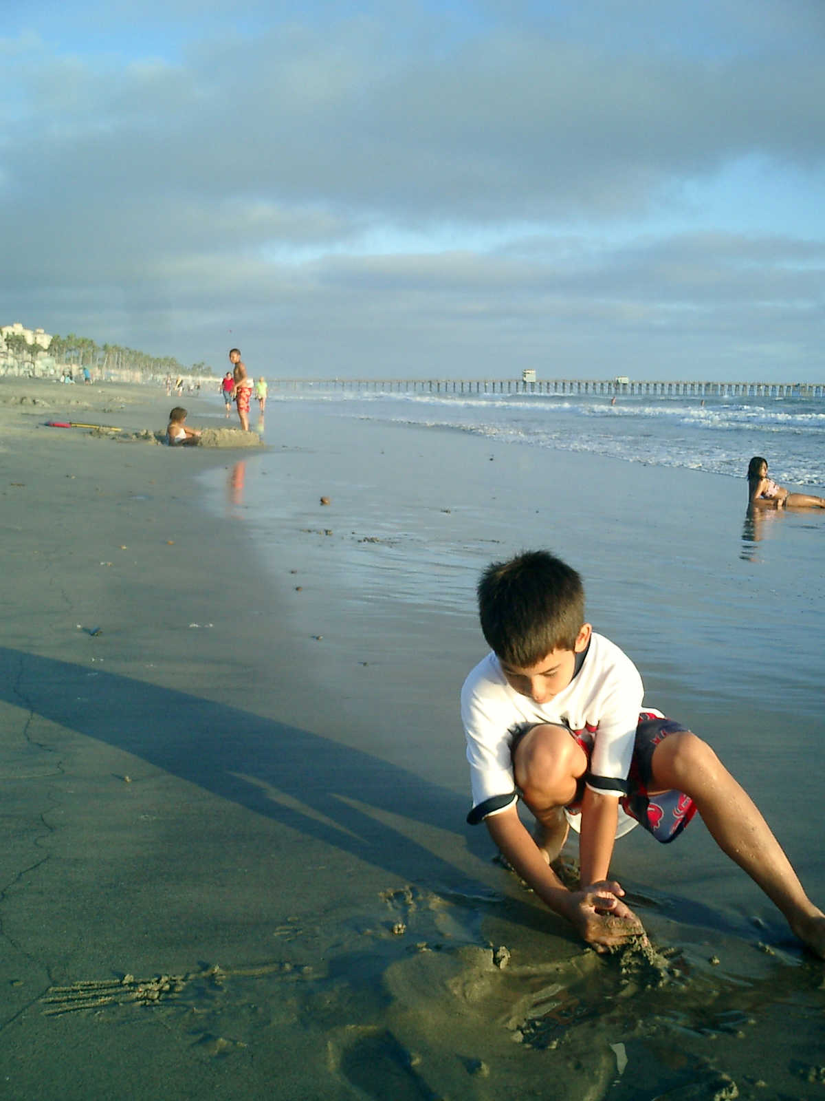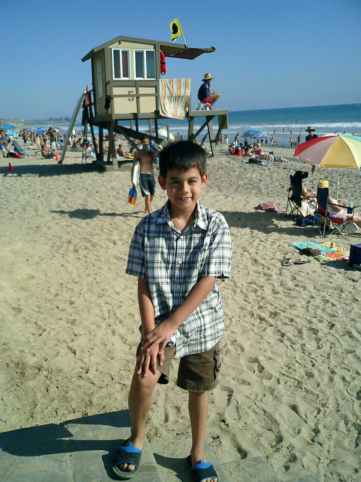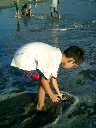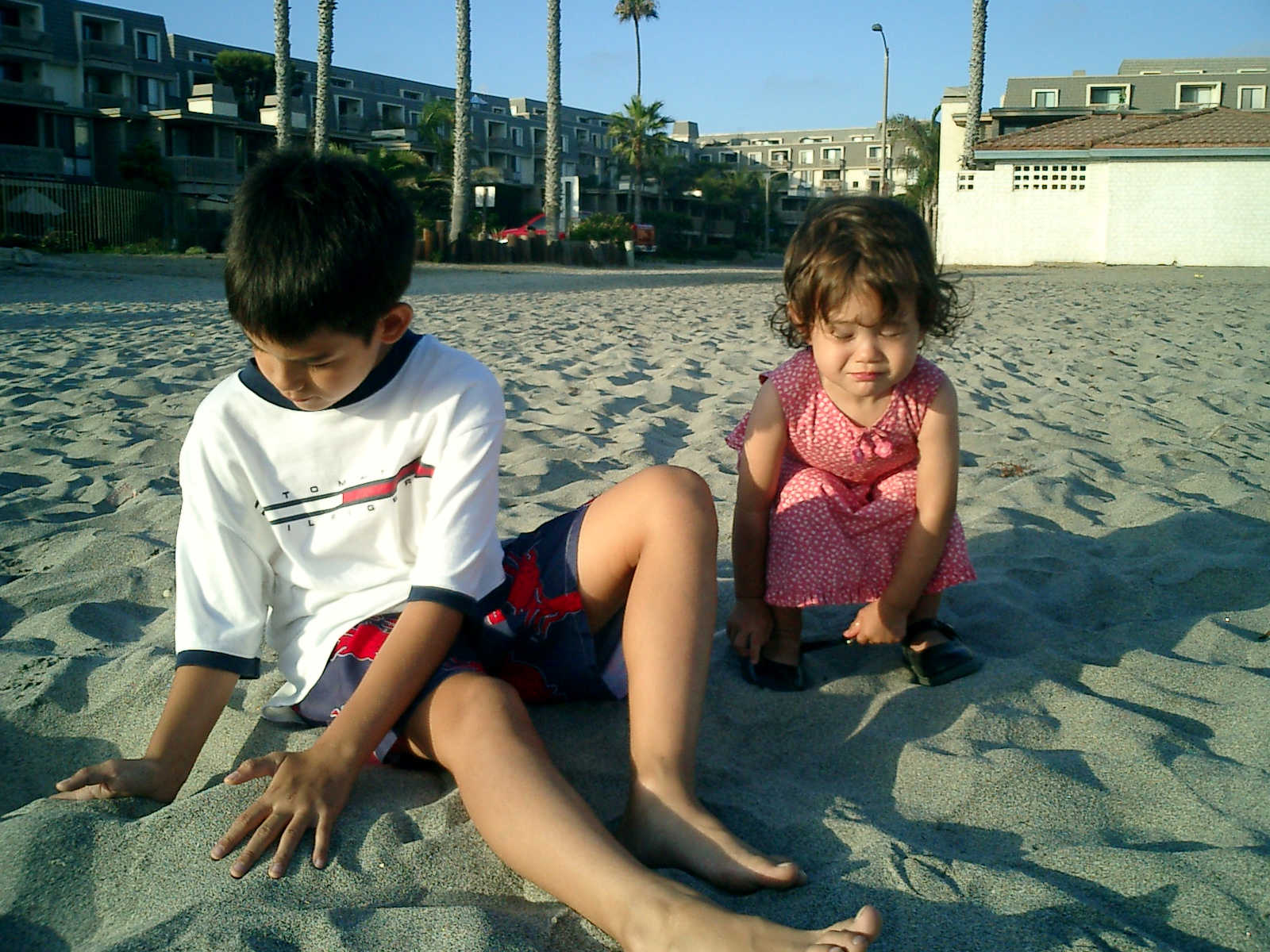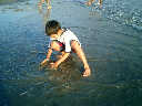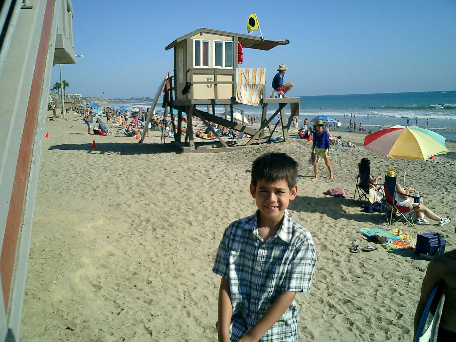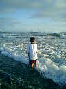 | Nadine at 20 and a half months, (Aug 17, 2008), on day 6 of our San Diego vacation: Visiting Los Angeles, including lunch in Thai Town; driving through the Hollywood Hills and Mulholland Drive ("Home of the stars..."); stopping at San Clemente beach on the way home; then just enought time to go to the Oceanside beach one more time. Nadine, how come you don't like the sand too much? Do you think it is too dirty for a pretty girl like you? (But, you do like to scream "Bubbles!" when you see the waves!) |
