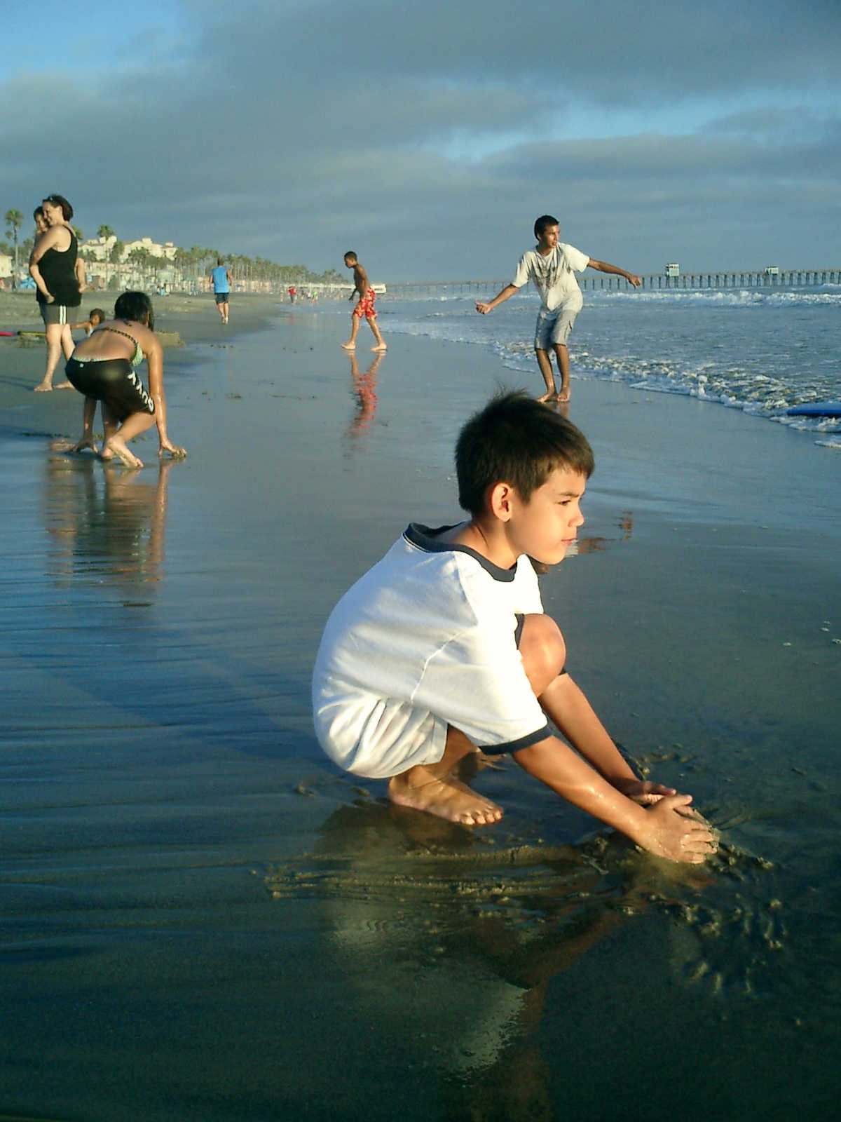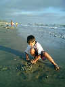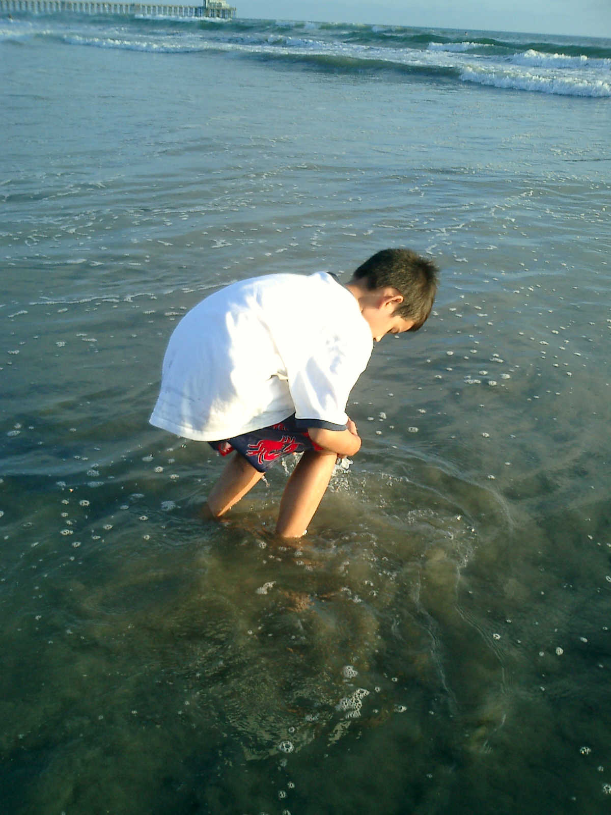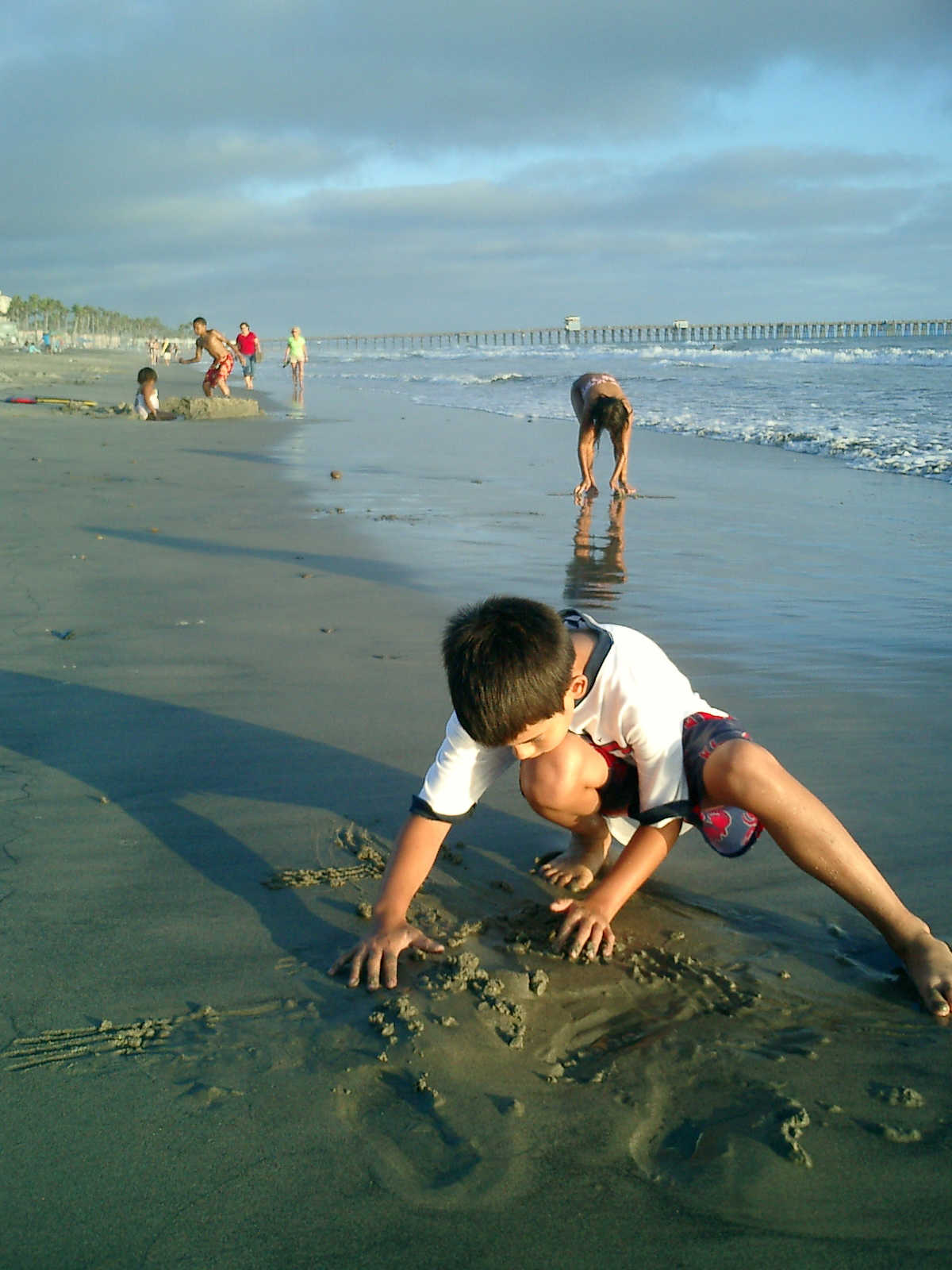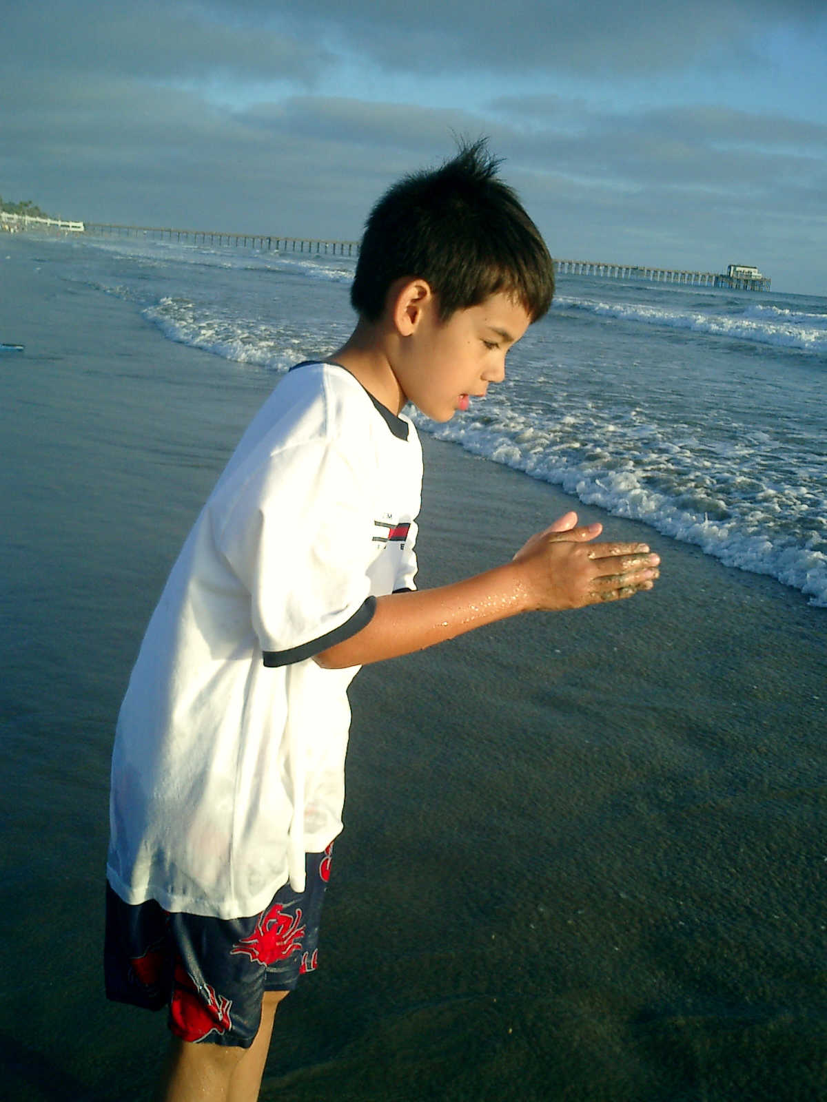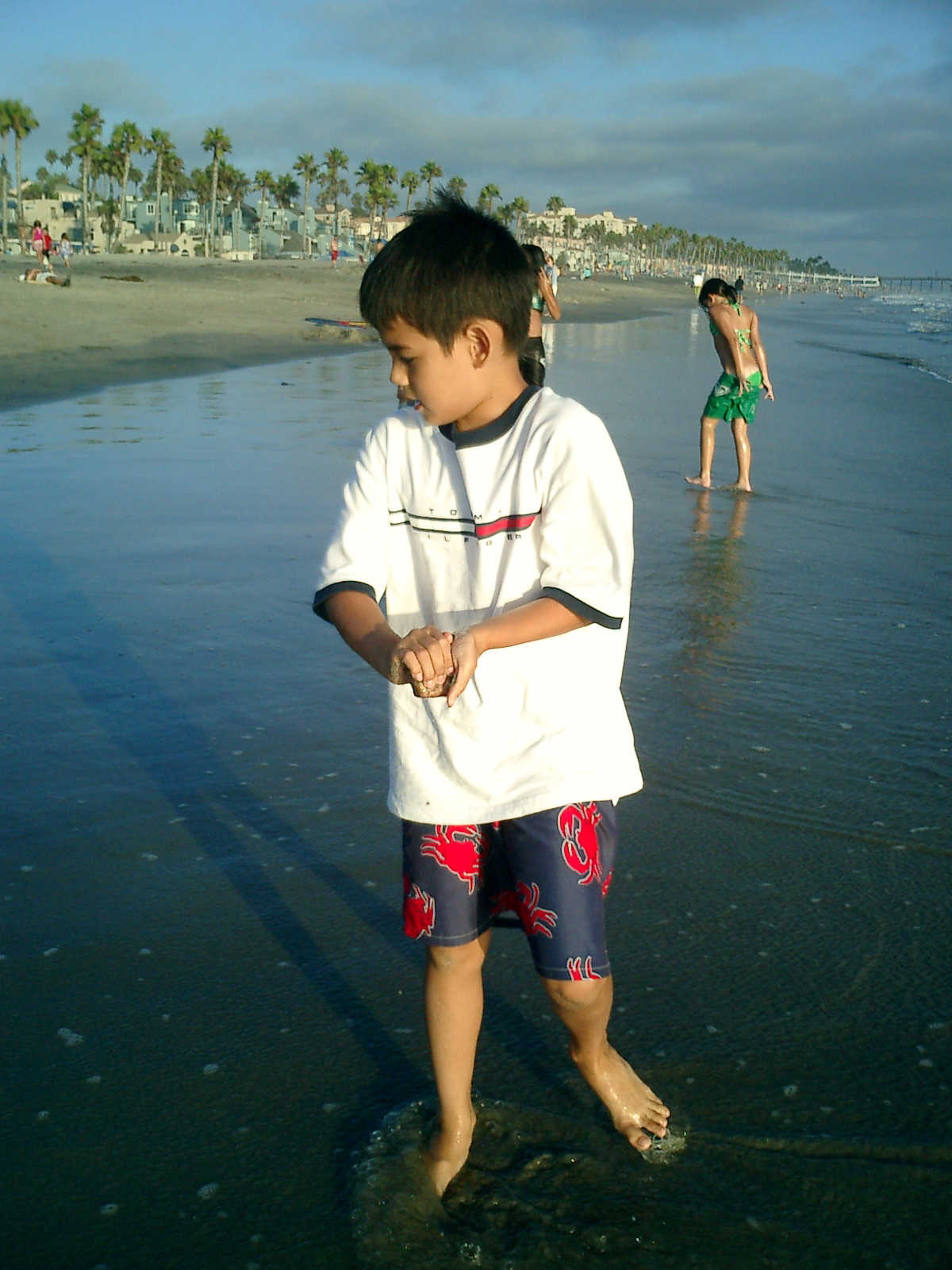 | Nadine at 20 and a half months, (Aug 17, 2008), on day 6 of our San Diego vacation: Visiting Los Angeles, including lunch in Thai Town; driving through the Hollywood Hills and Mulholland Drive ("Home of the stars..."); stopping at San Clemente beach on the way home; then just enought time to go to the Oceanside beach one more time. Nadine, how come you don't like the sand too much? Do you think it is too dirty for a pretty girl like you? (But, you do like to scream "Bubbles!" when you see the waves!) |