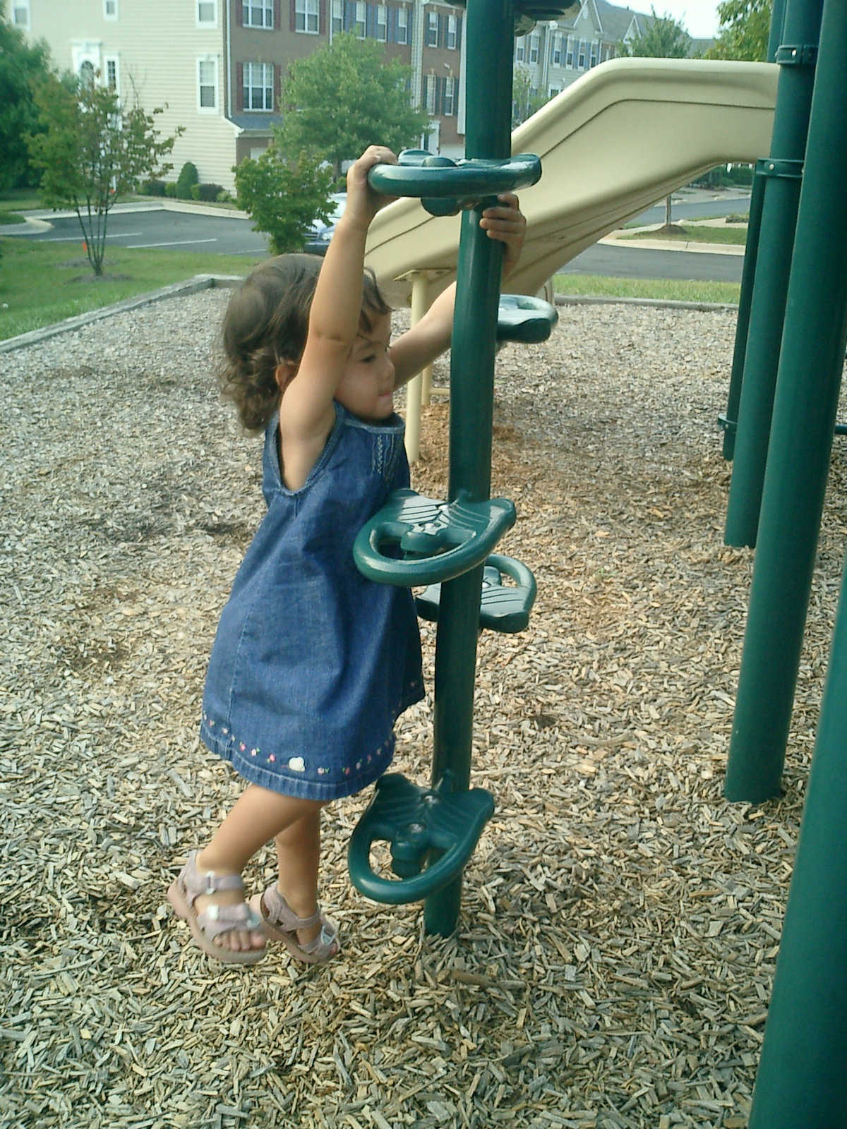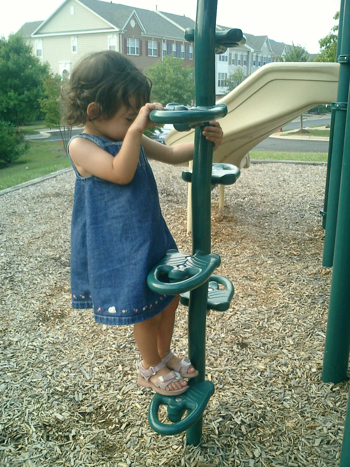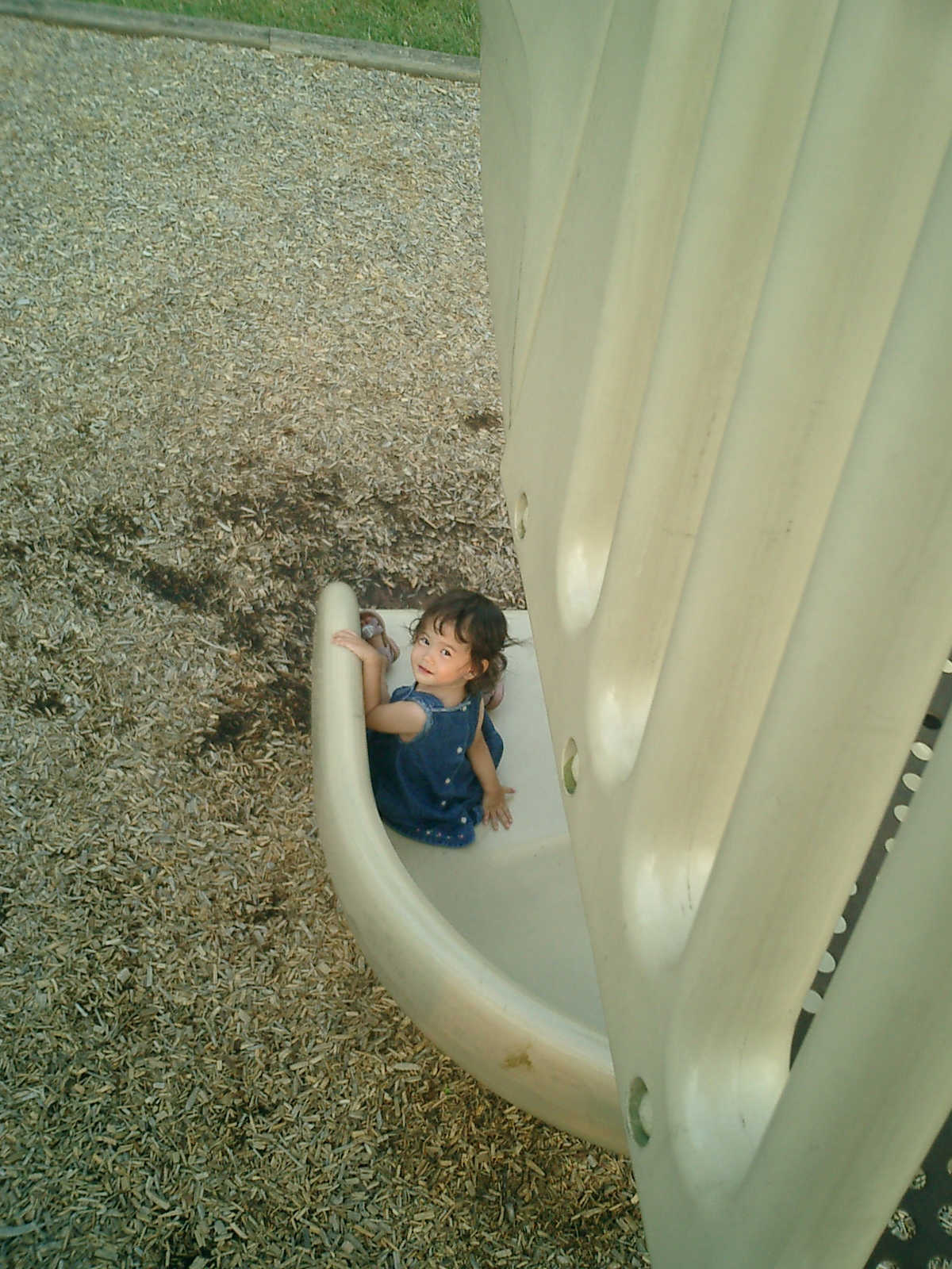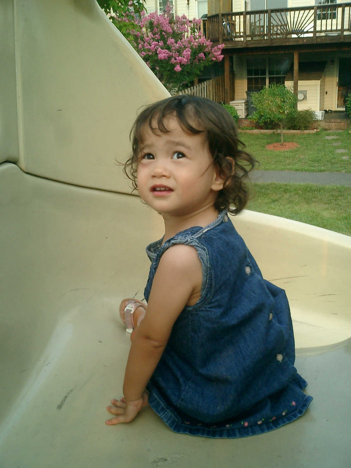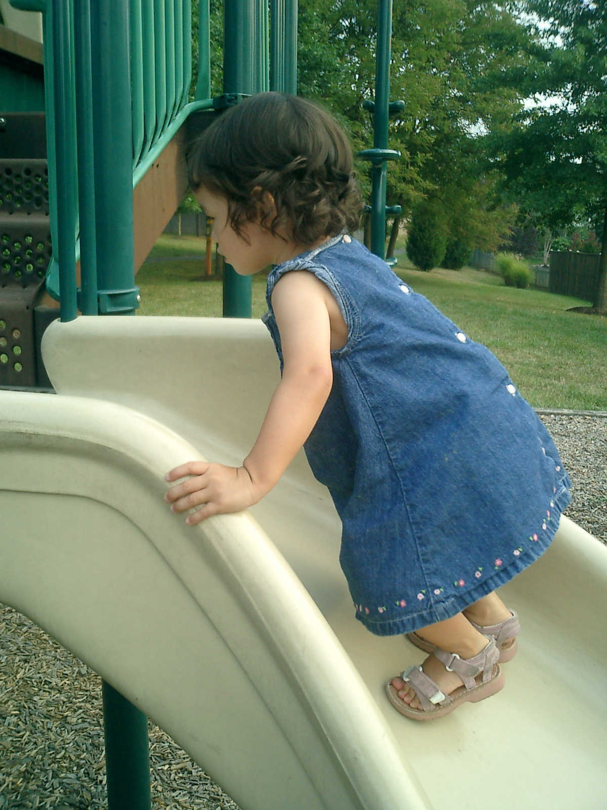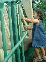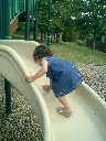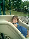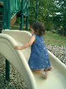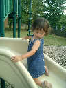 Nadine at 21 months (August 30, 2008), taking a stroll with Daddy to the playground behind the house. Nadine, you sure are brave going down that slide!