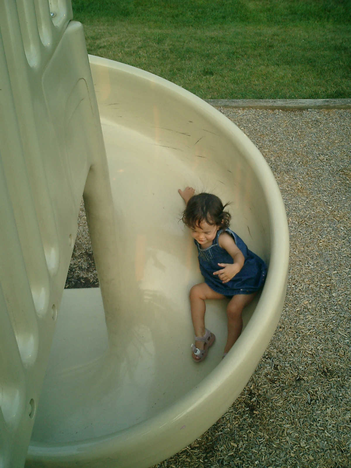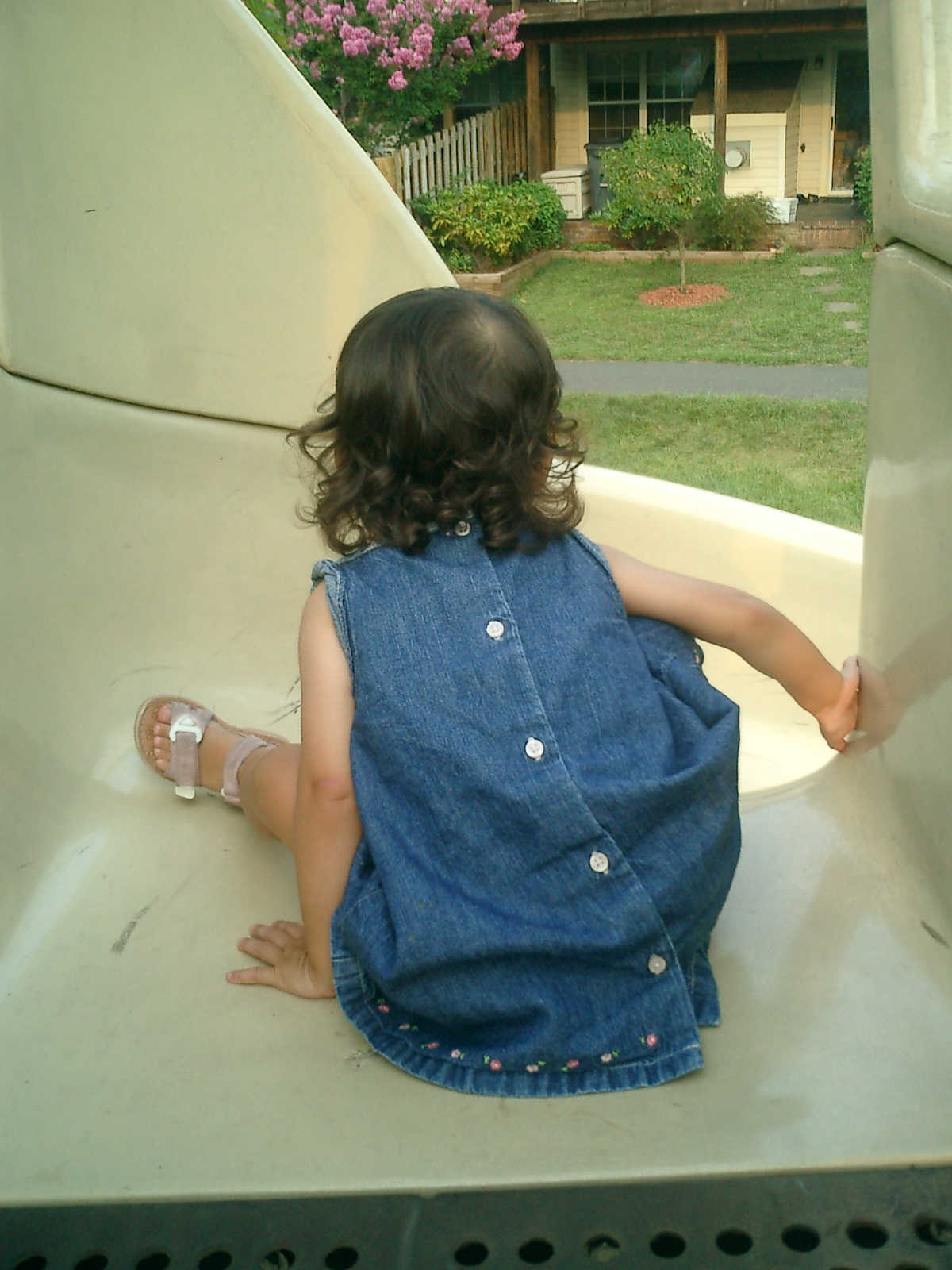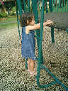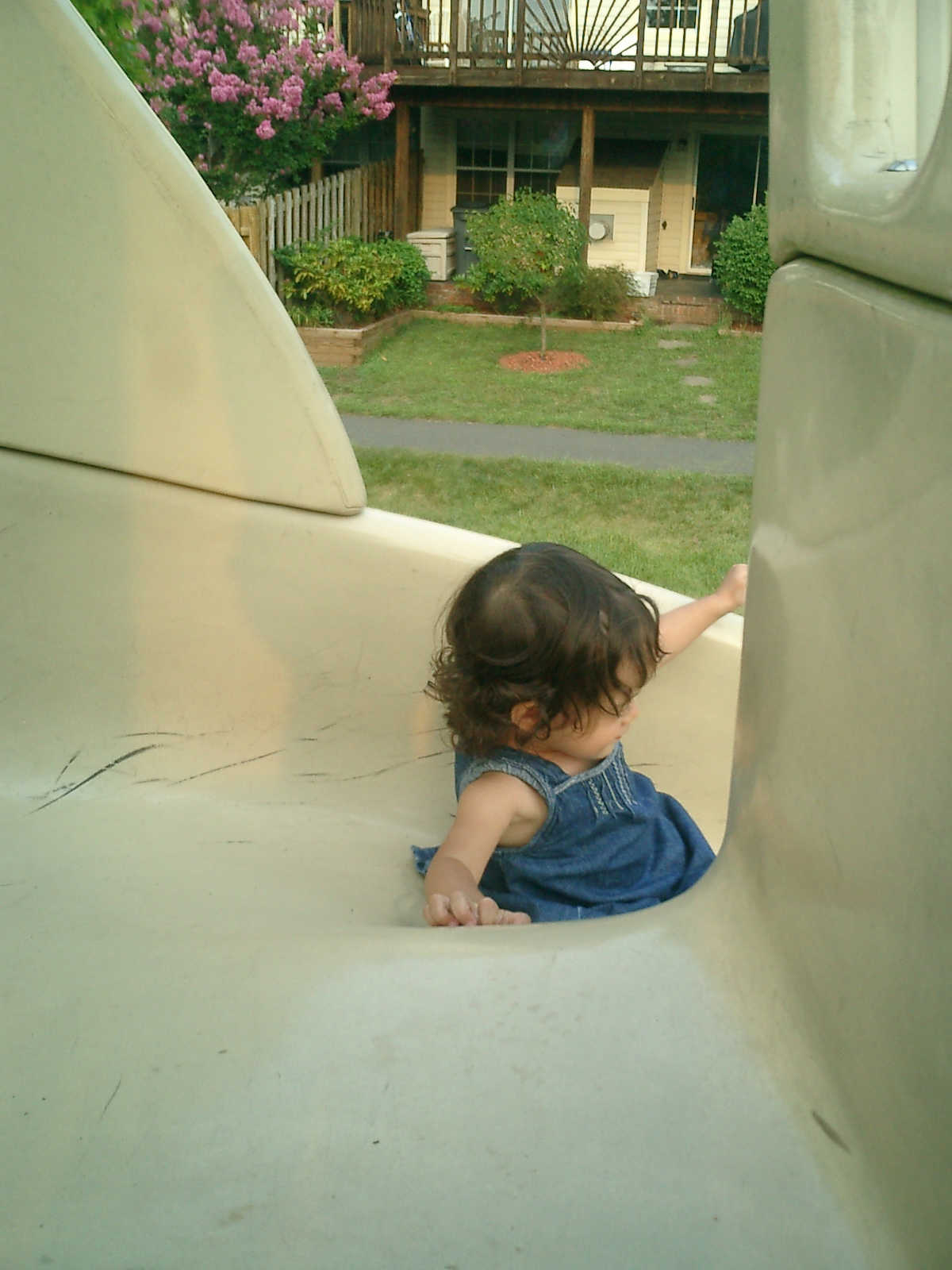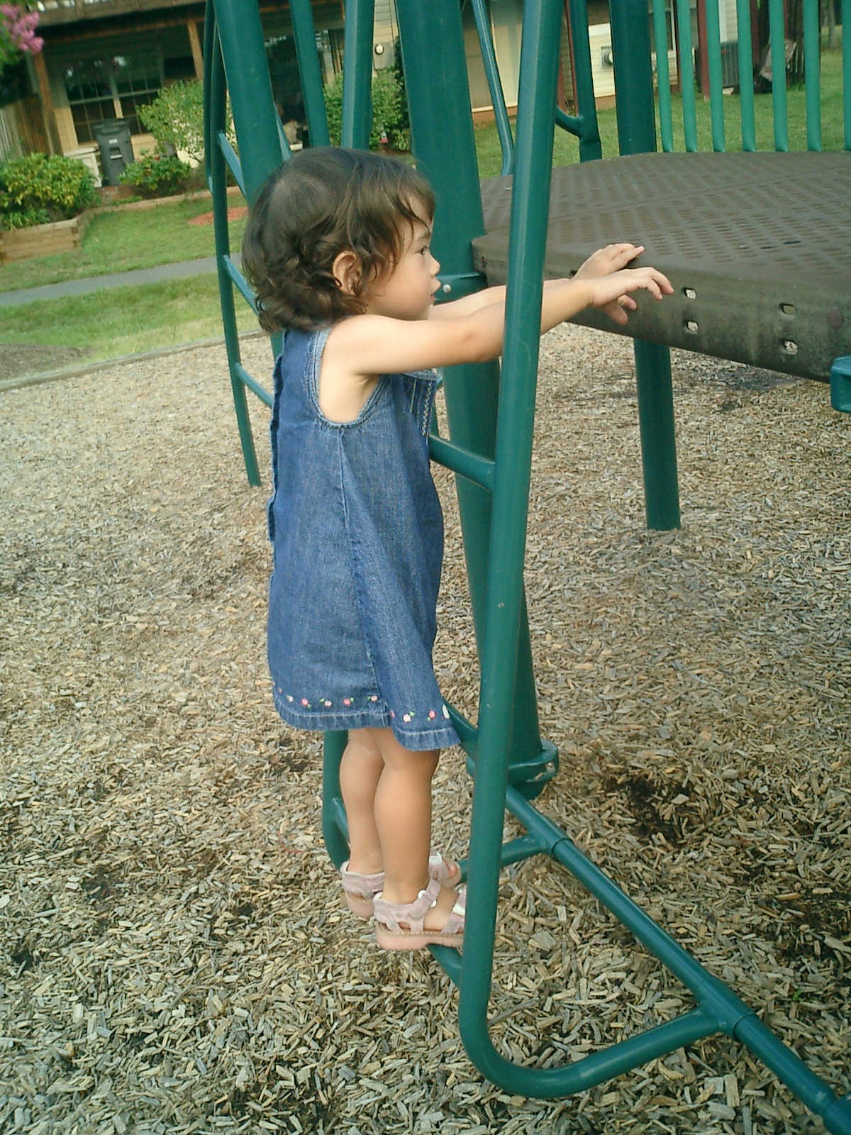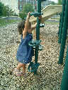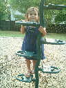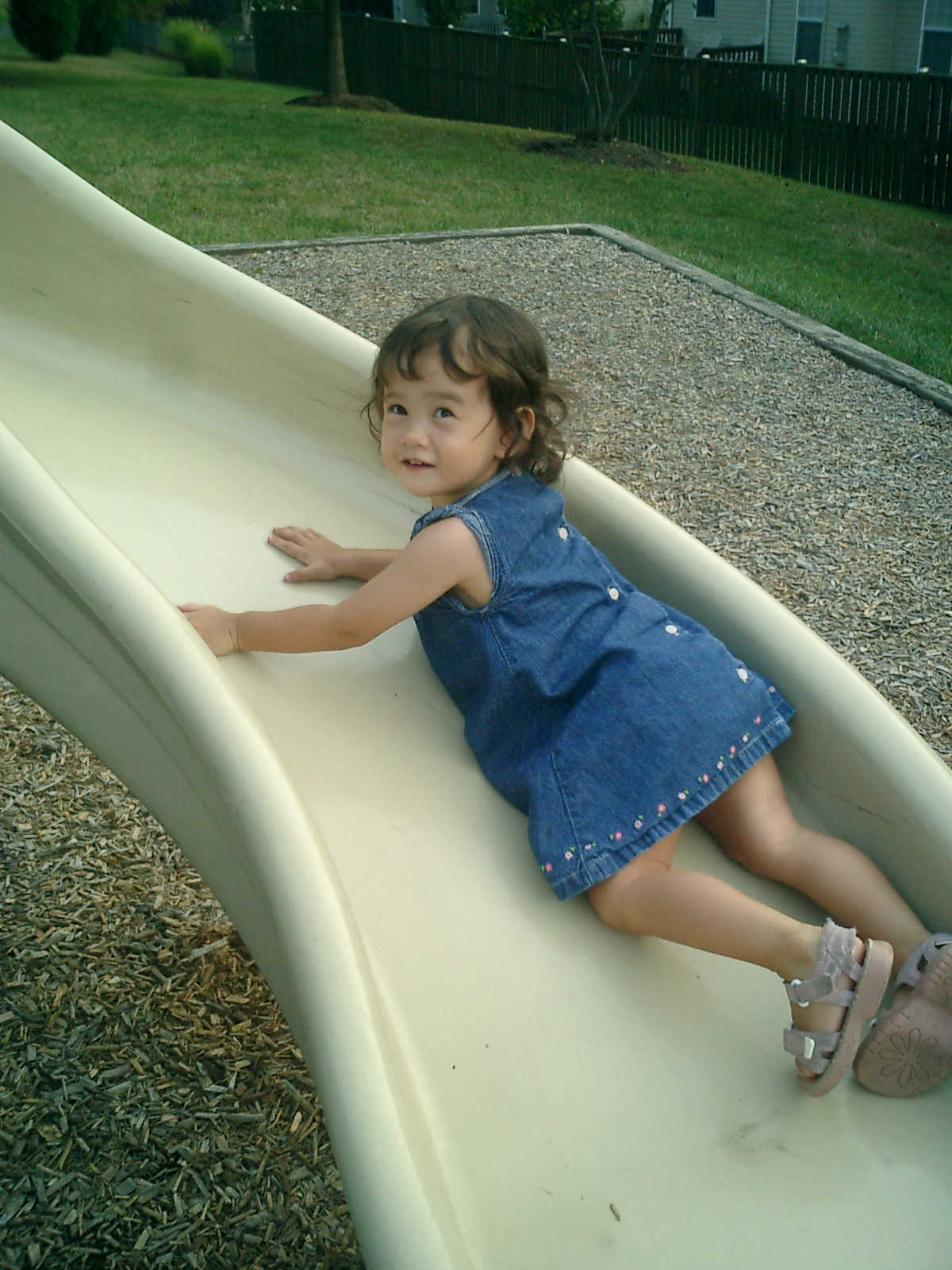 Nadine at 21 months (August 30, 2008), taking a stroll with Daddy to the playground behind the house. Nadine, you sure are brave going down that slide!