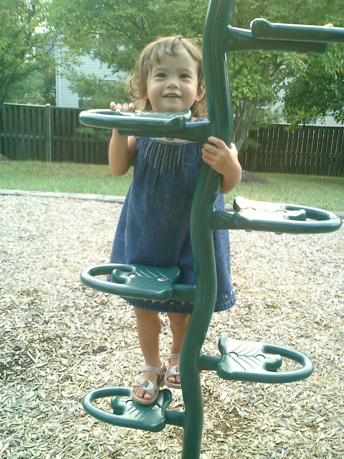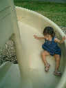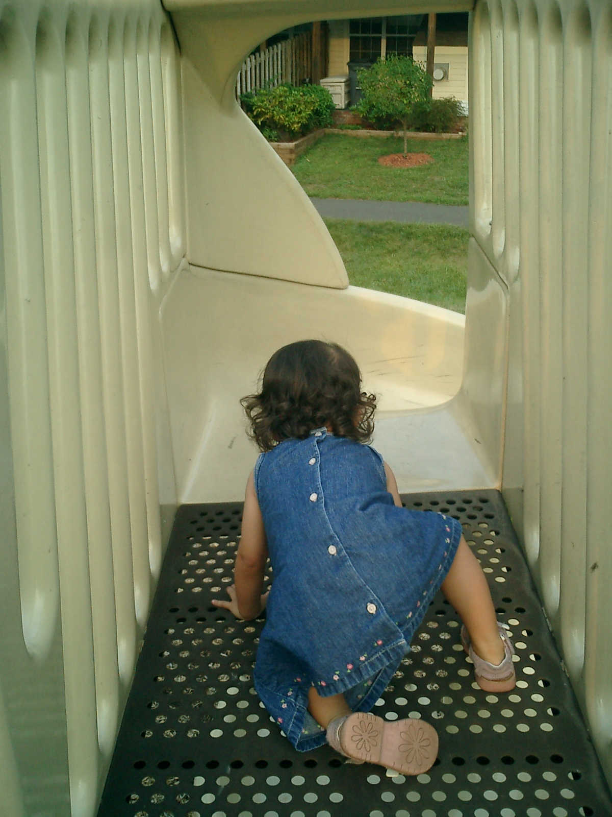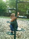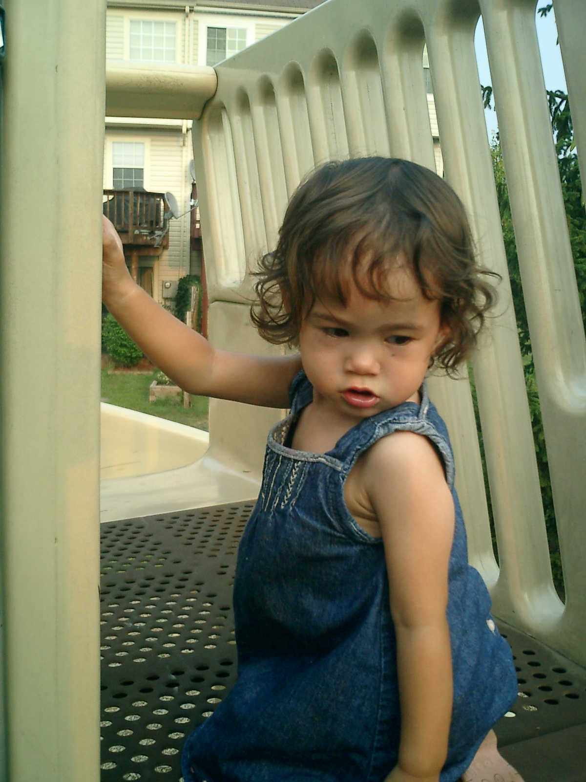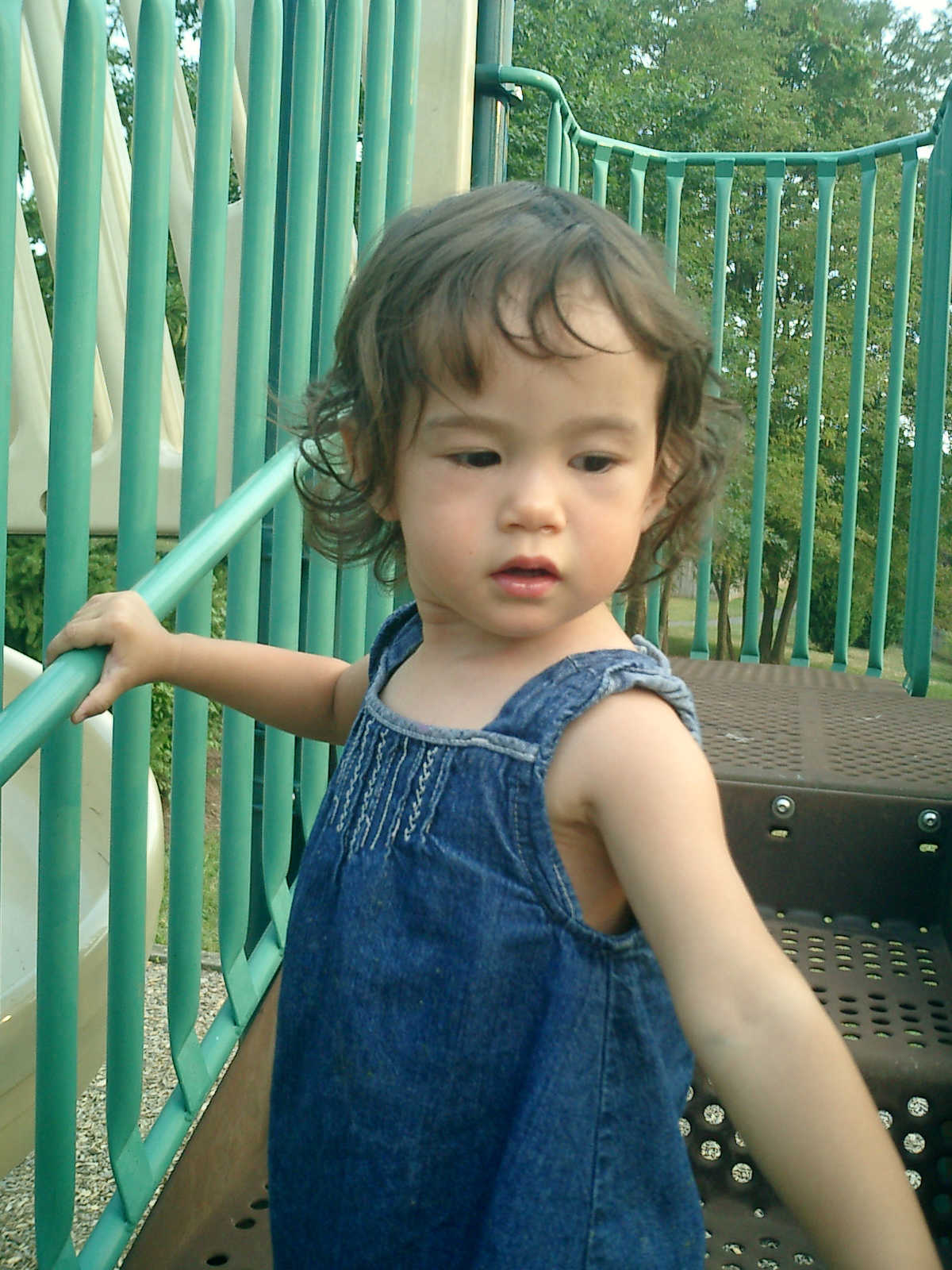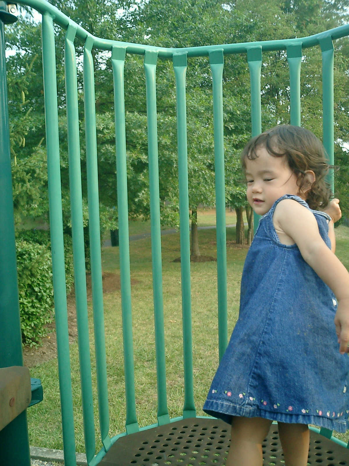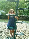 Nadine at 21 months (August 30, 2008), taking a stroll with Daddy to the playground behind the house. Nadine, you sure are brave going down that slide!