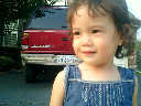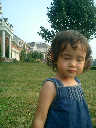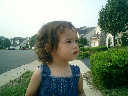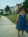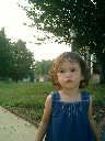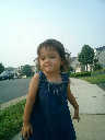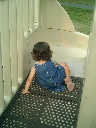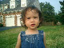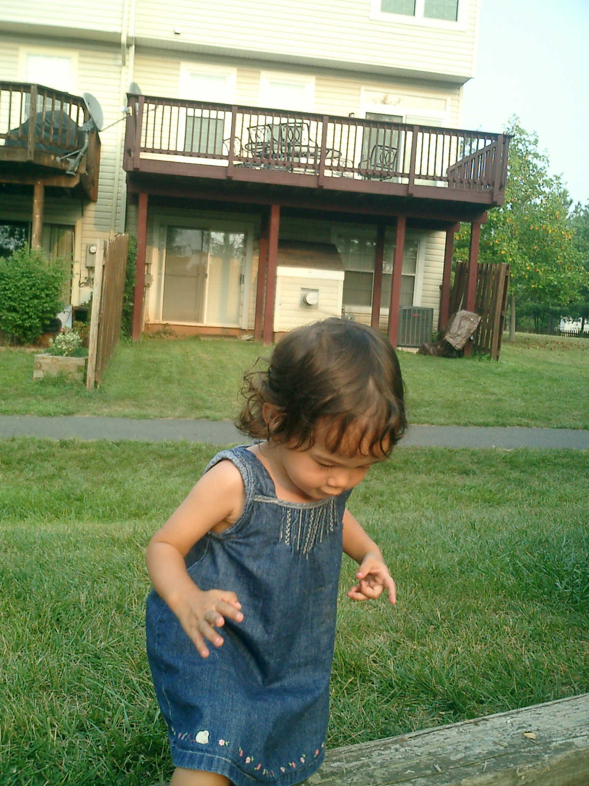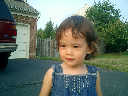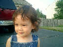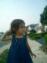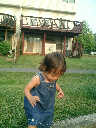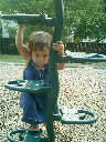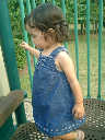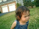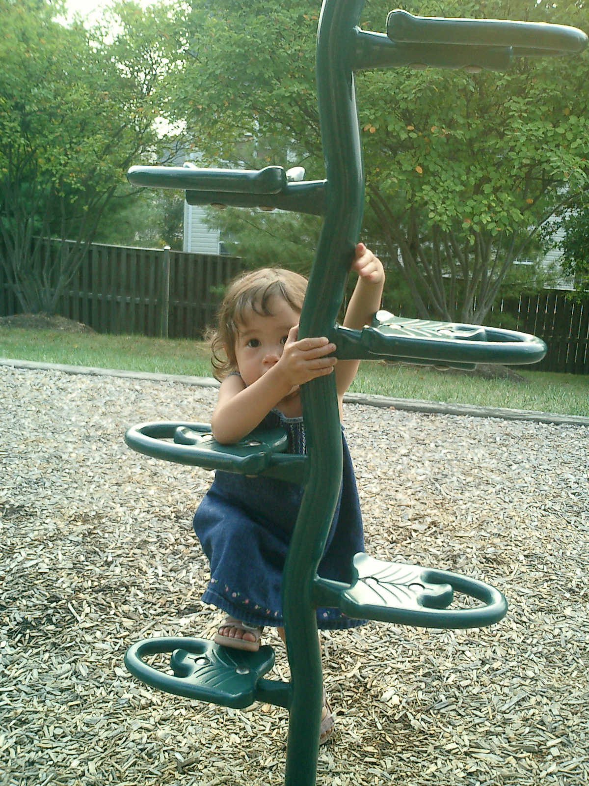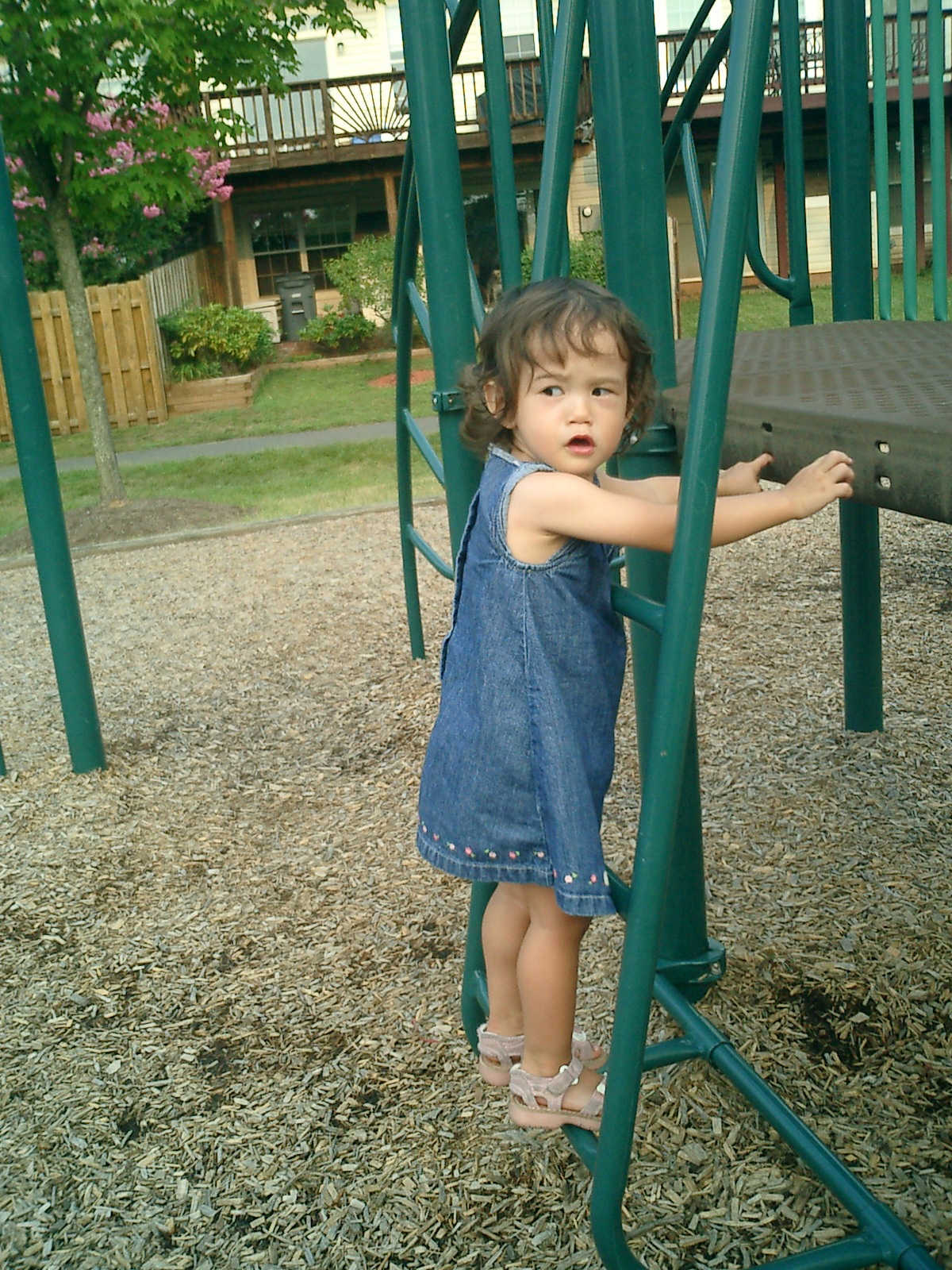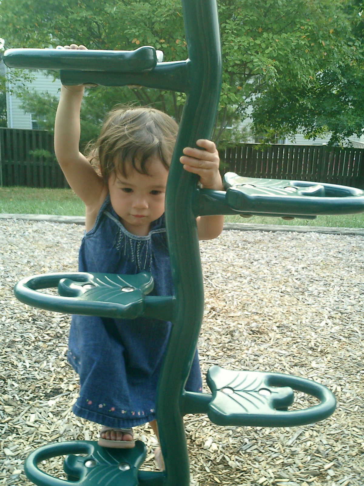 Nadine at 21 months (August 30, 2008), taking a stroll with Daddy to the playground behind the house. Nadine, you sure are brave going down that slide!