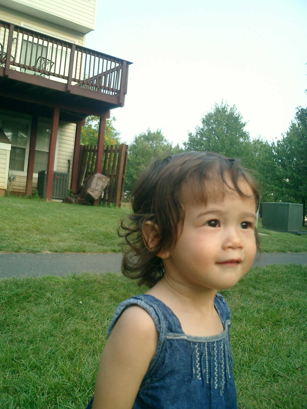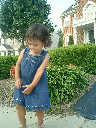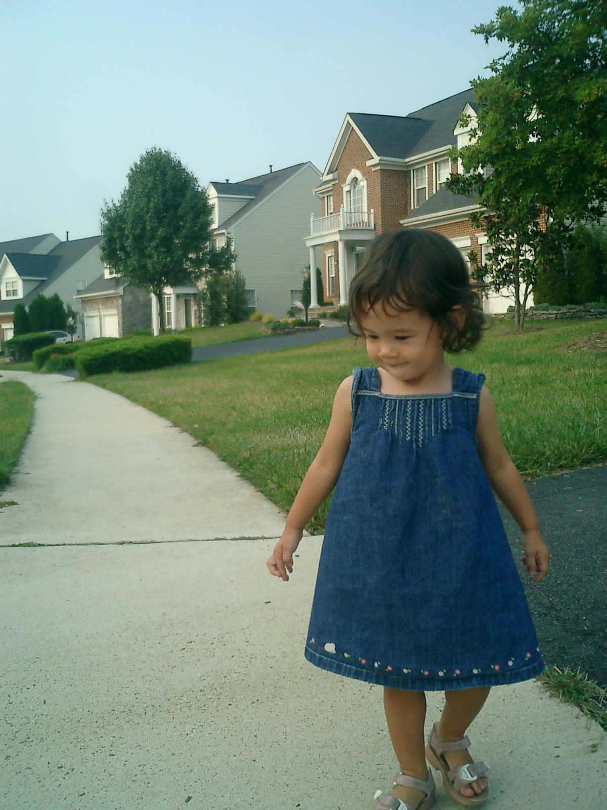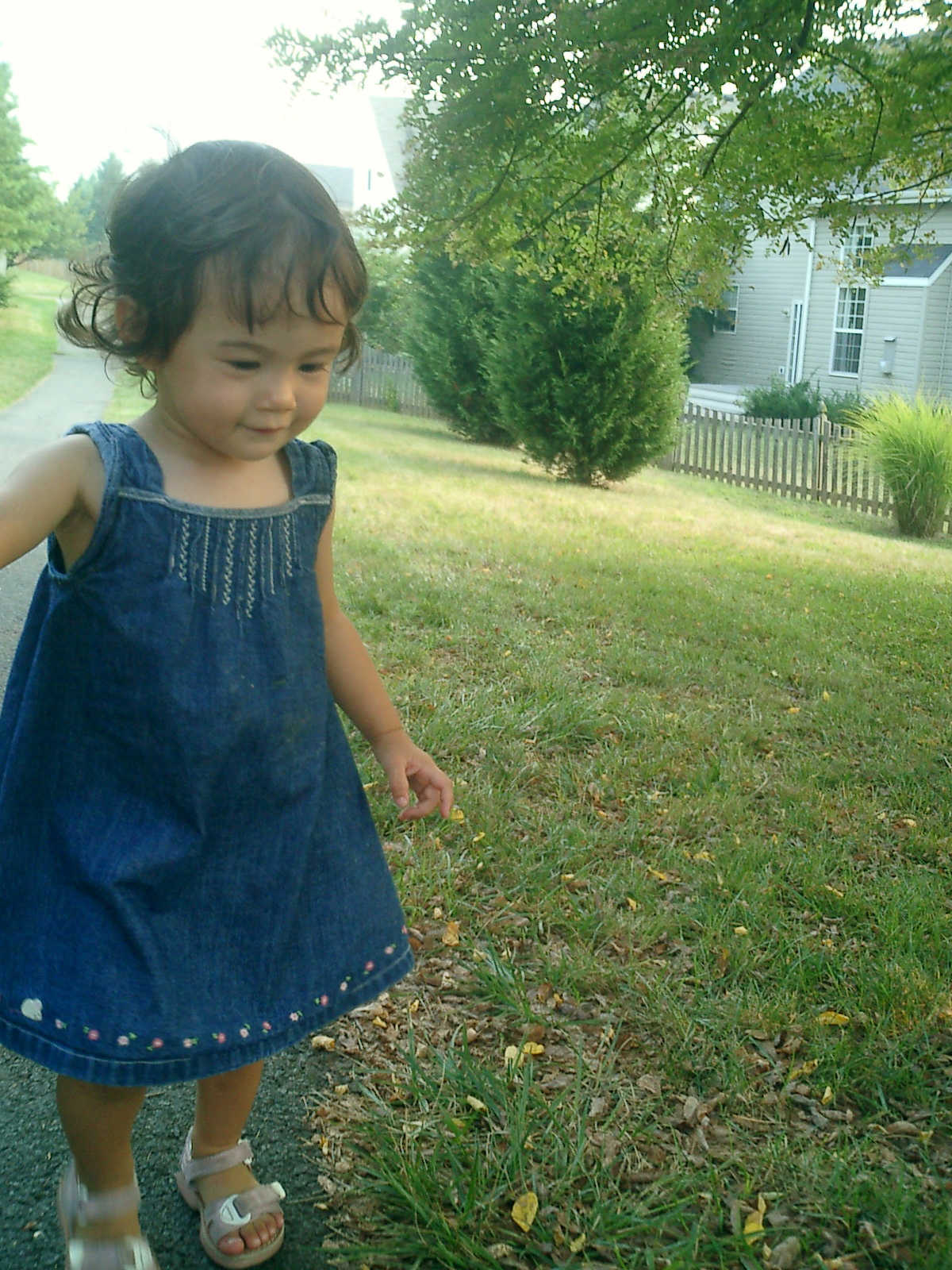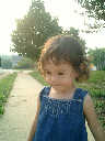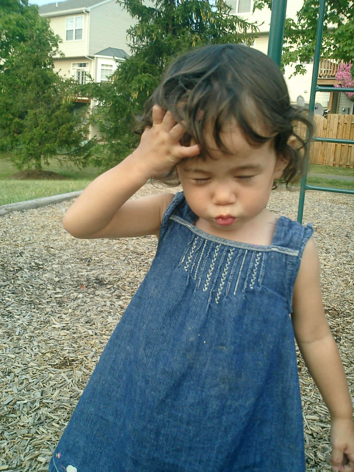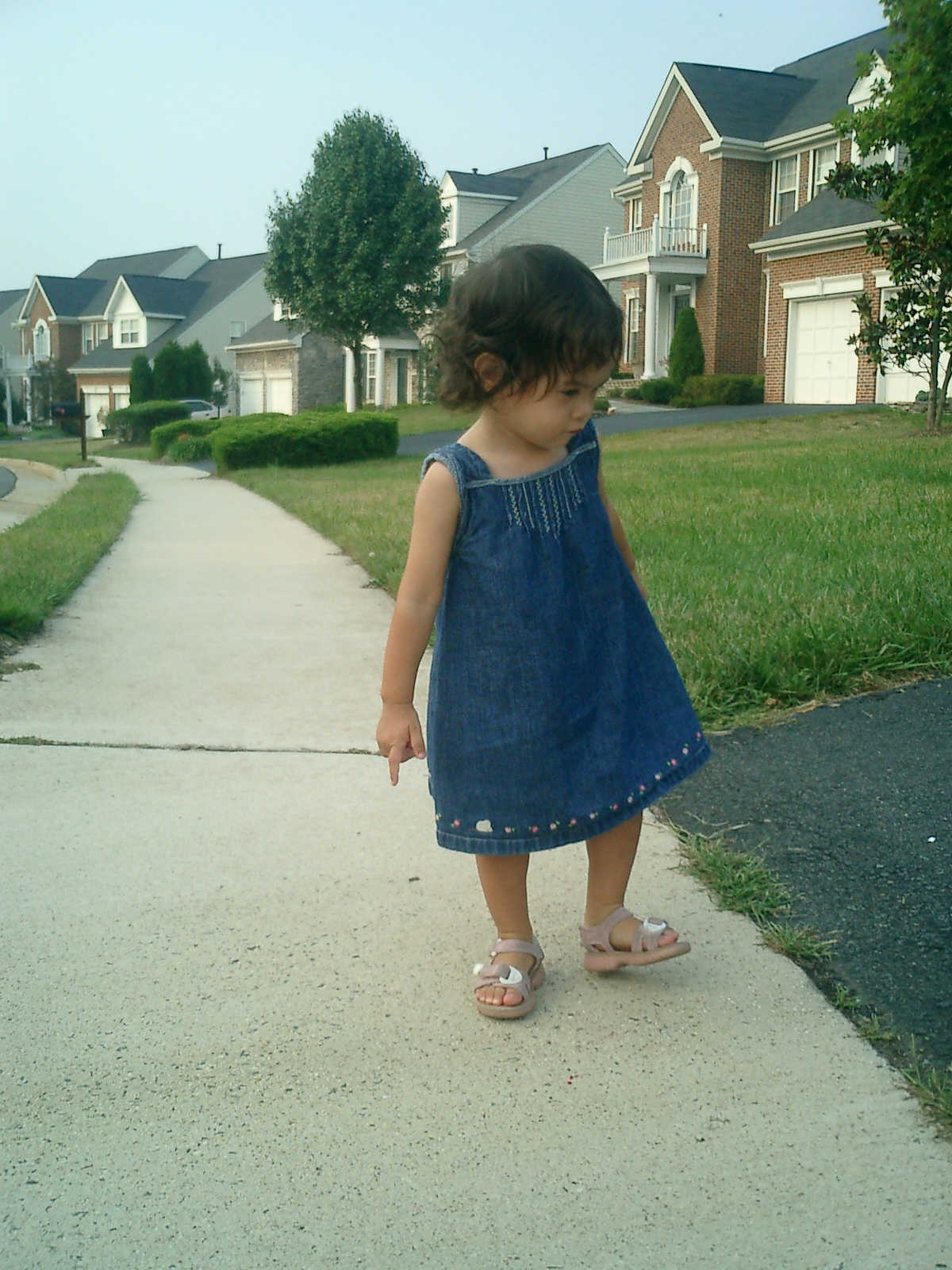Nadine at 21 months (August 30, 2008), taking a stroll with Daddy to the playground behind the house. Nadine, you sure are brave going down that slide!