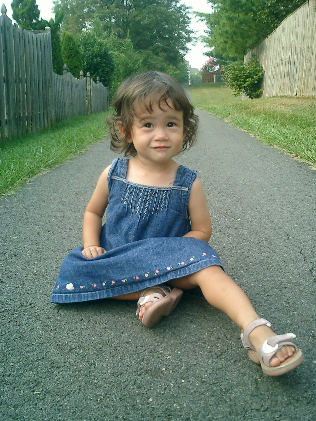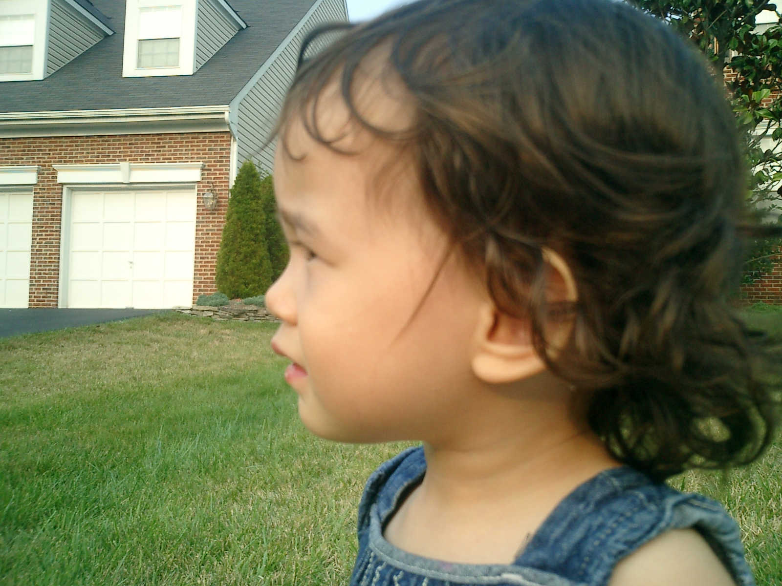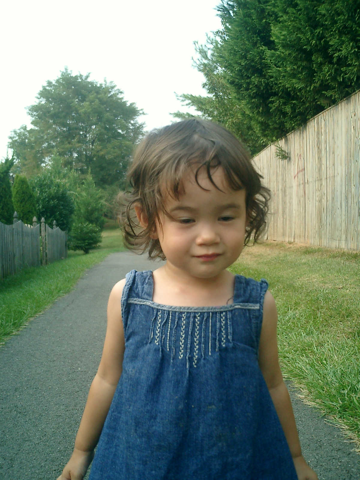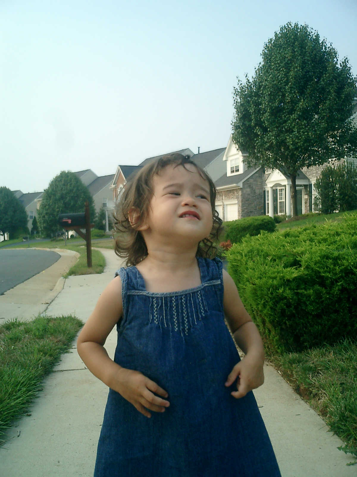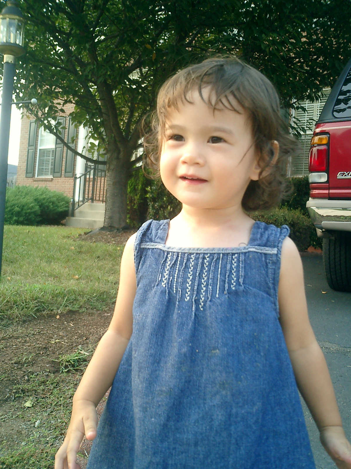 Nadine at 21 months (August 30, 2008), taking a stroll with Daddy to the playground behind the house. Nadine, you sure are brave going down that slide!
