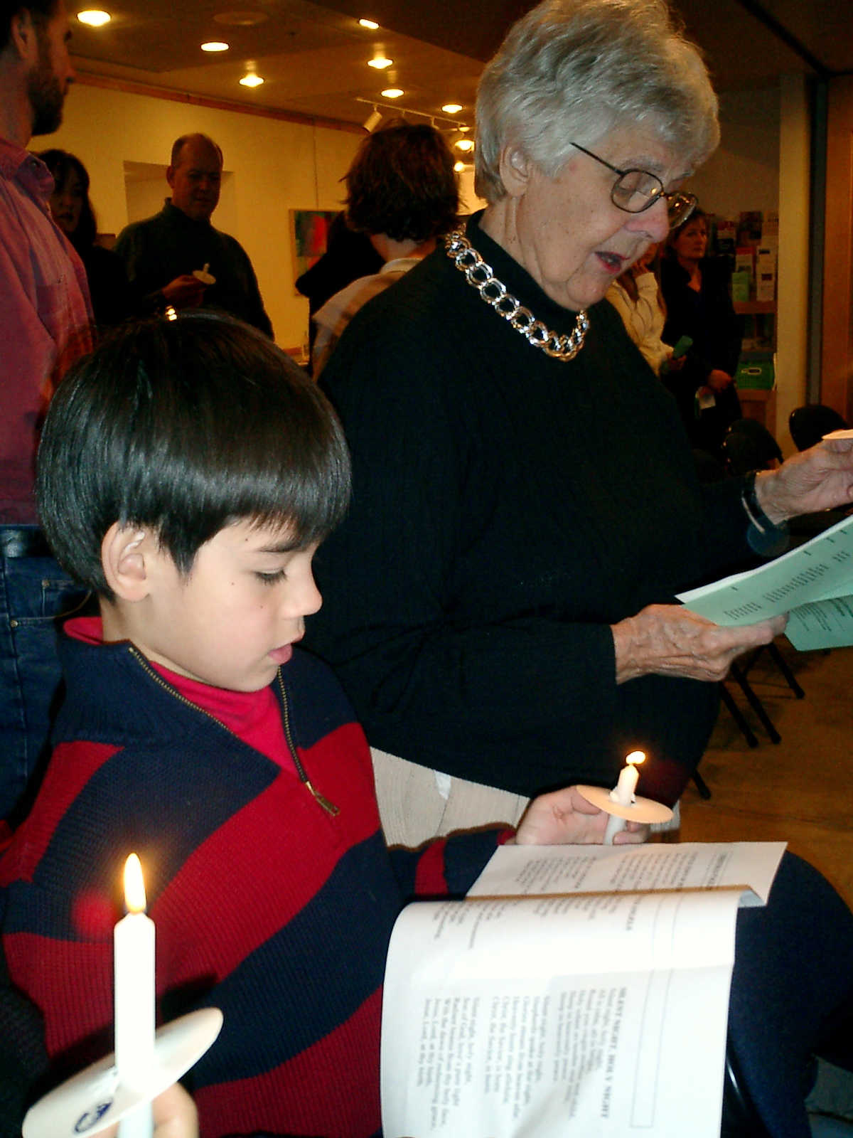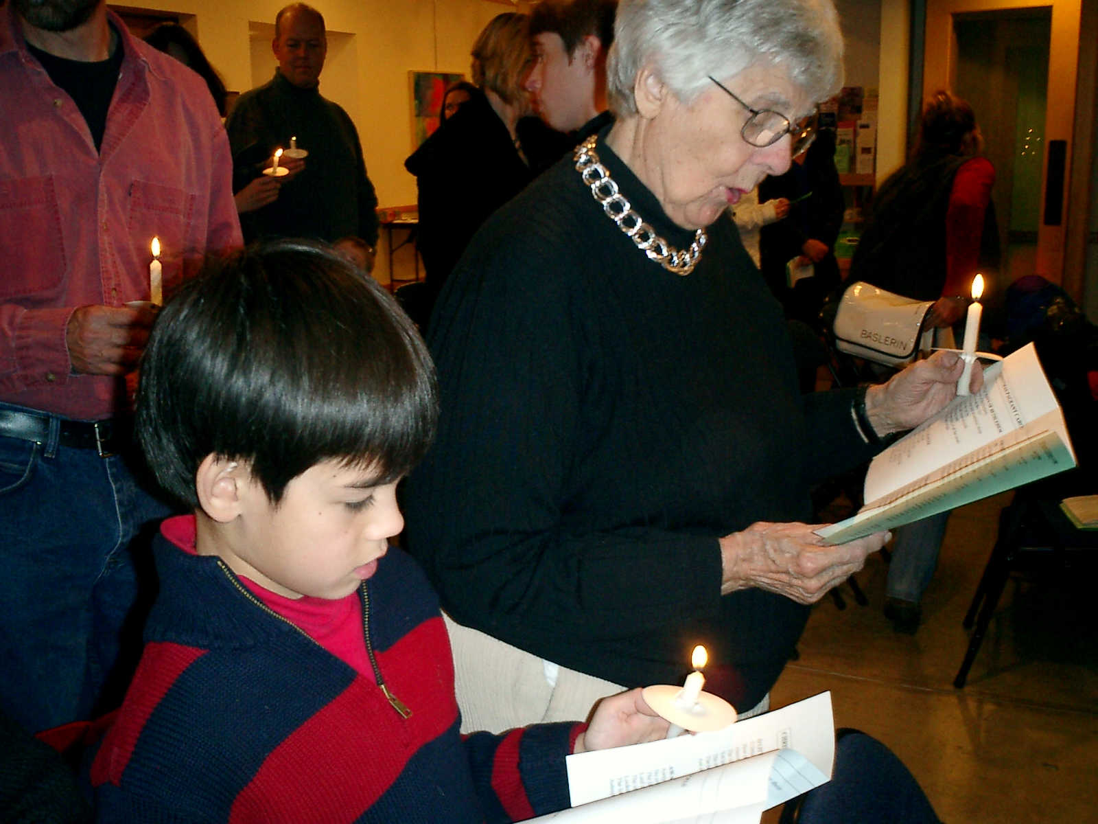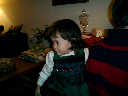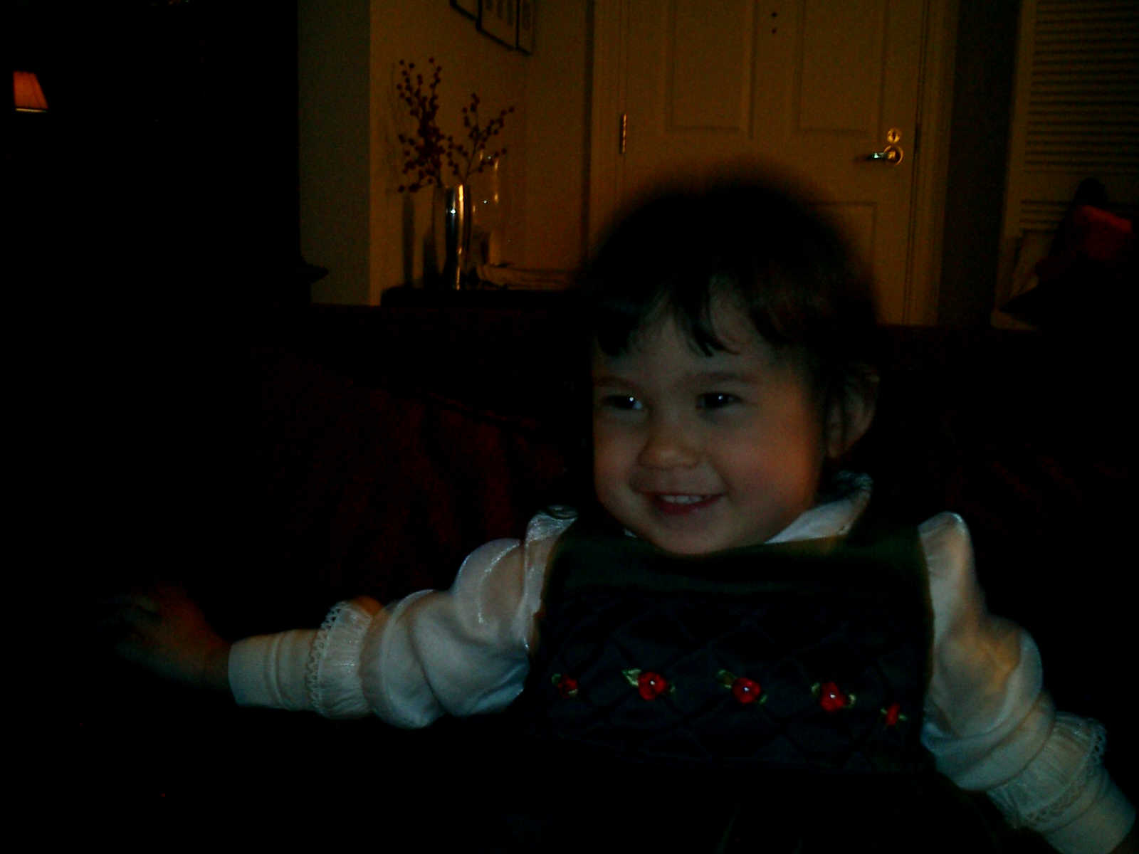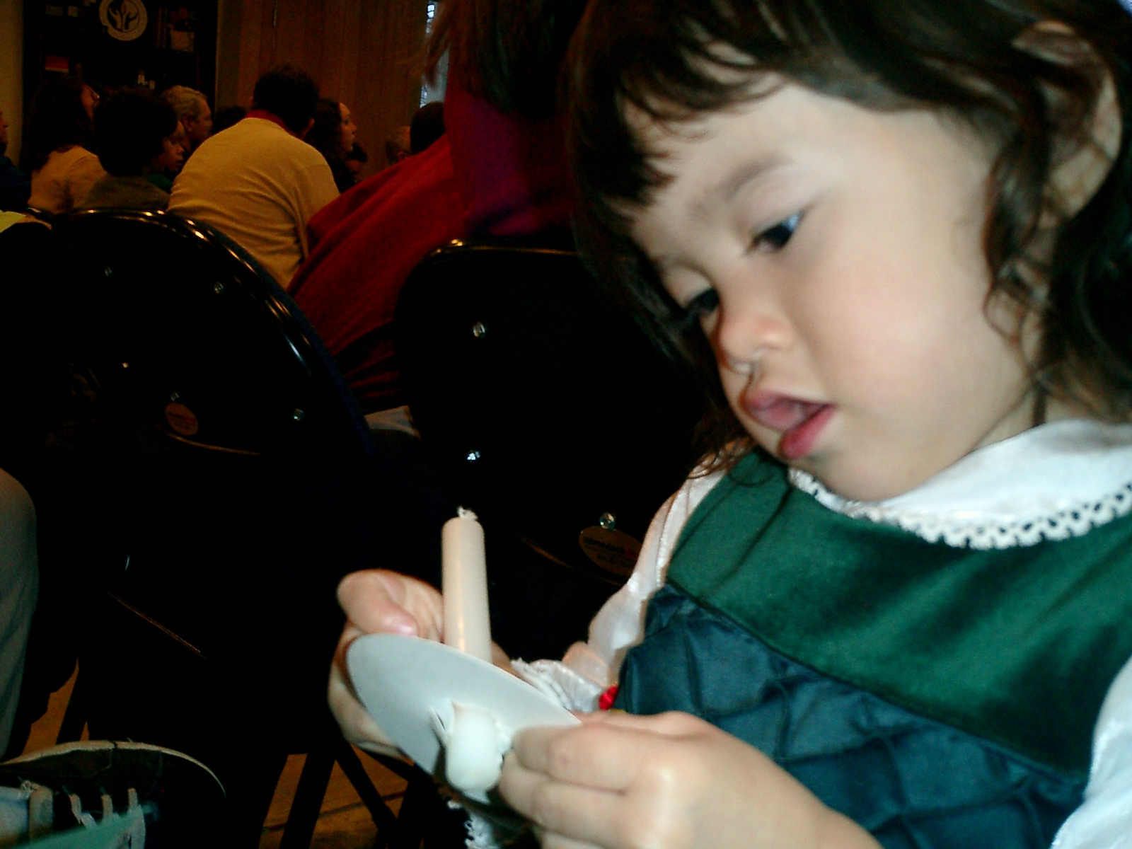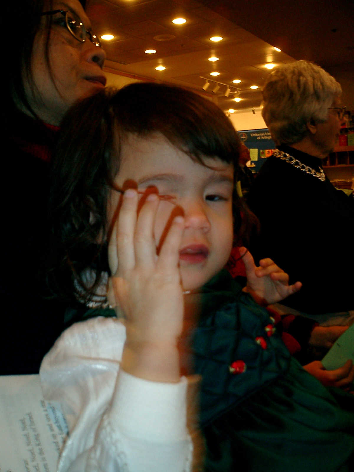 | Nadine at 25 months (December 24, 2008), celebrating Christmas Eve at the Arlington Unitarian Church. Nadine, did you enjoy the candle lighting ceremony? How about the Mitten Tree? We sure had fun at Grandma Alexander's house afterwards -- with Uncle David too! |