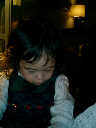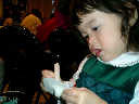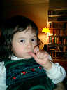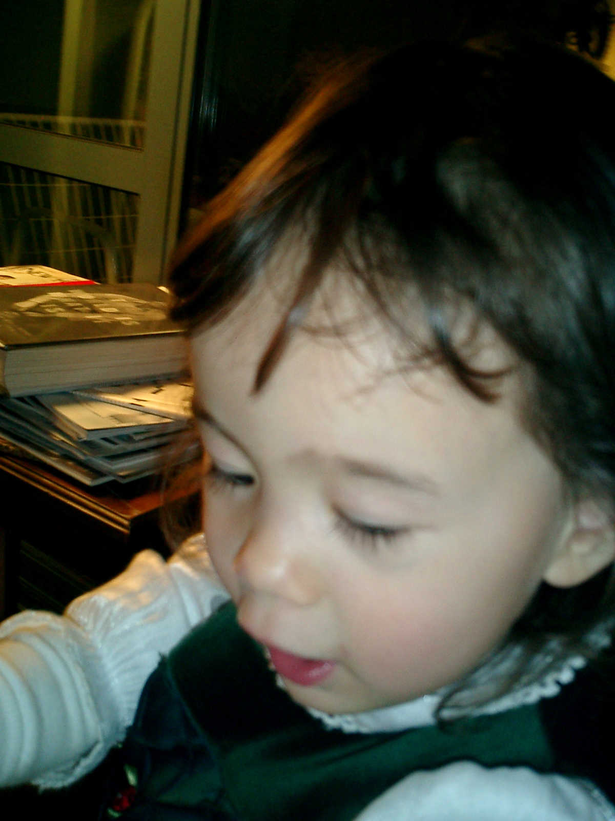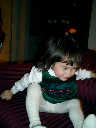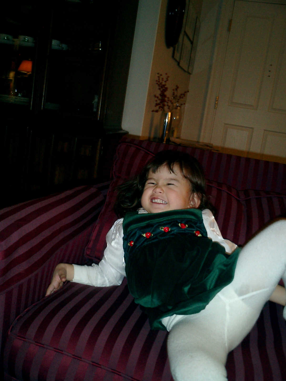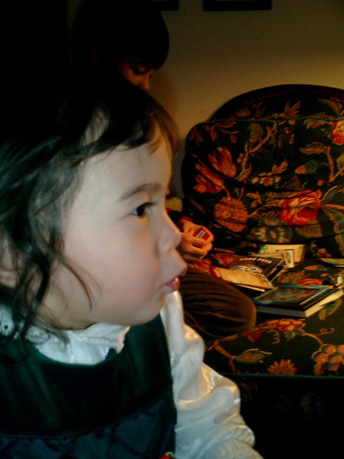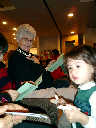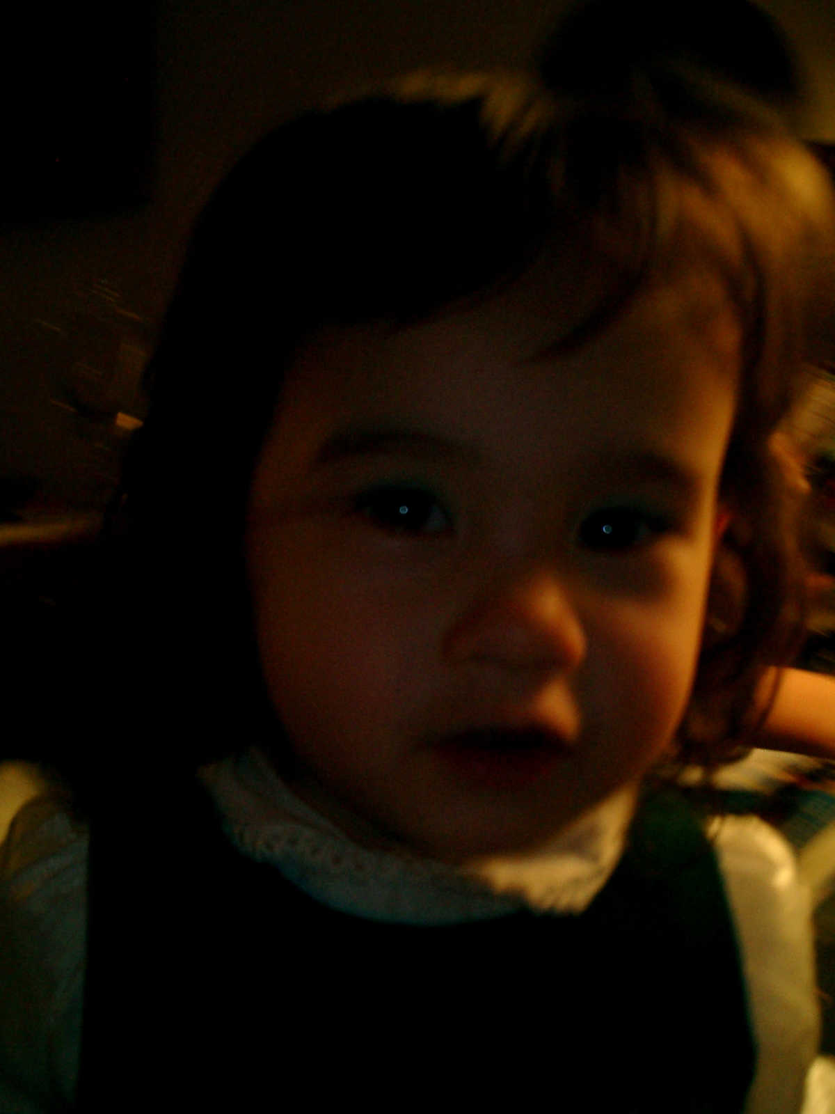 | Nadine at 25 months (December 24, 2008), celebrating Christmas Eve at the Arlington Unitarian Church. Nadine, did you enjoy the candle lighting ceremony? How about the Mitten Tree? We sure had fun at Grandma Alexander's house afterwards -- with Uncle David too! |