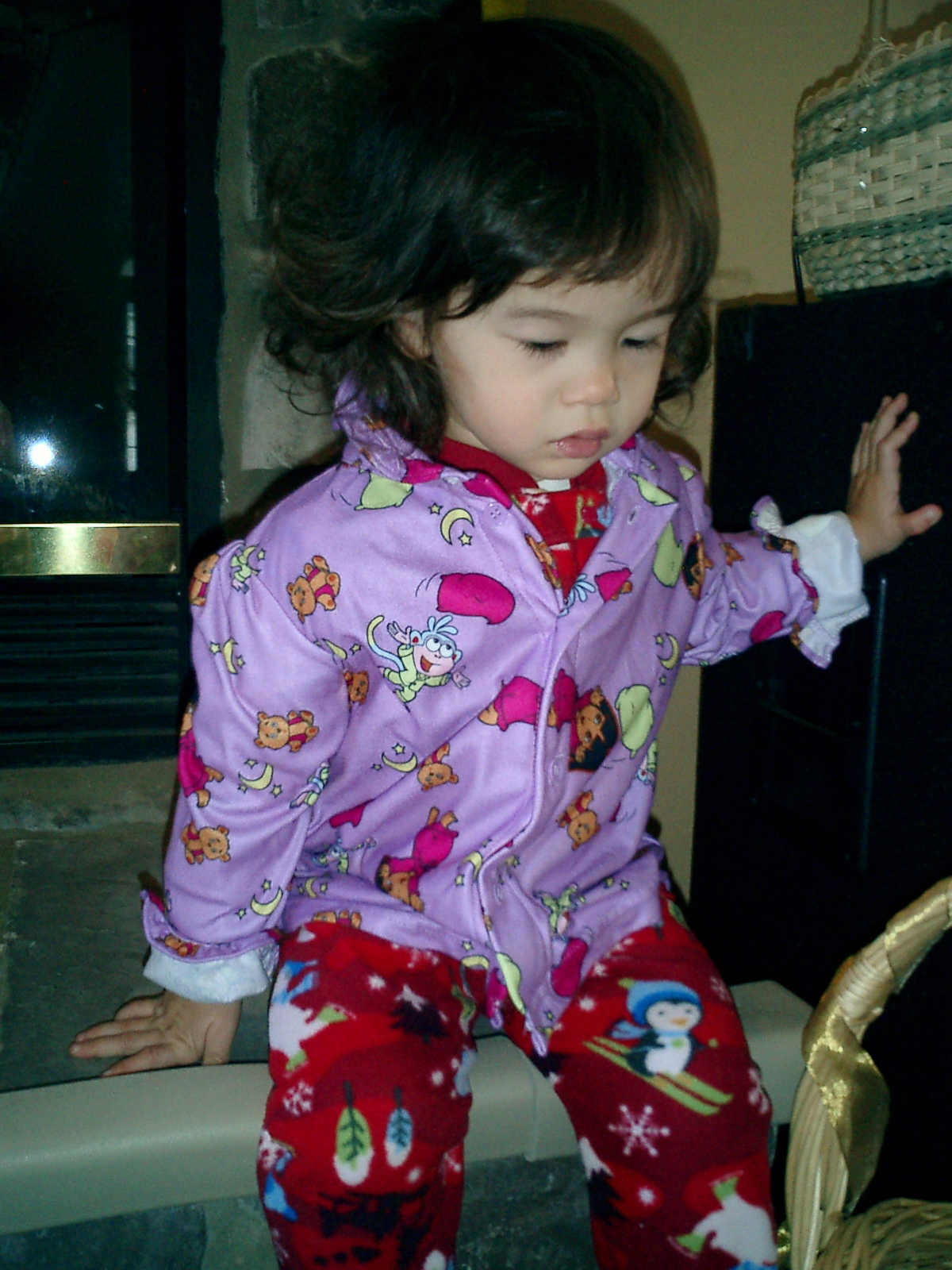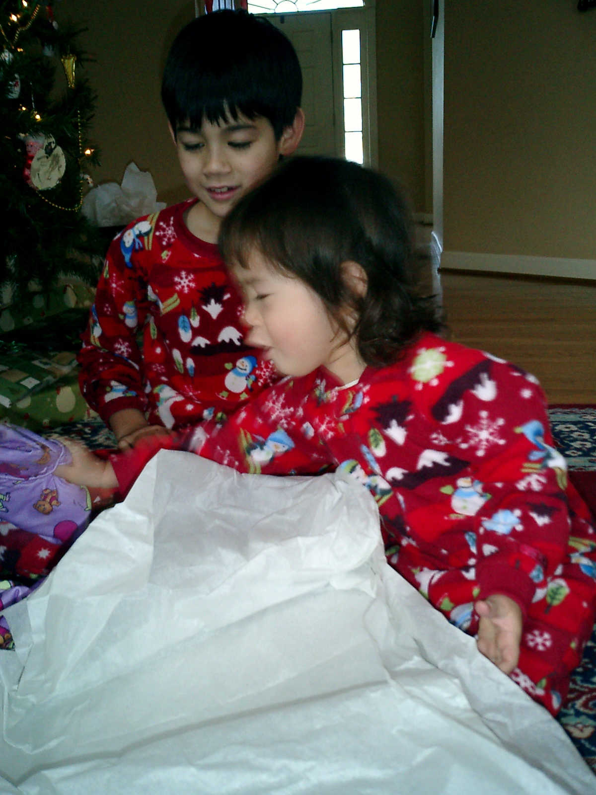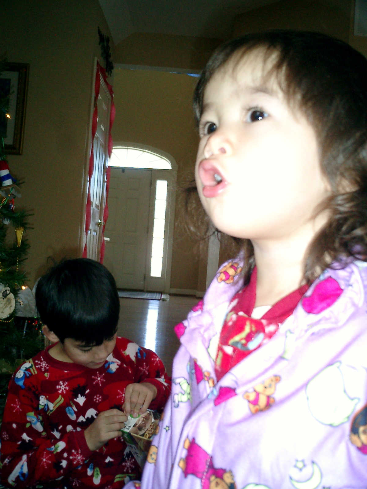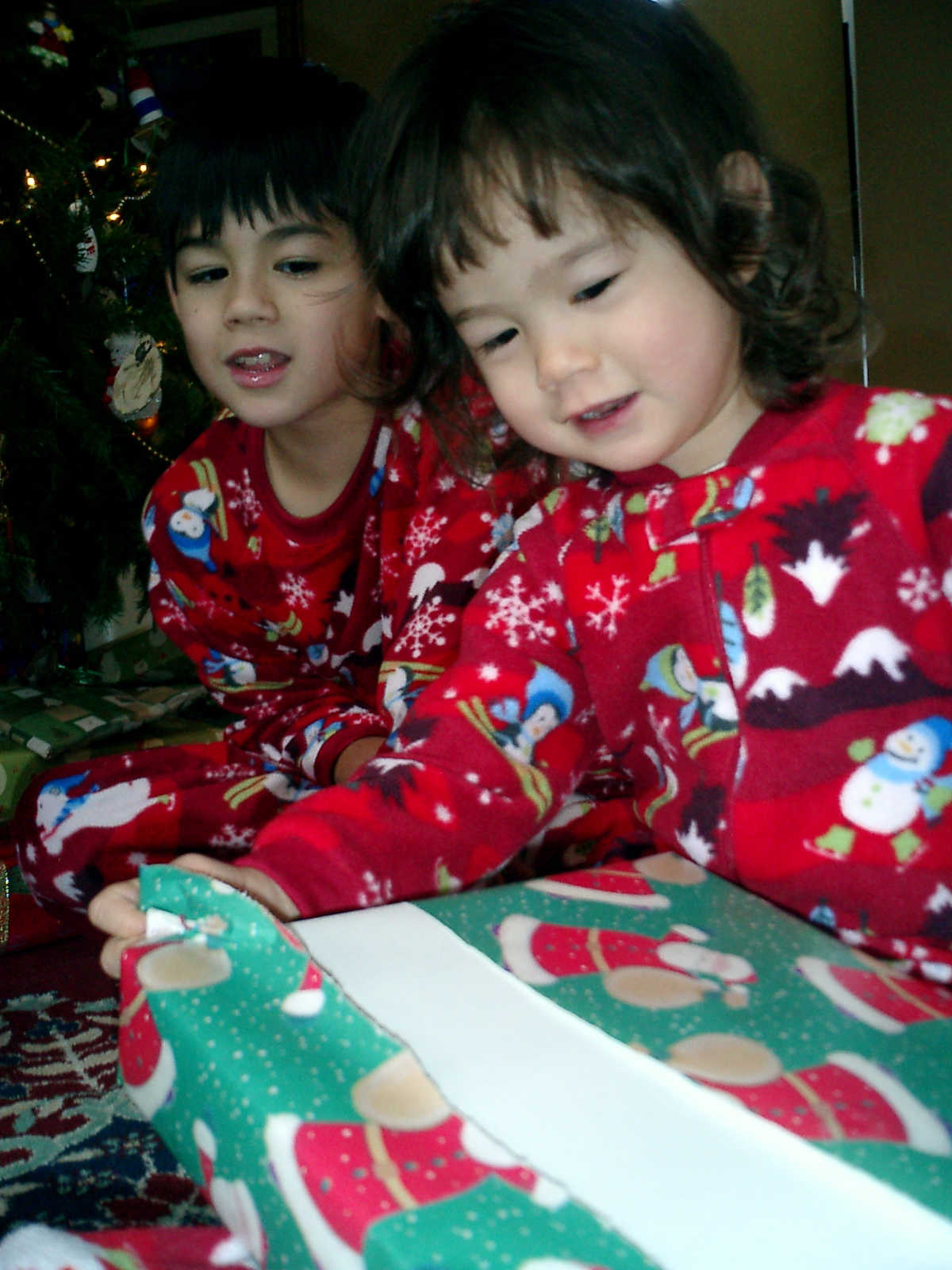Nadine at 25 months (December 25, 2008), open presents Christmas morning with her brother Nolan. Nadine, you're wearing your new Dora pajamas!