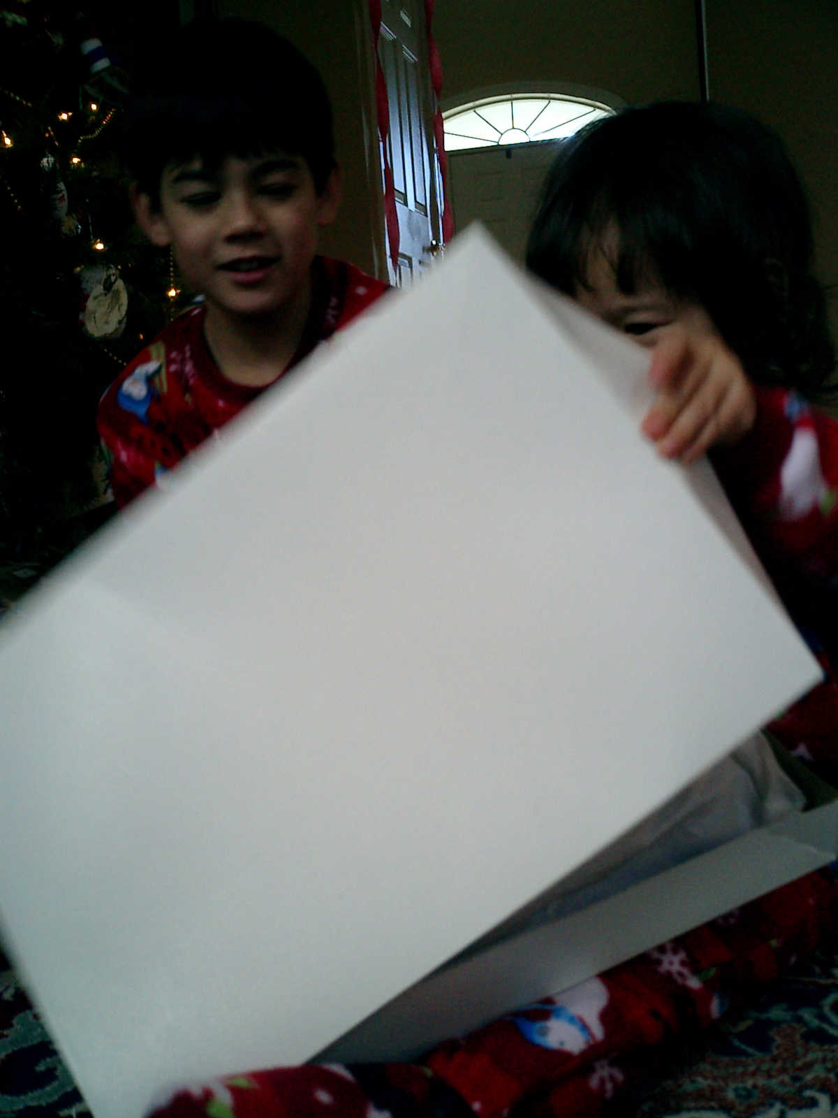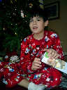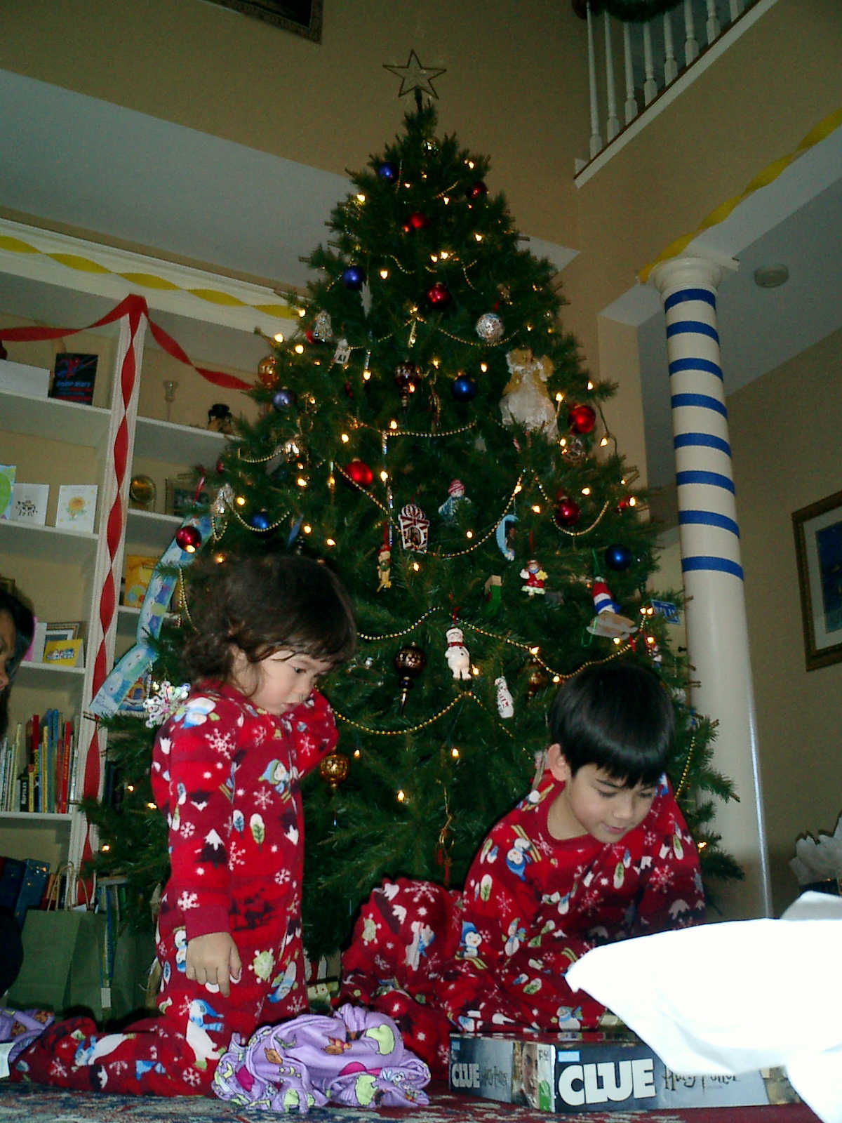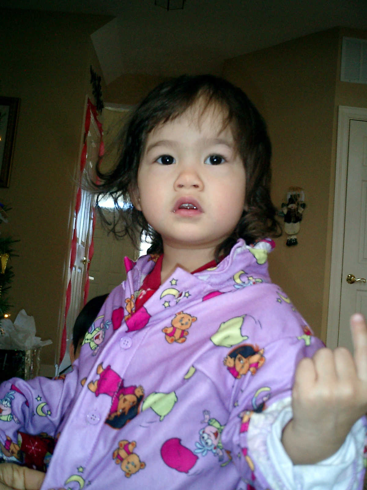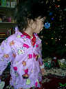 Nadine at 25 months (December 25, 2008), open presents Christmas morning with her brother Nolan. Nadine, you're wearing your new Dora pajamas!