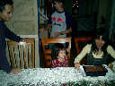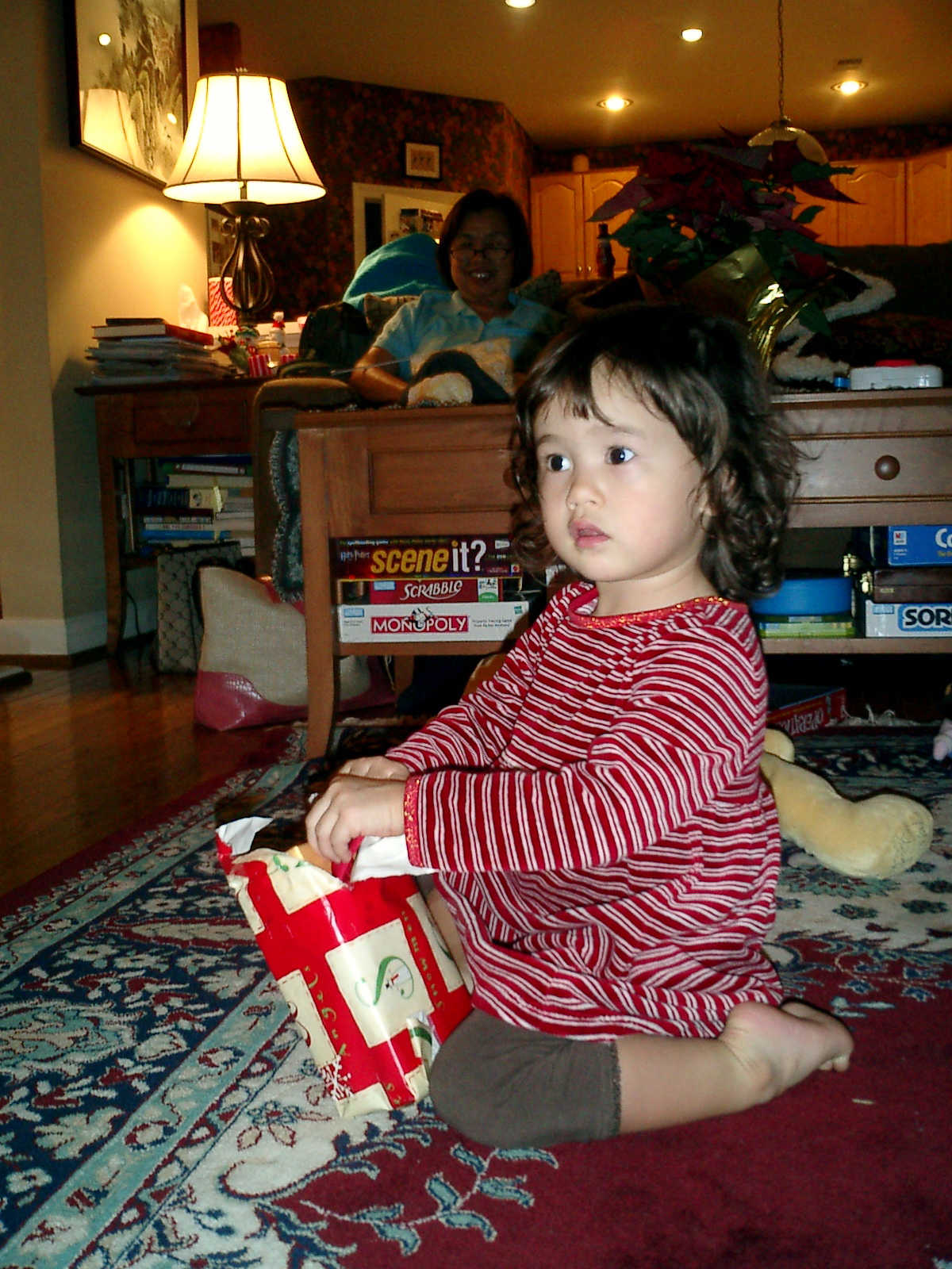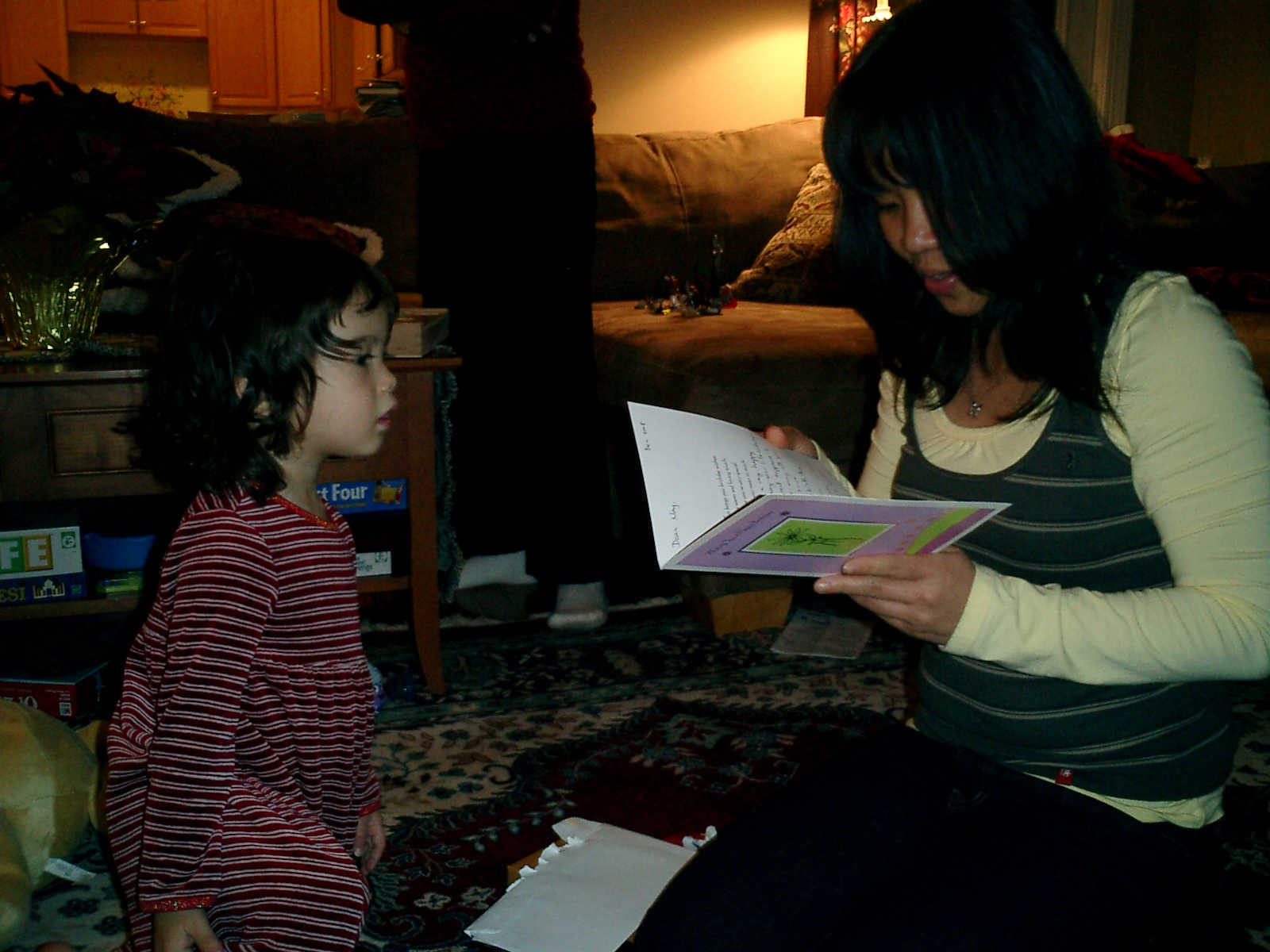 Nadine at 2 years and 2 months (January 31, 2009), helping to celebrate Ant Noy's birthday. Nadine, did you read the card to Noy?